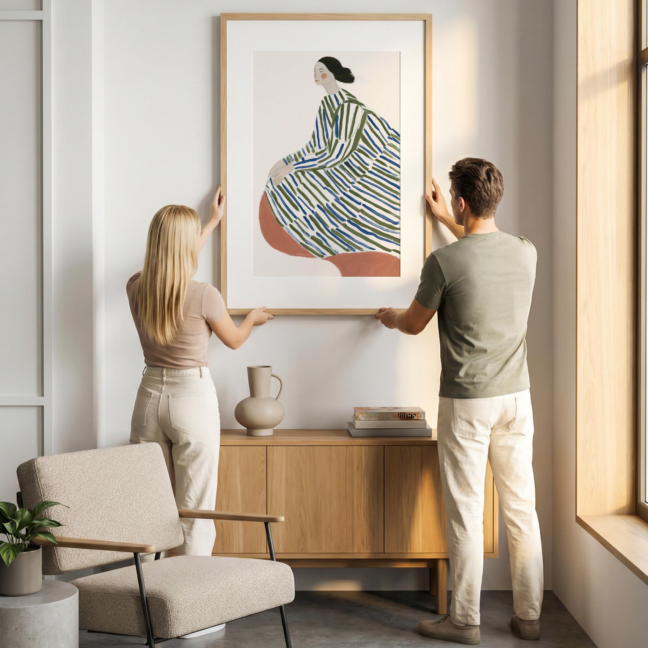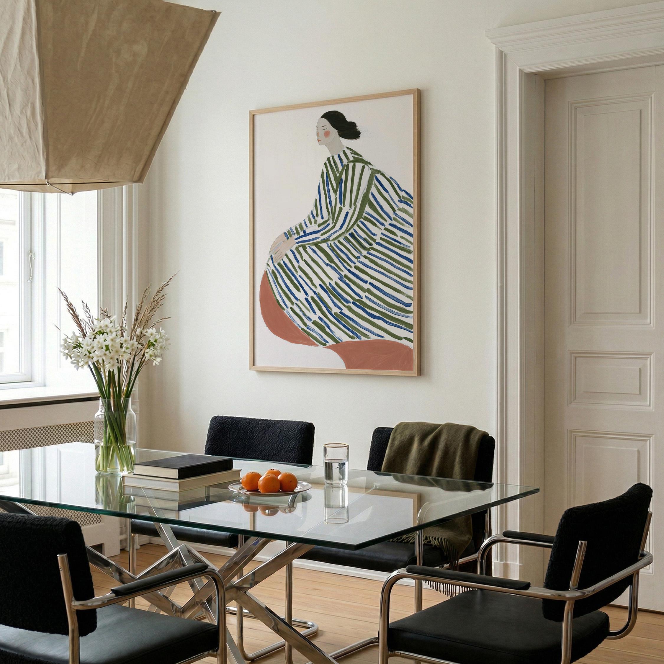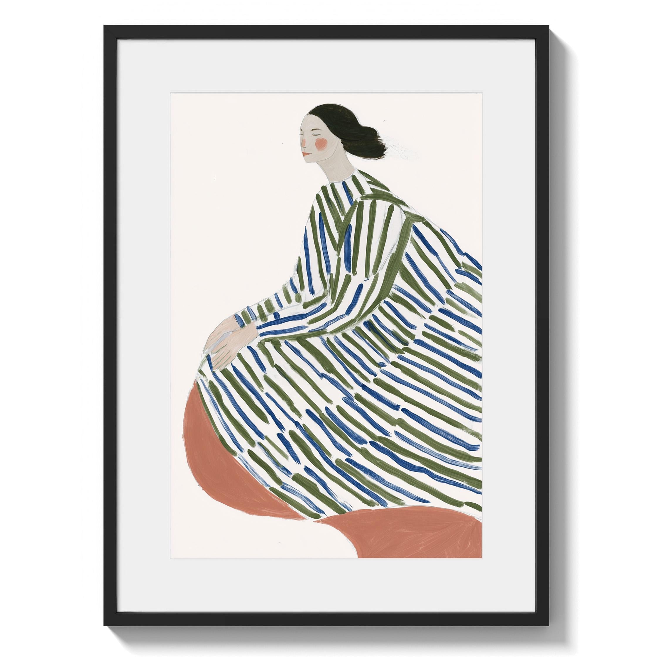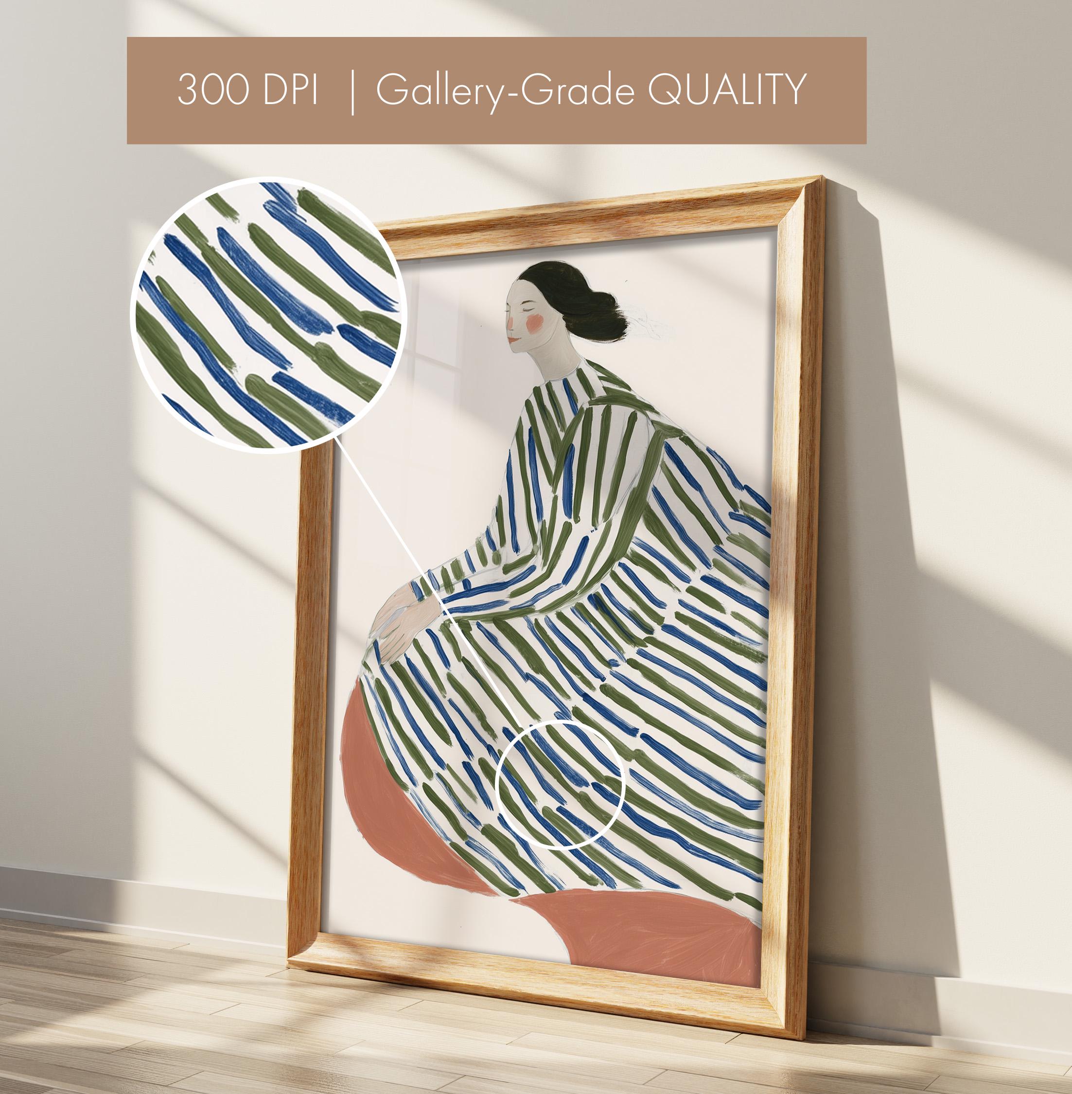This elegant woman in striped robe wall art brings a serene, sophisticated touch to any space with its flowing lines and calming green and blue palette.
