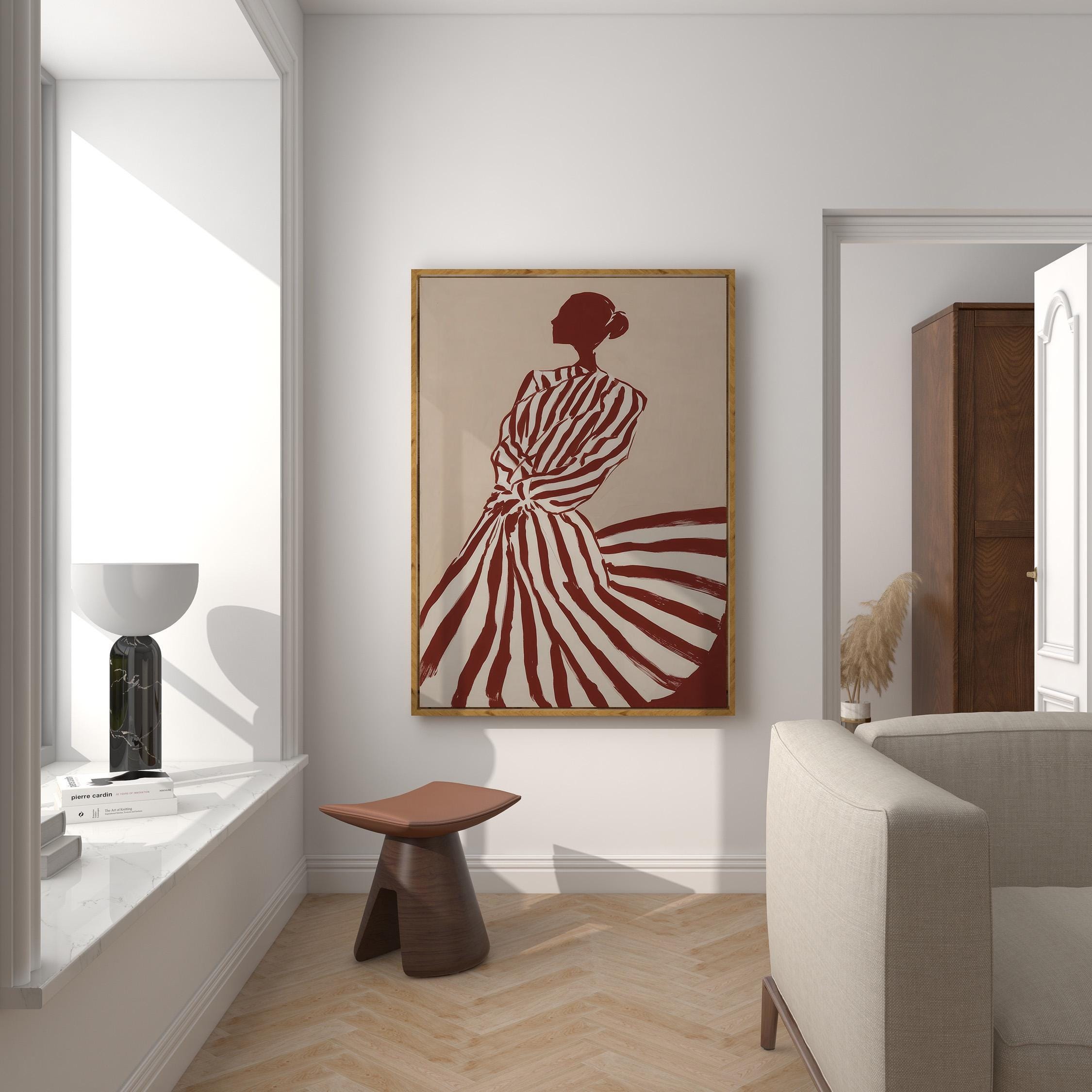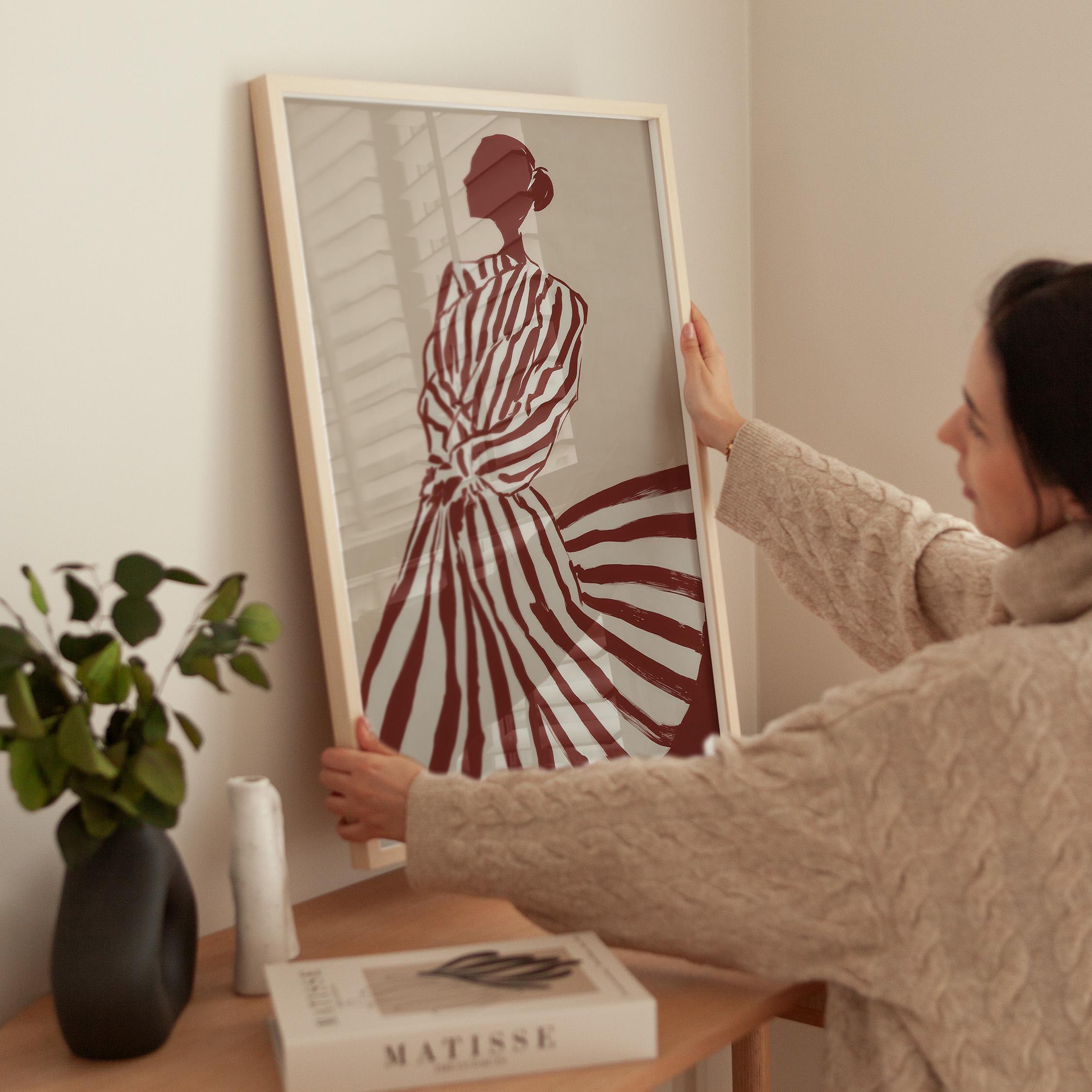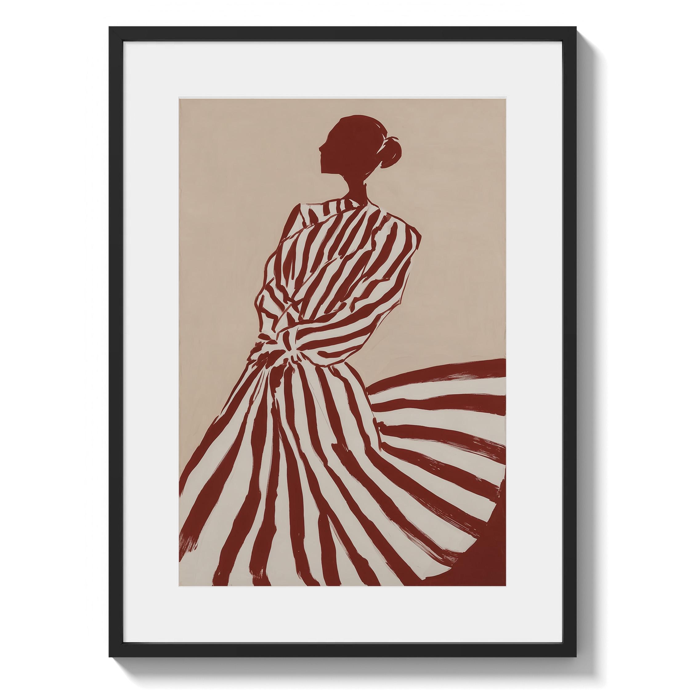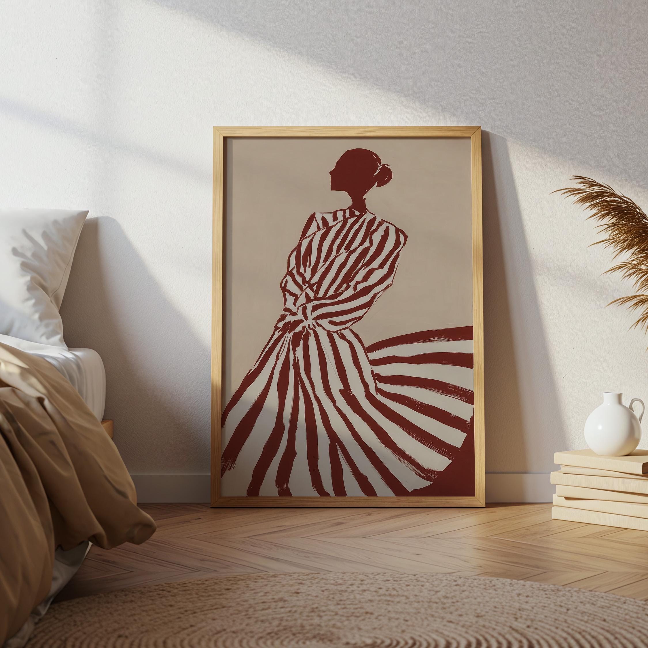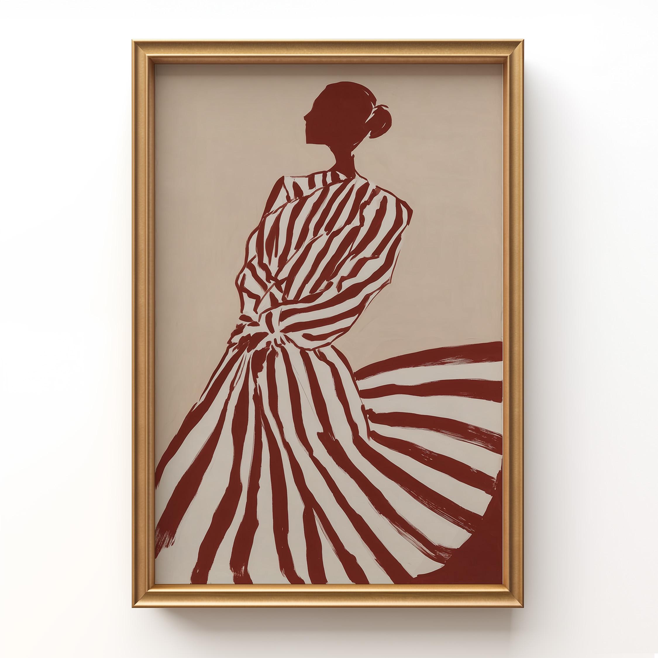 This striking fashion illustration features an elegant woman in a flowing striped dress, rendered in rich terracotta and cream tones that command attention on any wall.
