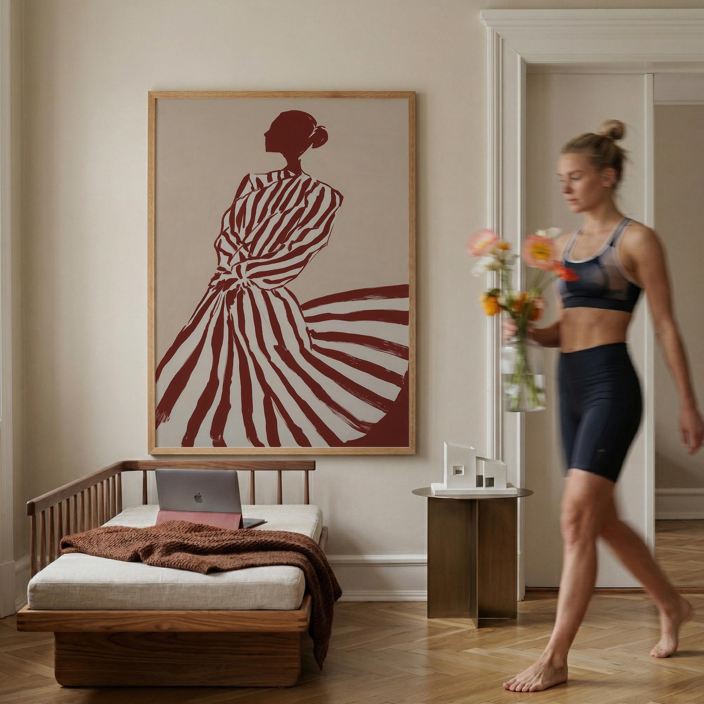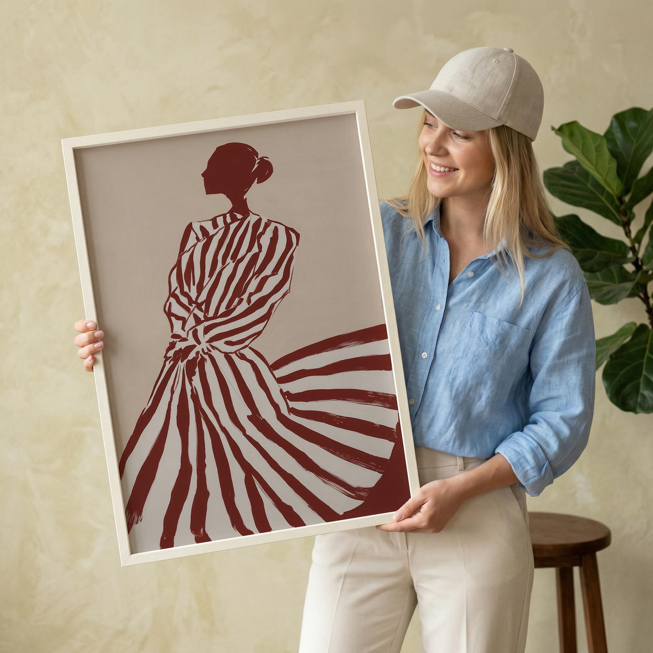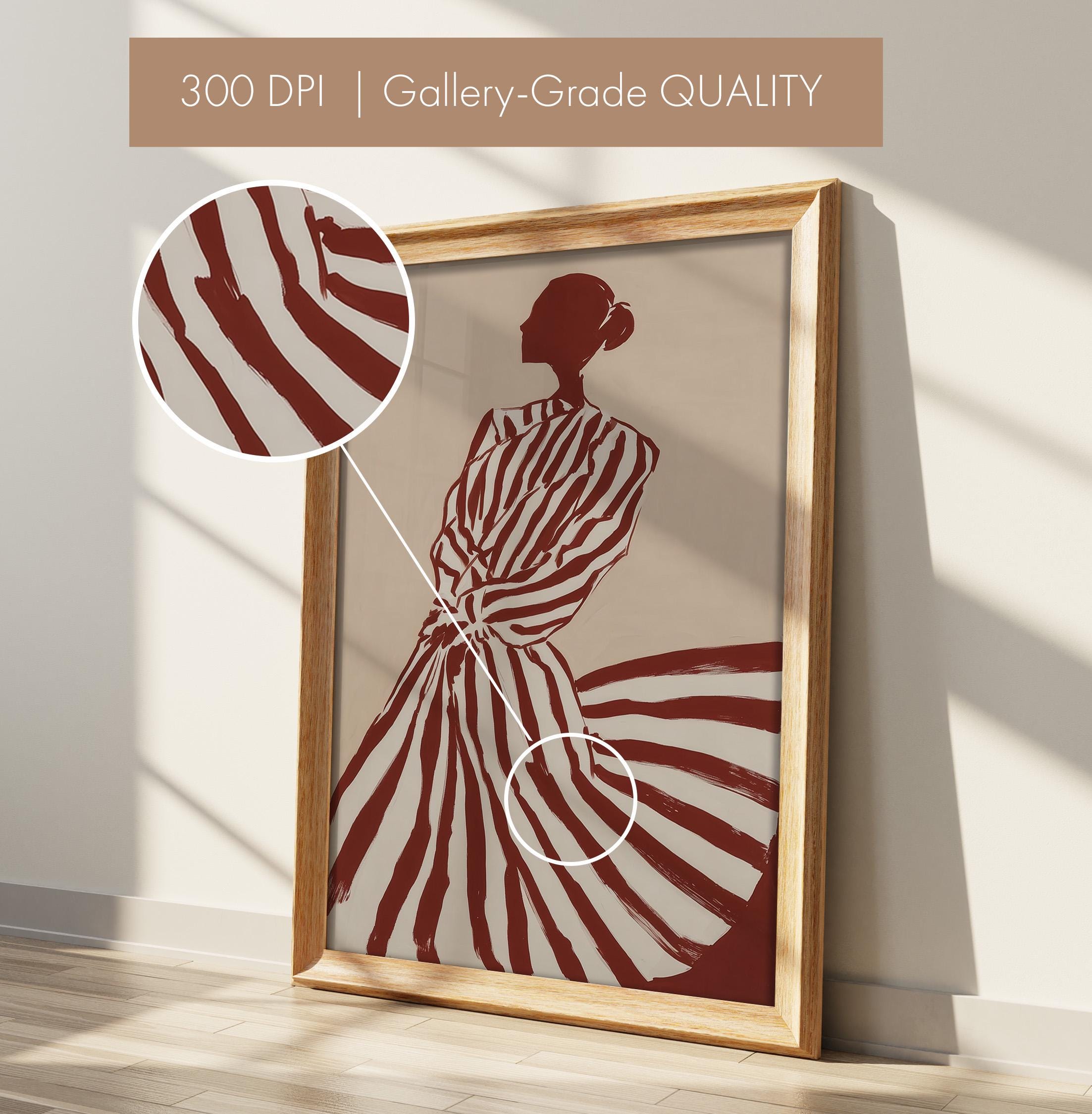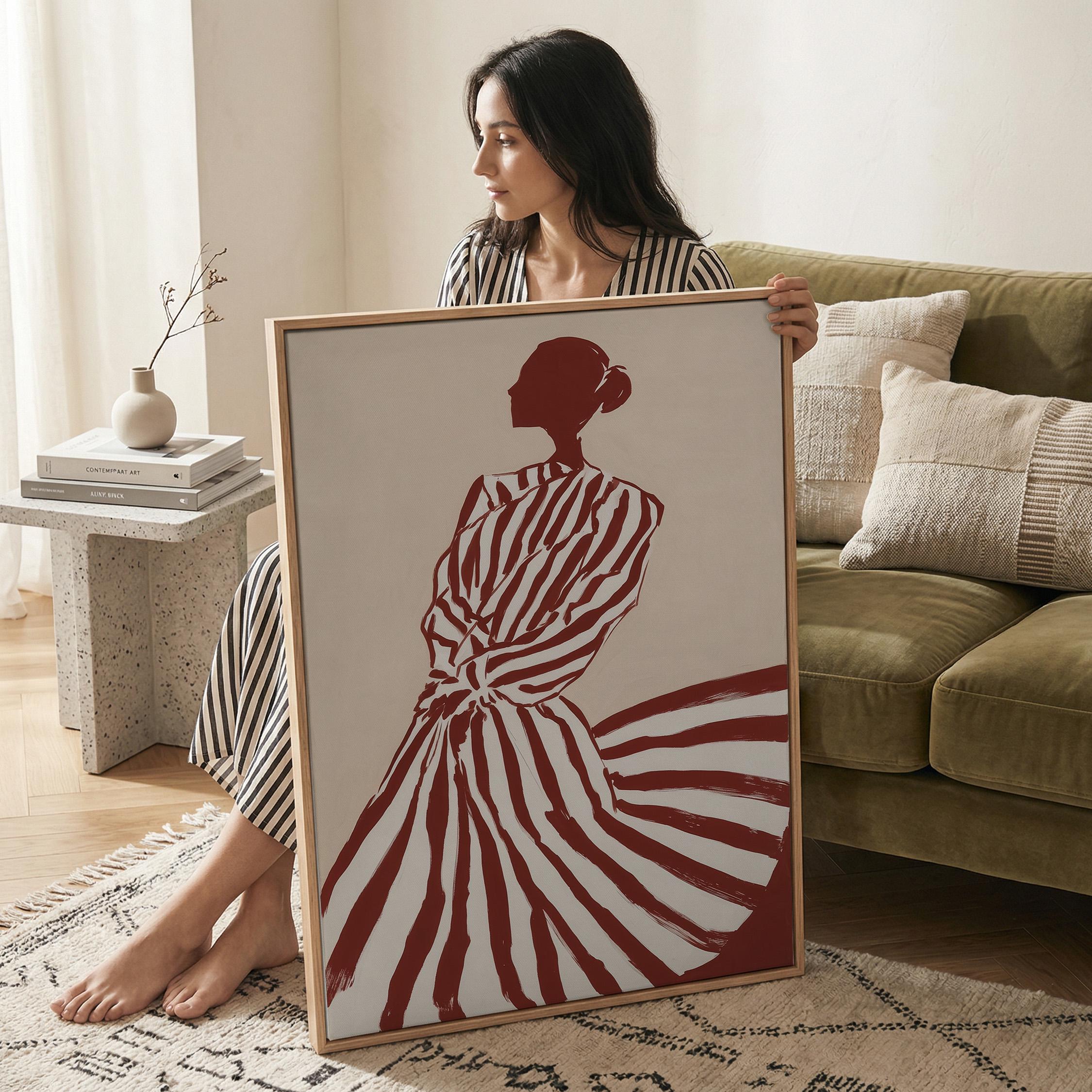 This striking fashion illustration features an elegant woman in a flowing striped dress, rendered in rich terracotta and cream tones that command attention on any wall.