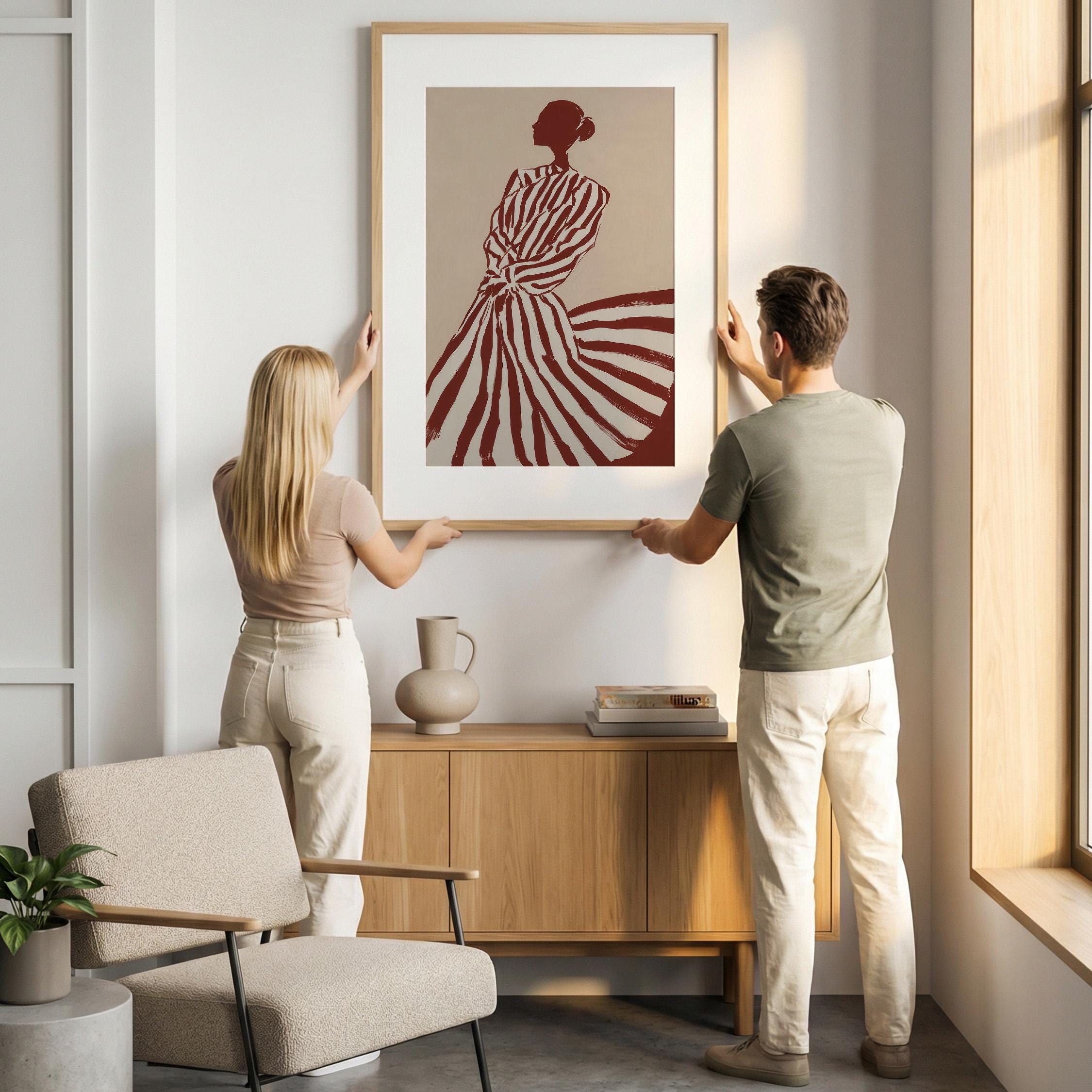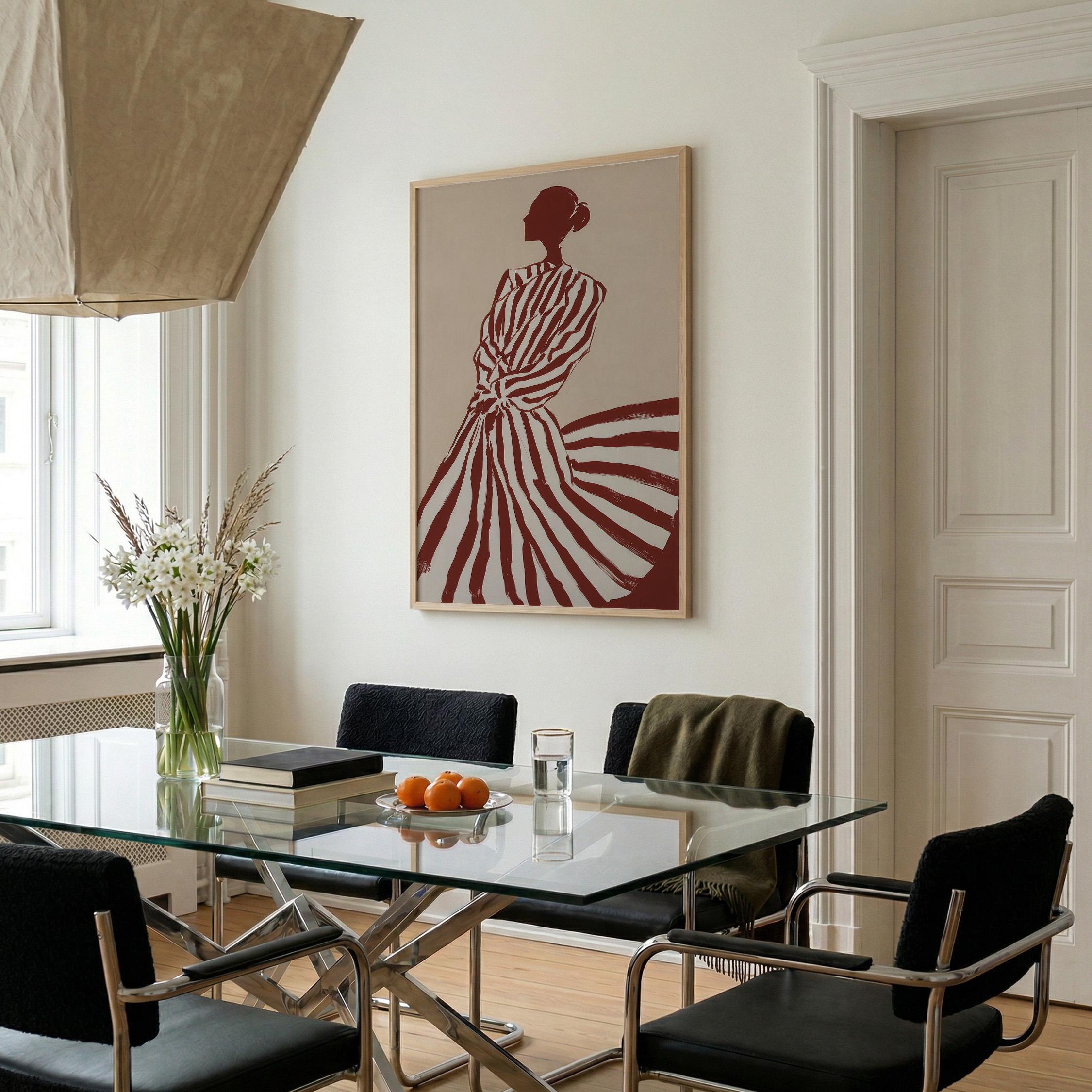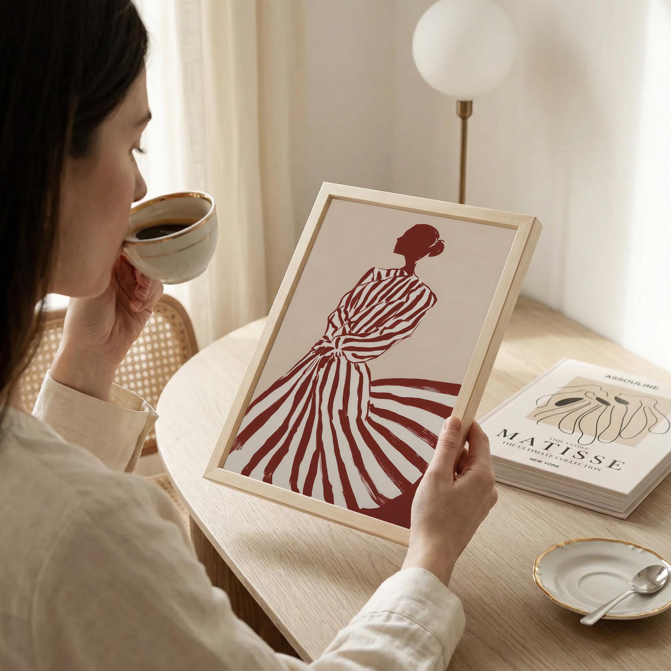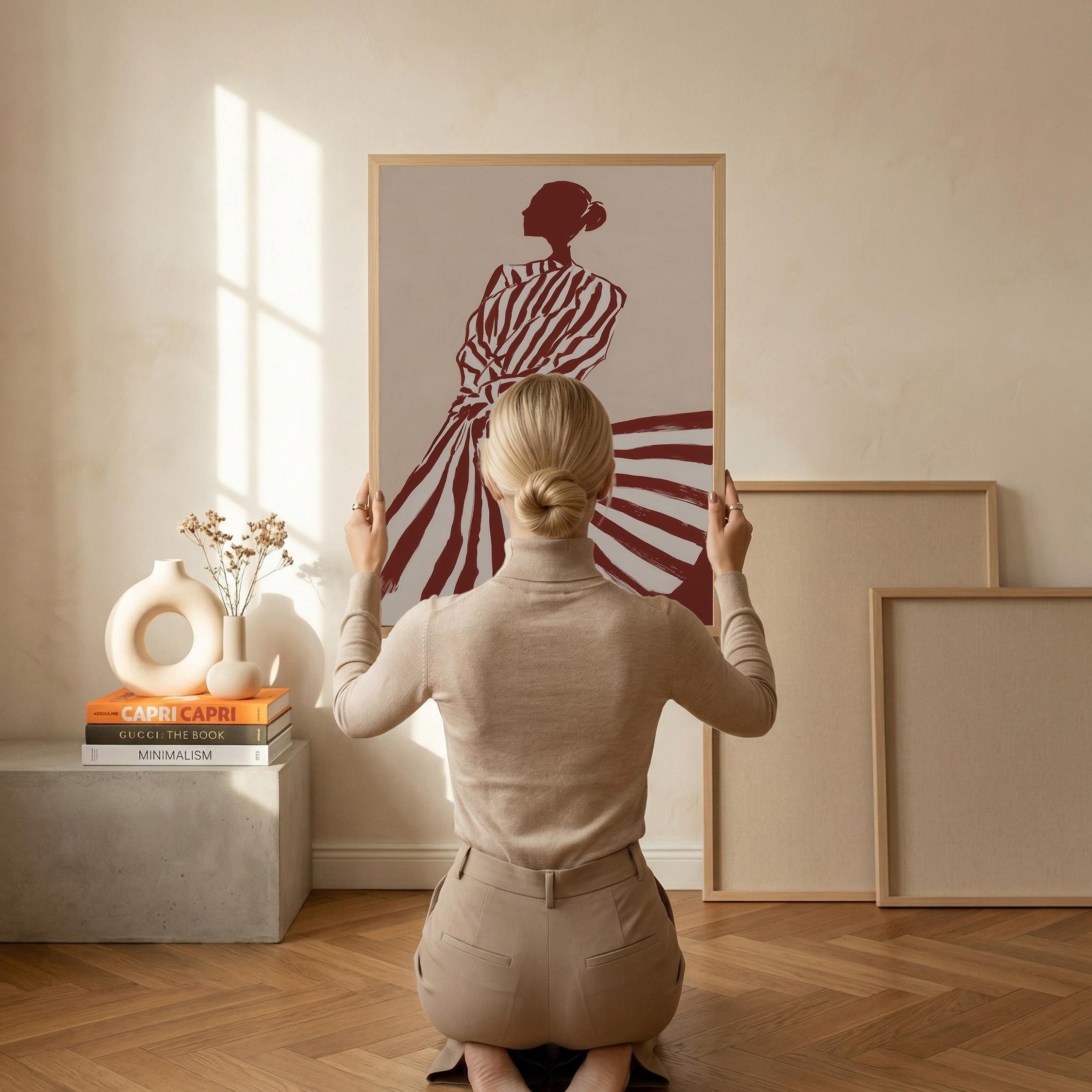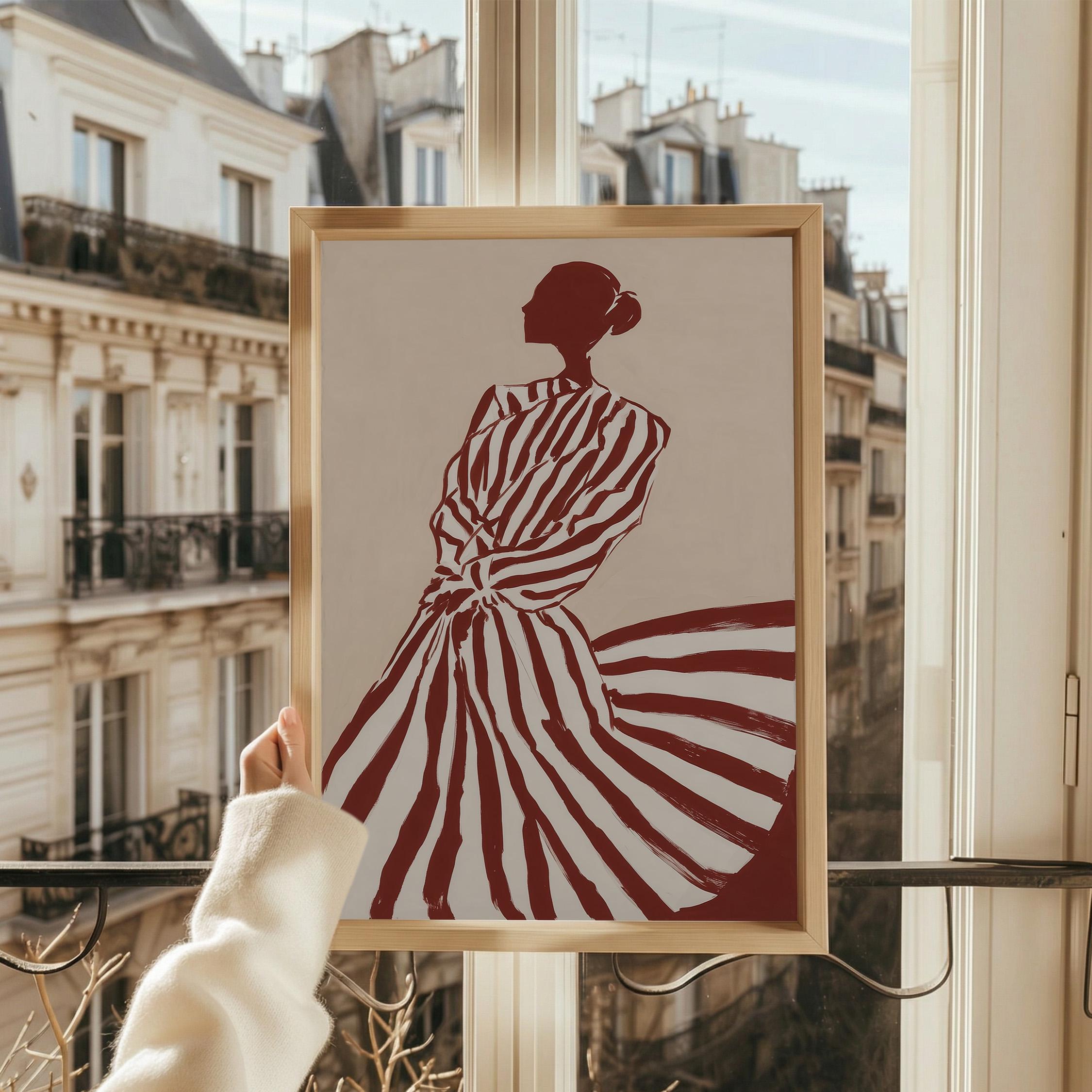 This striking fashion illustration features an elegant woman in a flowing striped dress, rendered in rich terracotta and cream tones that command attention on any wall.