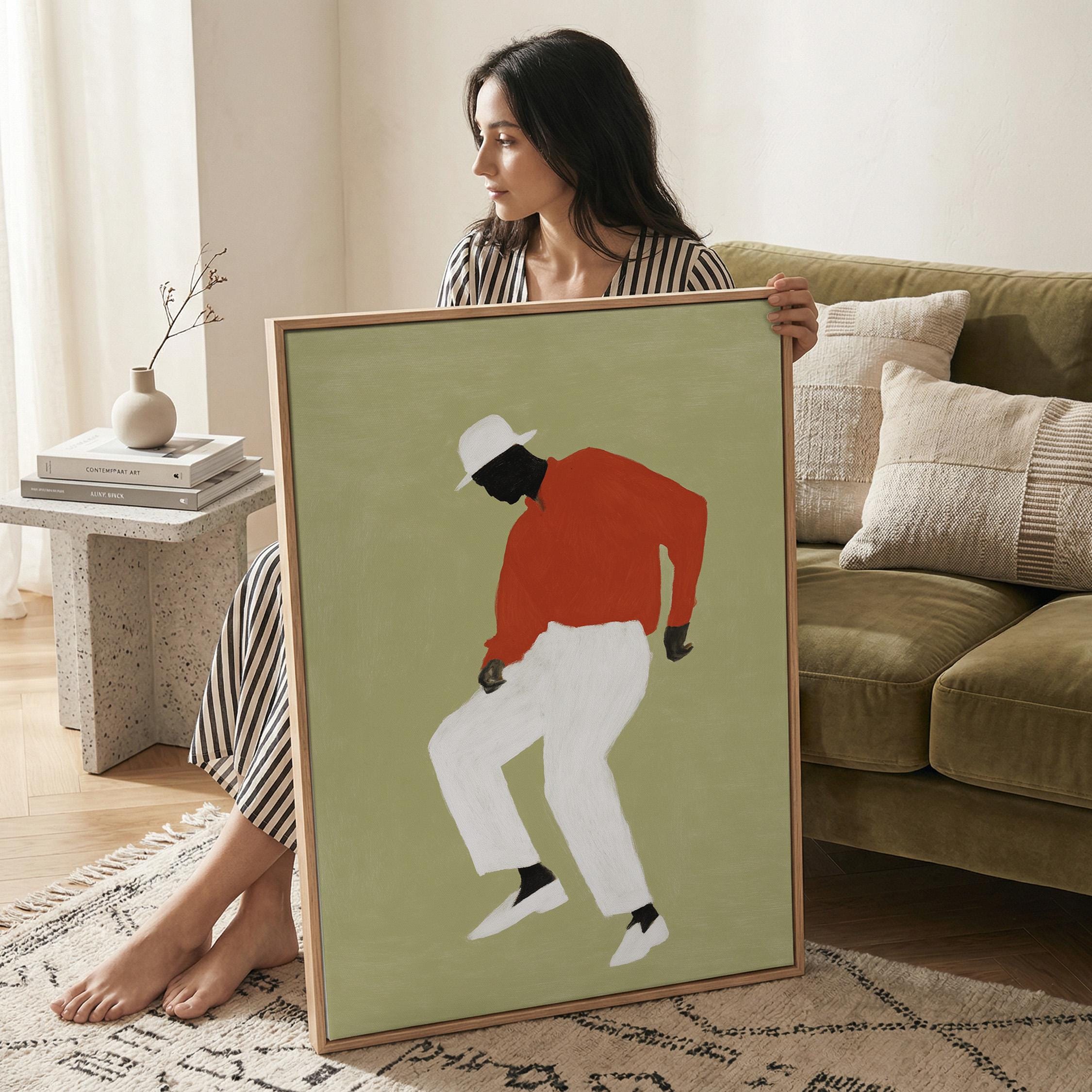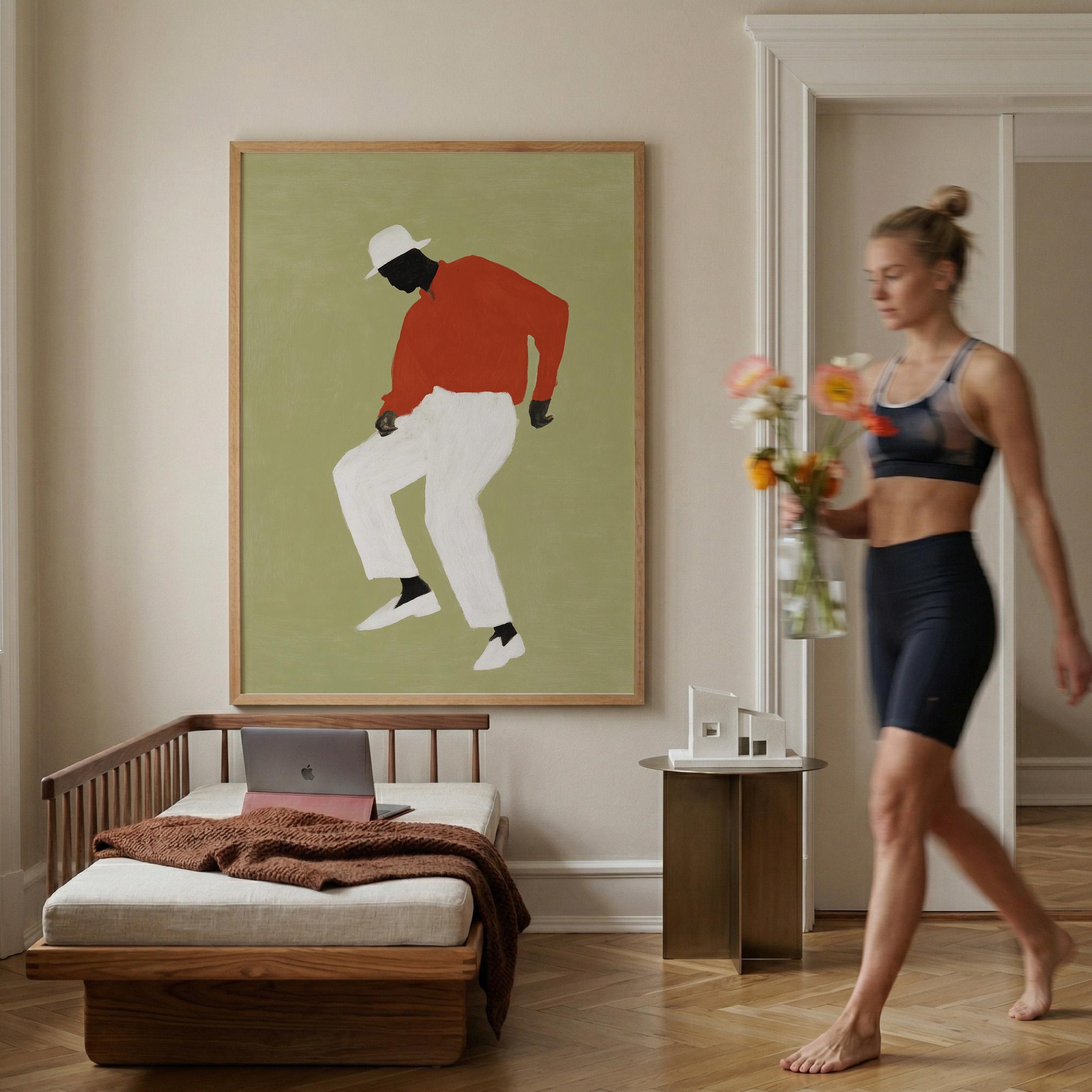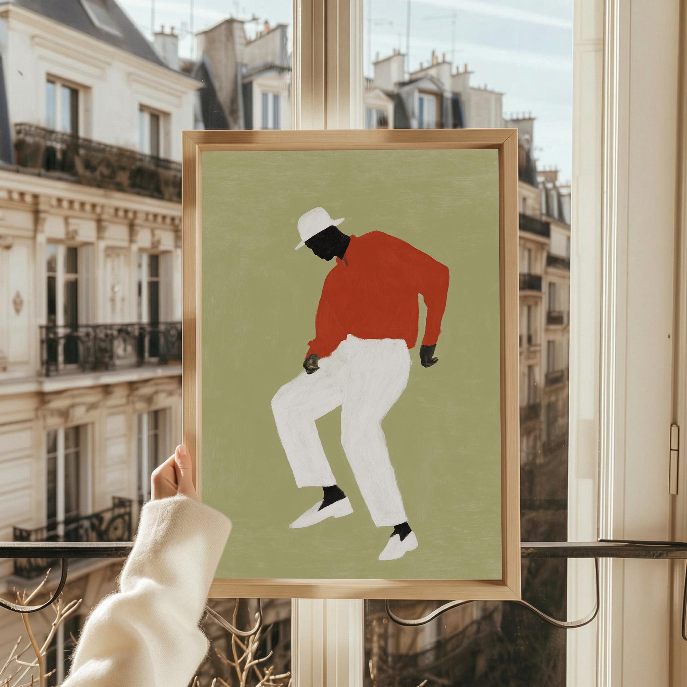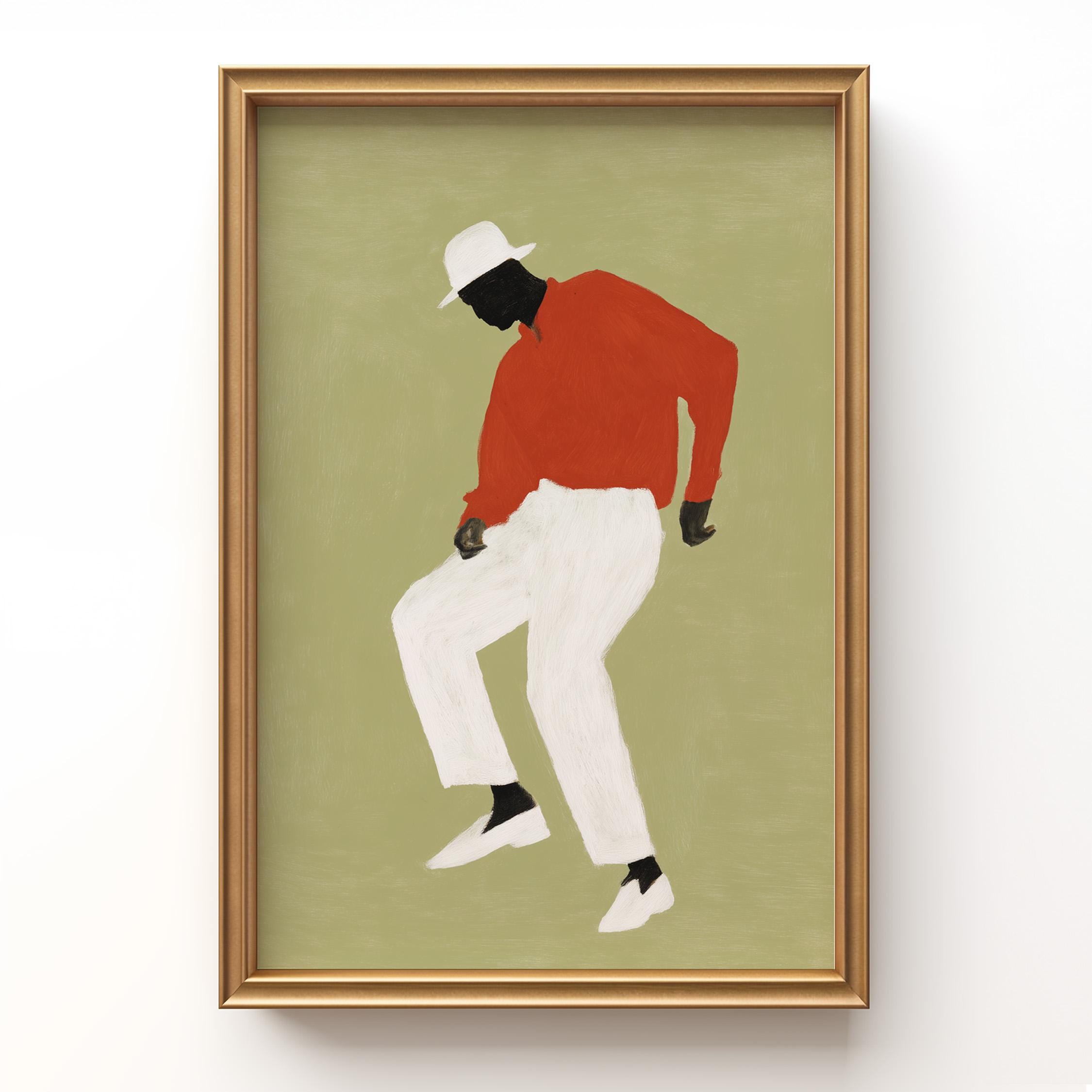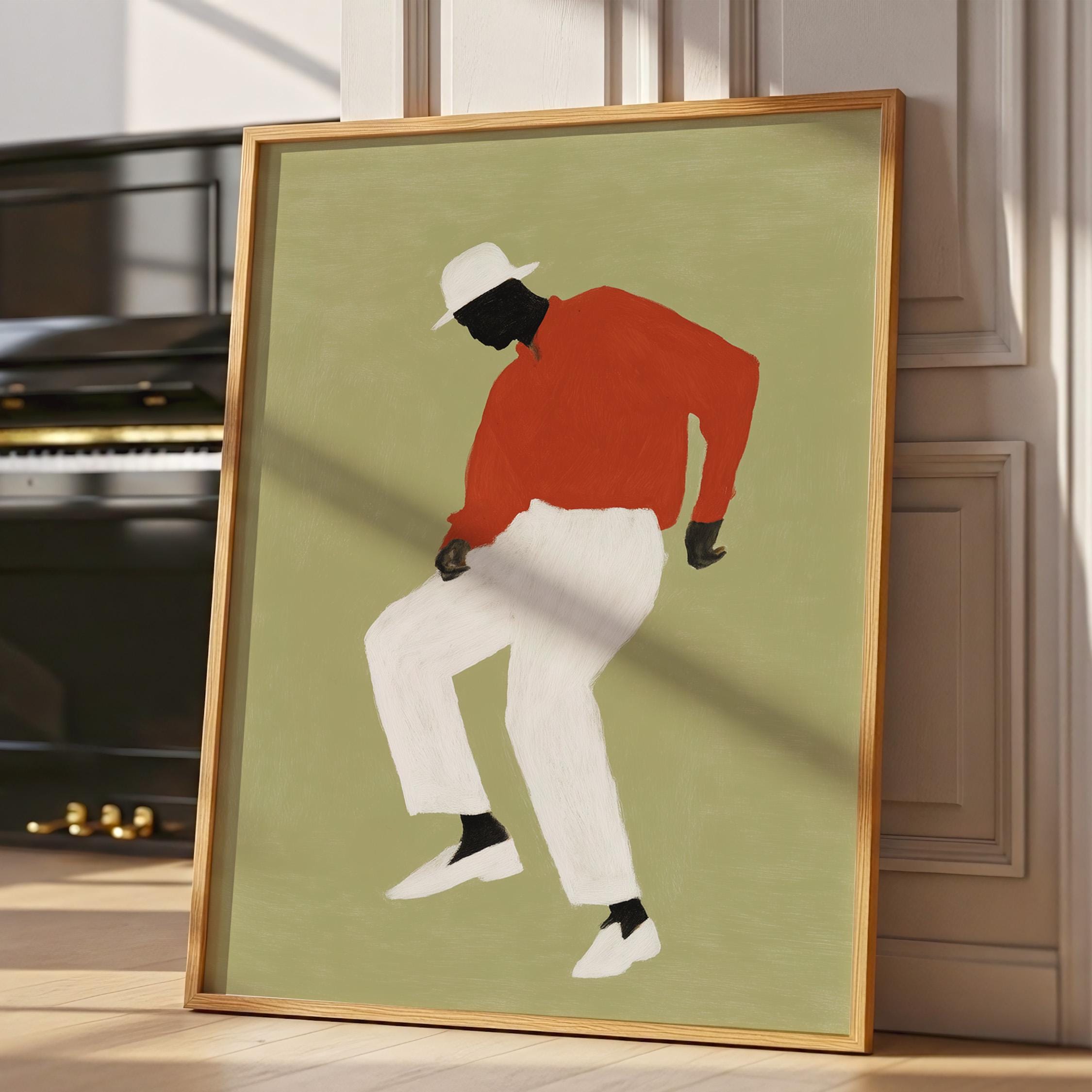 Black man dancing wall art print with a simple figure on a sage green background. Works well in a living room, office, or music space. It gives the room a relaxed and expressive feel.
