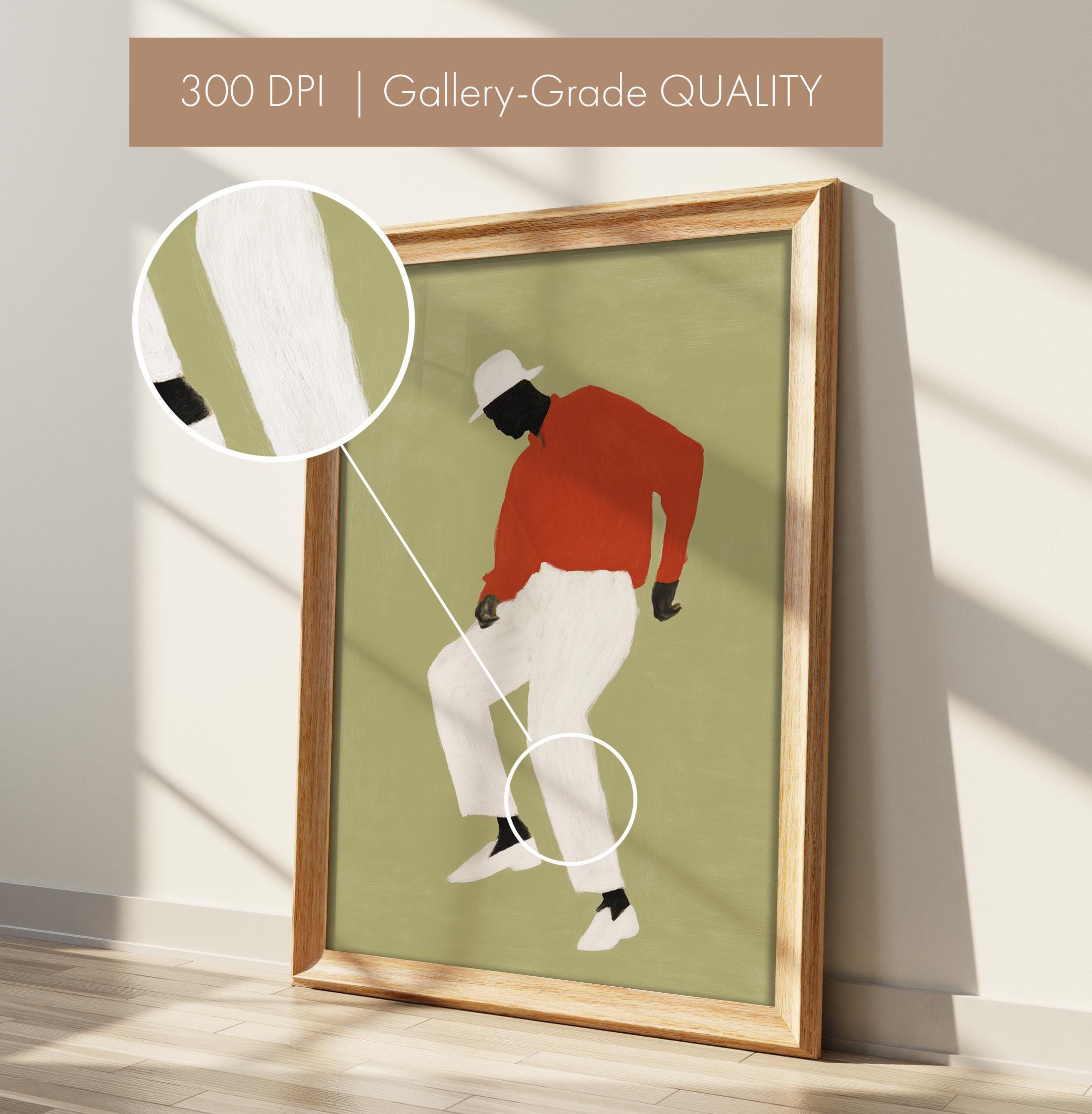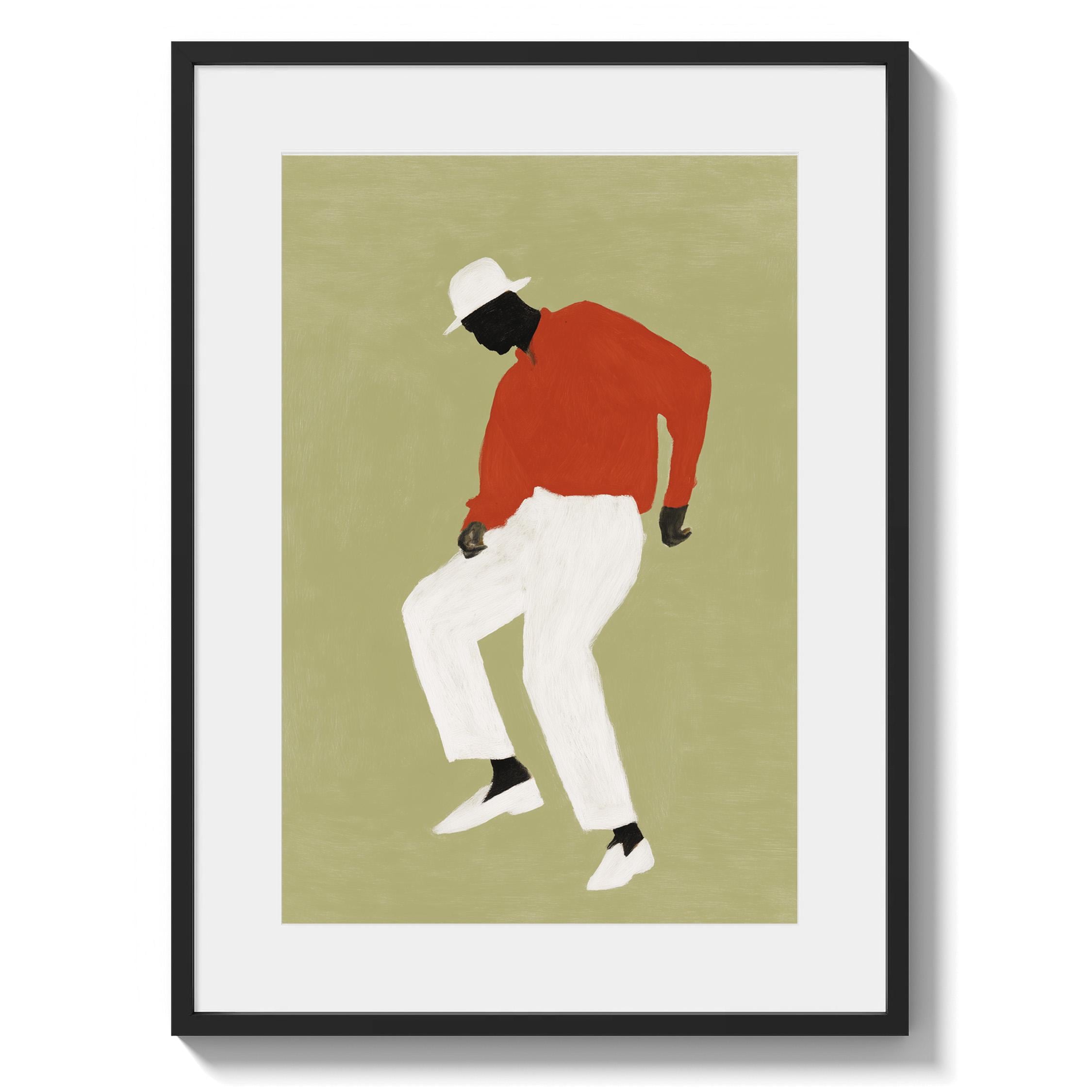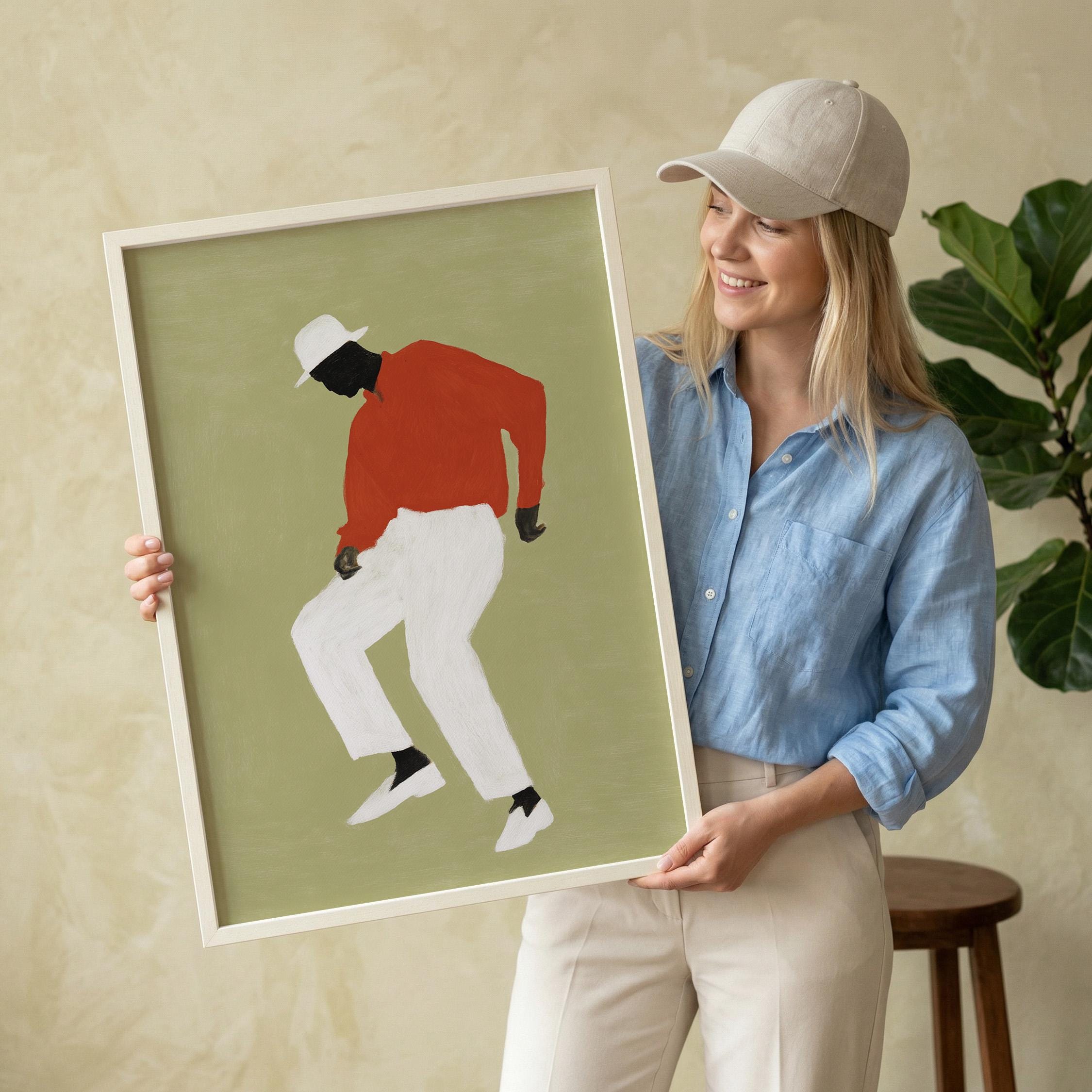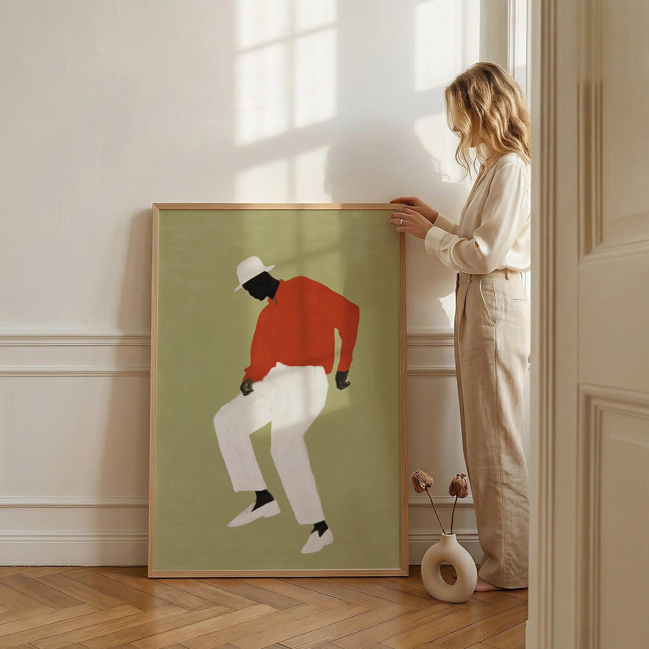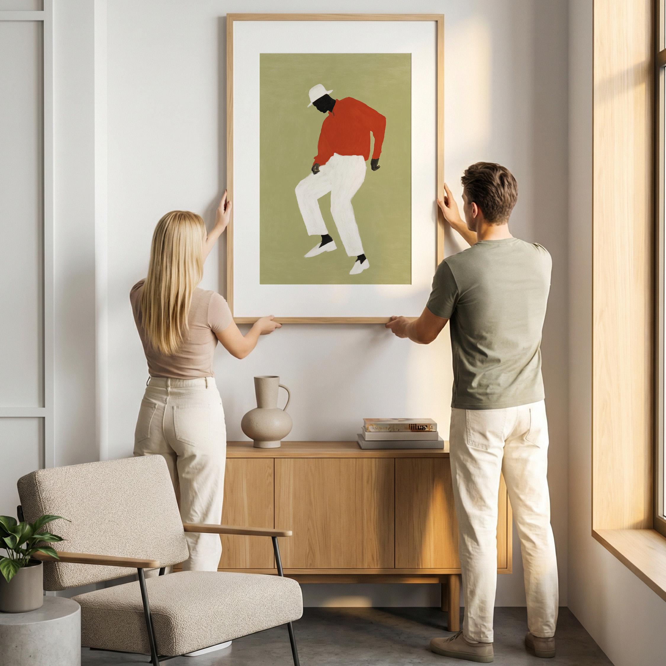 Black man dancing wall art print with a simple figure on a sage green background. Works well in a living room, office, or music space. It gives the room a relaxed and expressive feel.