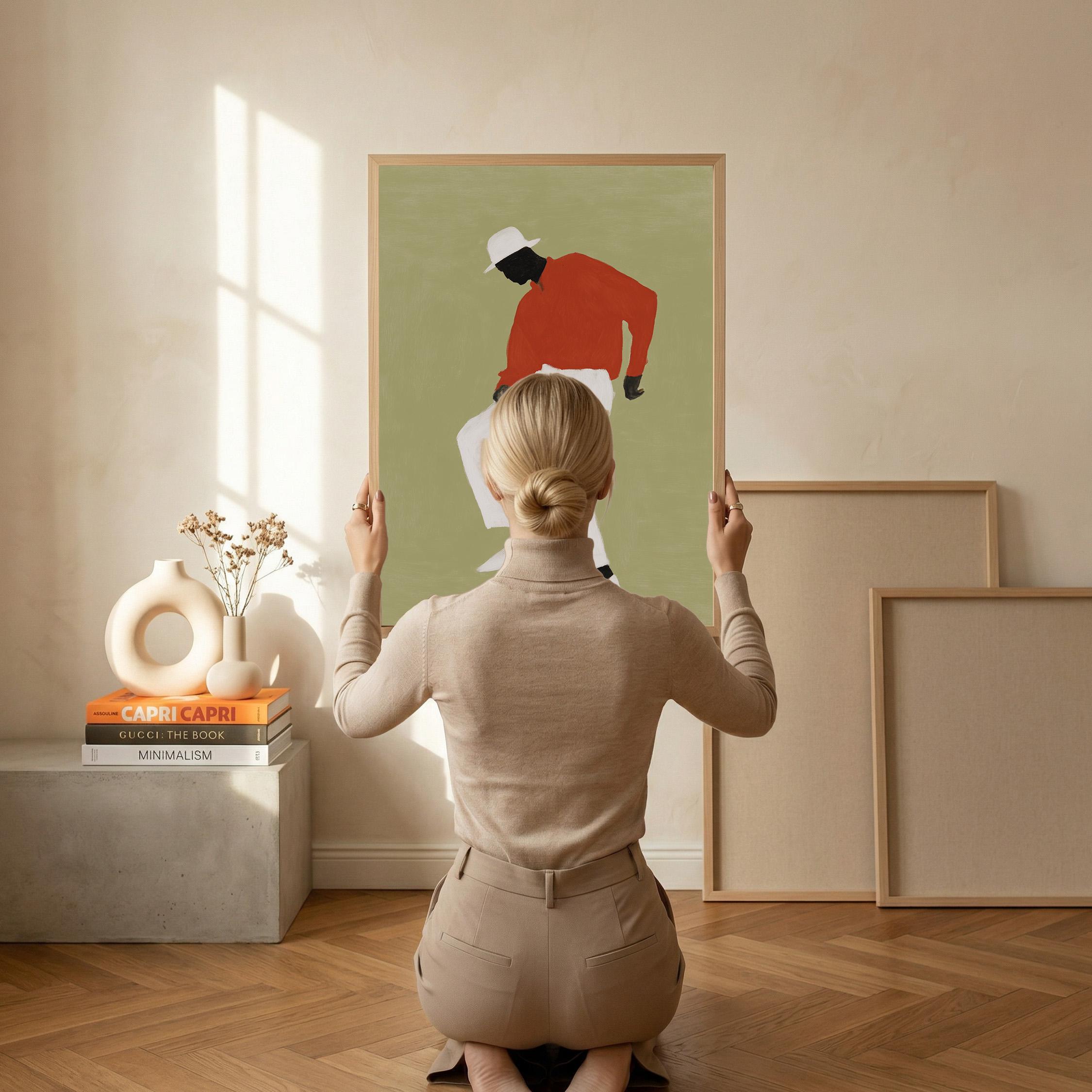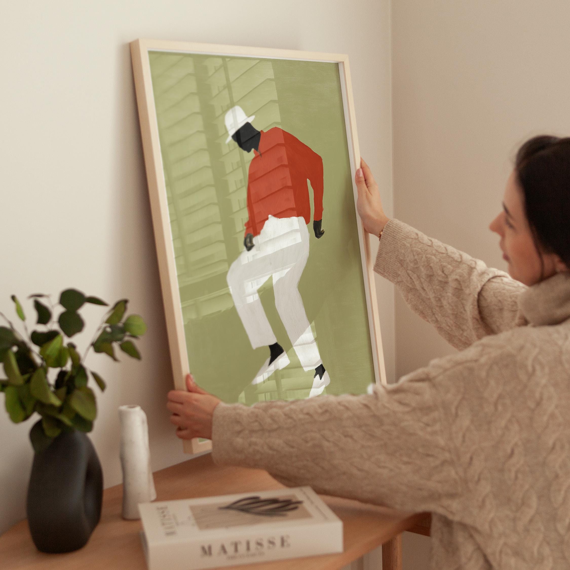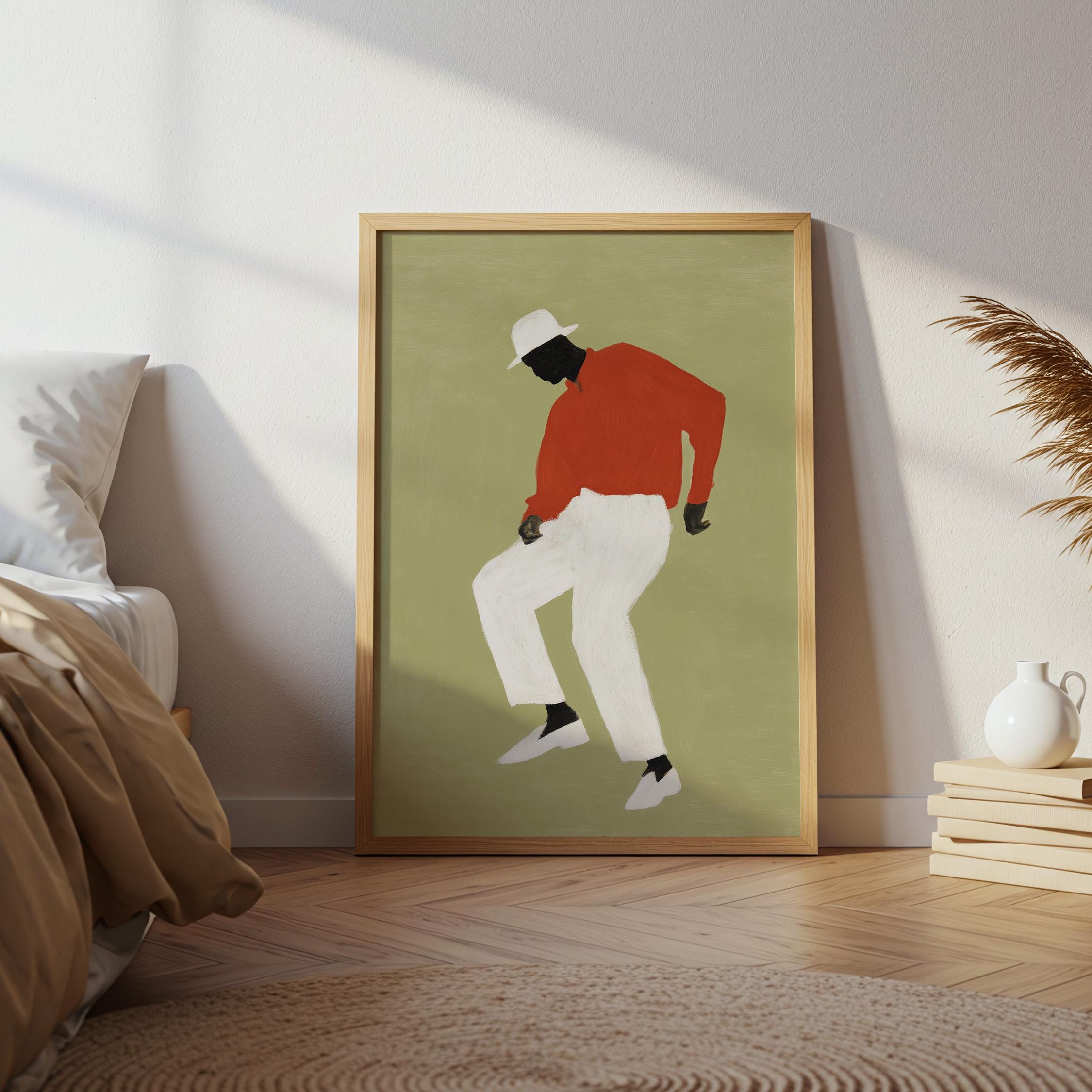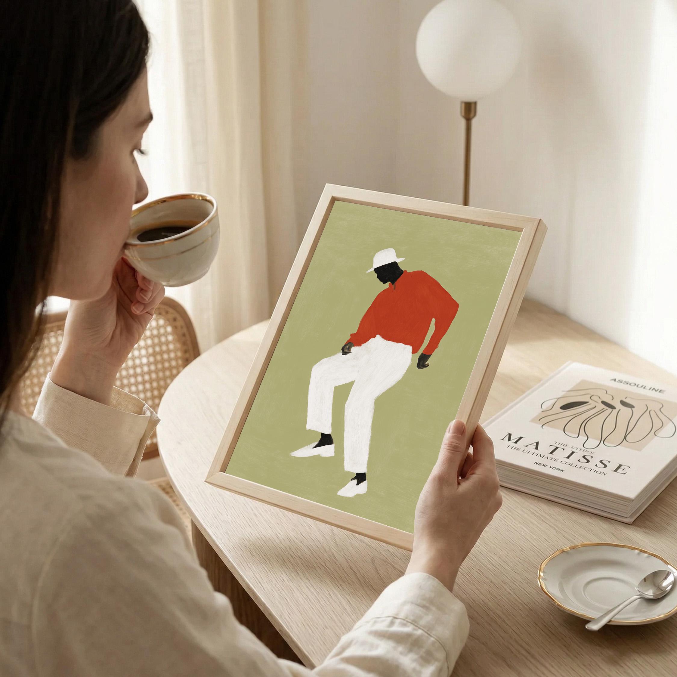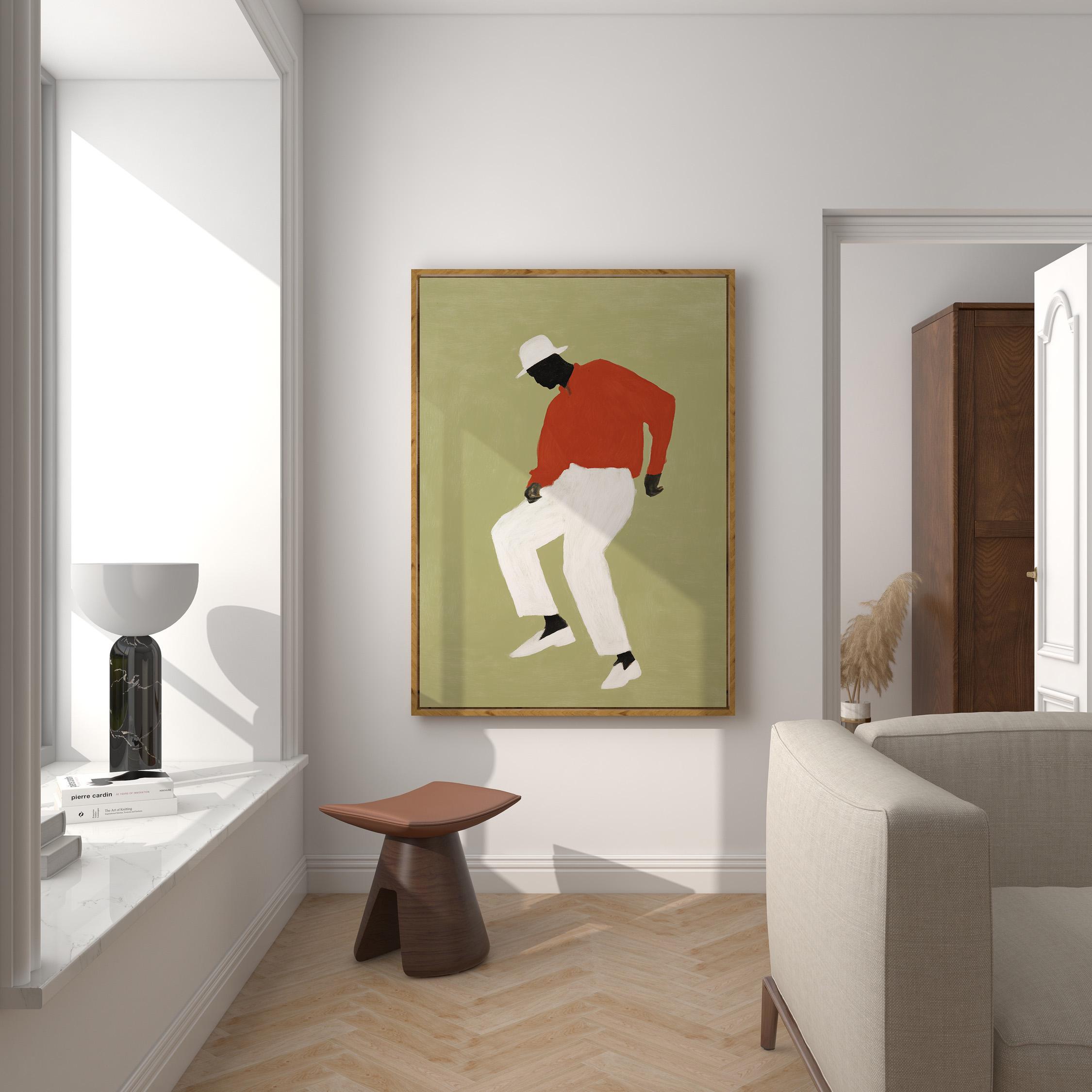 Black man dancing wall art print with a simple figure on a sage green background. Works well in a living room, office, or music space. It gives the room a relaxed and expressive feel.