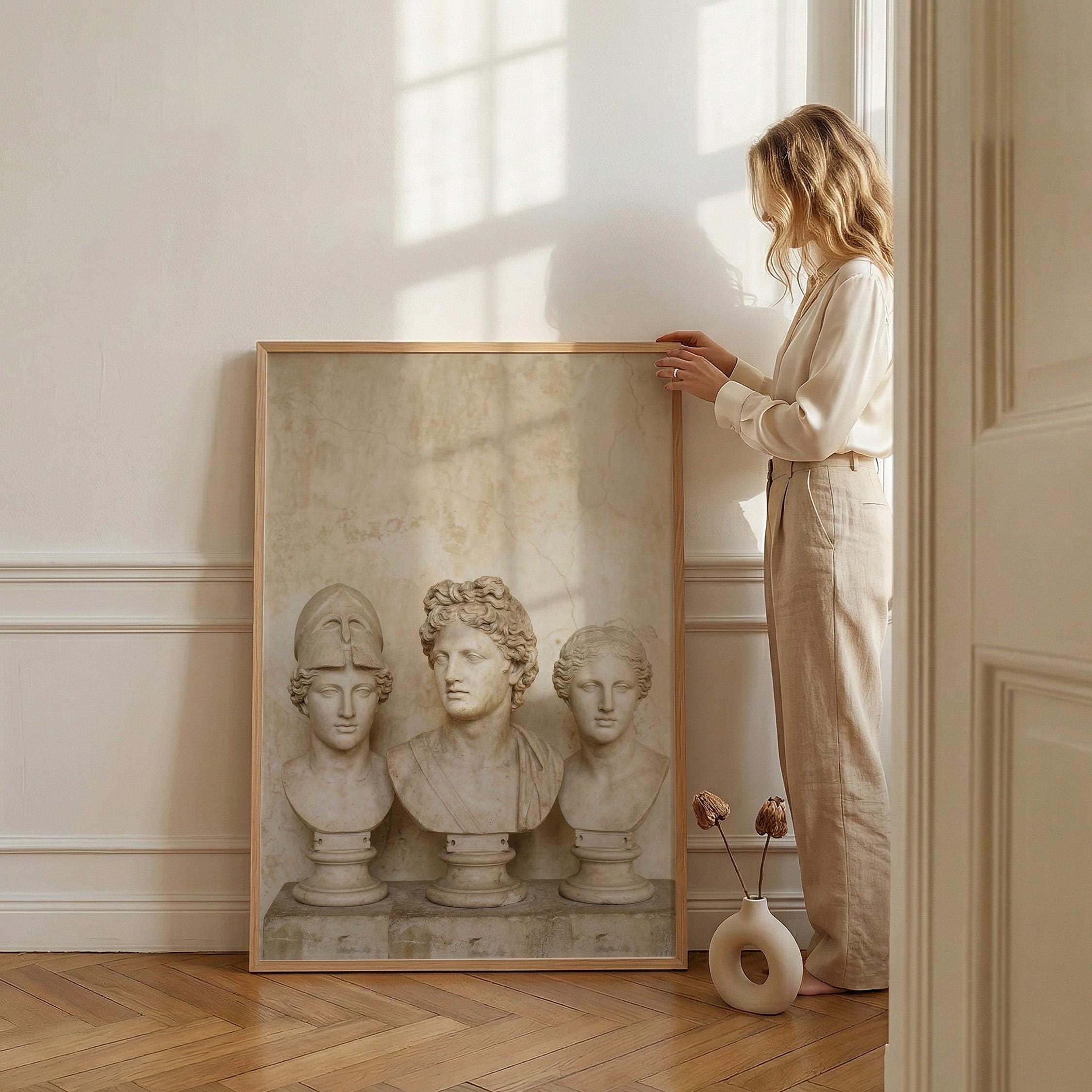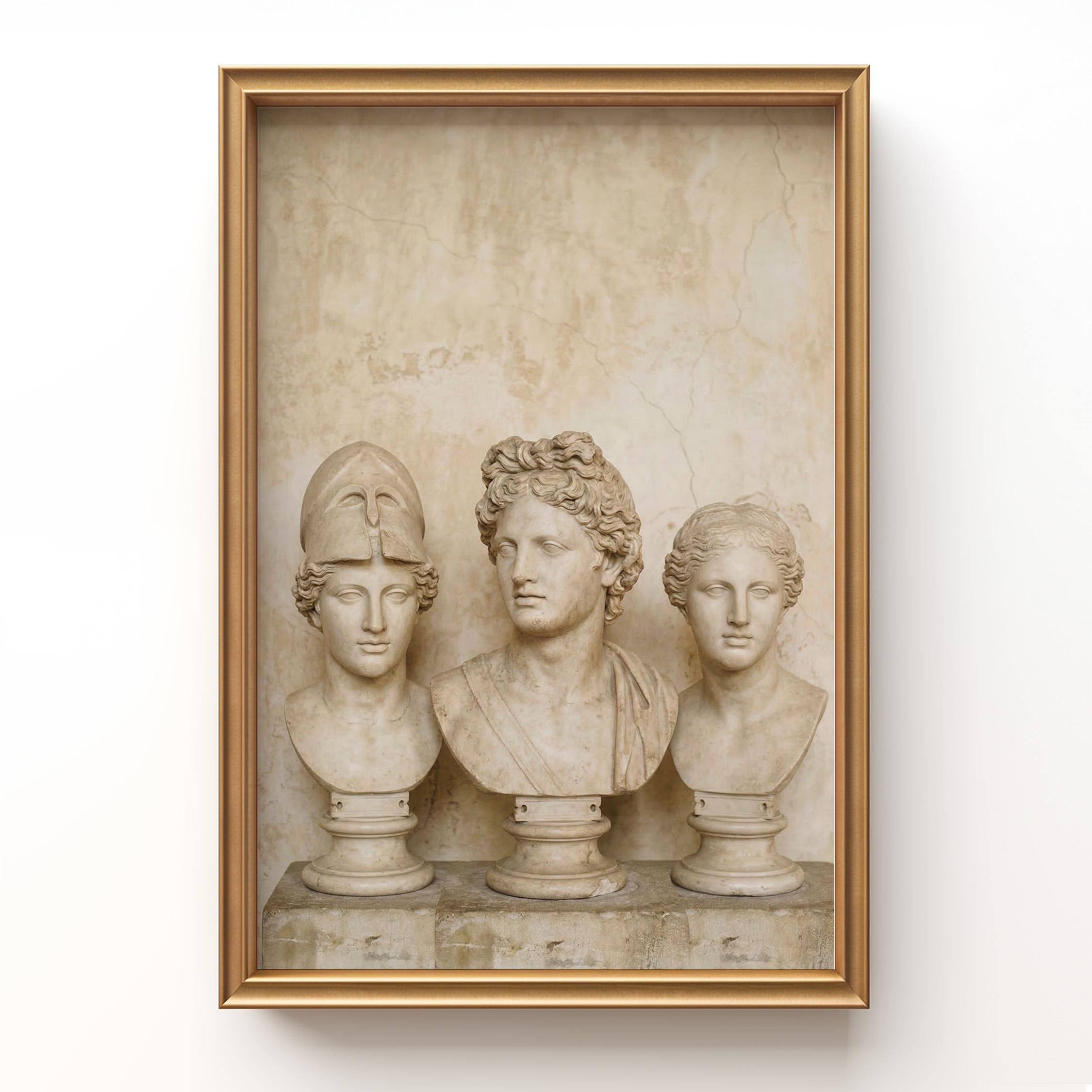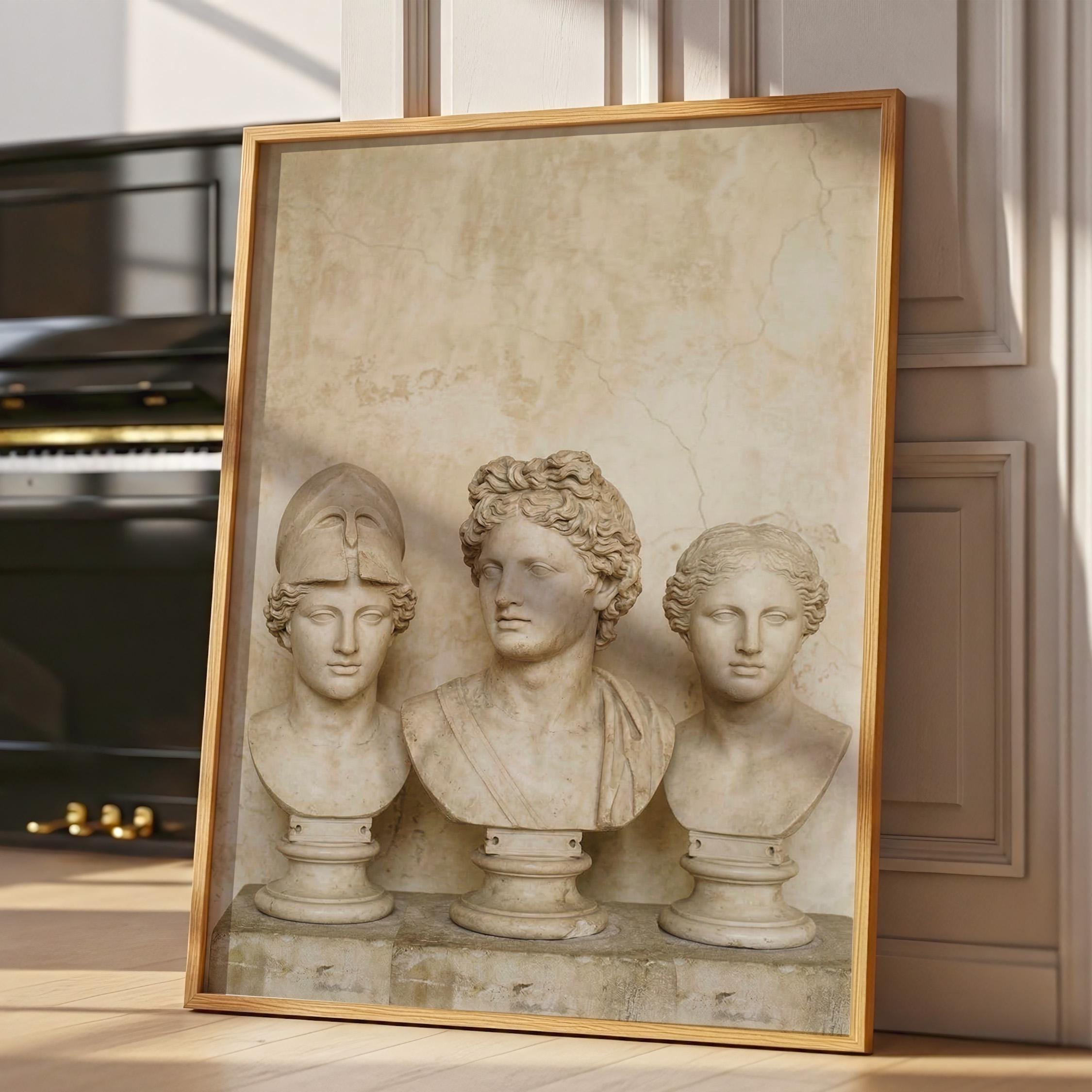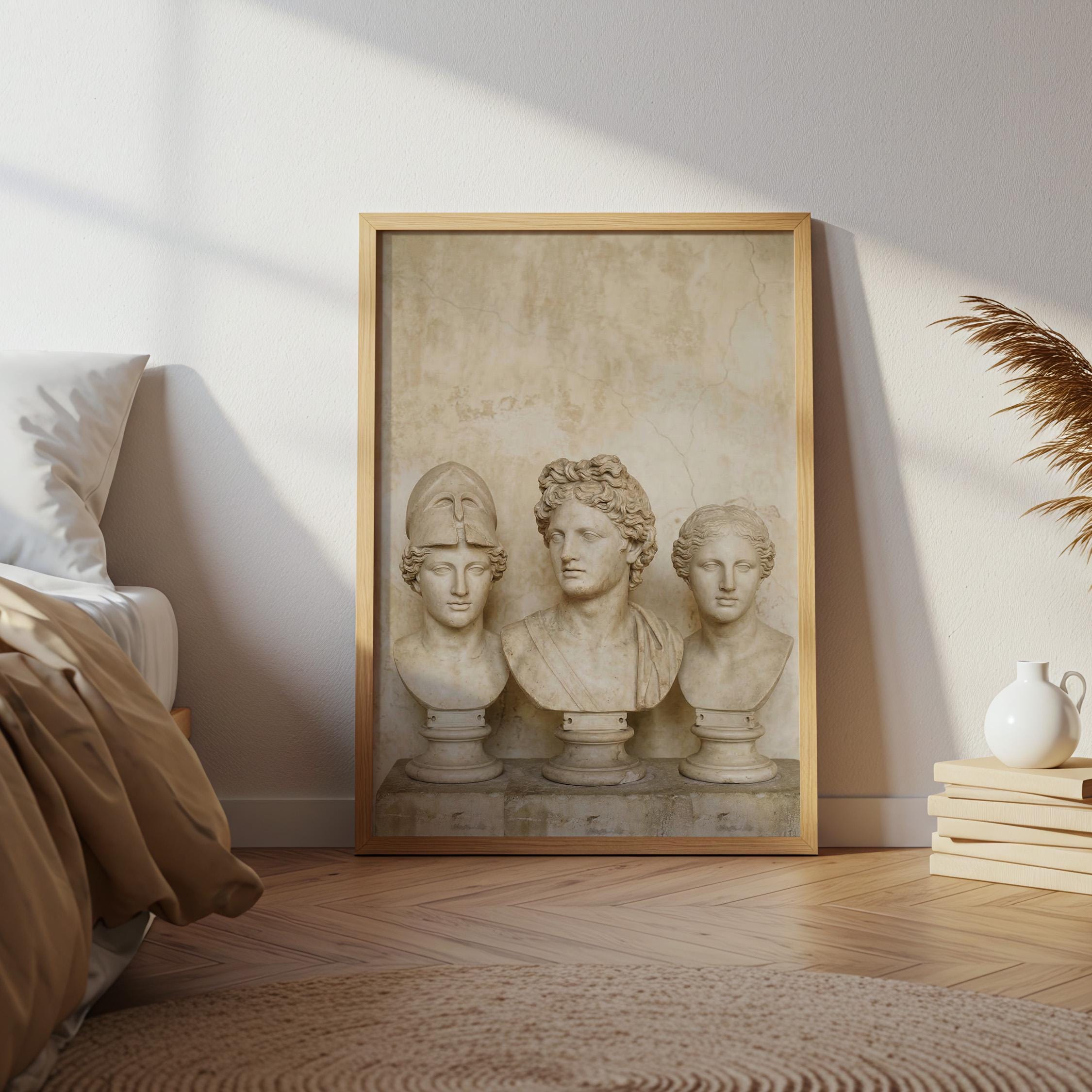 Greek statue wall art print with classical busts in soft neutral tones. Fits well in a living room, office, or gallery wall setup. It brings a calm, timeless and refined atmosphere to the space.