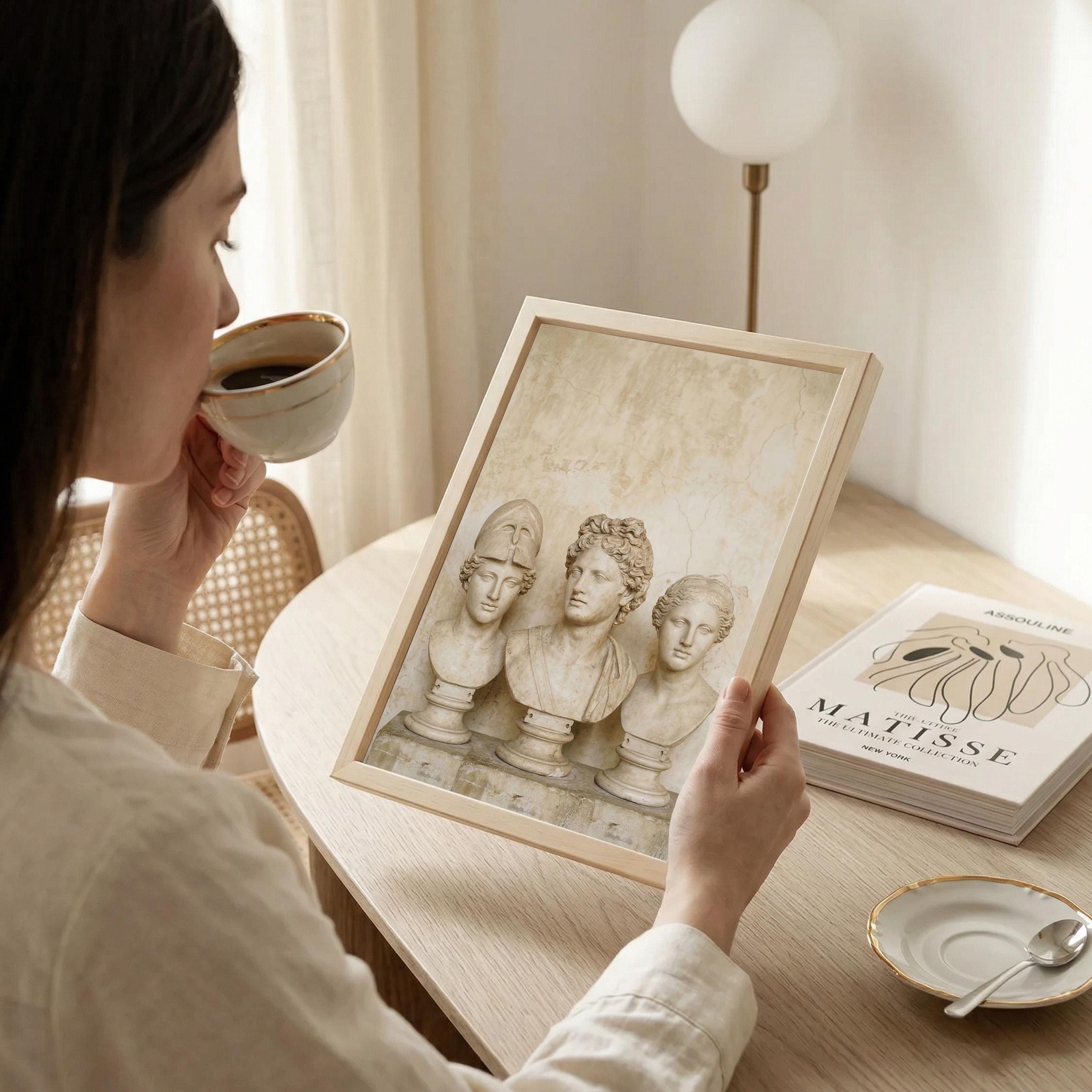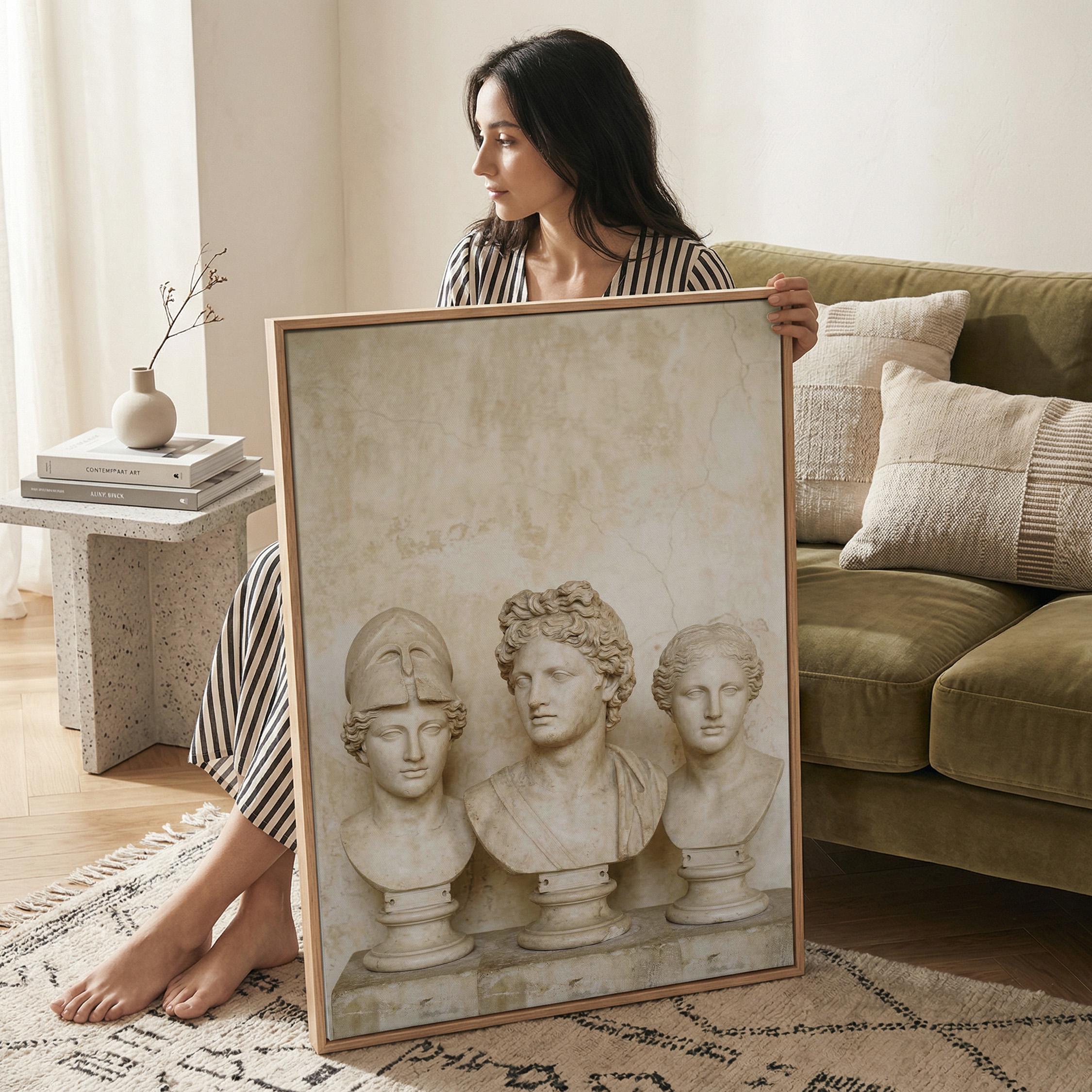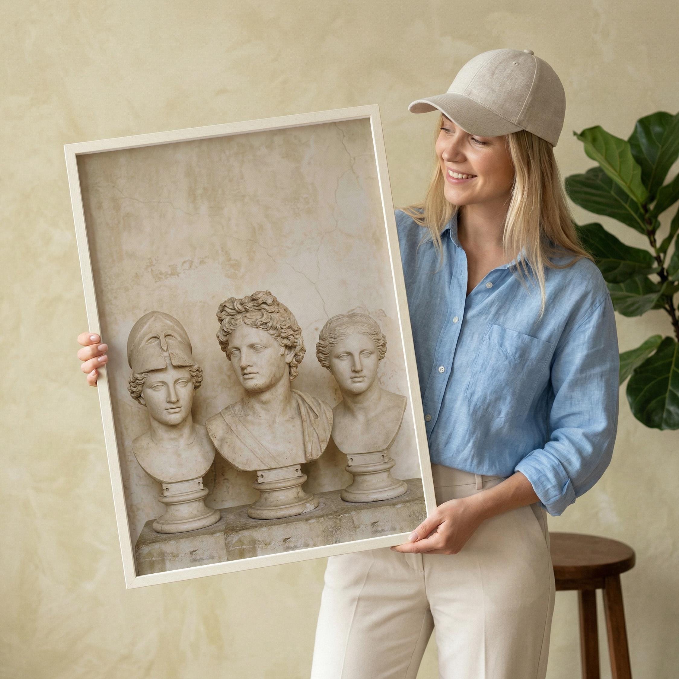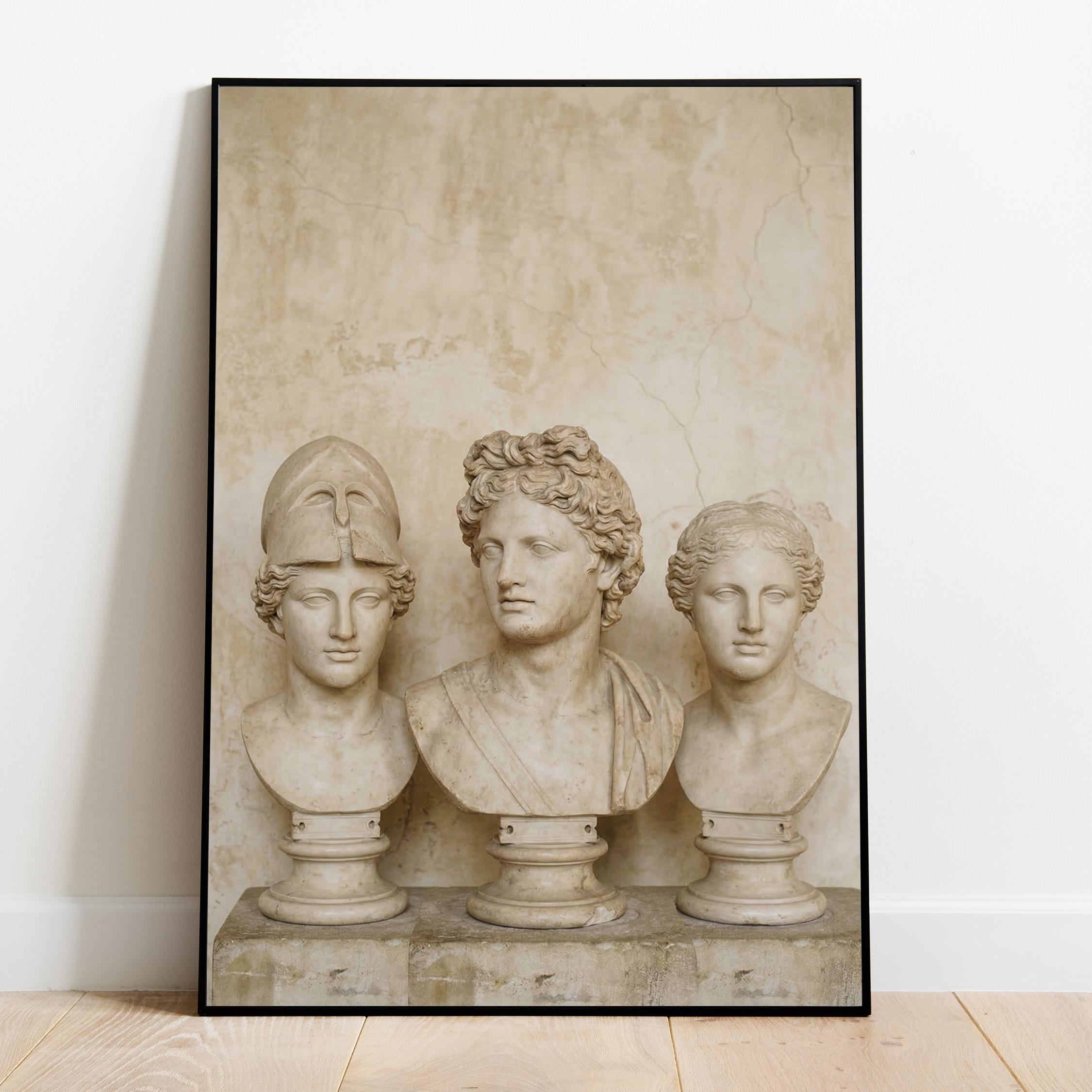 Greek statue wall art print with classical busts in soft neutral tones. Fits well in a living room, office, or gallery wall setup. It brings a calm, timeless and refined atmosphere to the space.