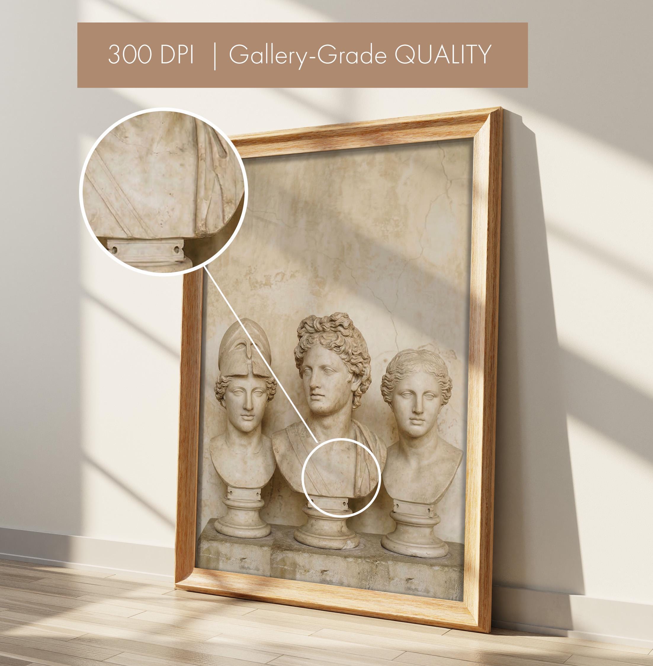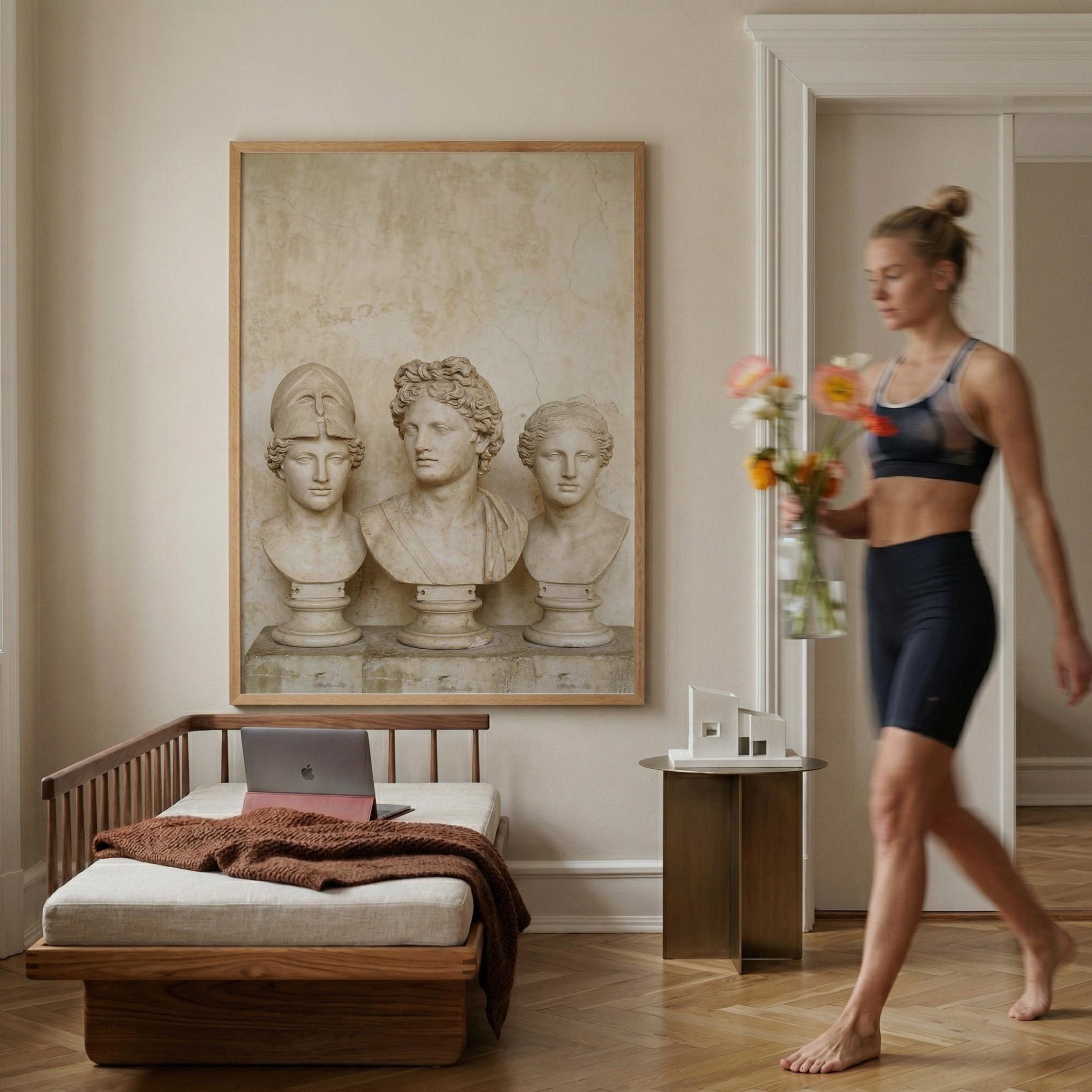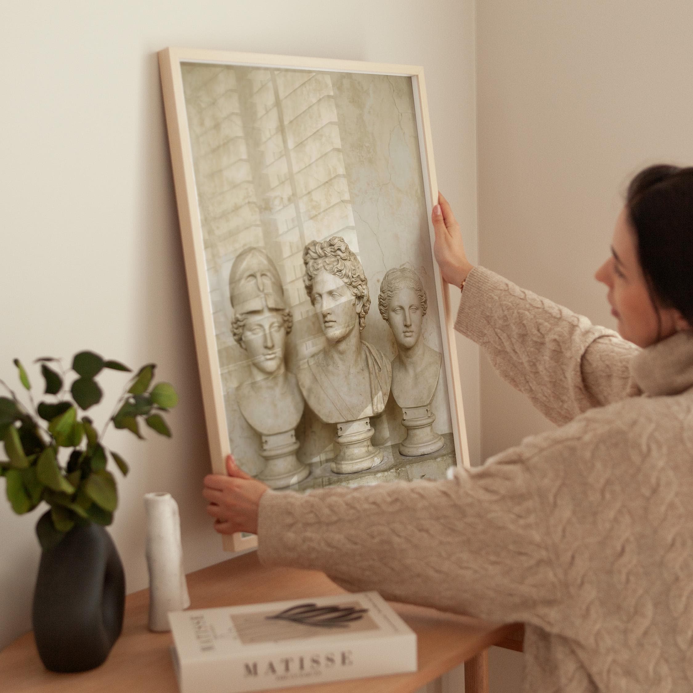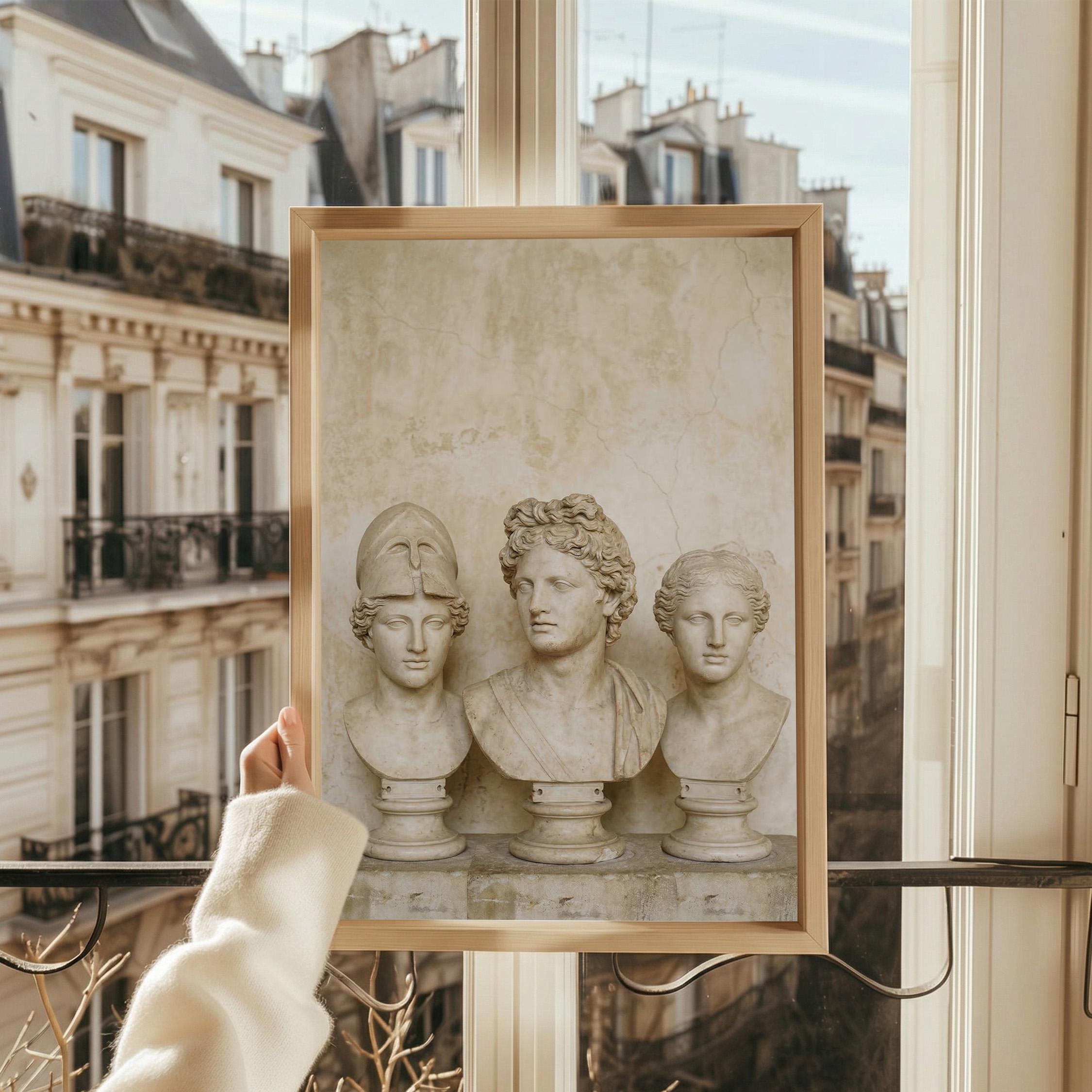 Greek statue wall art print with classical busts in soft neutral tones. Fits well in a living room, office, or gallery wall setup. It brings a calm, timeless and refined atmosphere to the space.