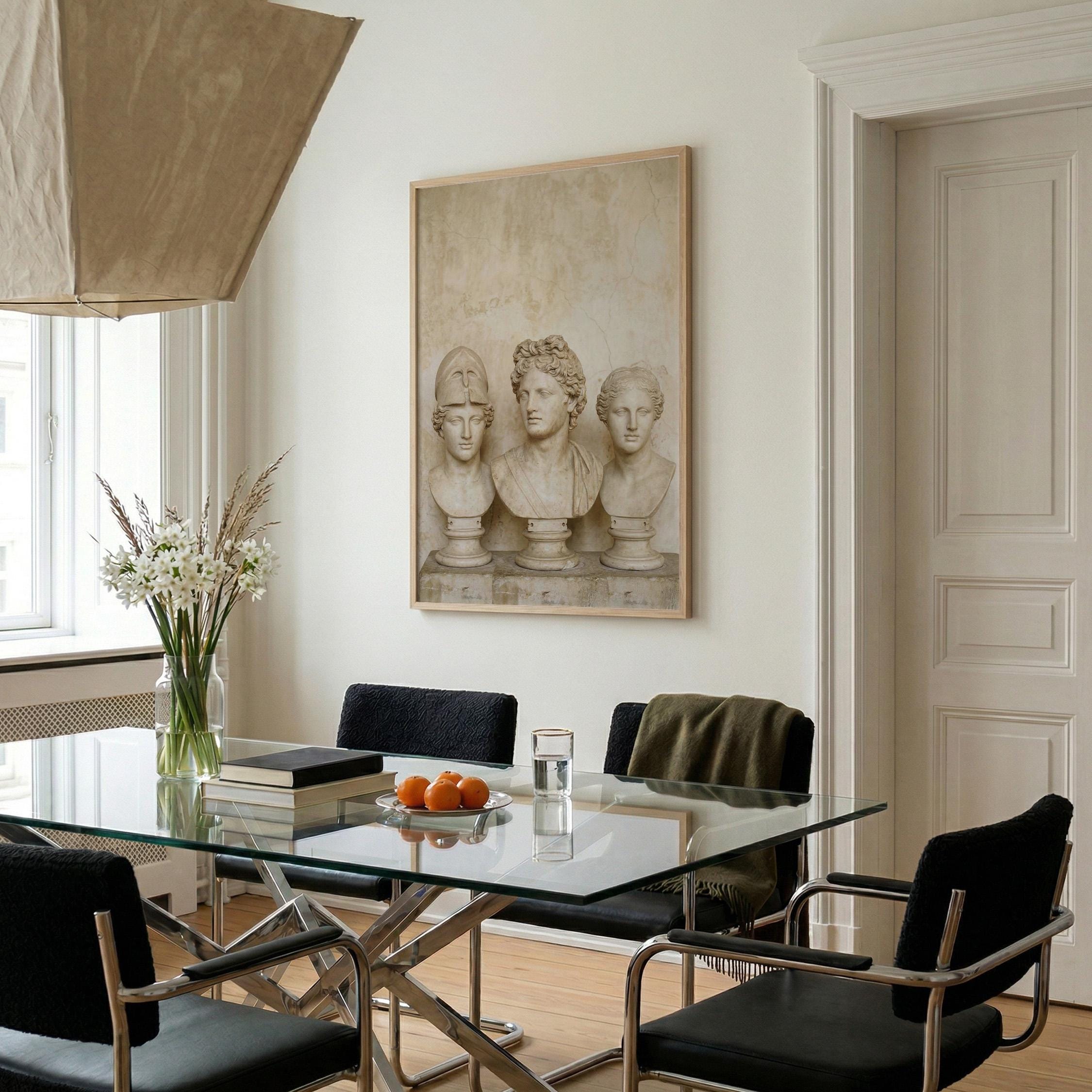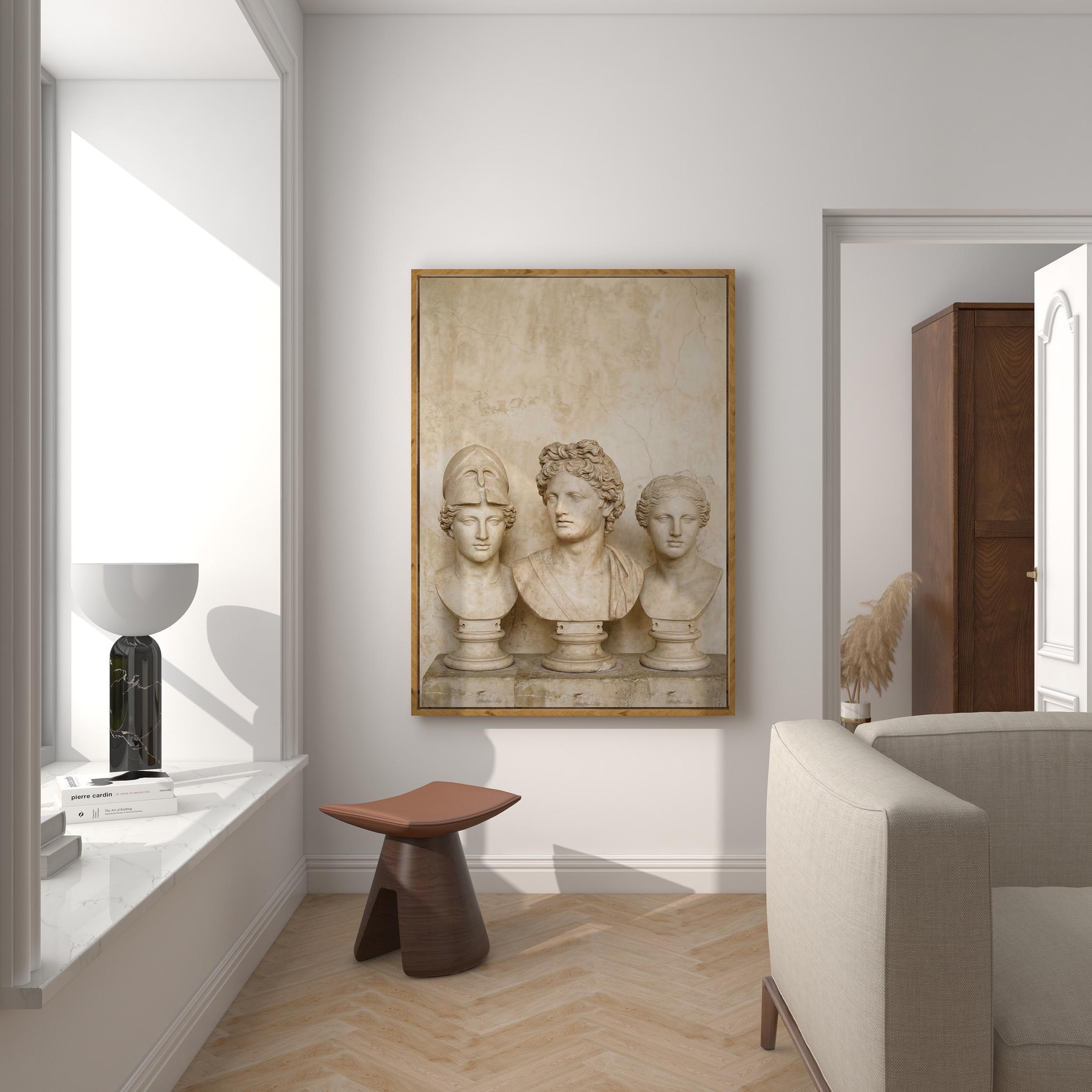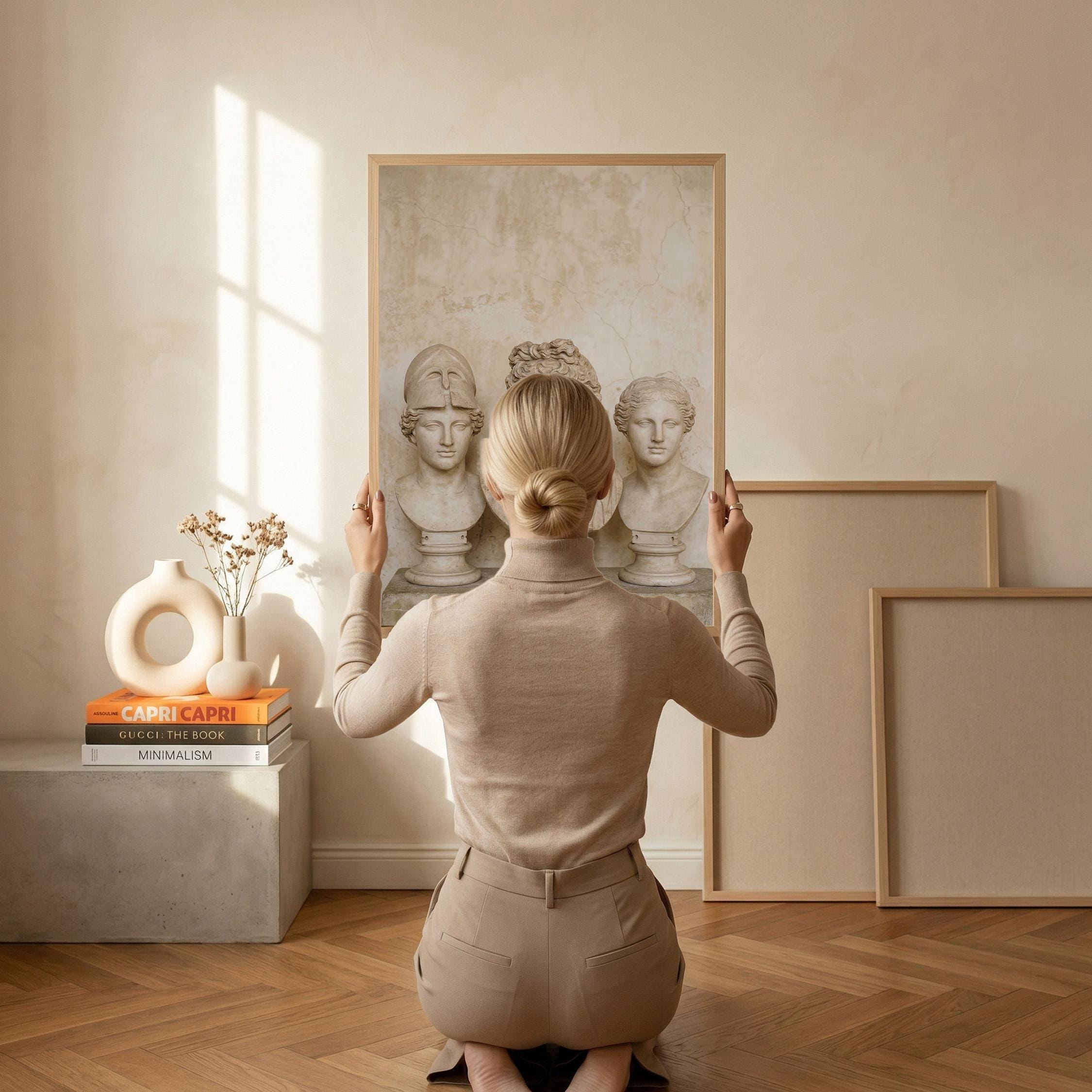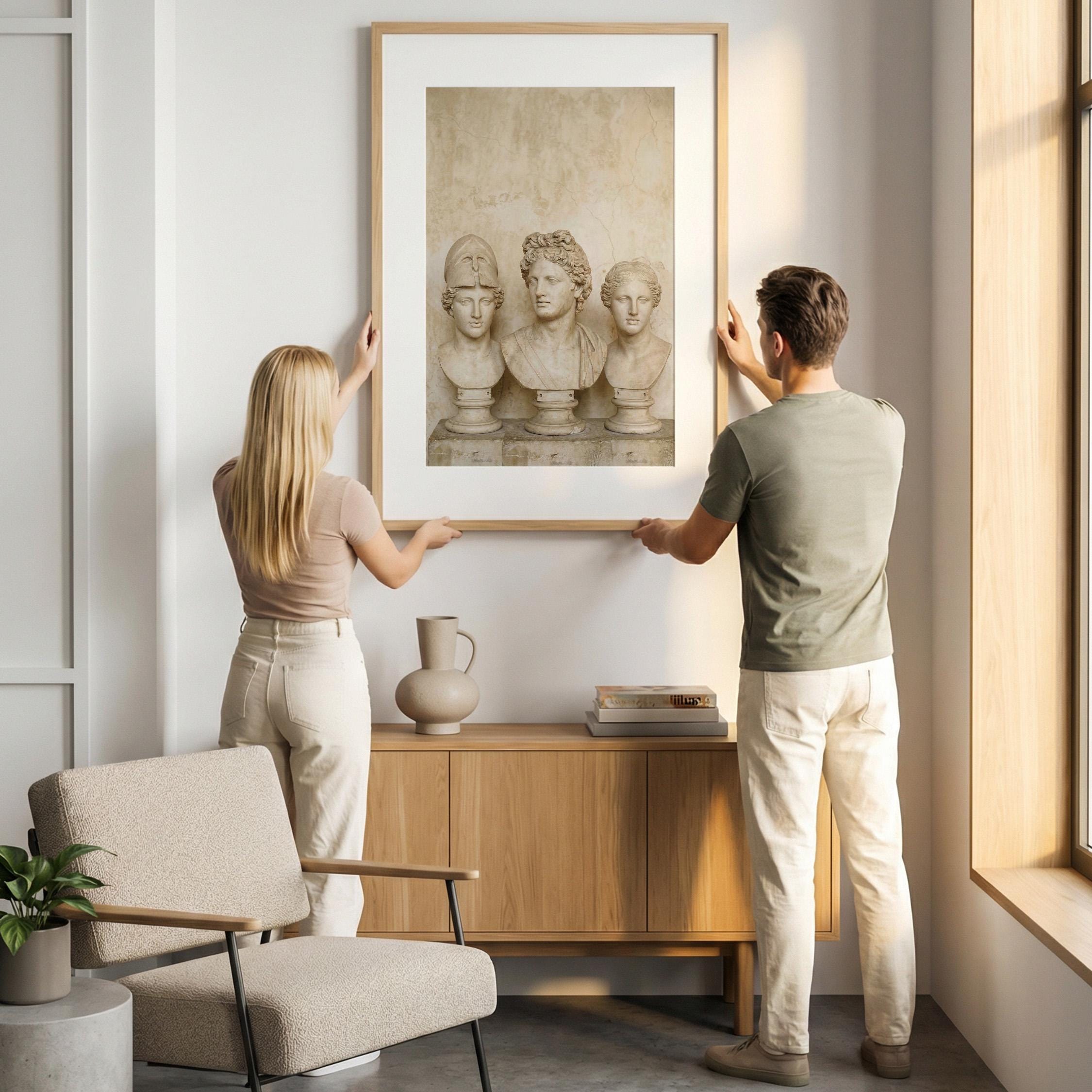 Greek statue wall art print with classical busts in soft neutral tones. Fits well in a living room, office, or gallery wall setup. It brings a calm, timeless and refined atmosphere to the space.