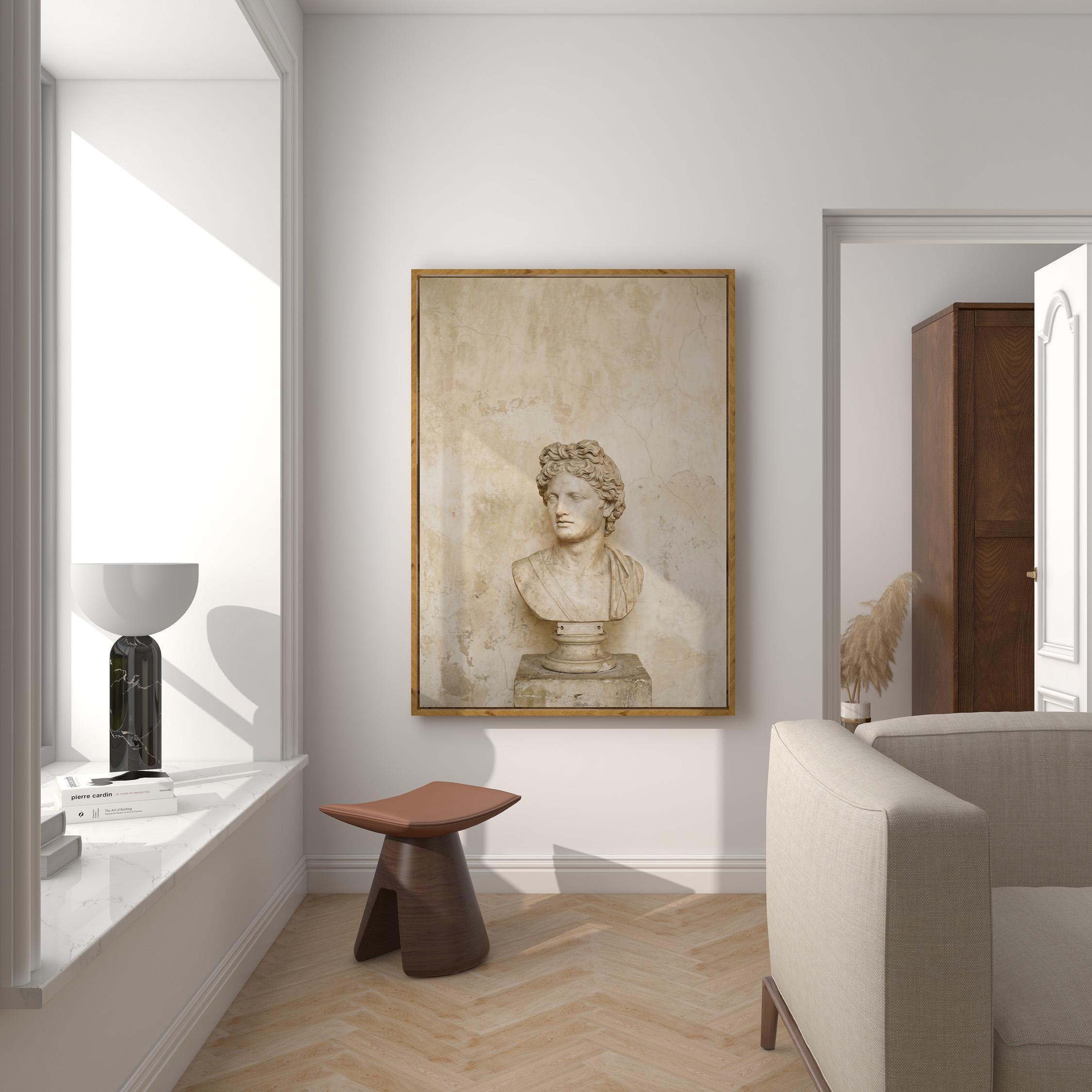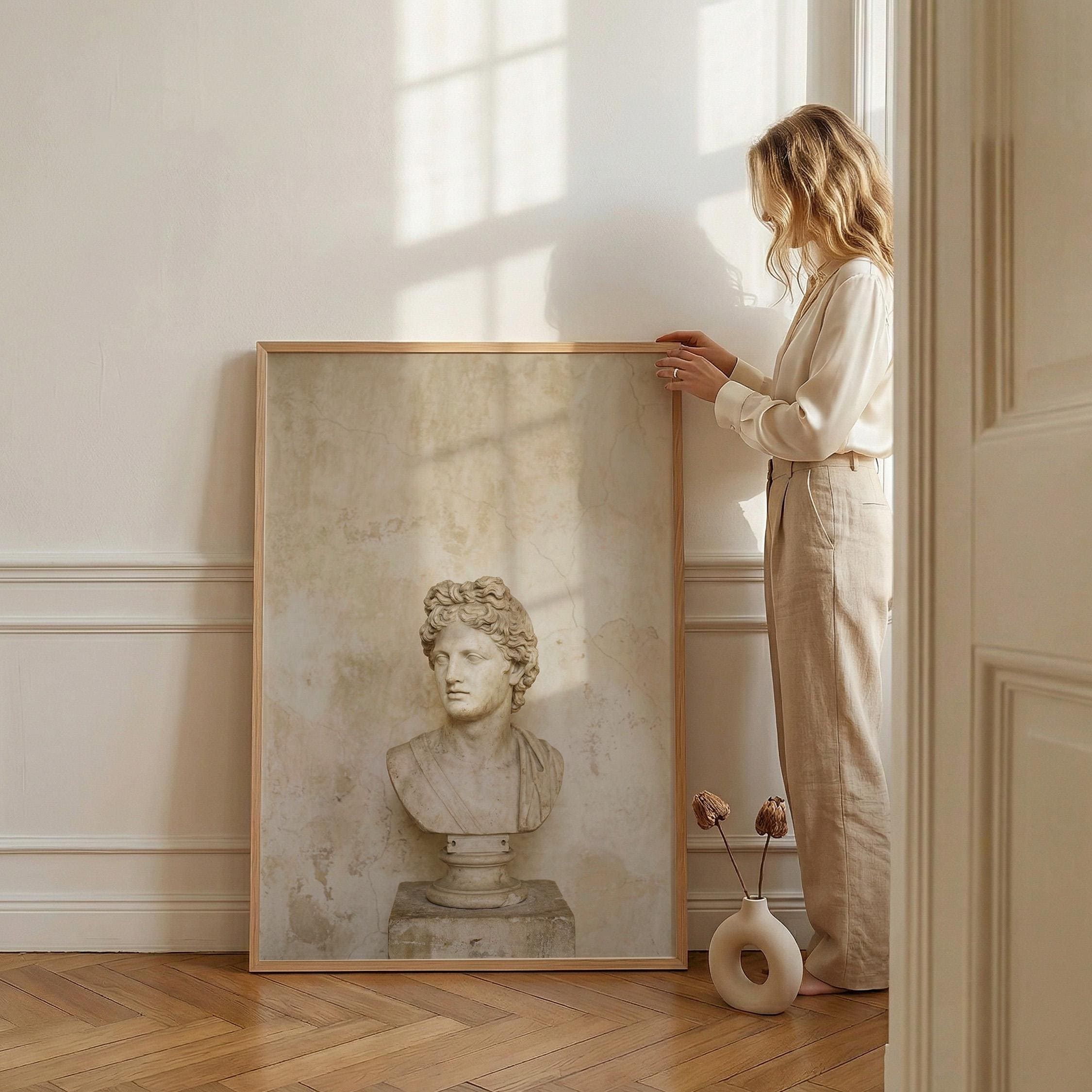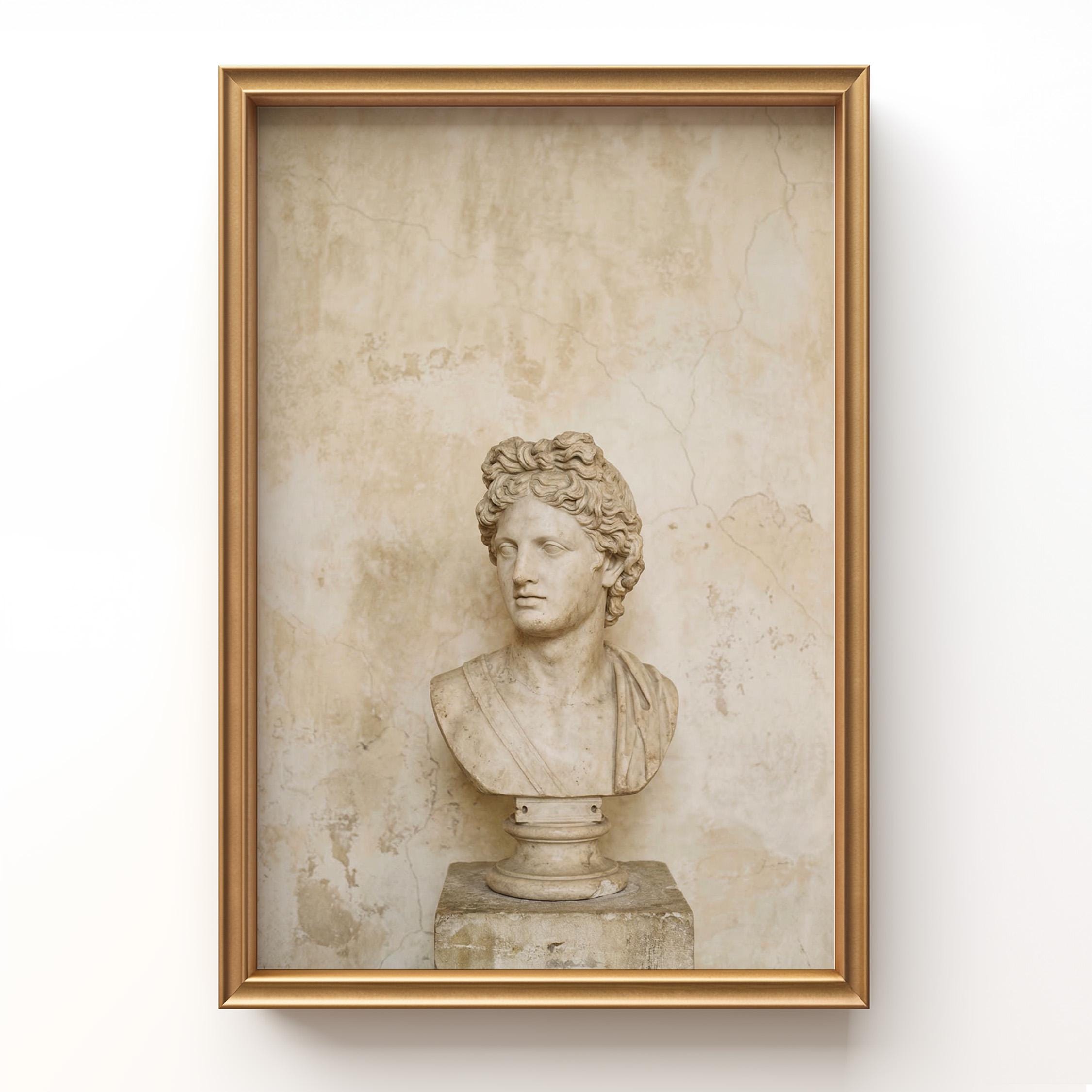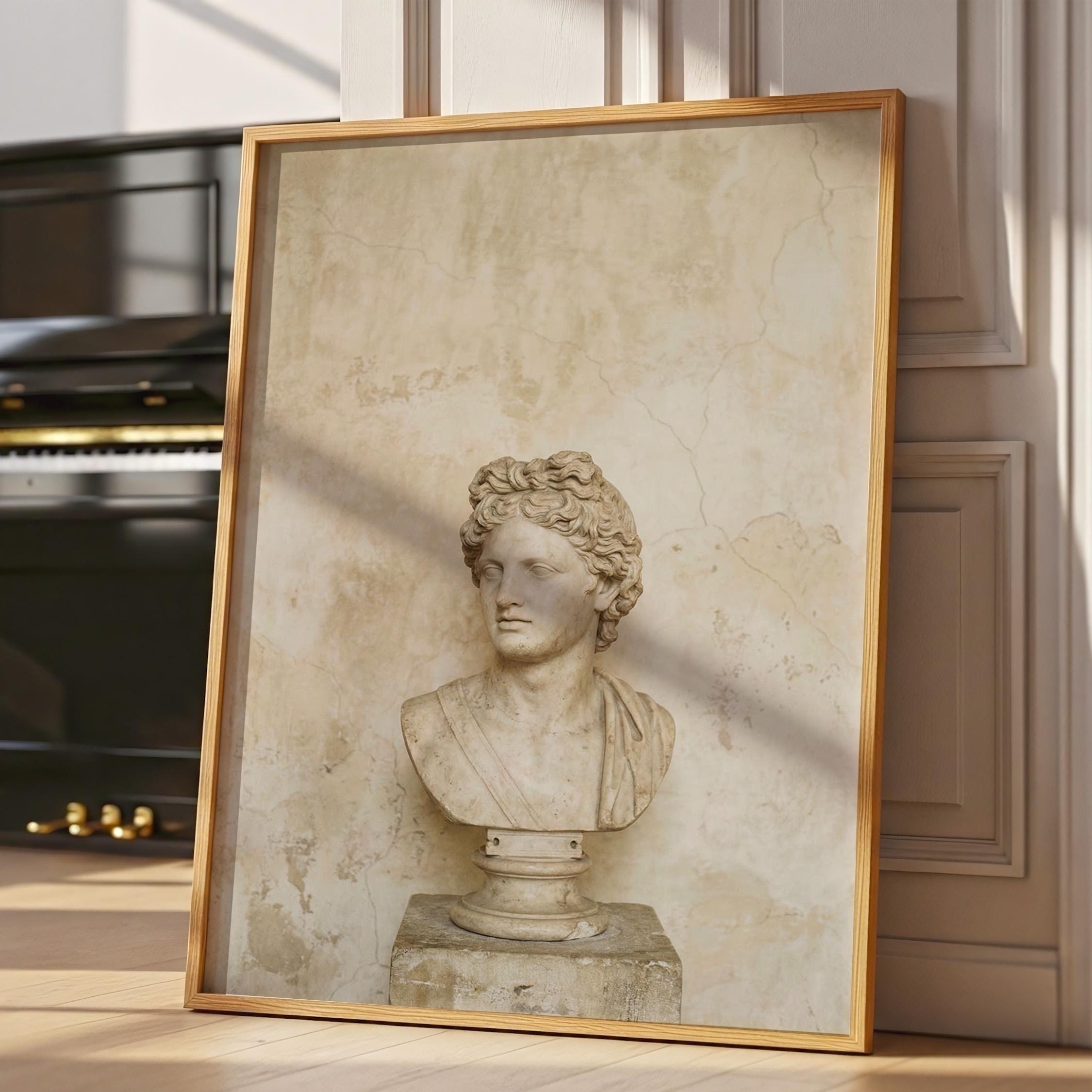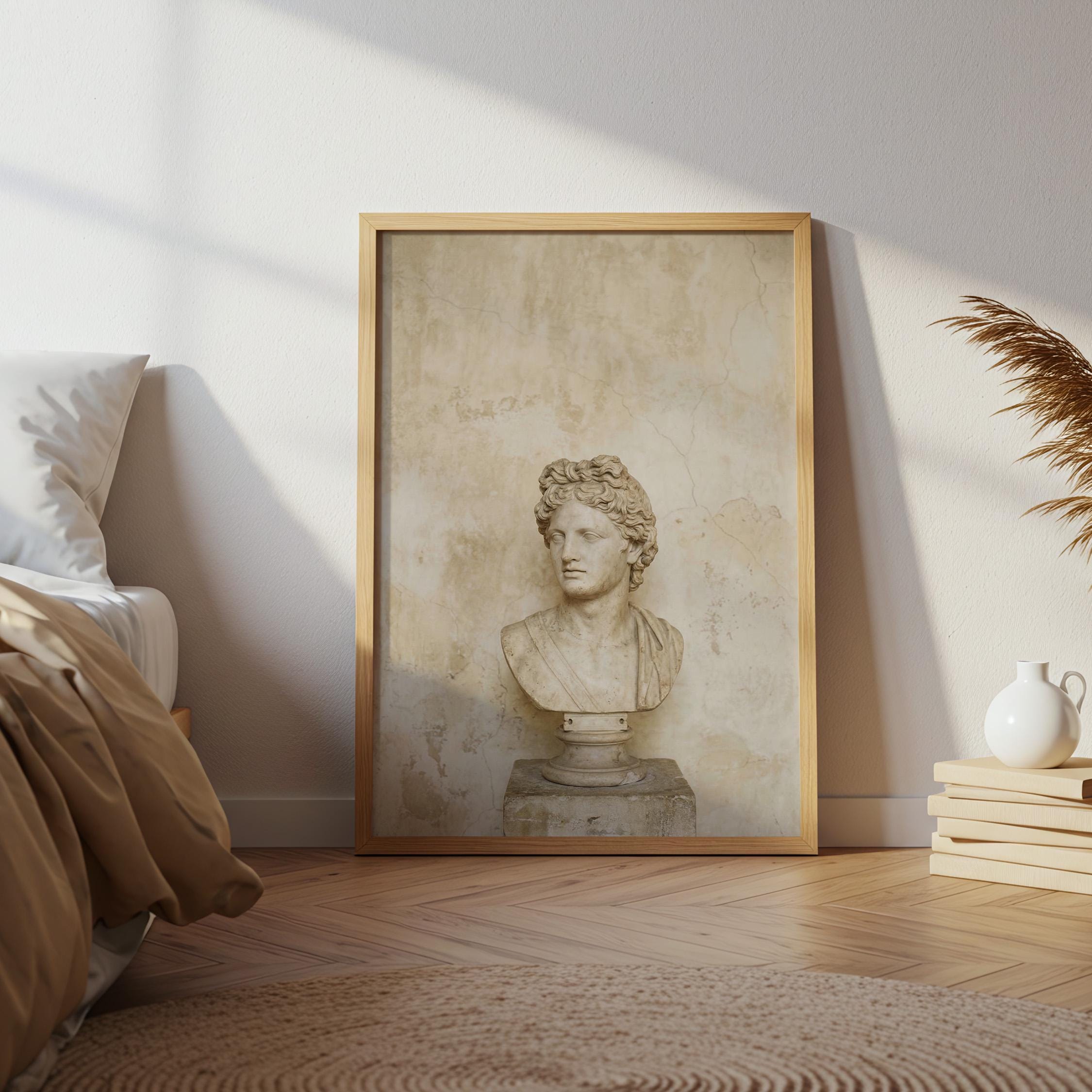 Apollo bust wall art print with a classical sculpture in warm neutral tones. Works well in a living room, office, or refined gallery wall. It brings a calm, elegant and timeless presence to the space.
