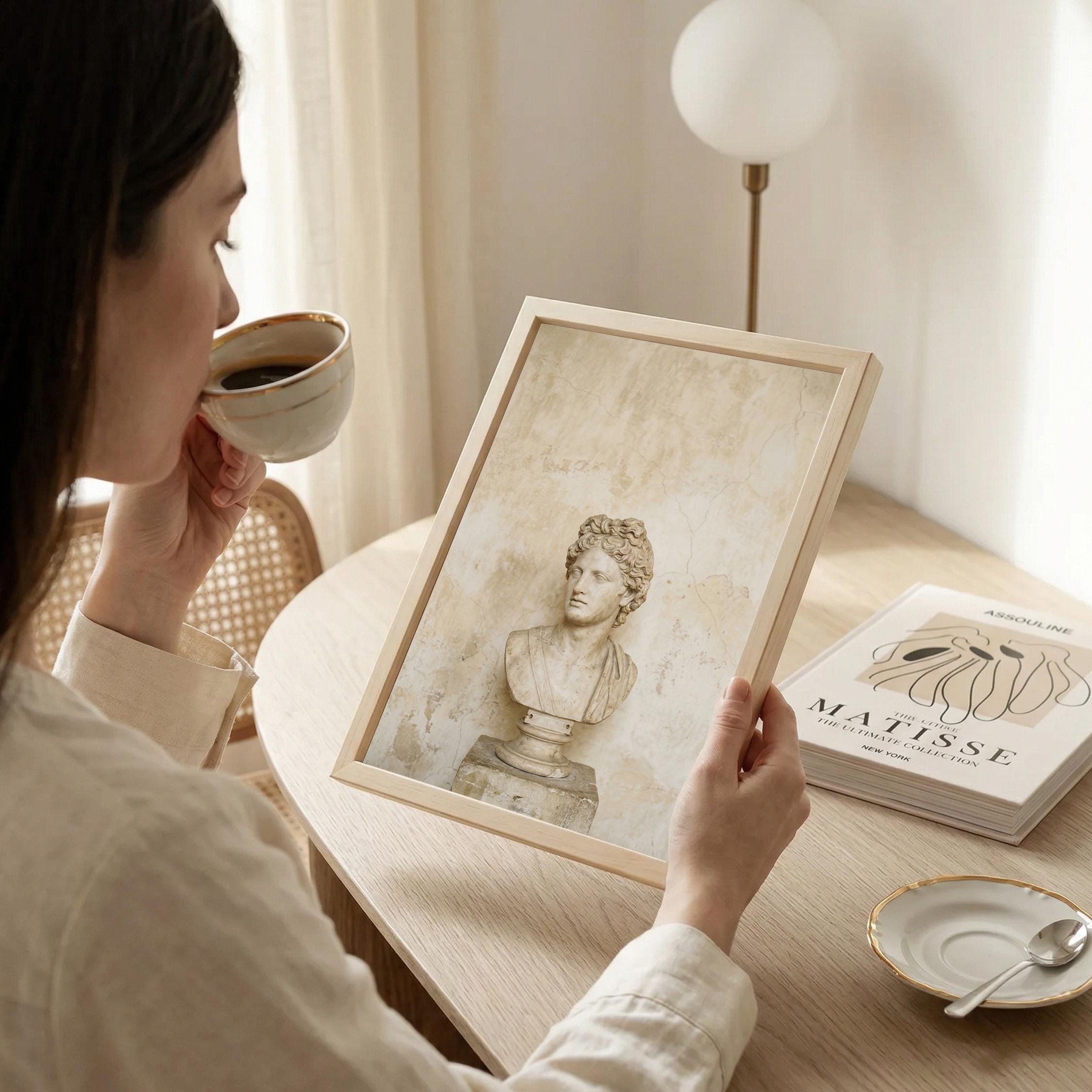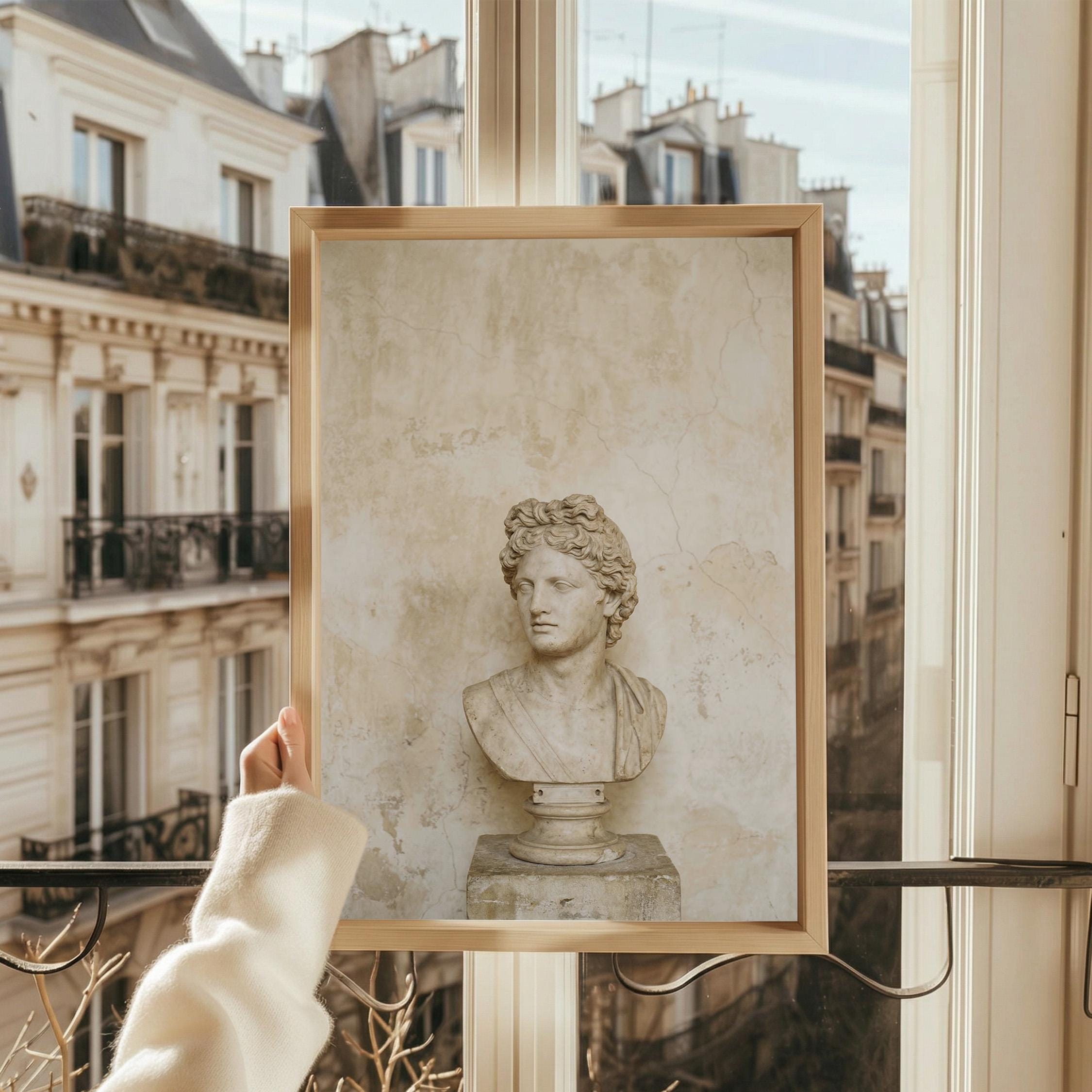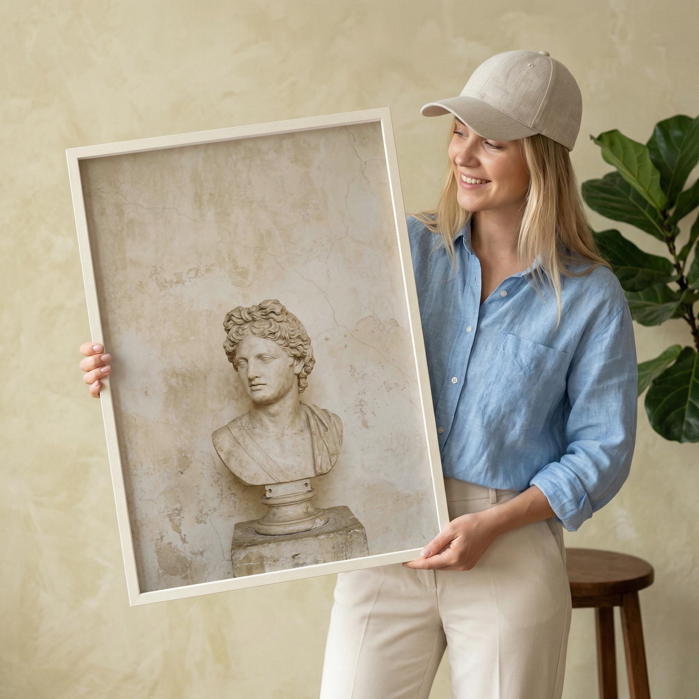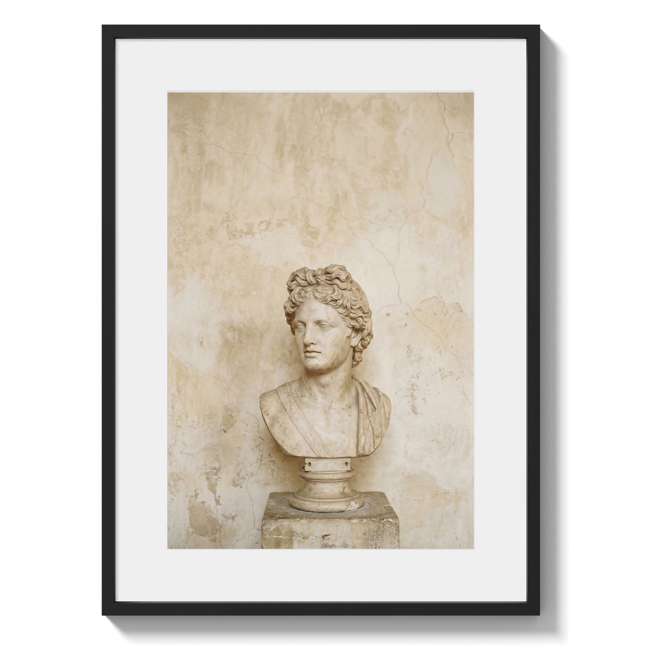 Apollo bust wall art print with a classical sculpture in warm neutral tones. Works well in a living room, office, or refined gallery wall. It brings a calm, elegant and timeless presence to the space.
