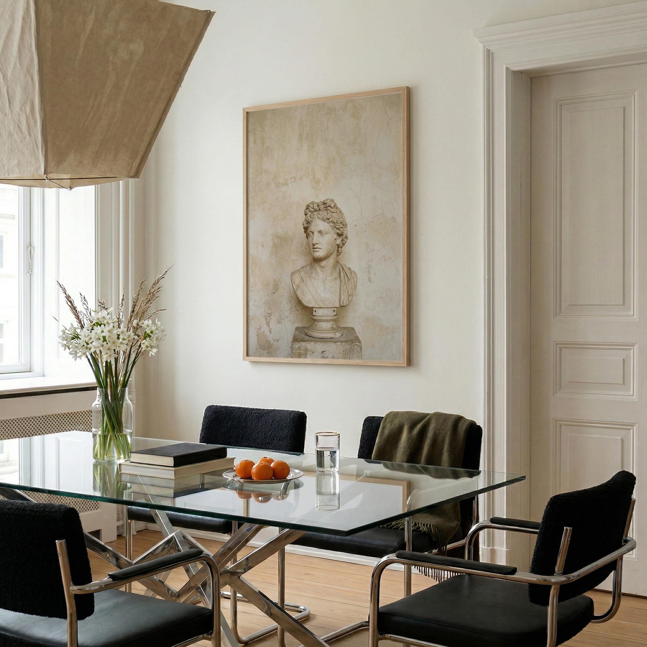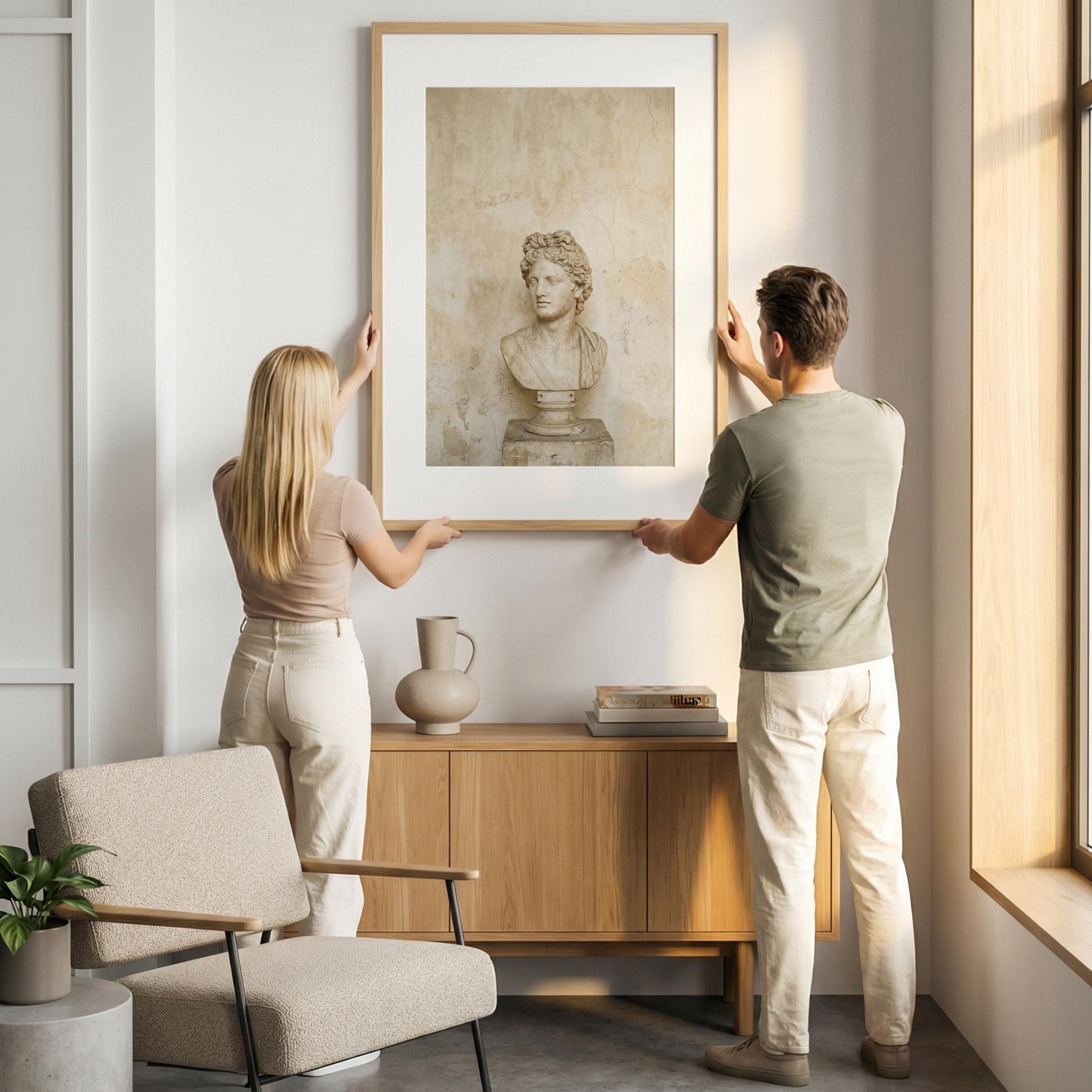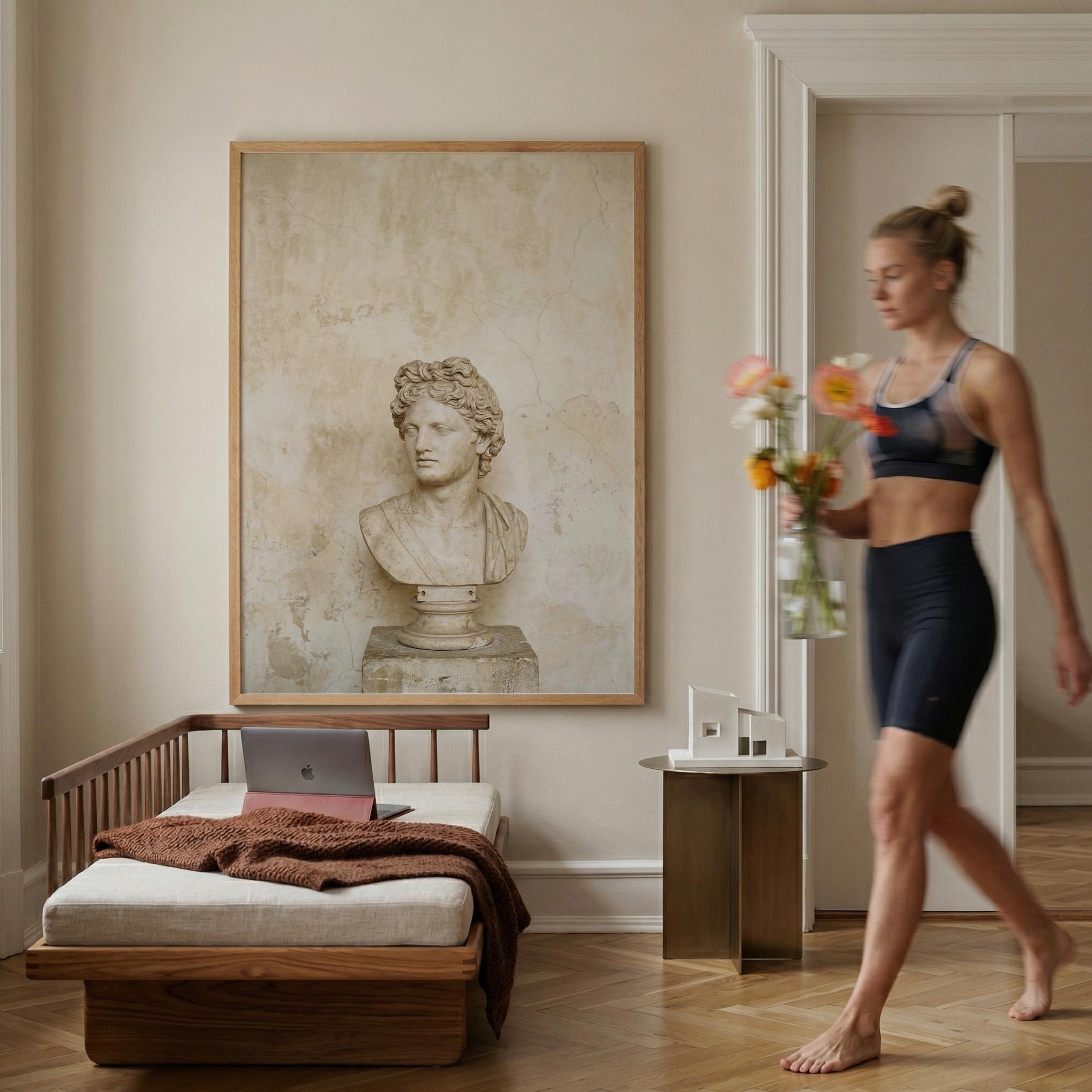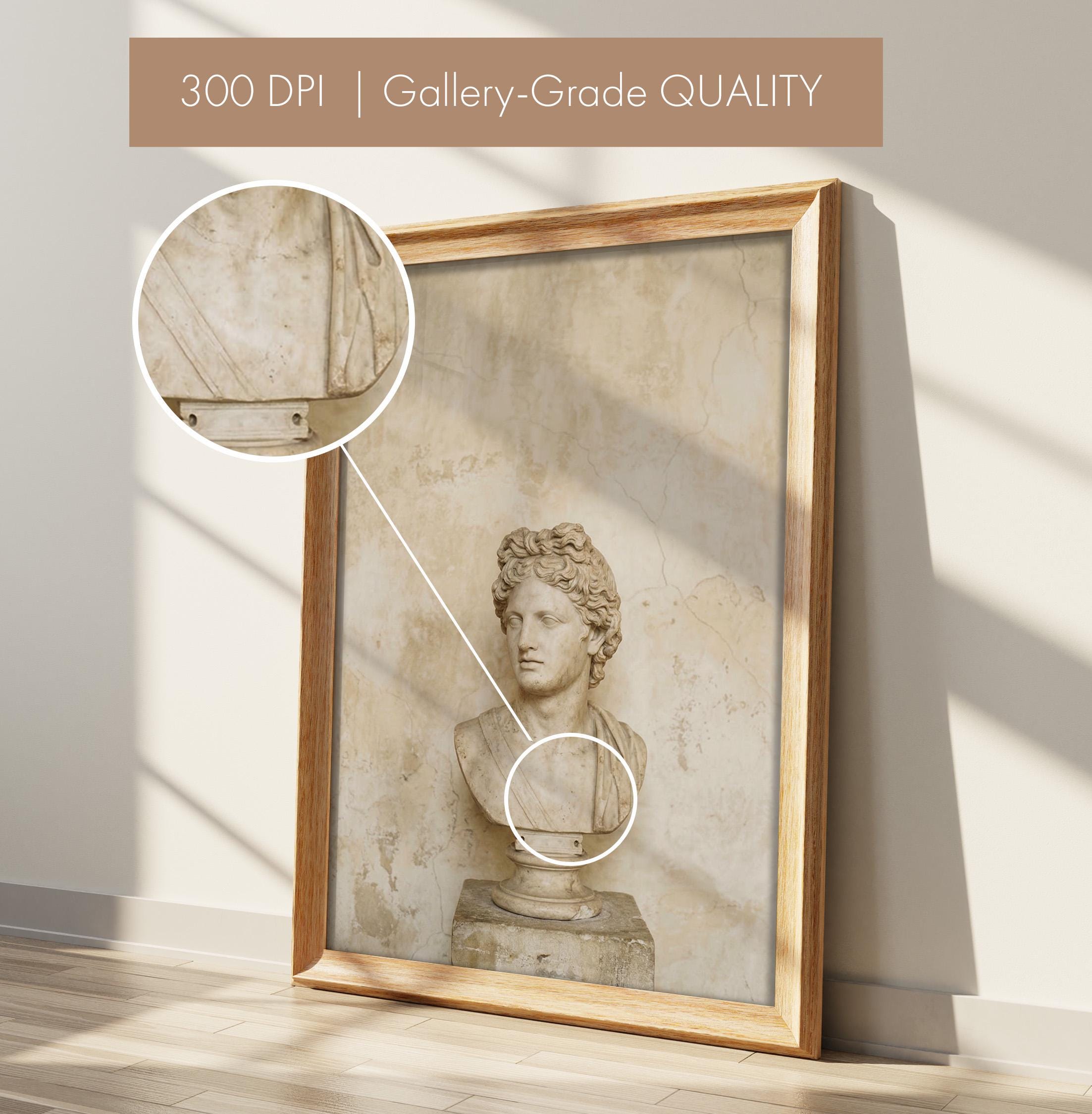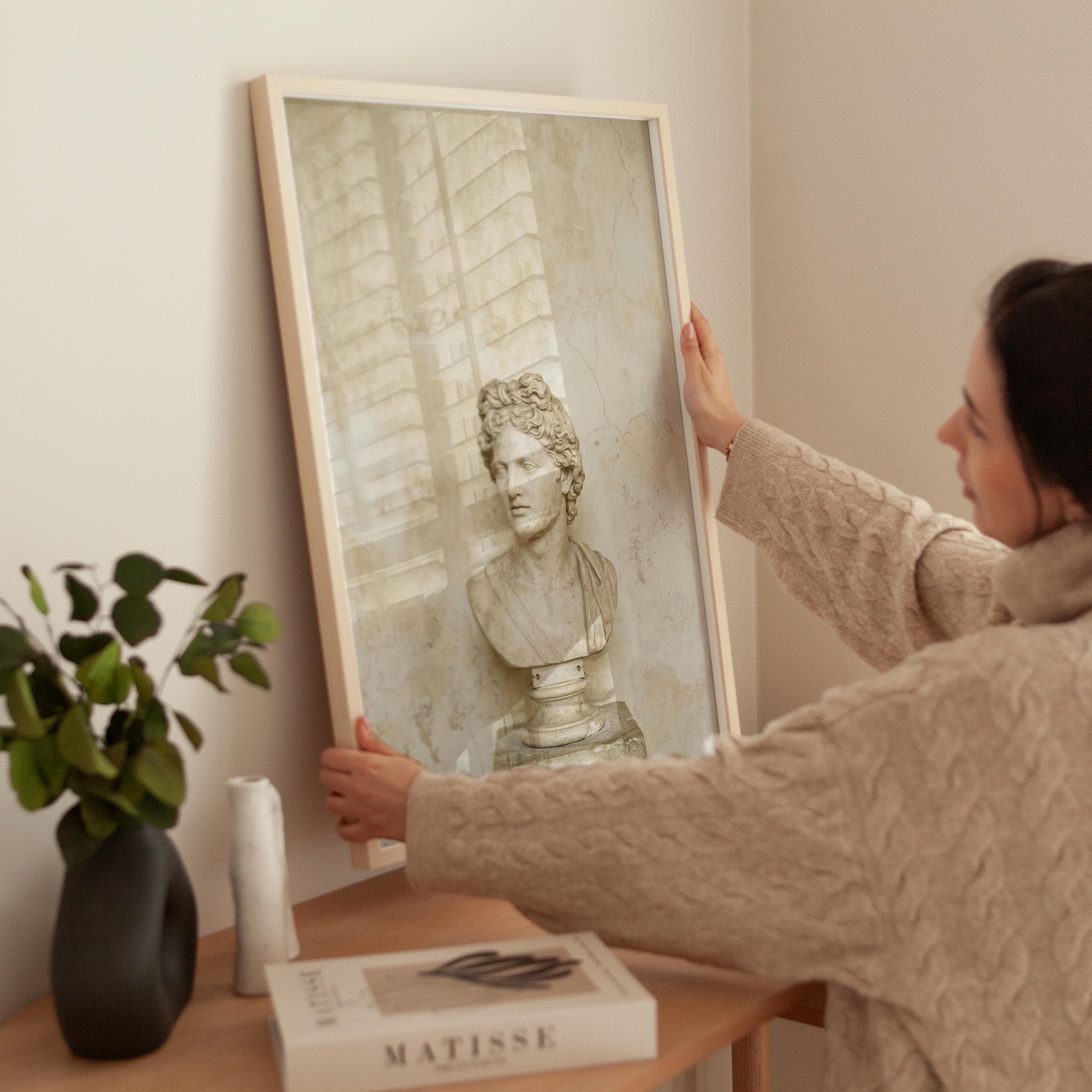 Apollo bust wall art print with a classical sculpture in warm neutral tones. Works well in a living room, office, or refined gallery wall. It brings a calm, elegant and timeless presence to the space.