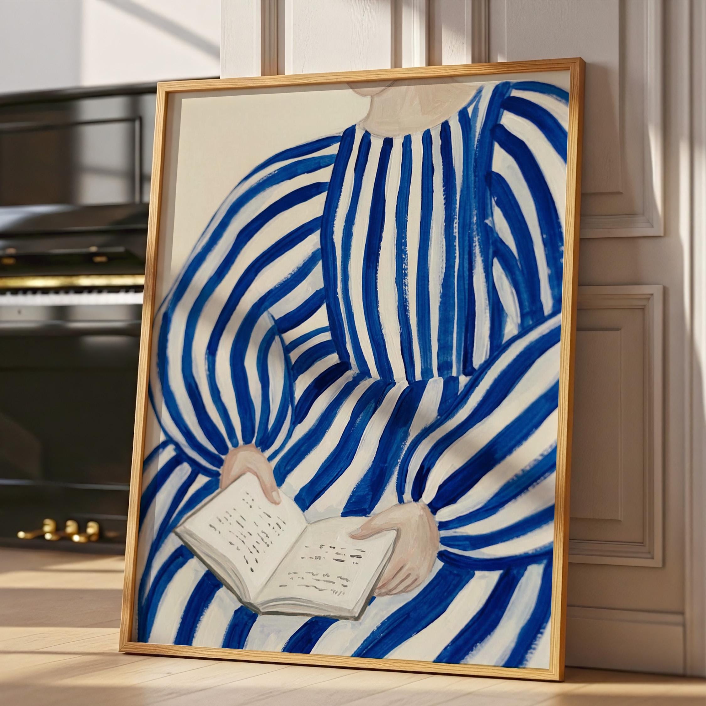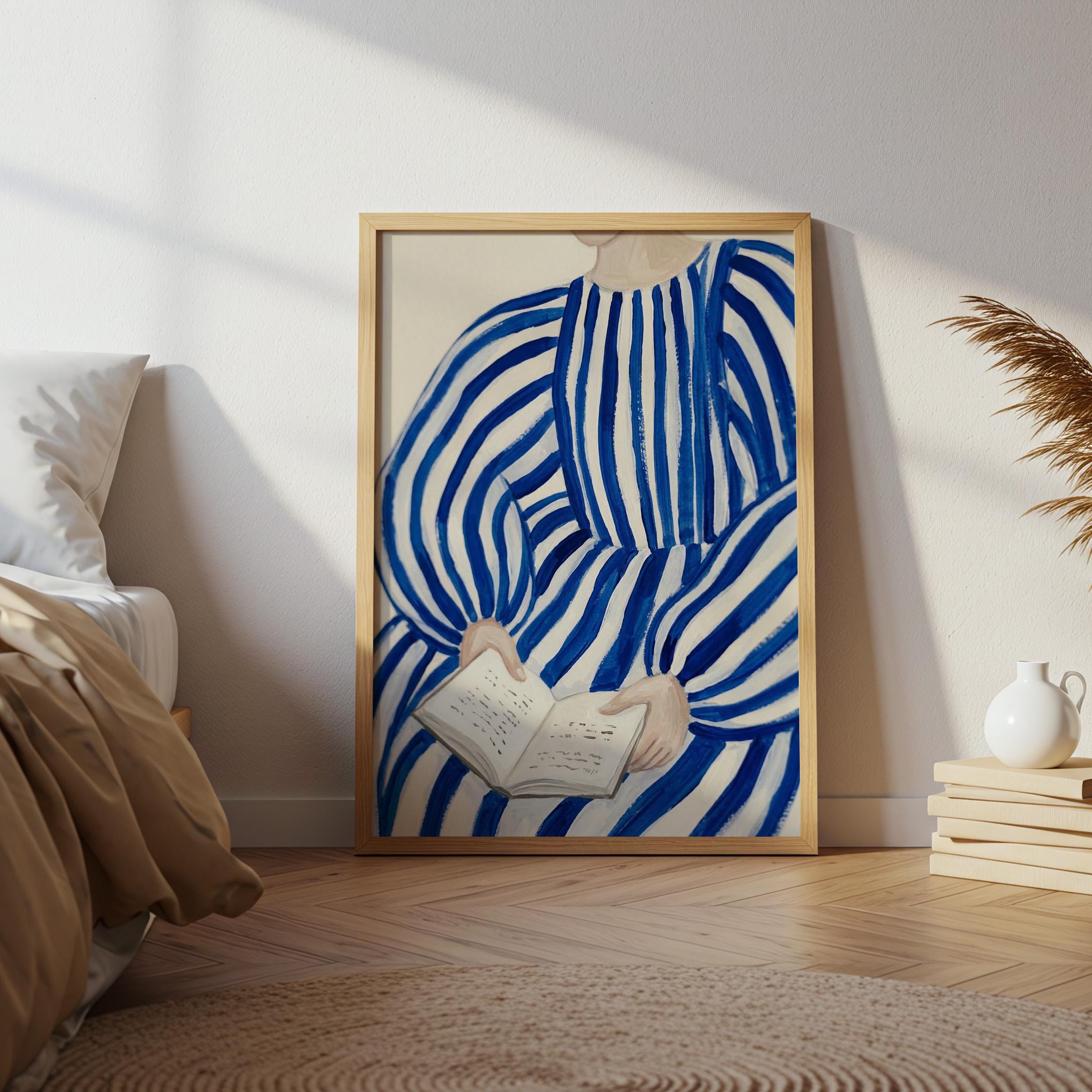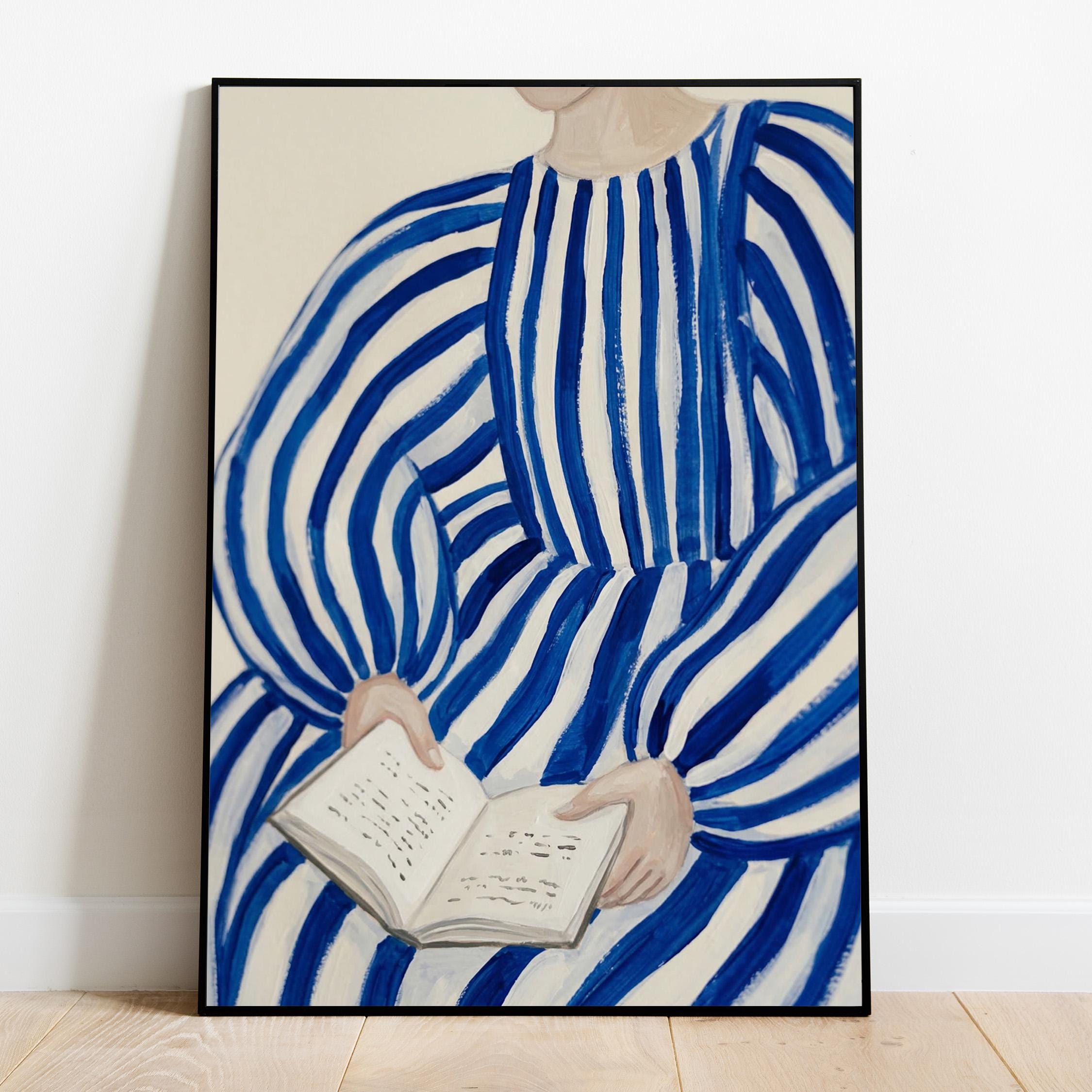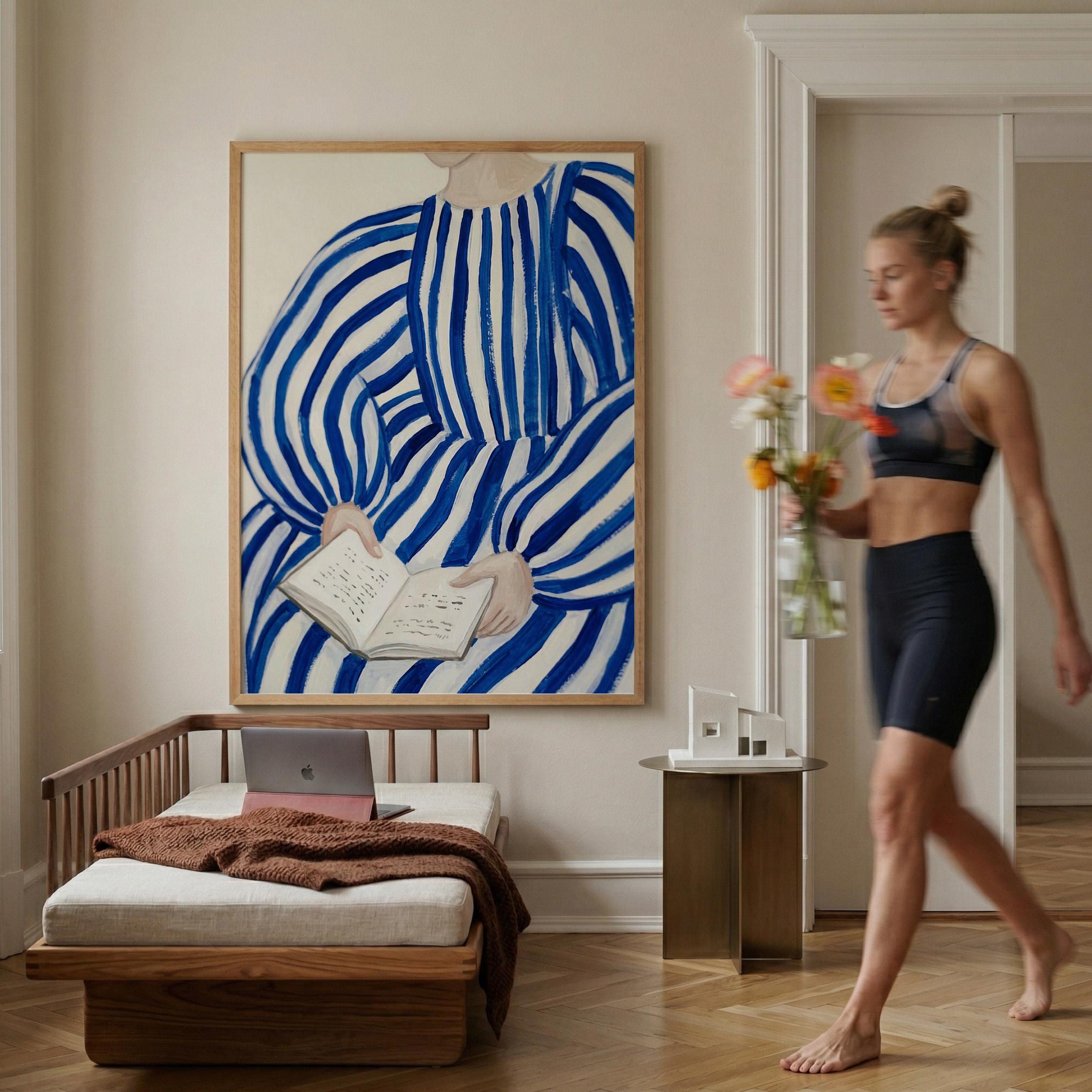 Woman reading wall art print with blue stripes and a calm figurative style. Perfect for a bedroom, reading nook, or quiet living space. It adds a soft, thoughtful and relaxed atmosphere to the room.