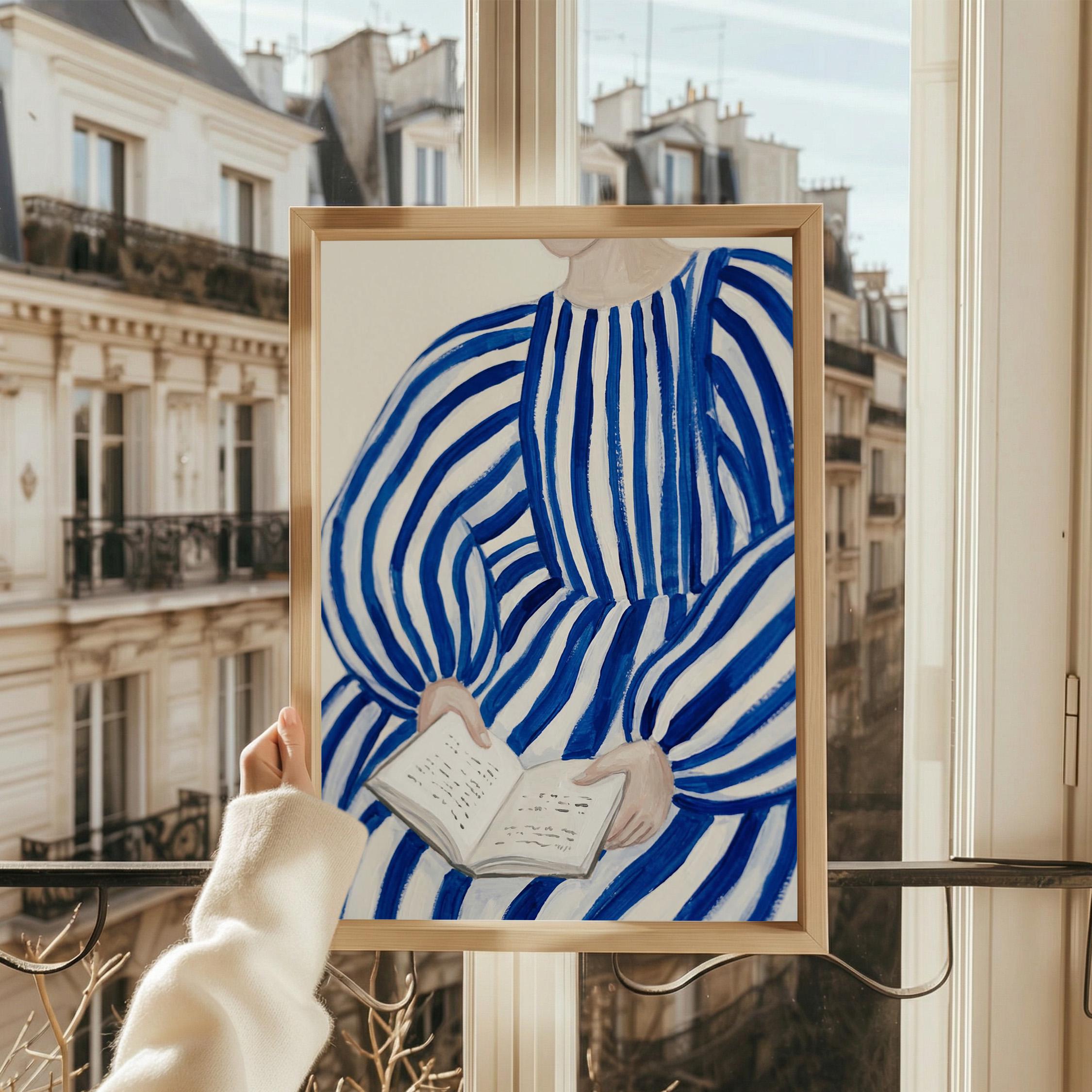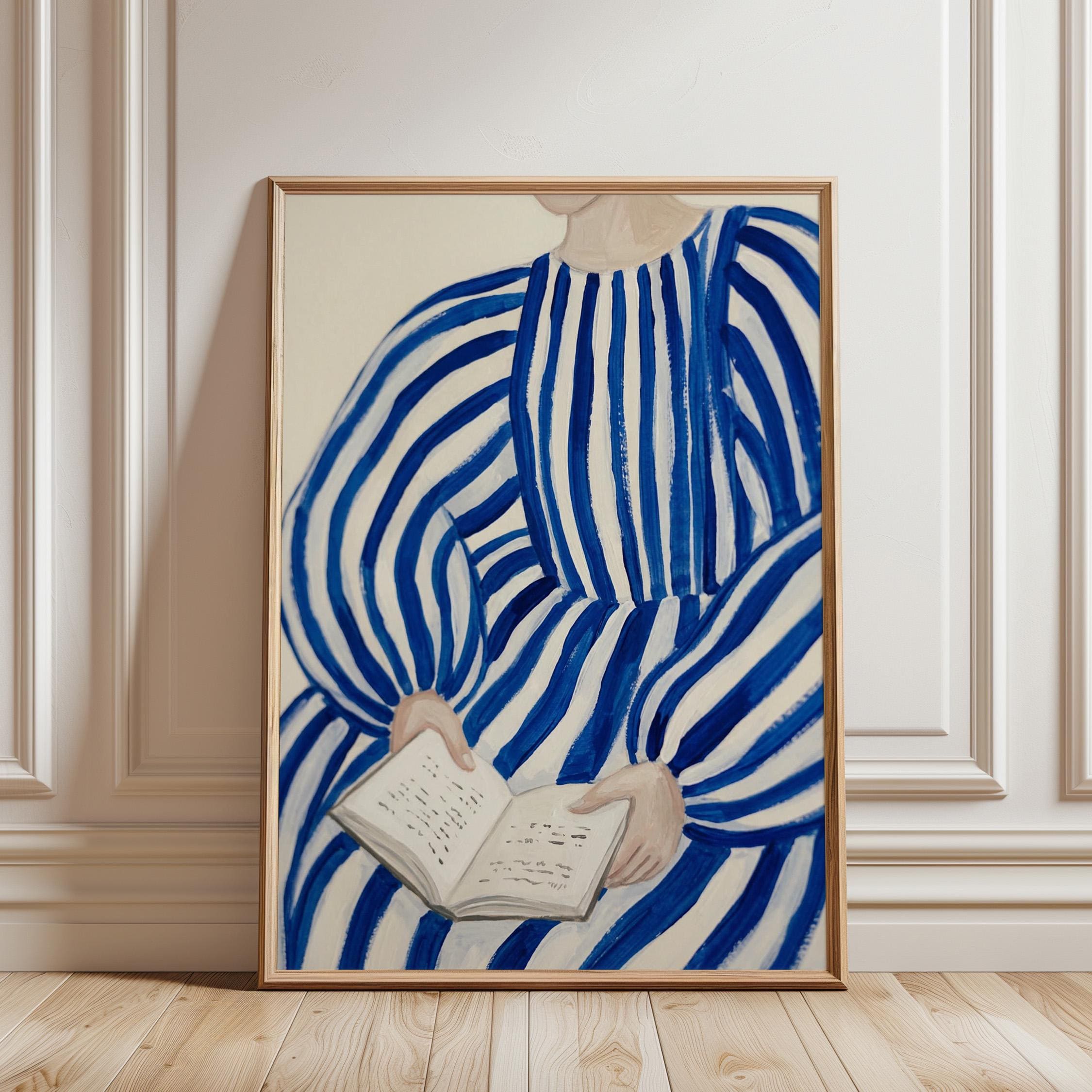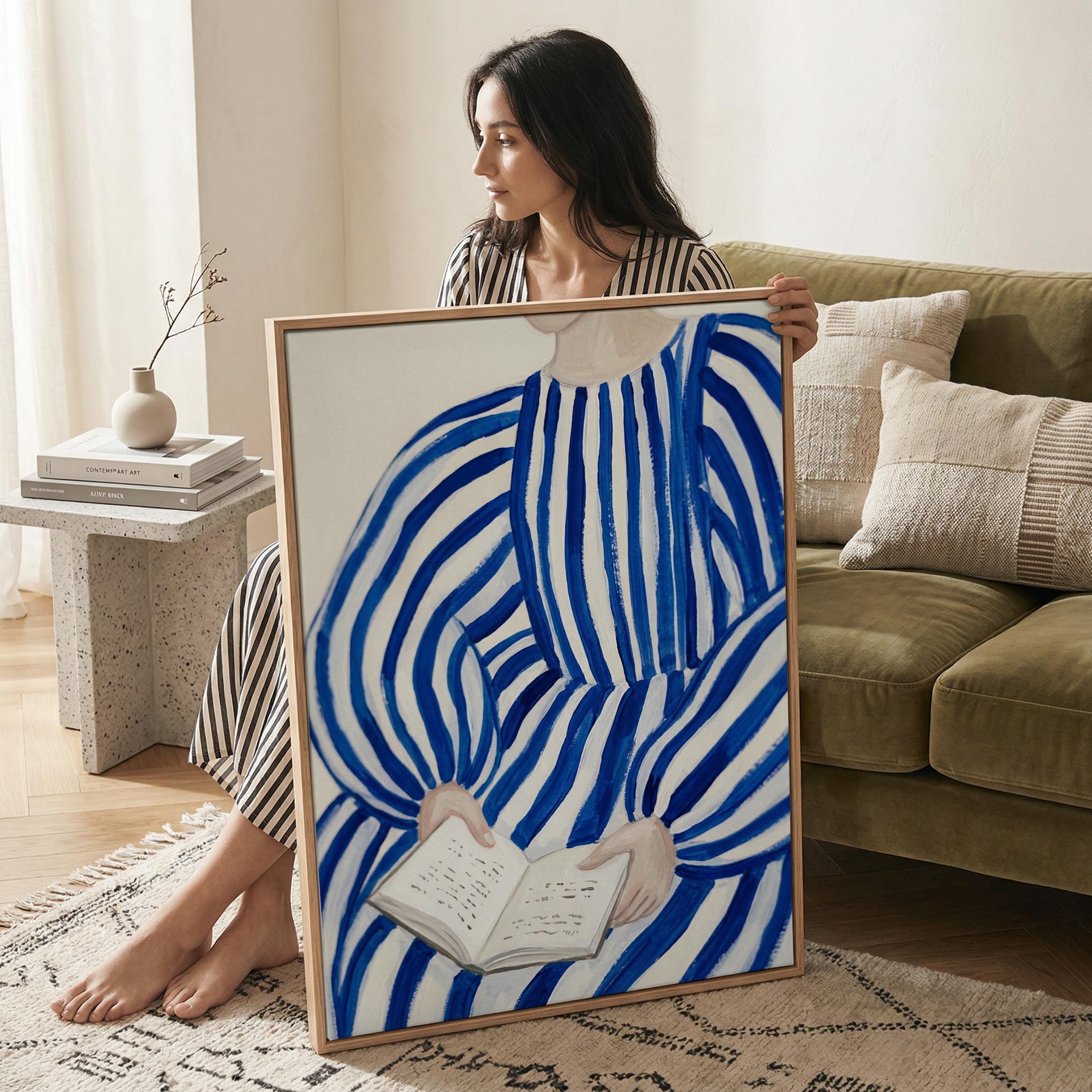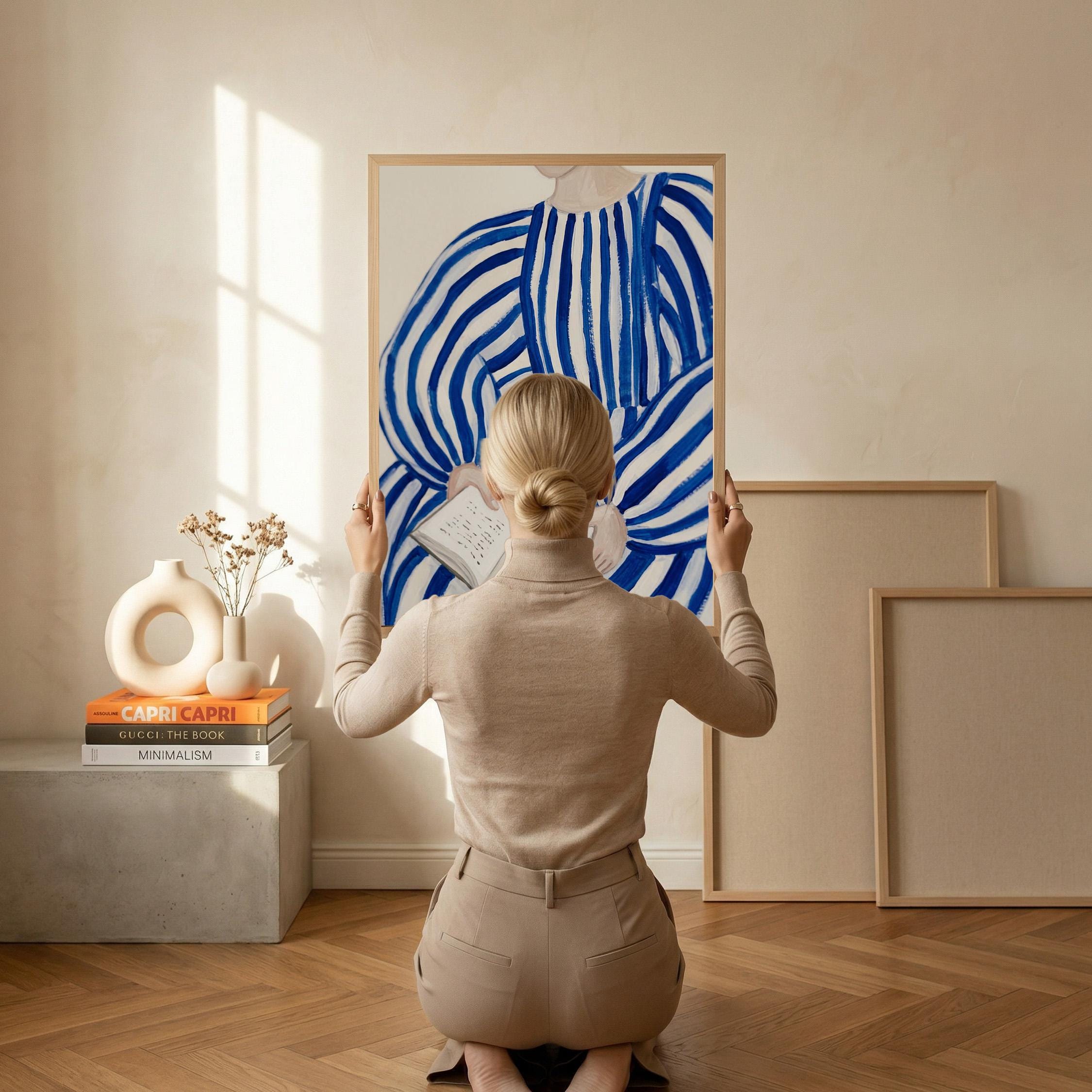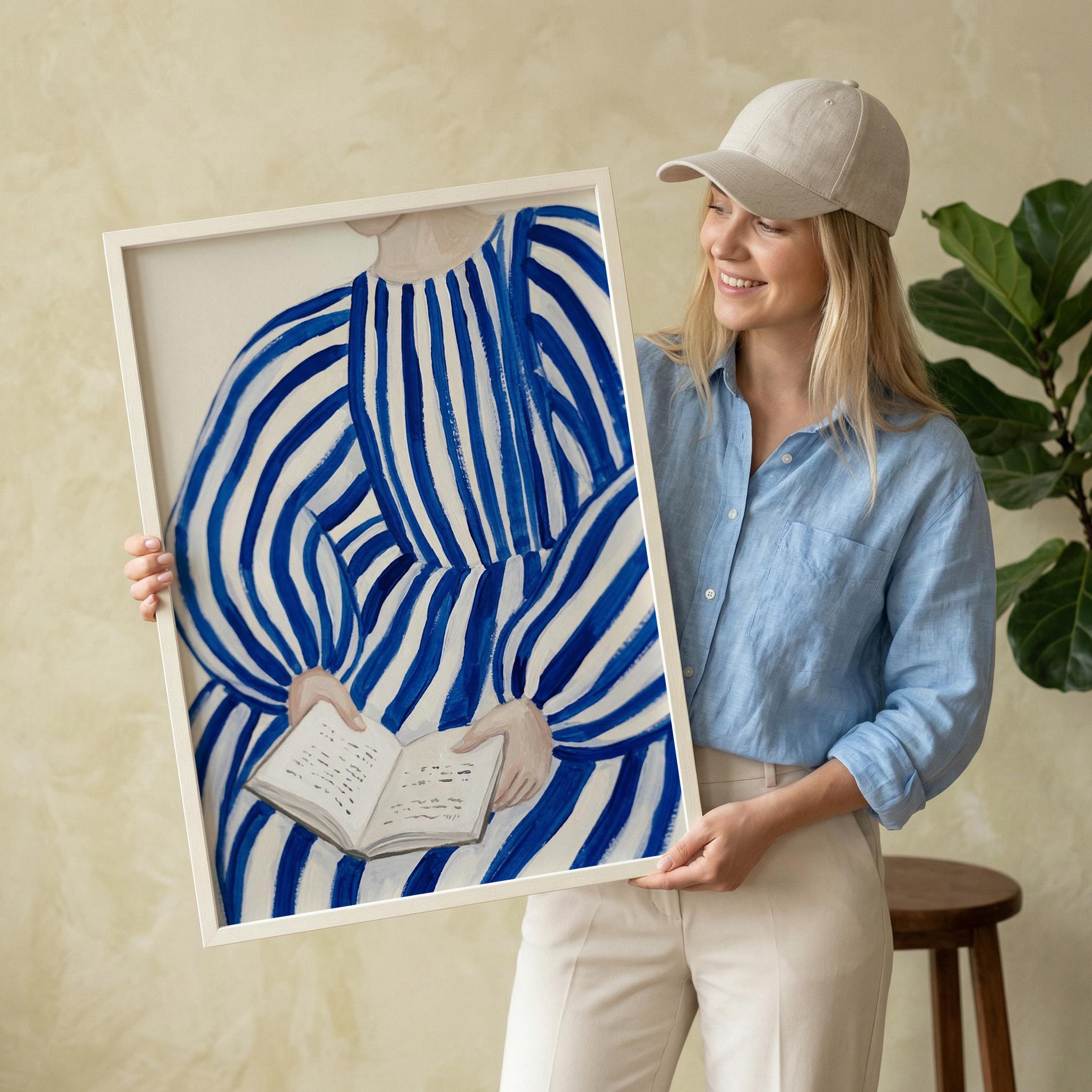 Woman reading wall art print with blue stripes and a calm figurative style. Perfect for a bedroom, reading nook, or quiet living space. It adds a soft, thoughtful and relaxed atmosphere to the room.