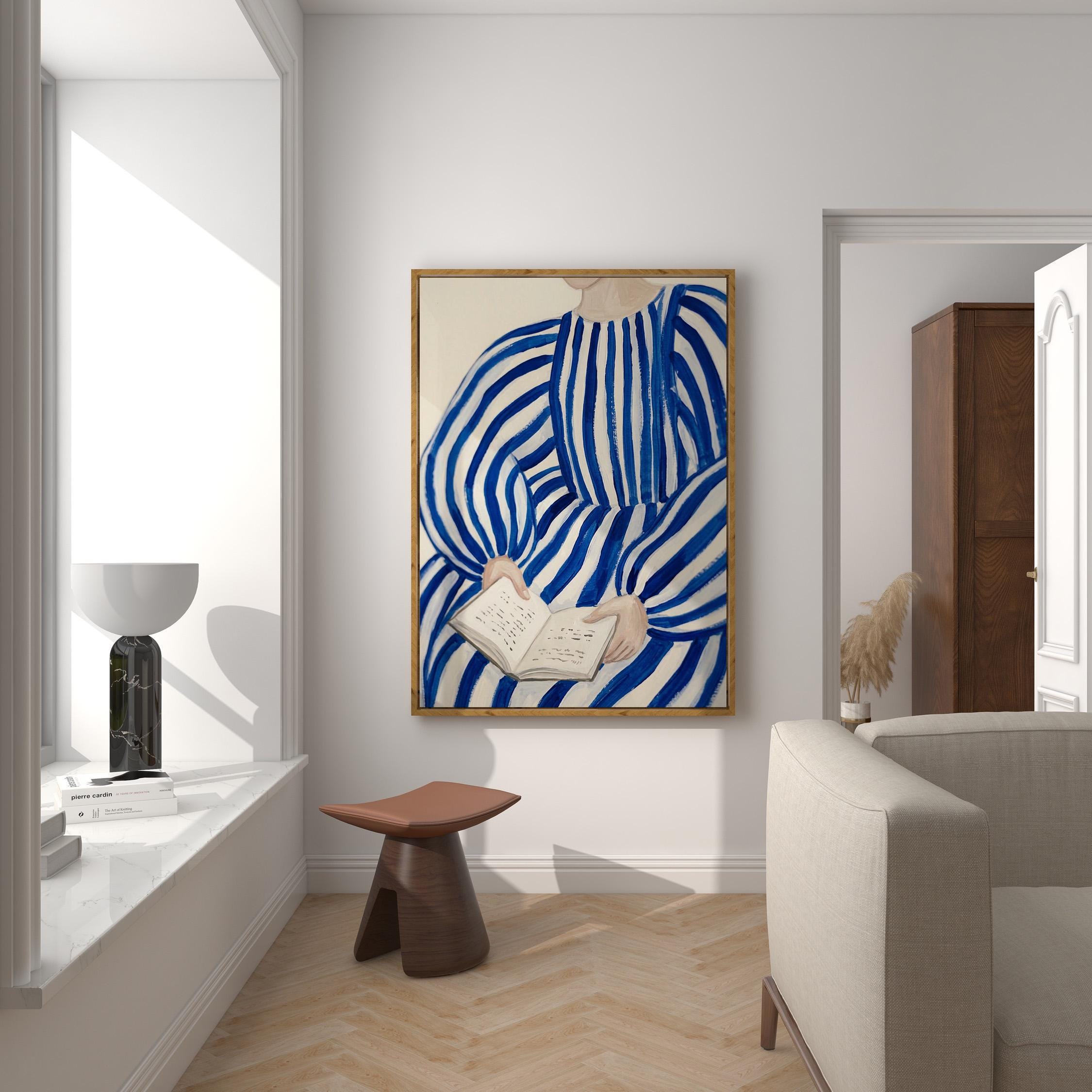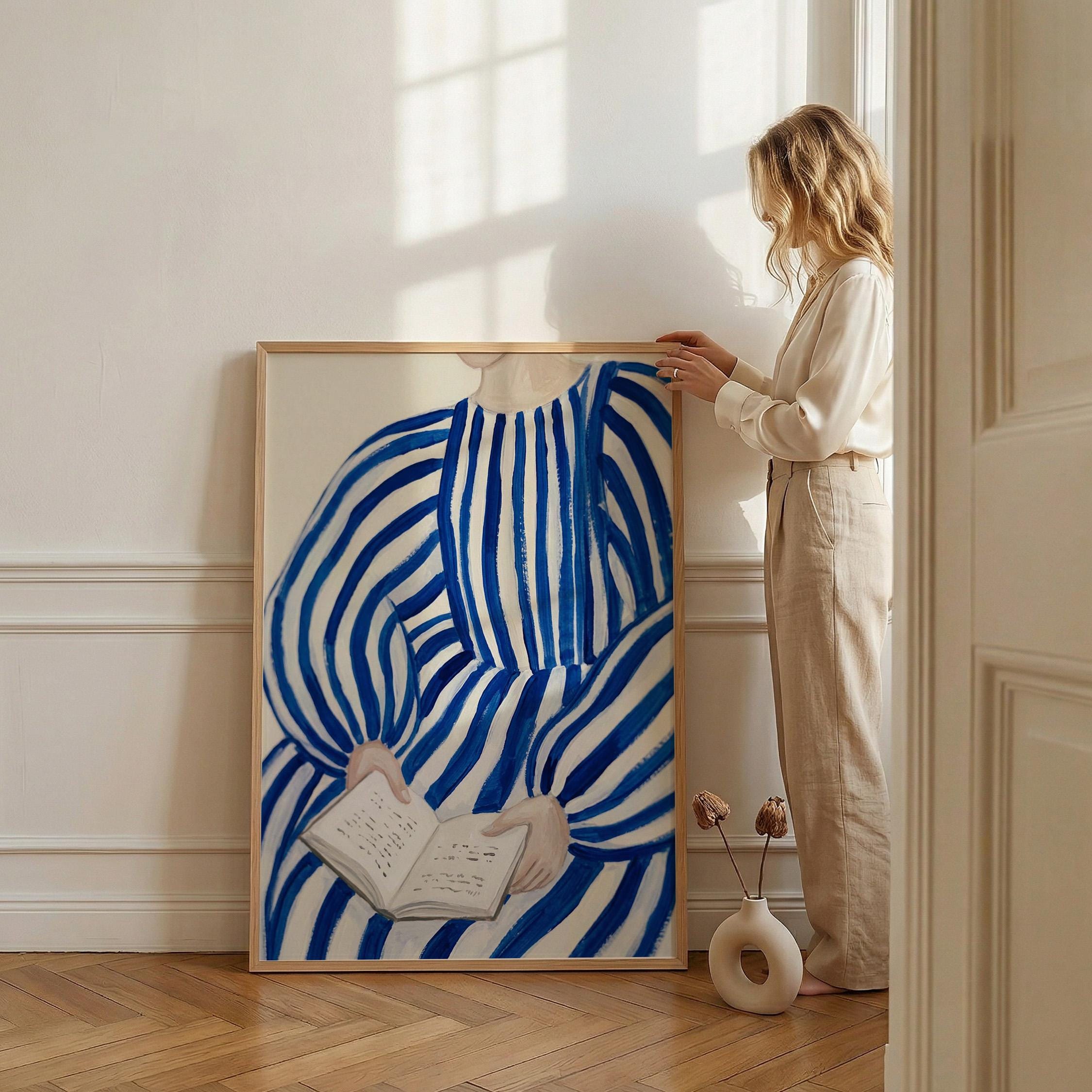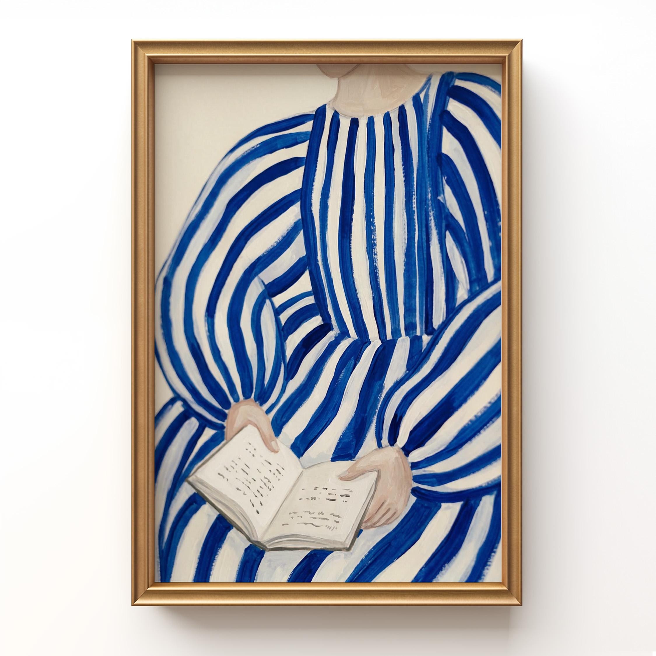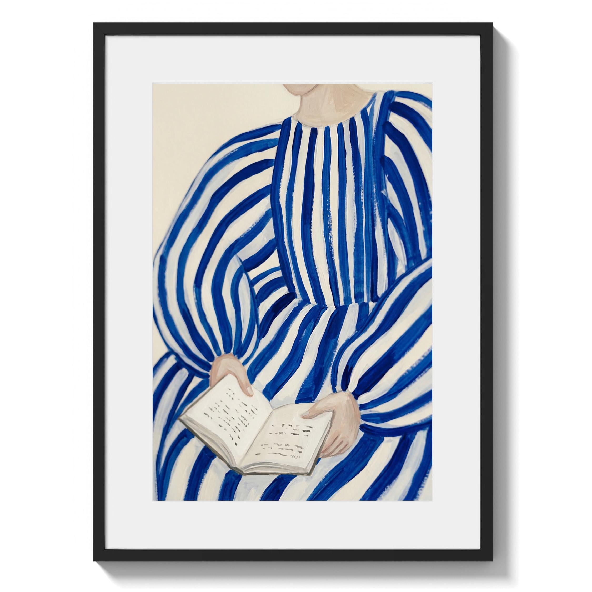 Woman reading wall art print with blue stripes and a calm figurative style. Perfect for a bedroom, reading nook, or quiet living space. It adds a soft, thoughtful and relaxed atmosphere to the room.
