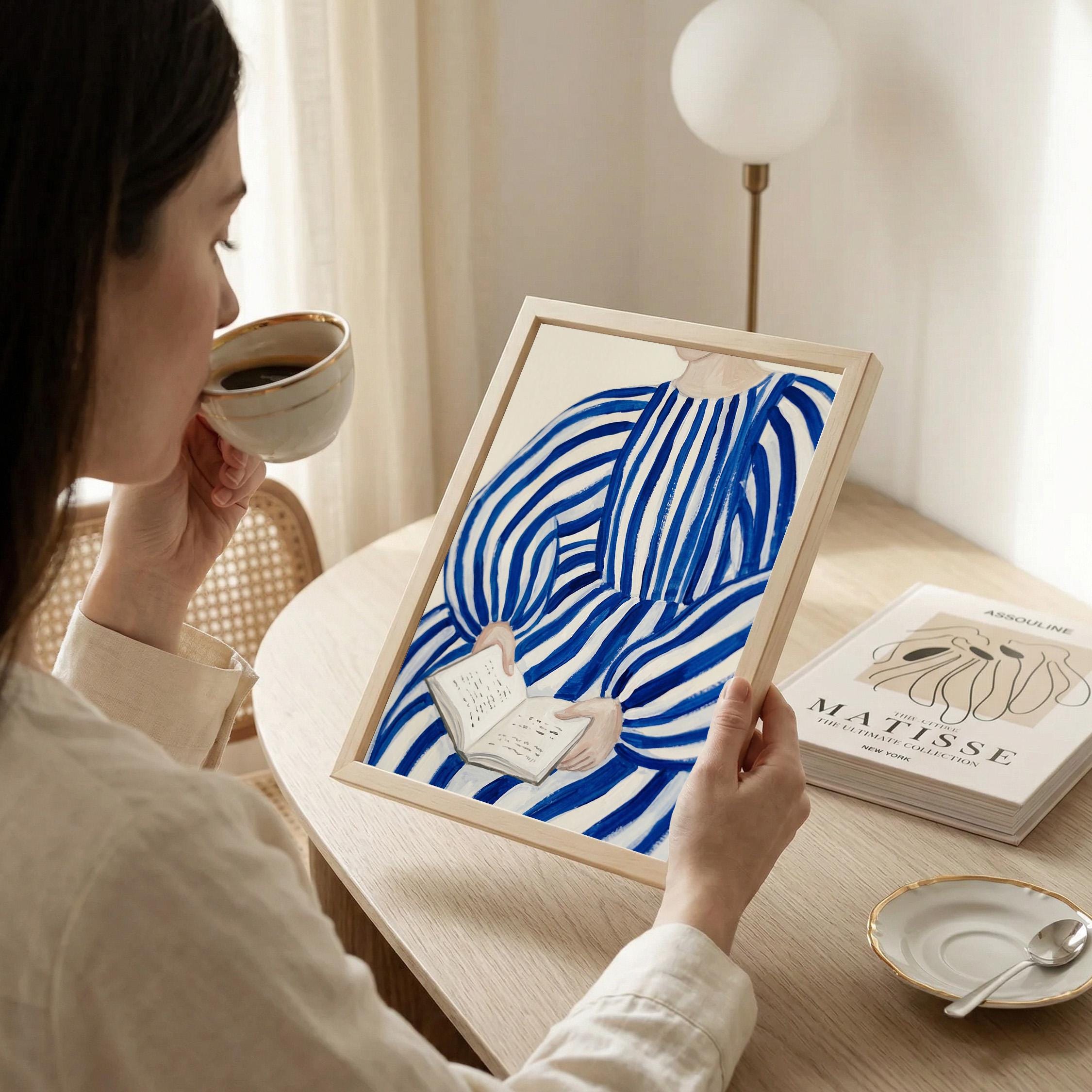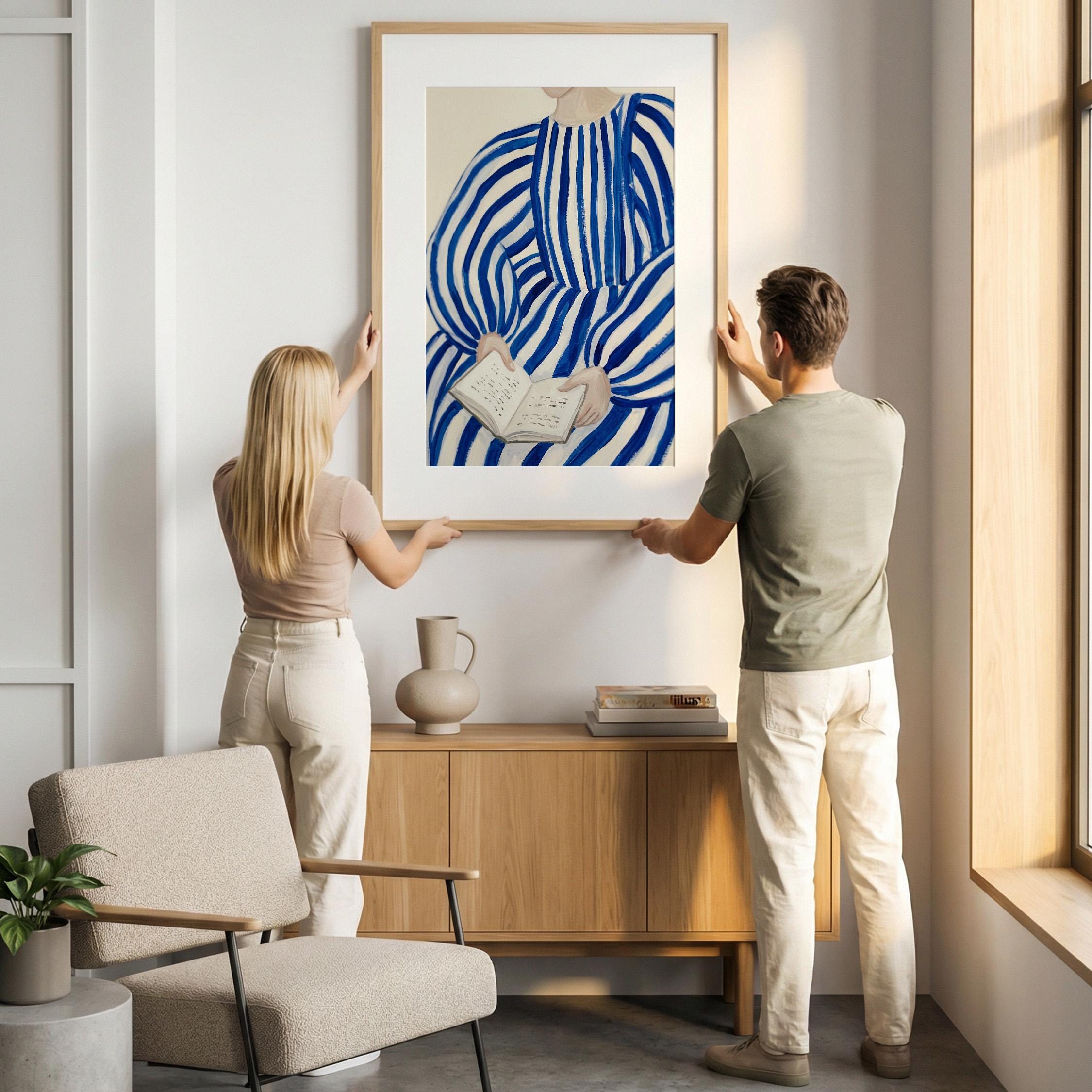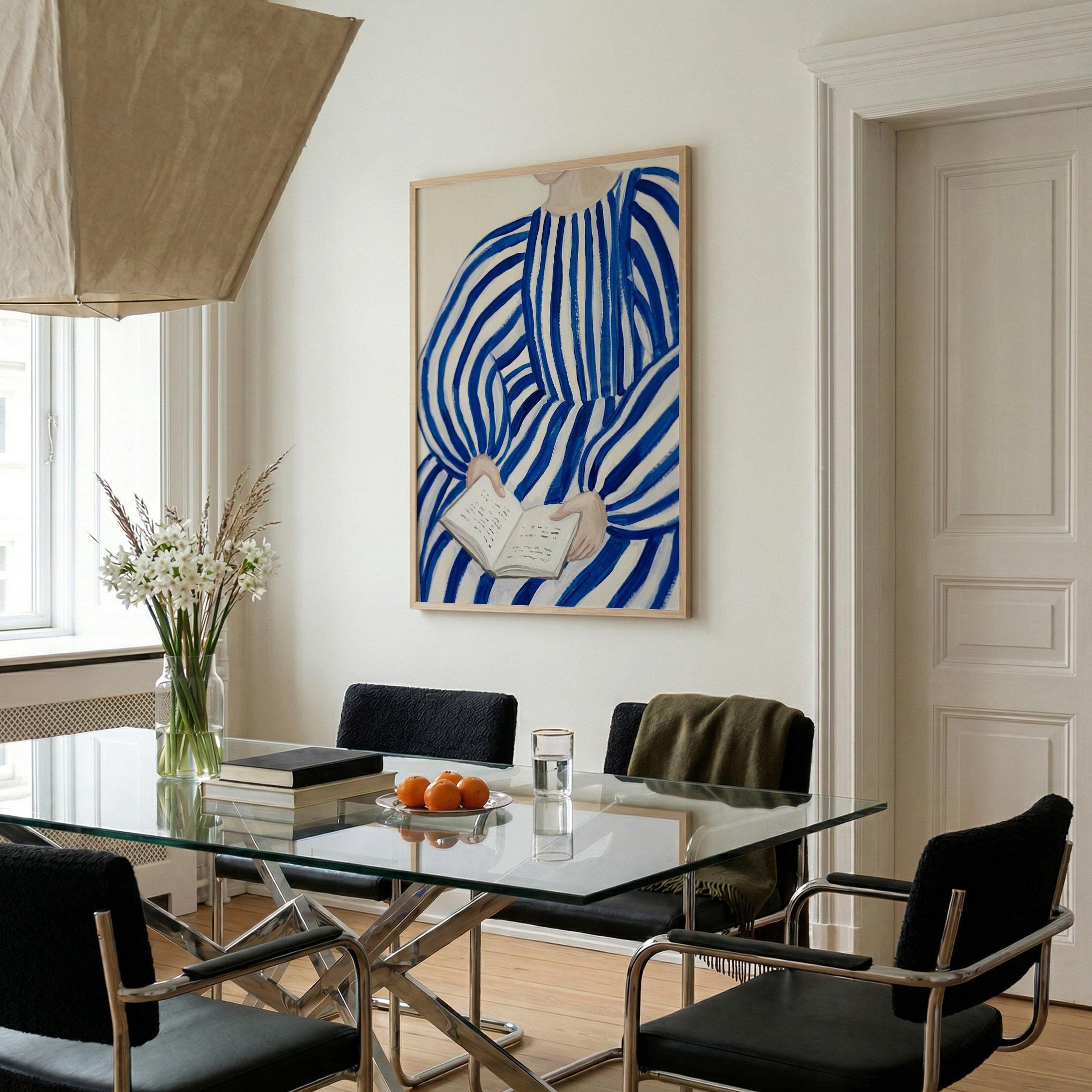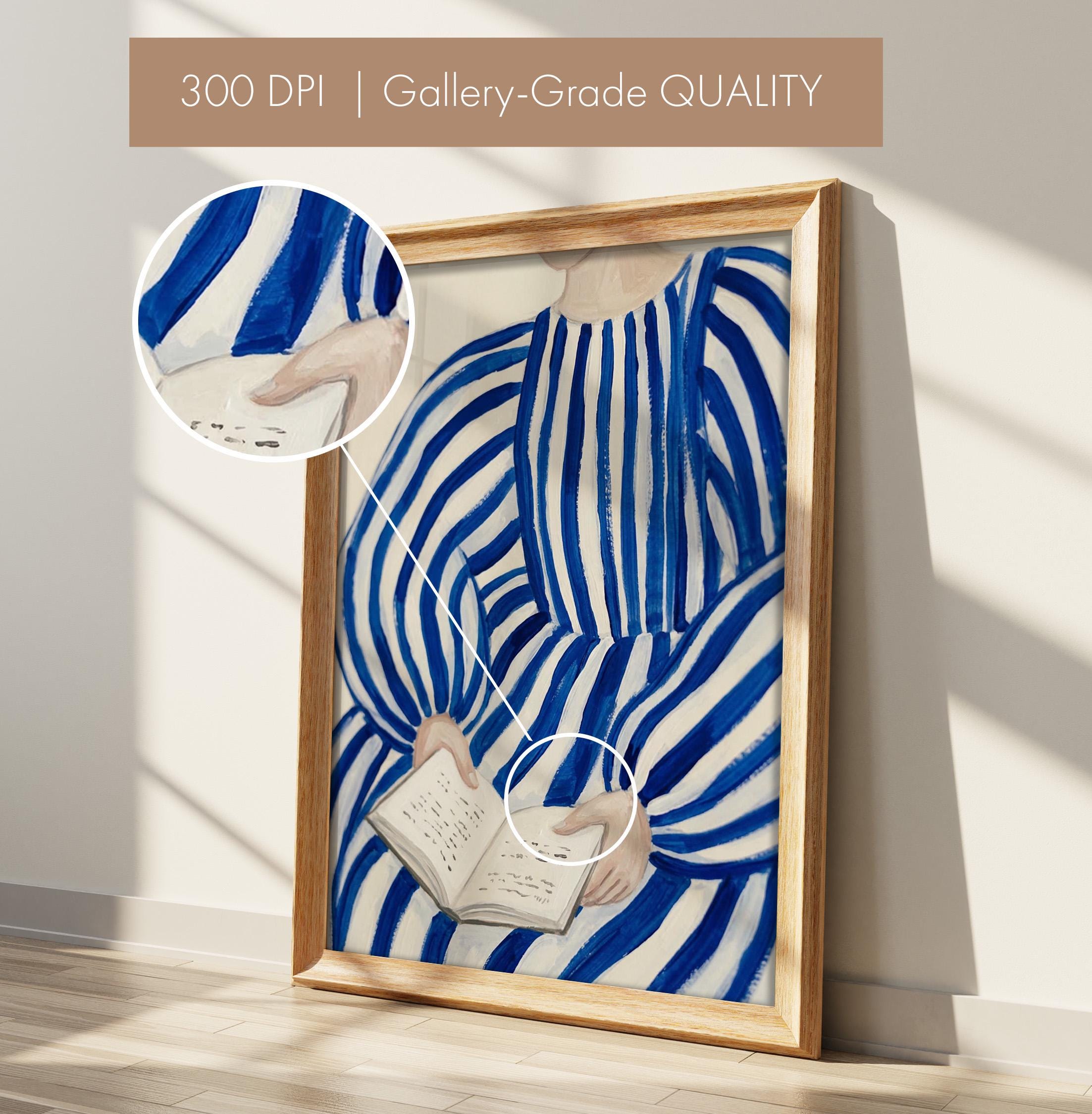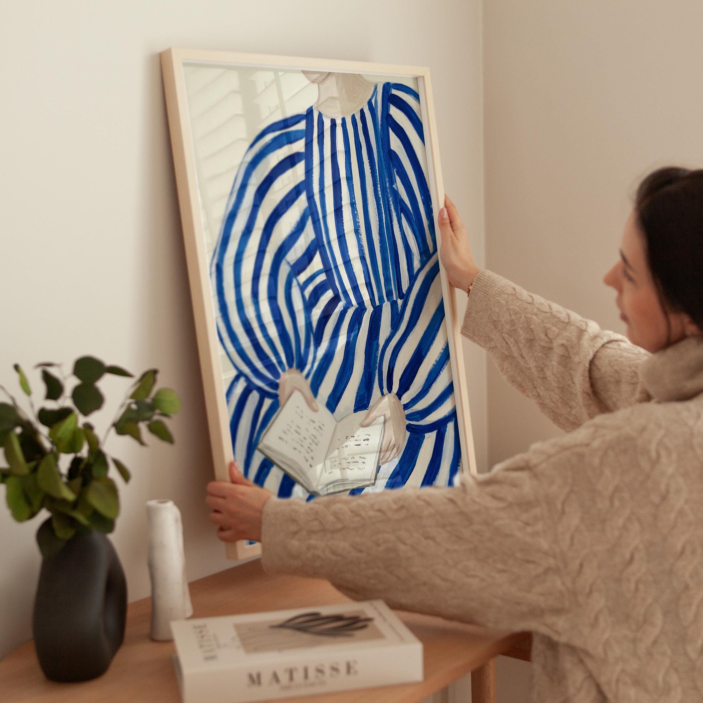Woman reading wall art print with blue stripes and a calm figurative style. Perfect for a bedroom, reading nook, or quiet living space. It adds a soft, thoughtful and relaxed atmosphere to the room.