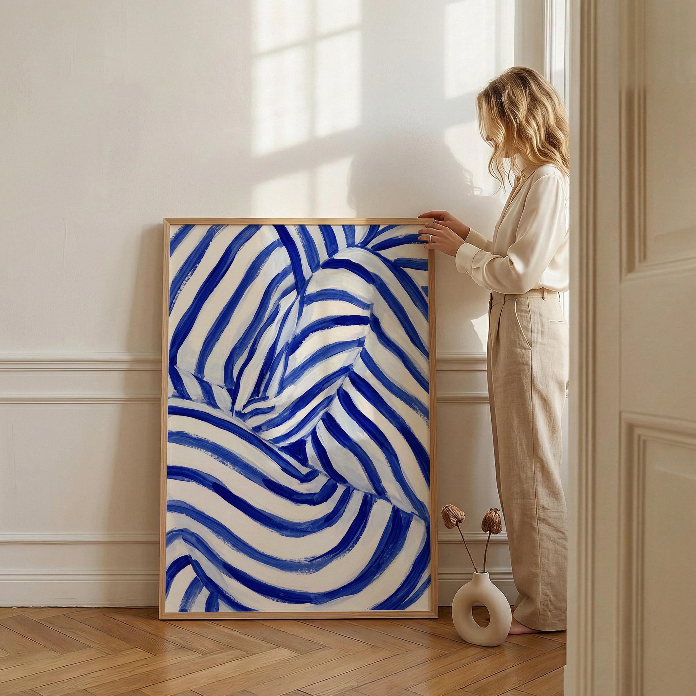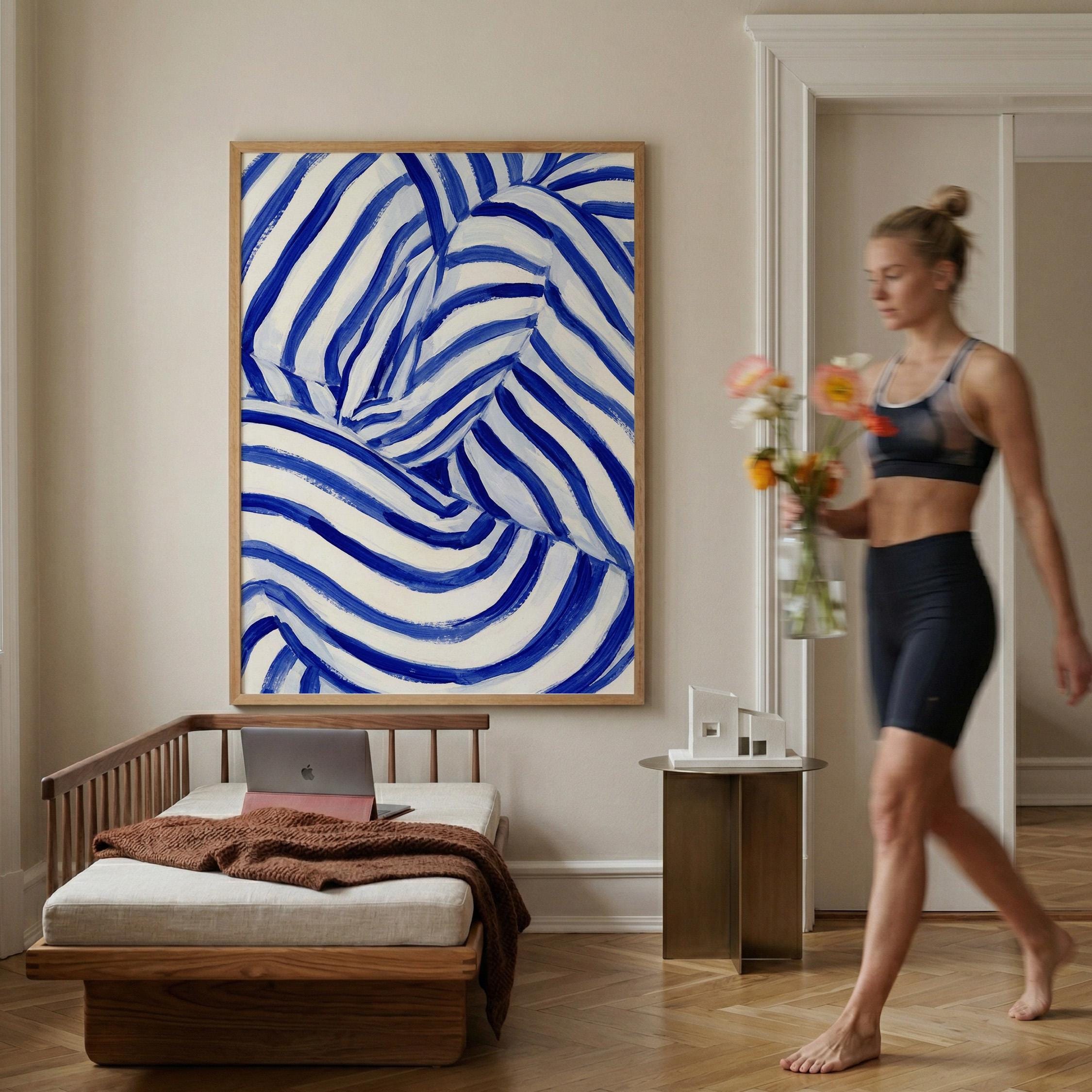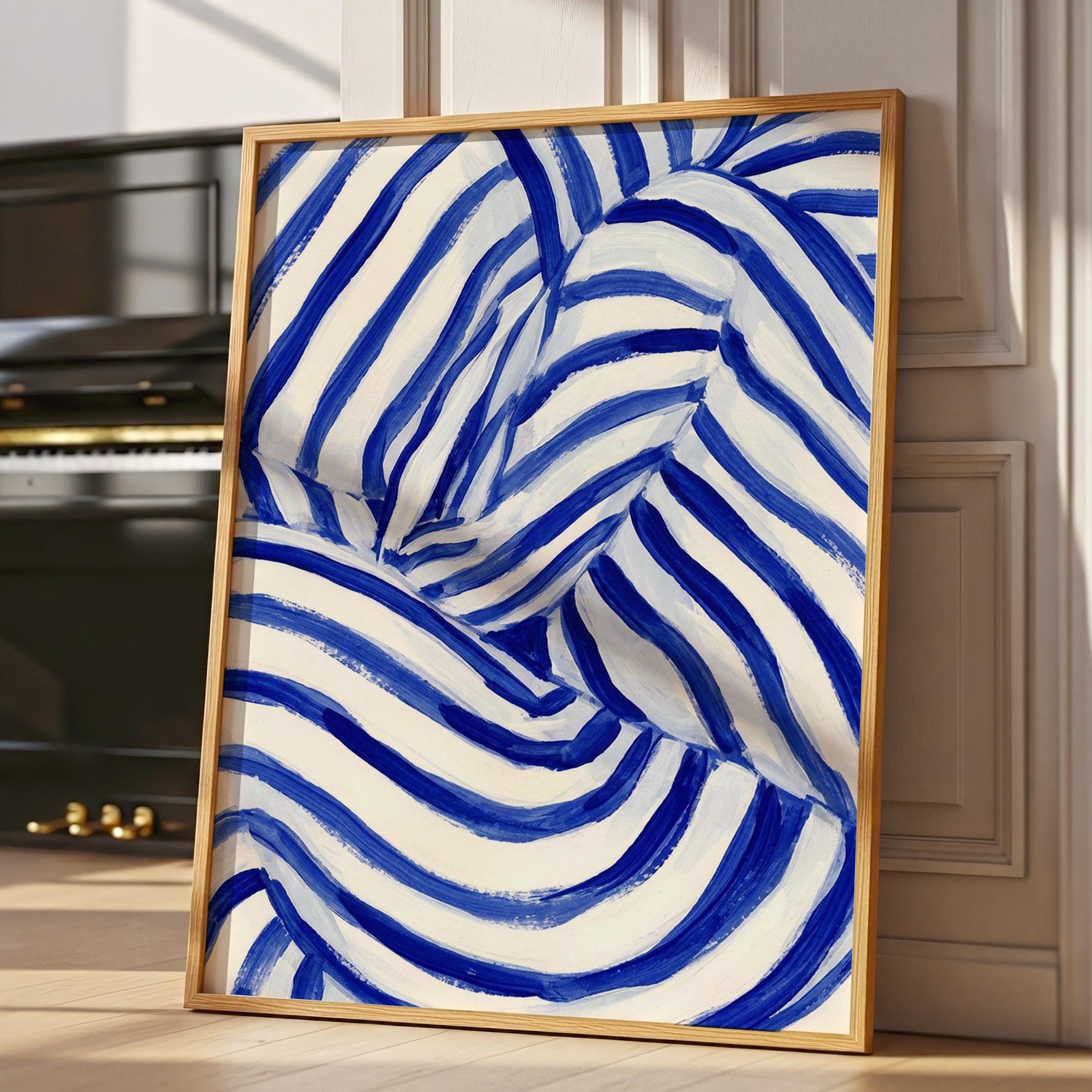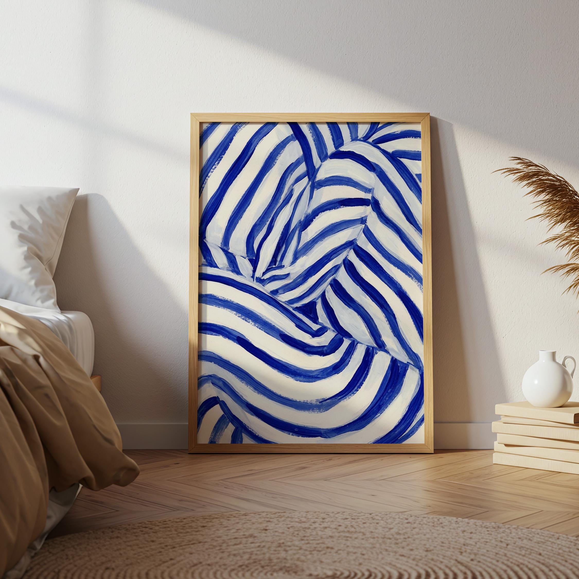 Blue abstract wall art print with bold brushstrokes and flowing lines. Works well in a living room, bedroom, or modern interior. It adds a clean, artistic and dynamic feel to the space.