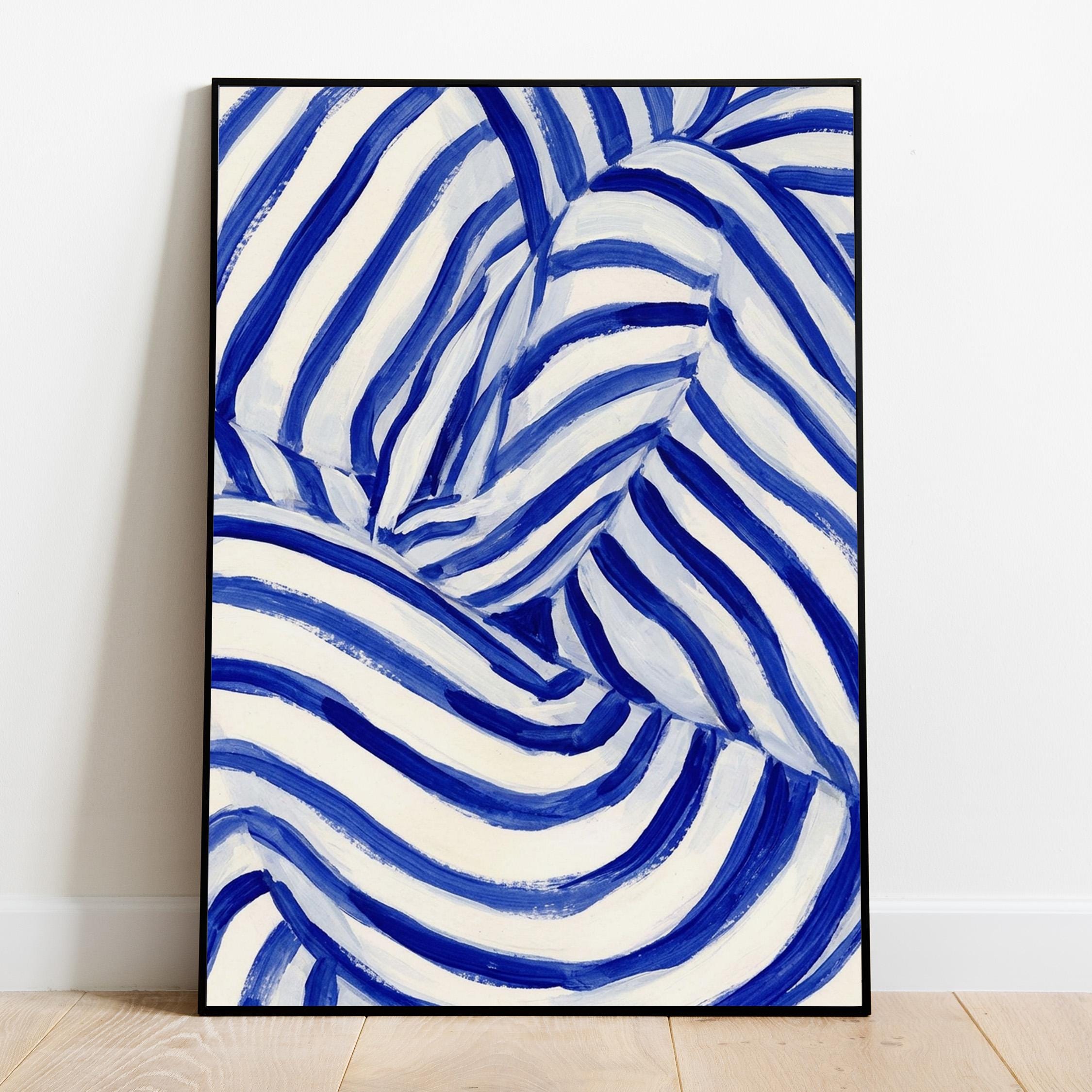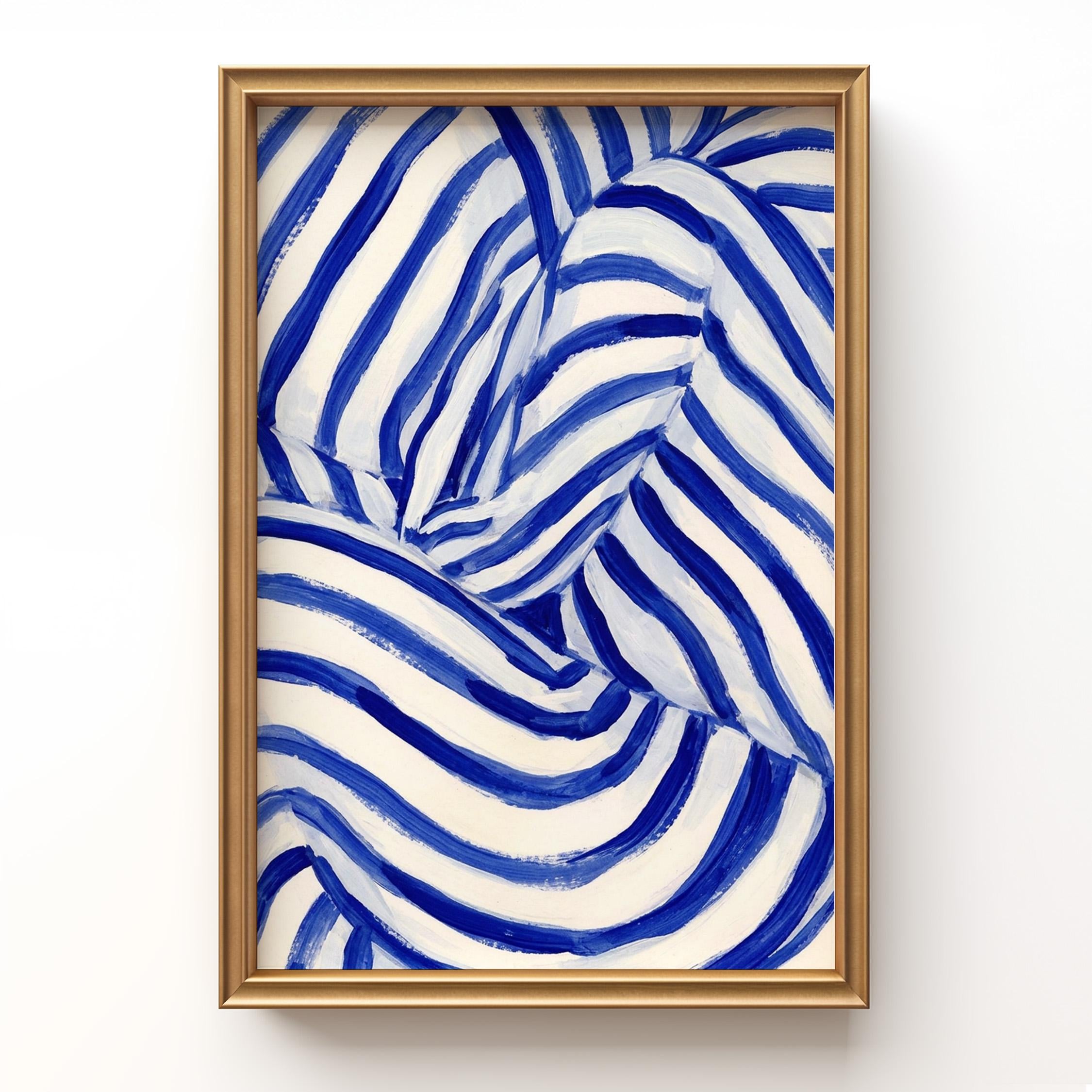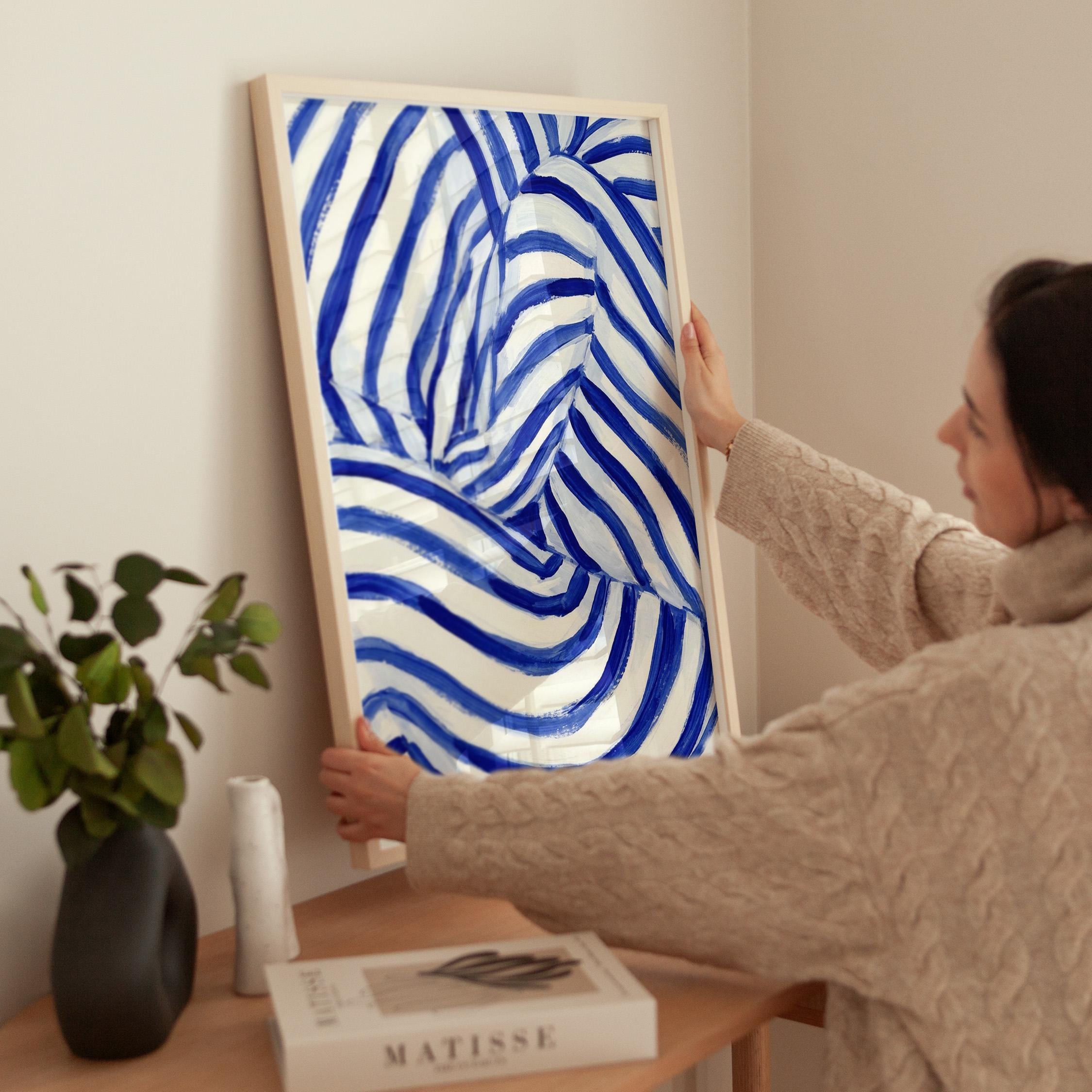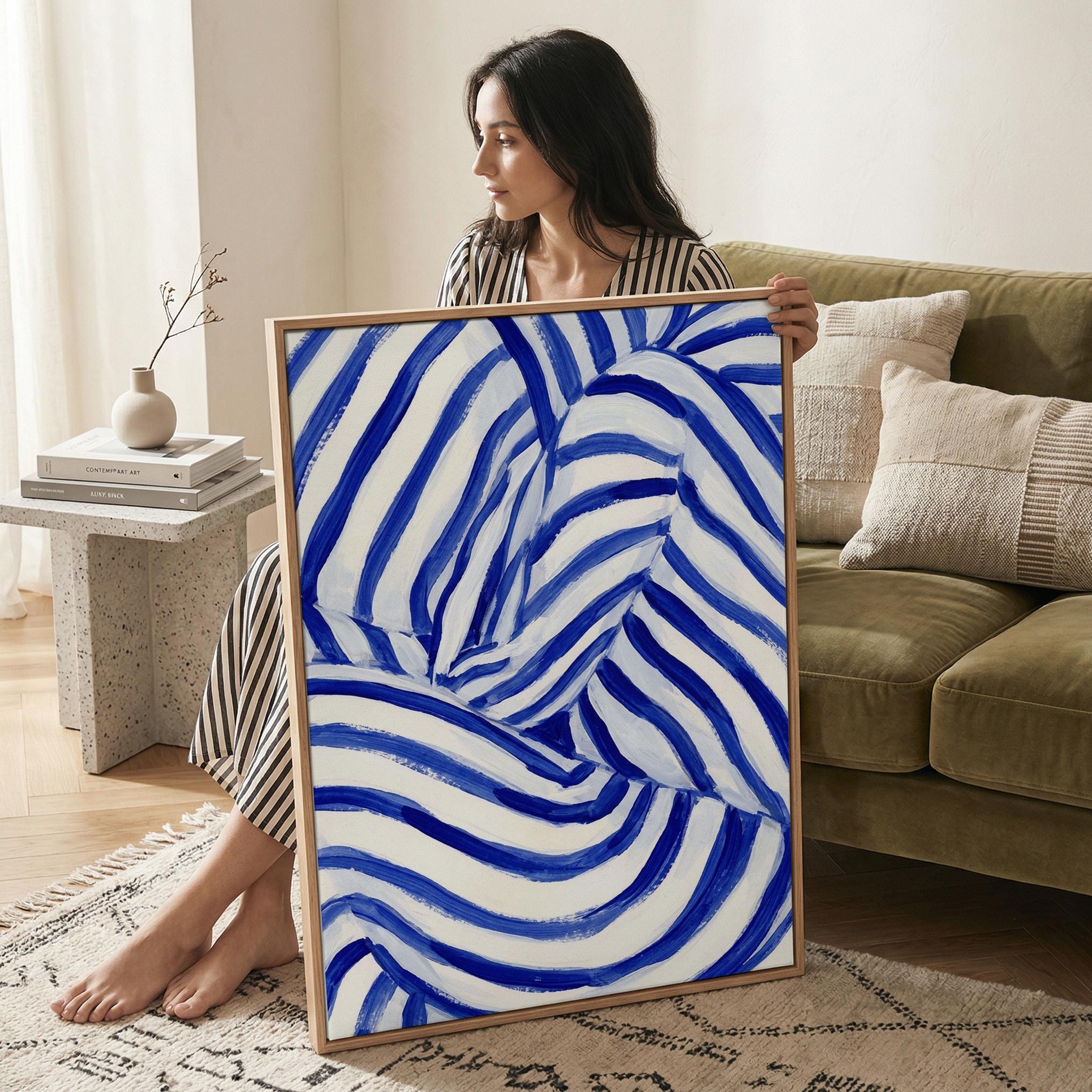Blue abstract wall art print with bold brushstrokes and flowing lines. Works well in a living room, bedroom, or modern interior. It adds a clean, artistic and dynamic feel to the space.