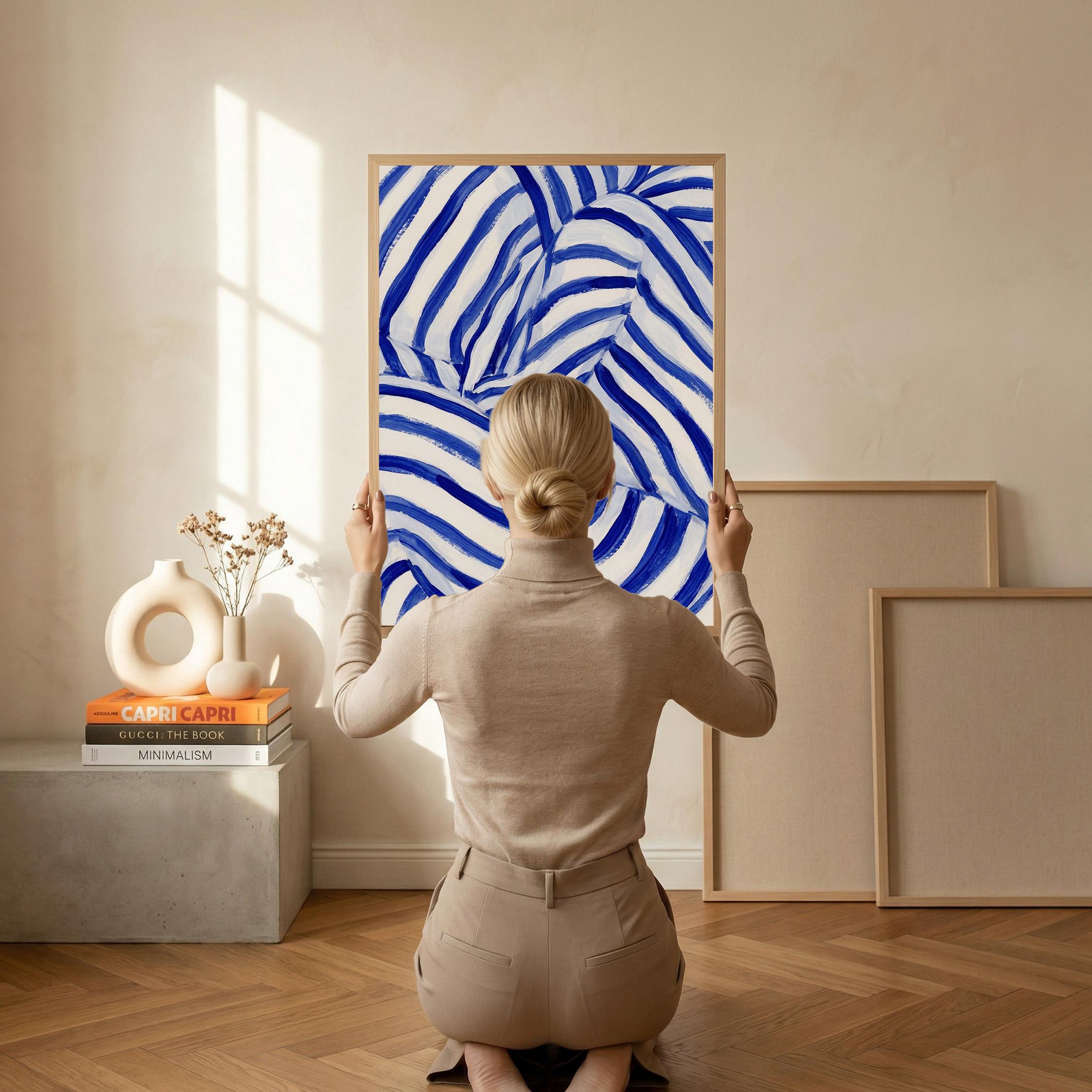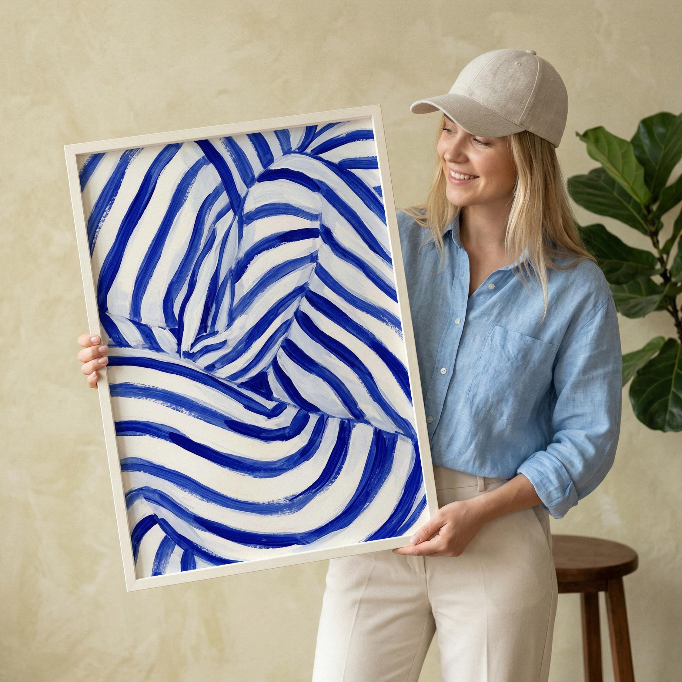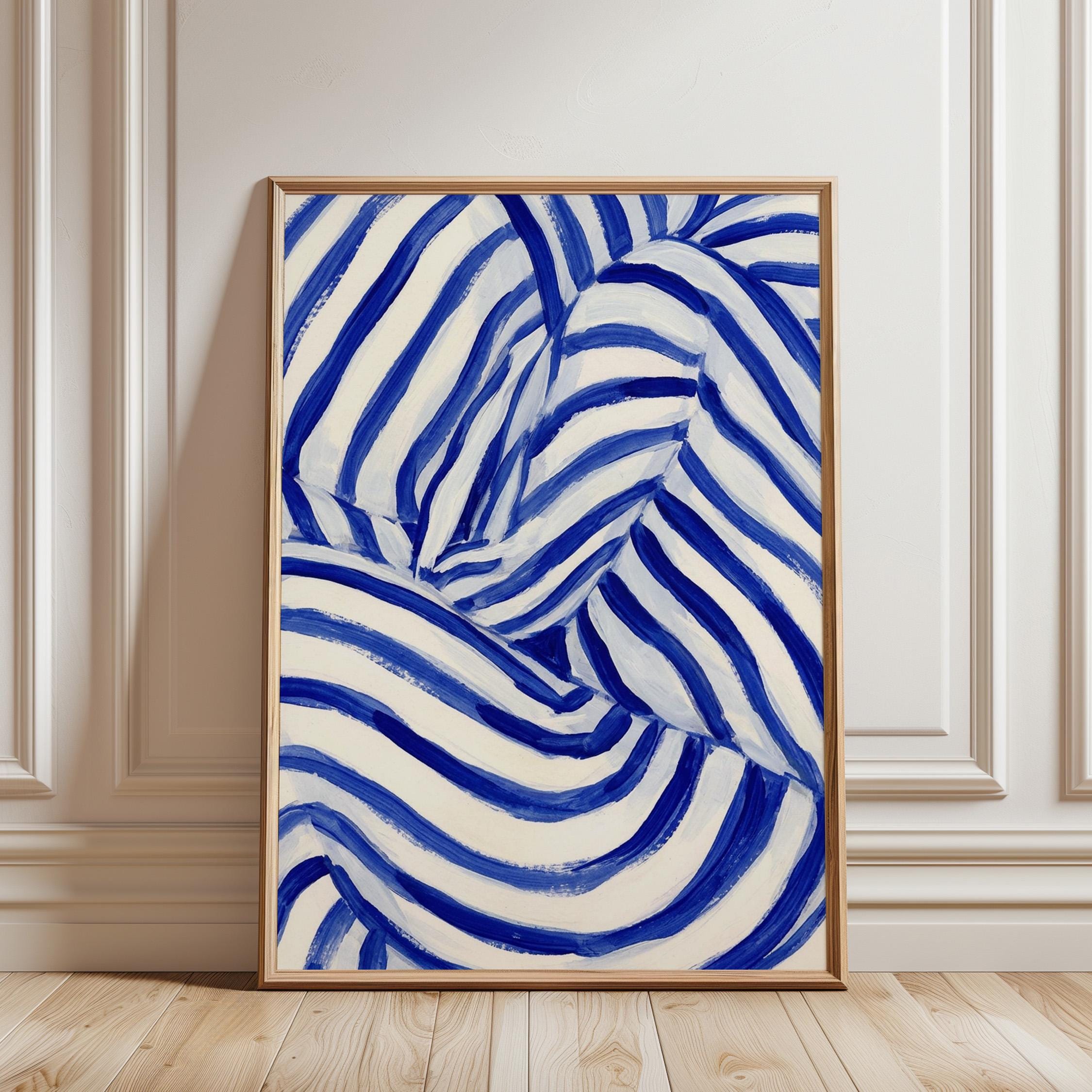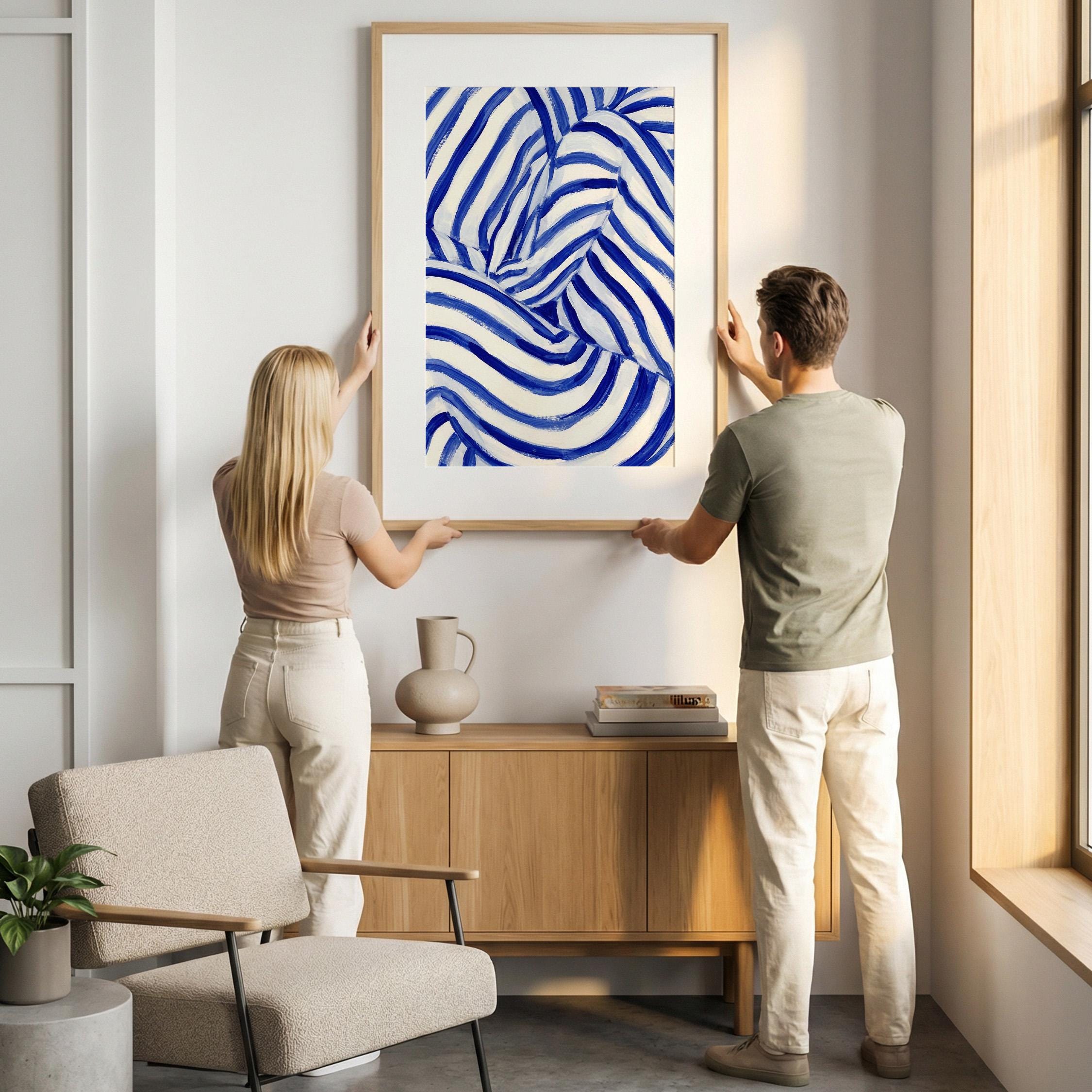 Blue abstract wall art print with bold brushstrokes and flowing lines. Works well in a living room, bedroom, or modern interior. It adds a clean, artistic and dynamic feel to the space.