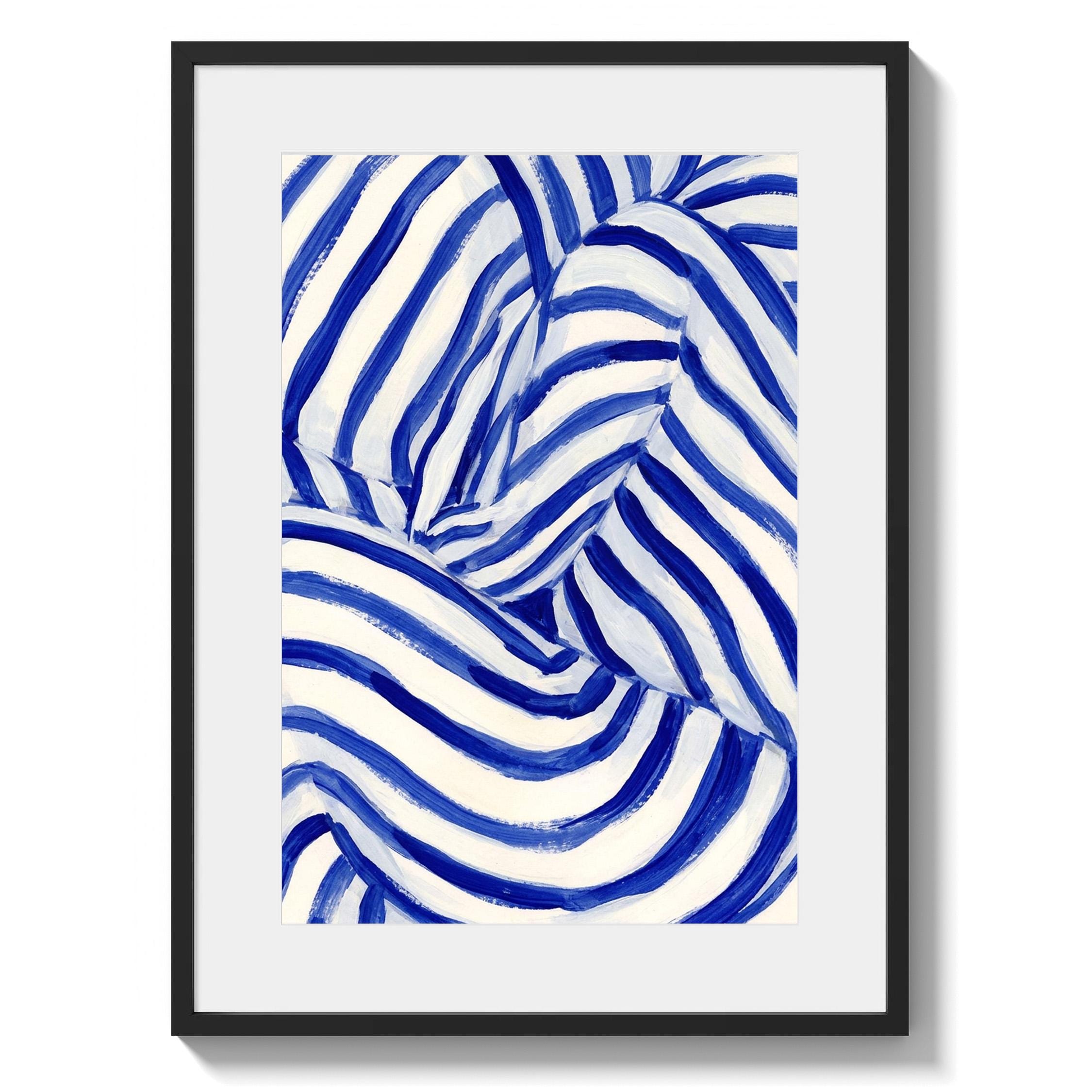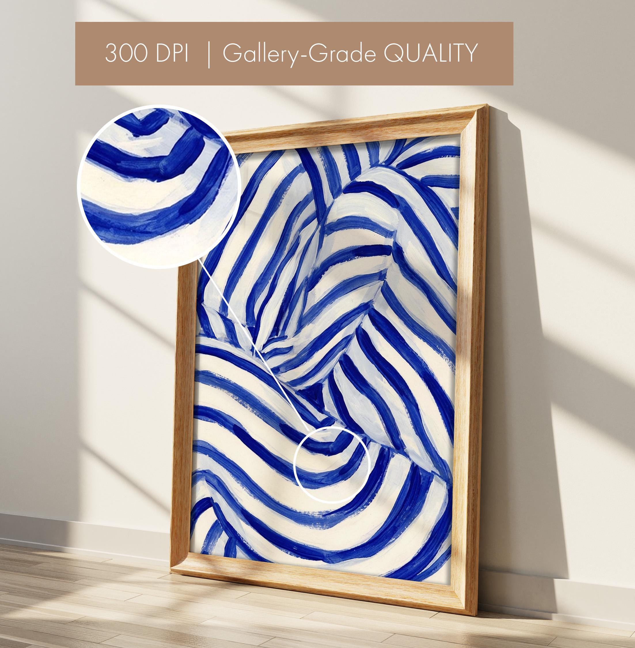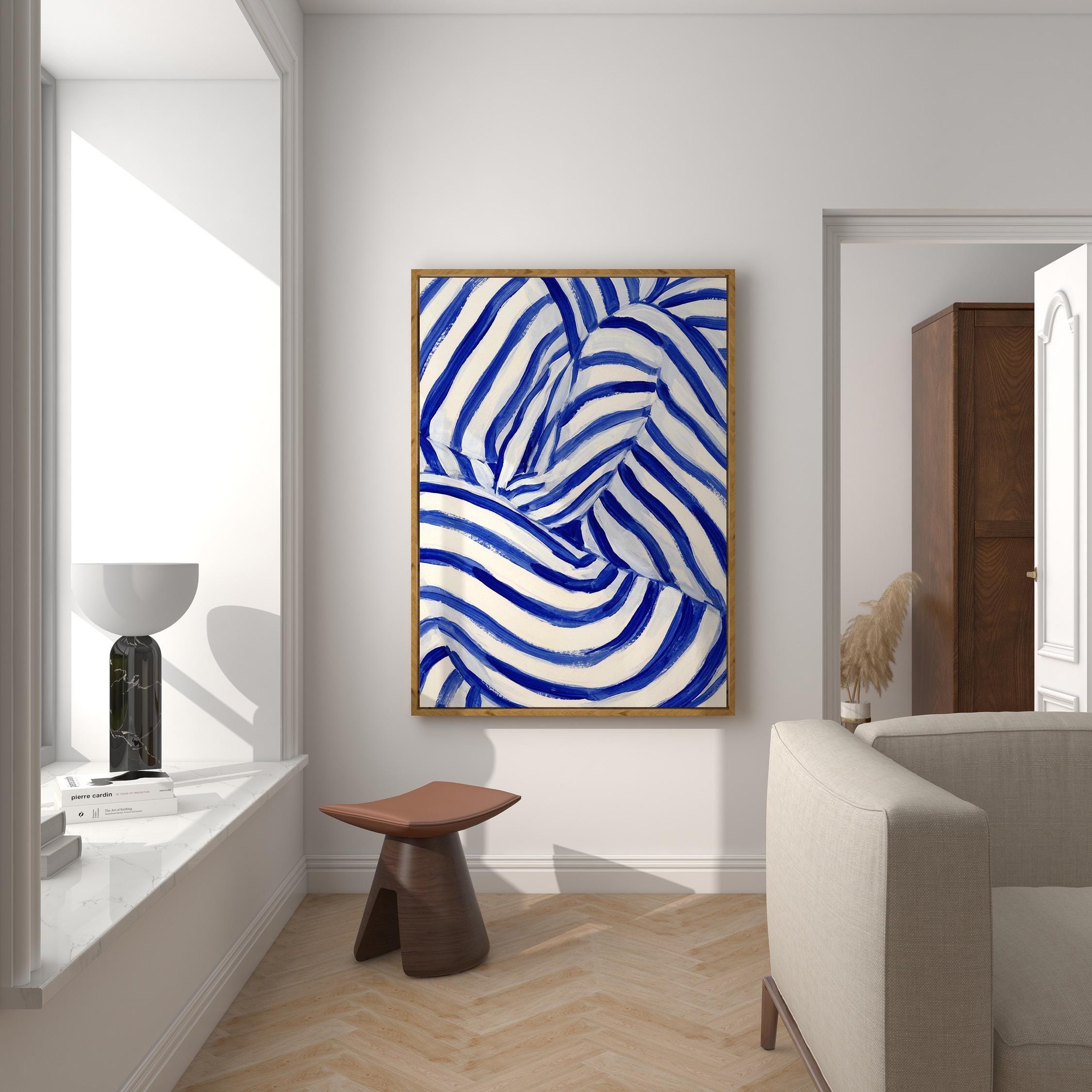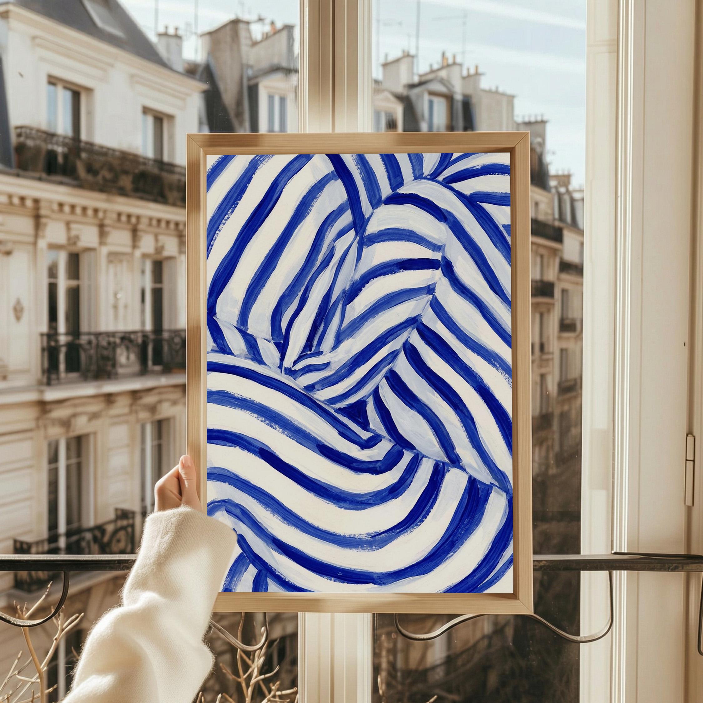 Blue abstract wall art print with bold brushstrokes and flowing lines. Works well in a living room, bedroom, or modern interior. It adds a clean, artistic and dynamic feel to the space.