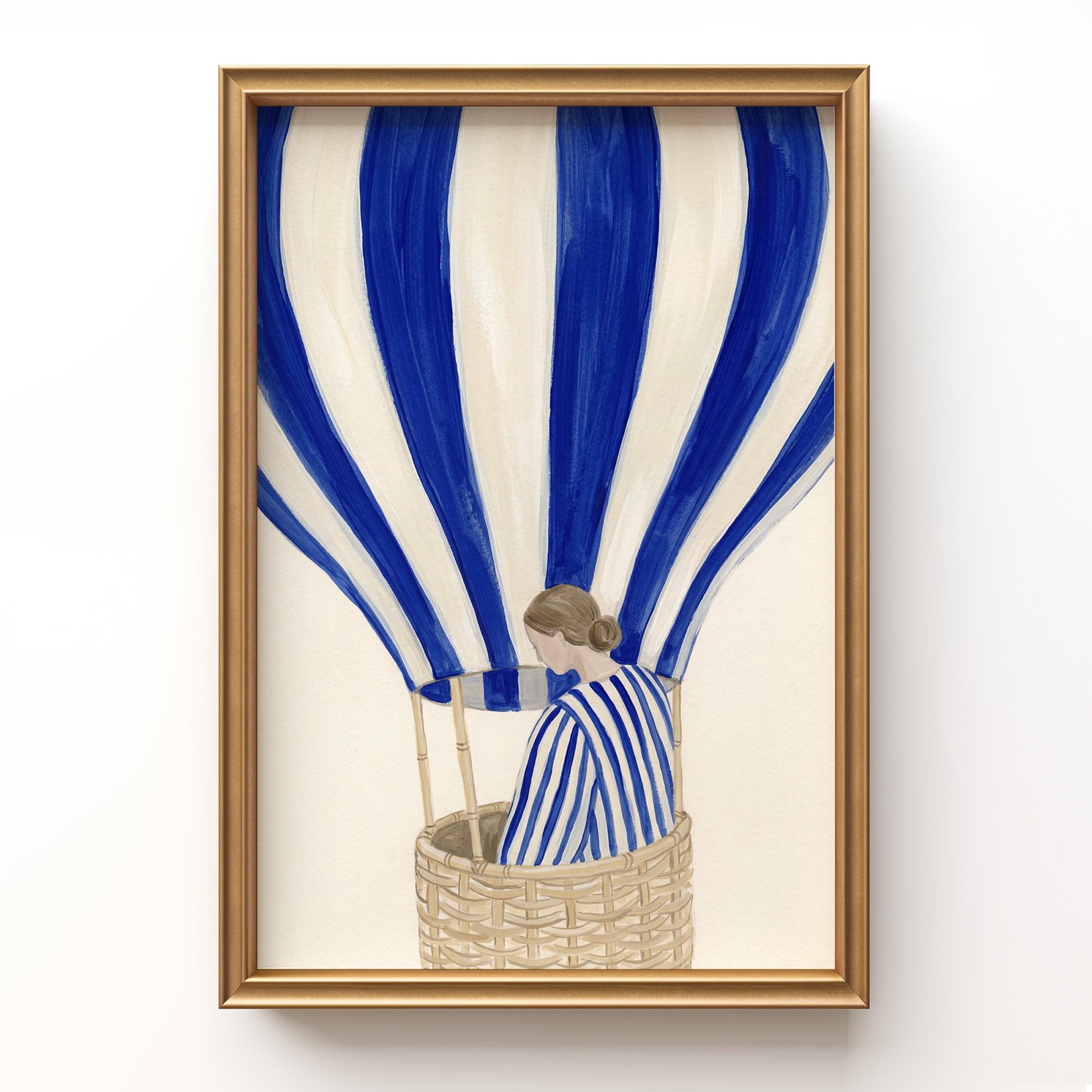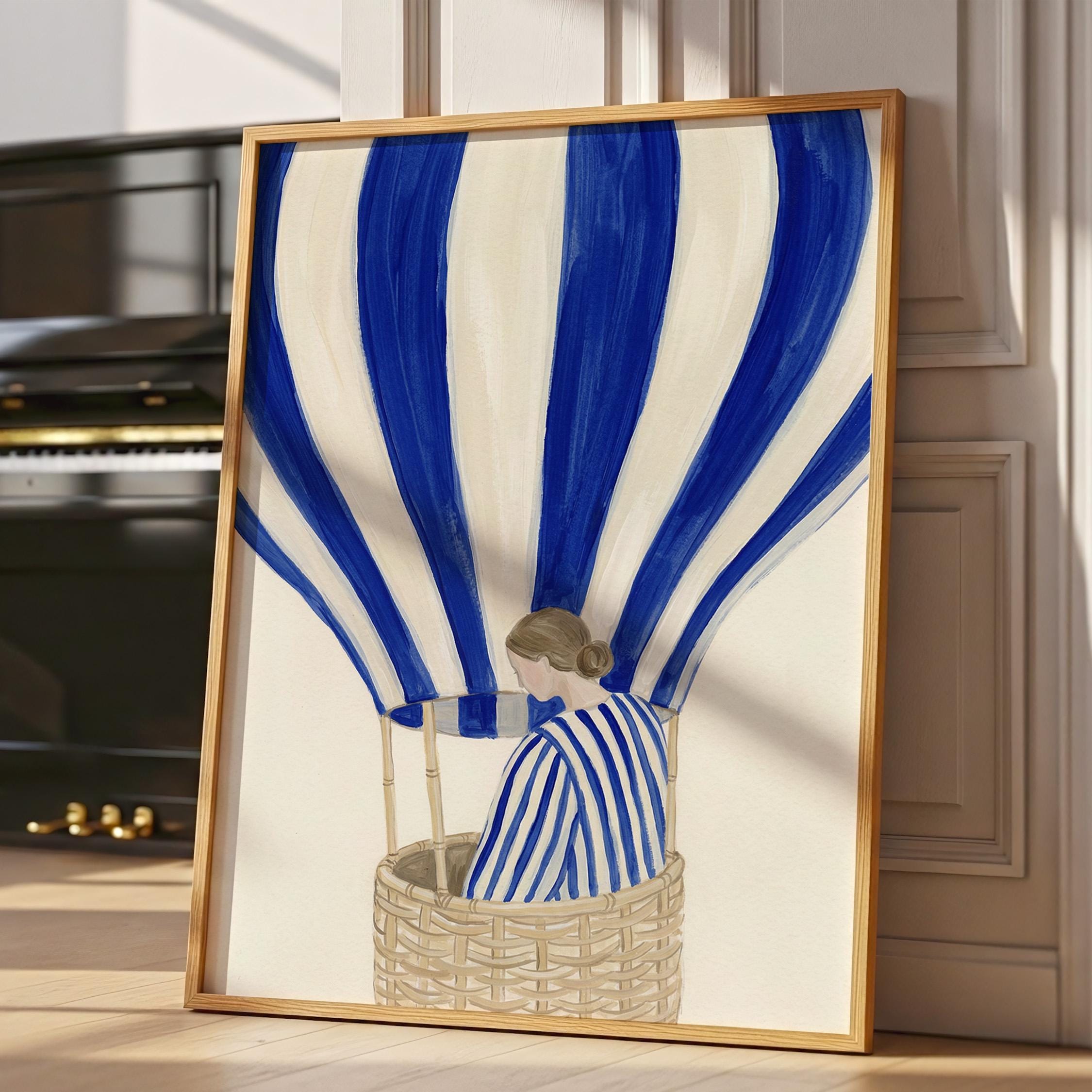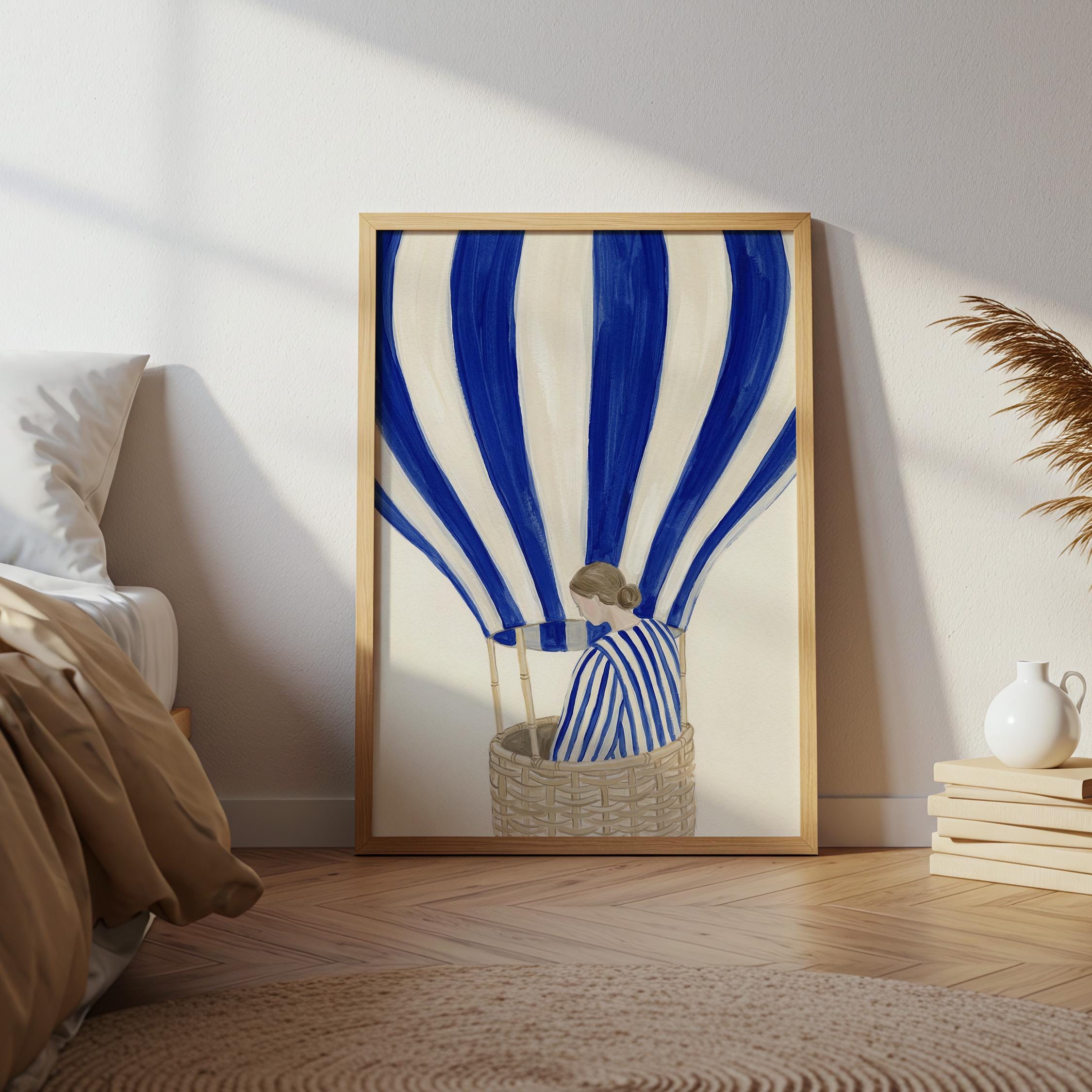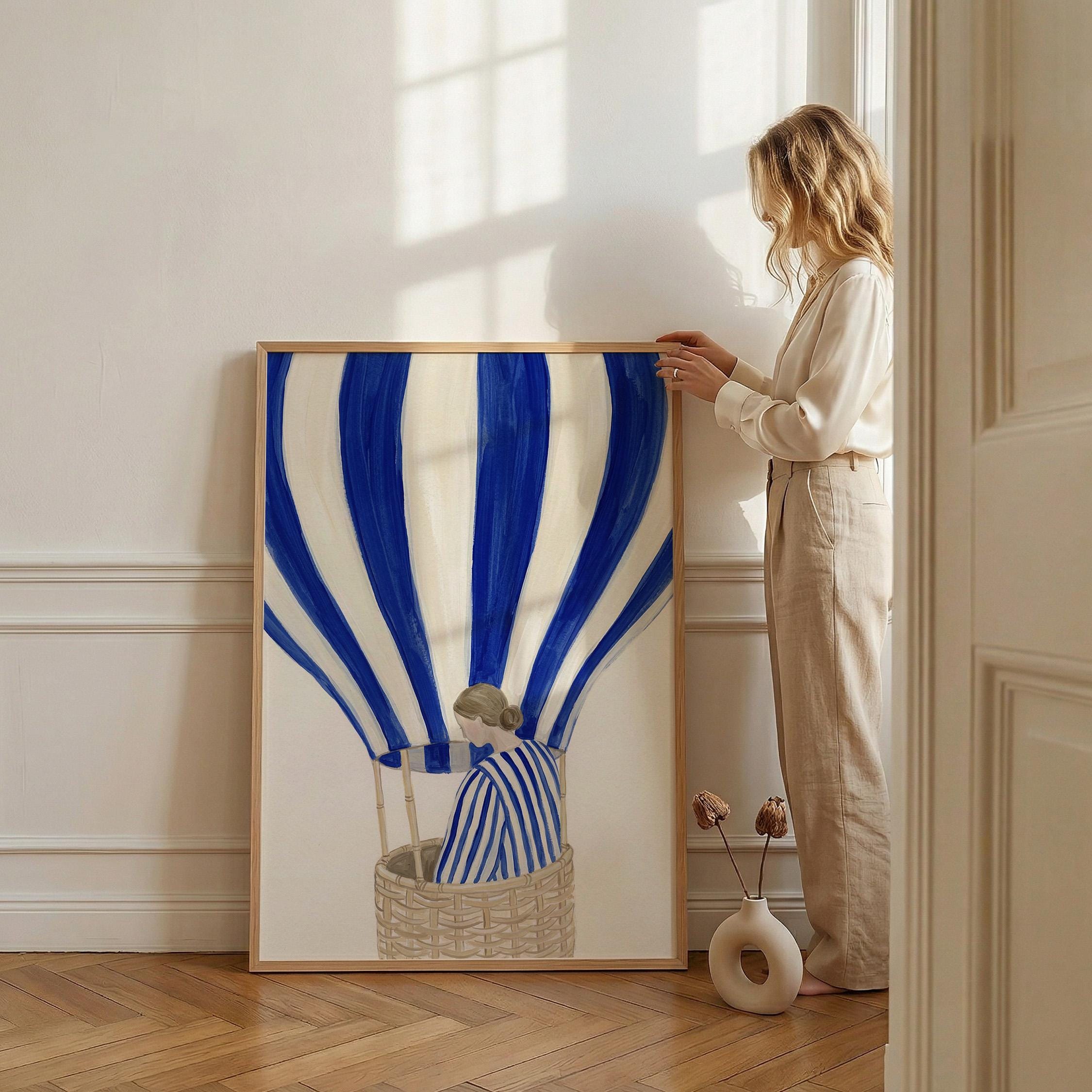 Hot air balloon wall art print with blue stripes and a calm illustration style. Great for a nursery, bedroom, or light modern space. It brings a soft, dreamy and peaceful atmosphere to the room.