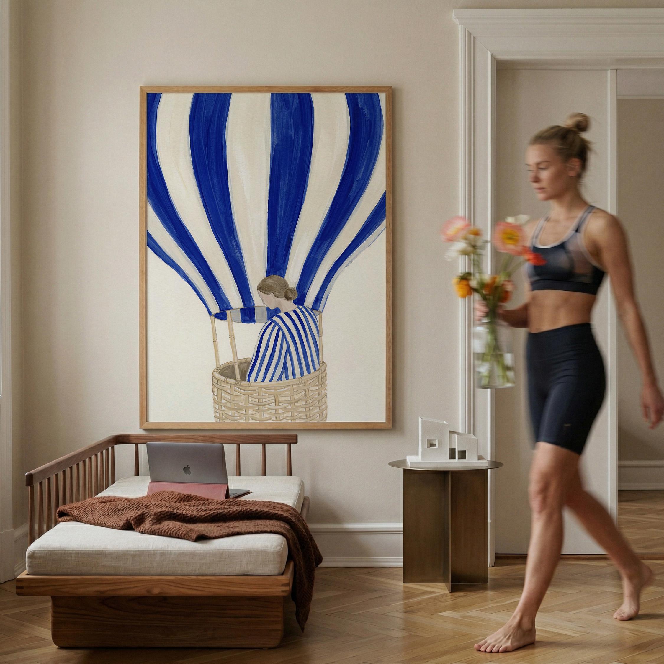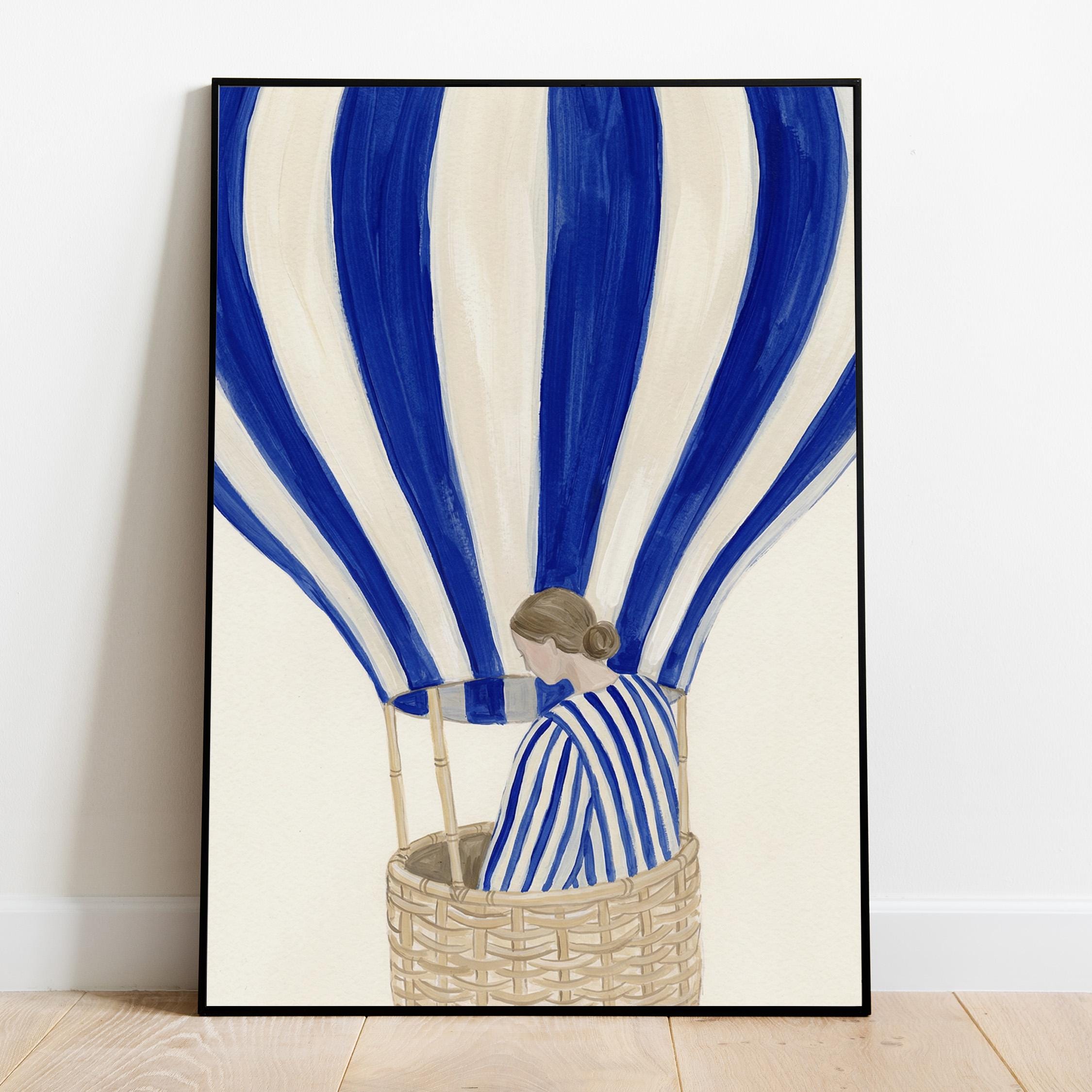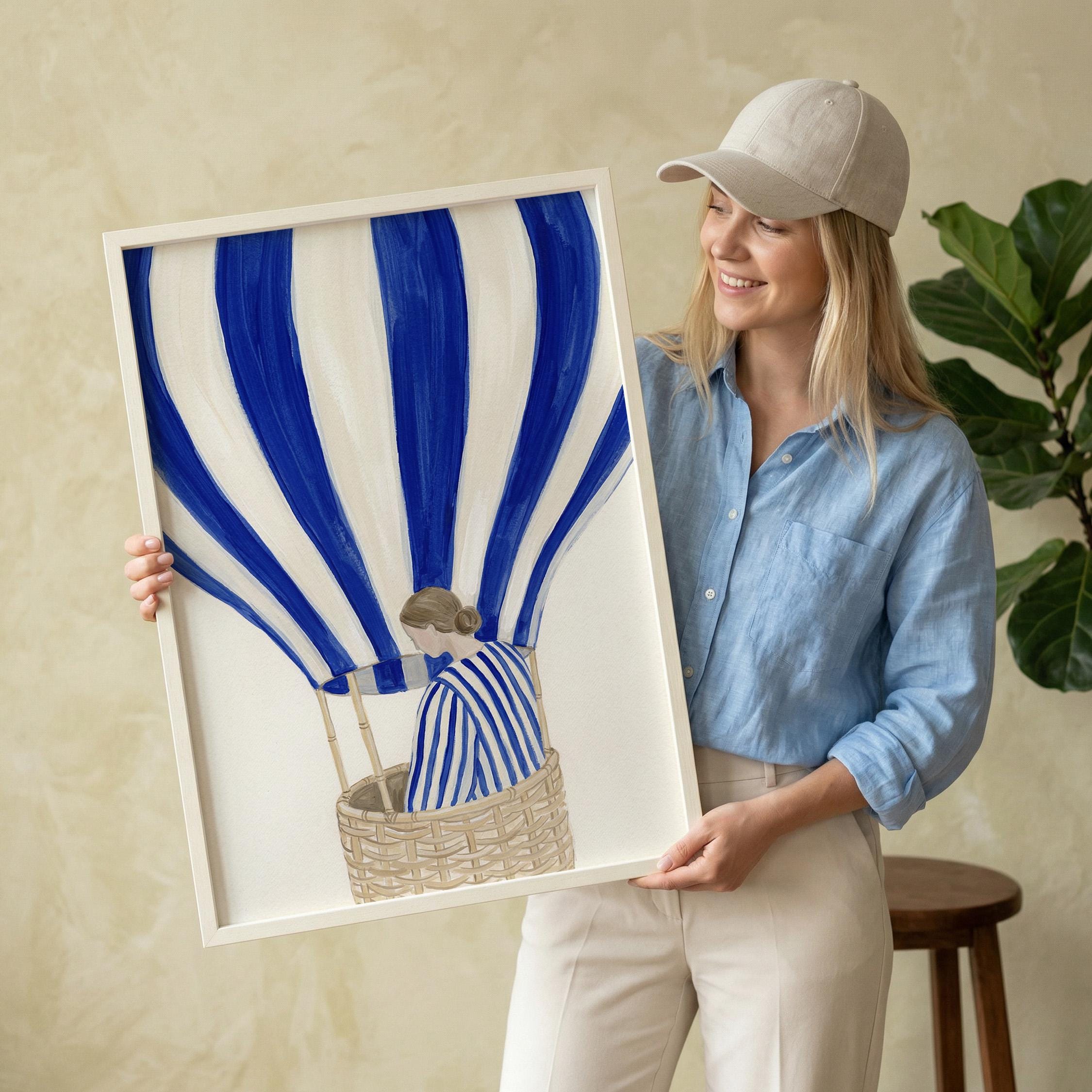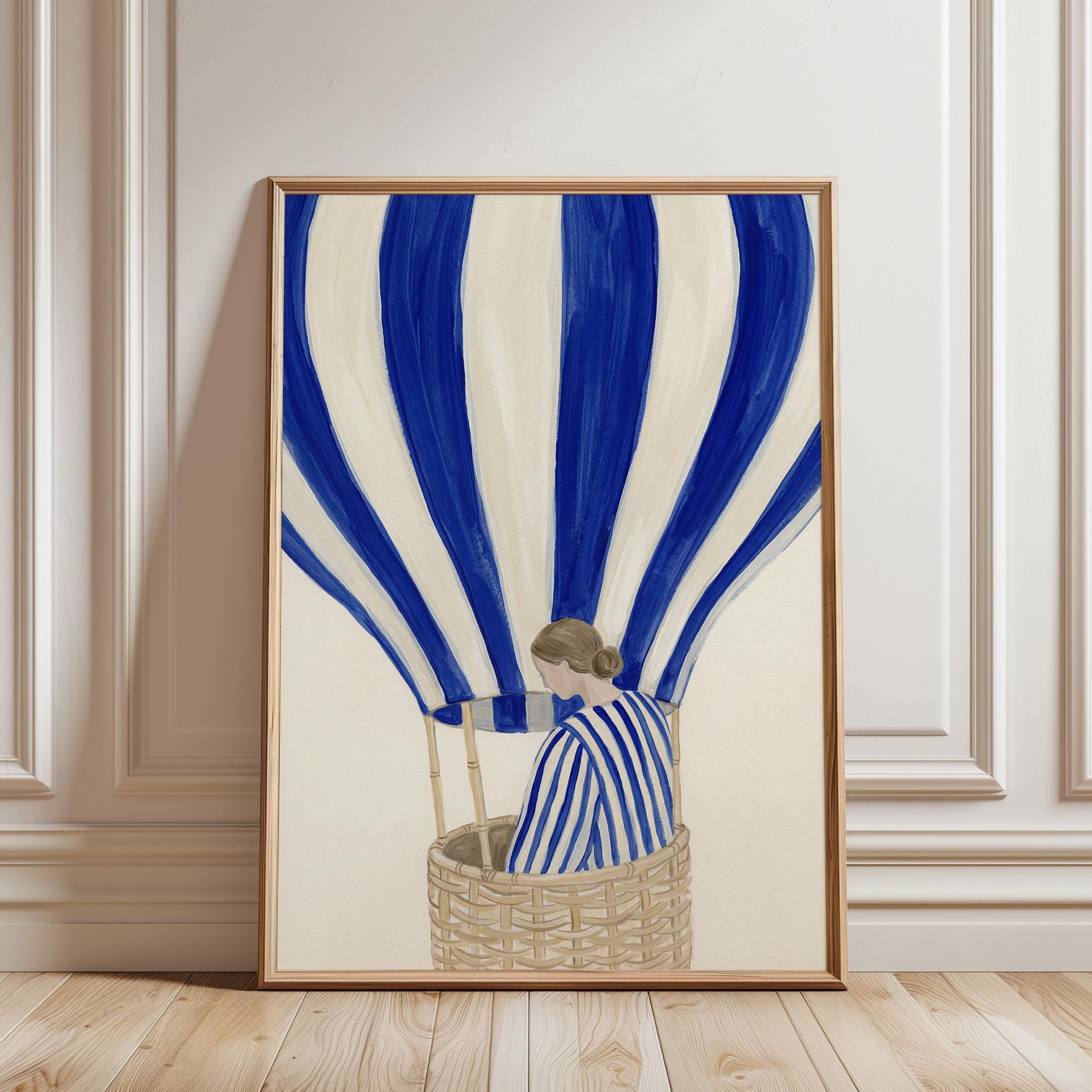 Hot air balloon wall art print with blue stripes and a calm illustration style. Great for a nursery, bedroom, or light modern space. It brings a soft, dreamy and peaceful atmosphere to the room.