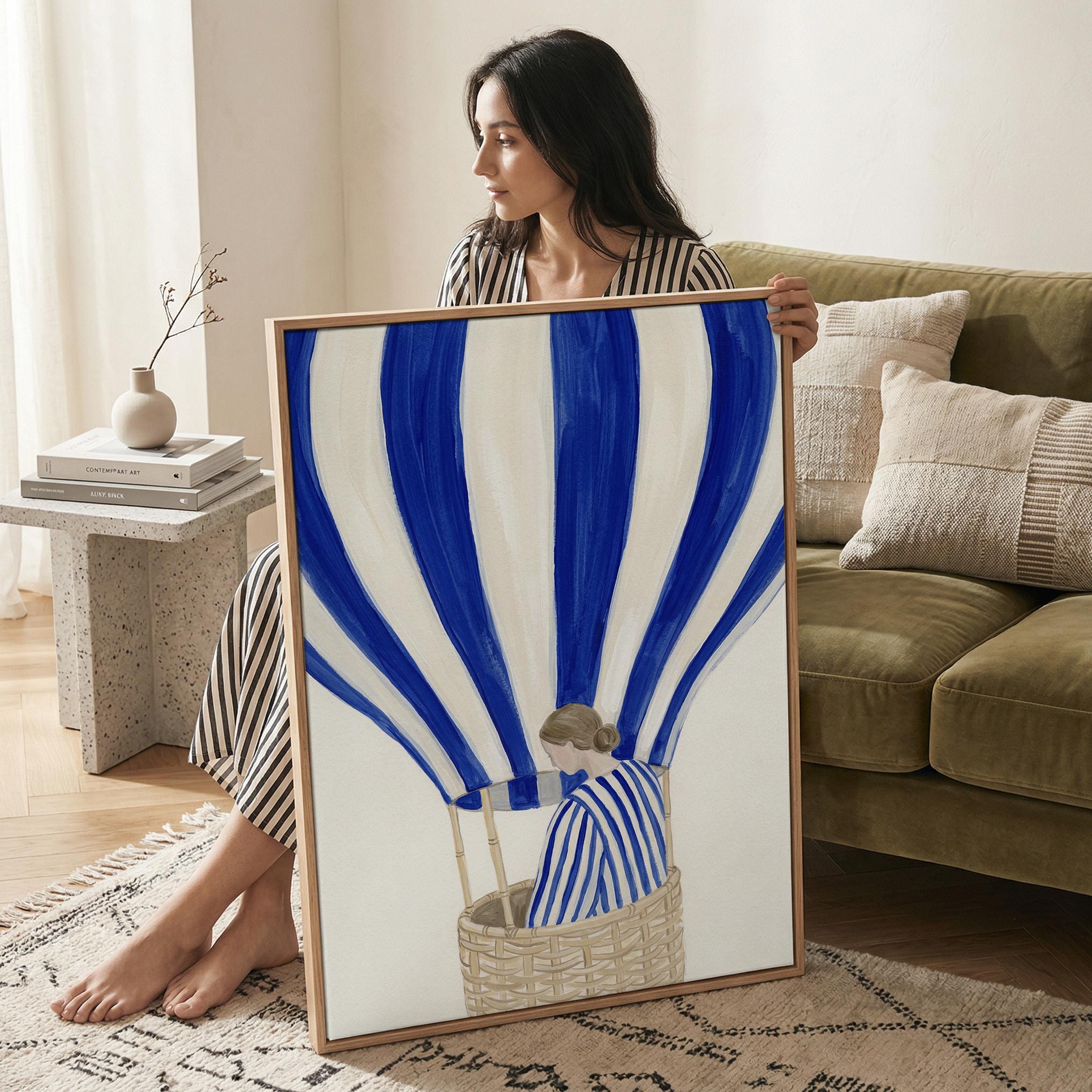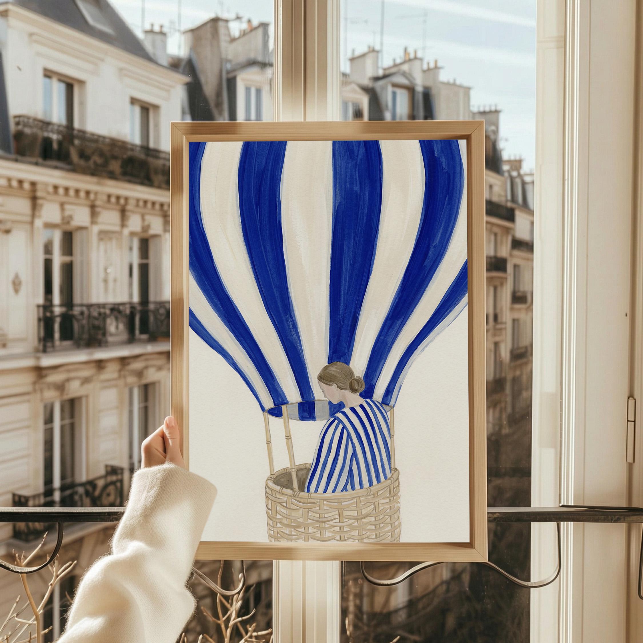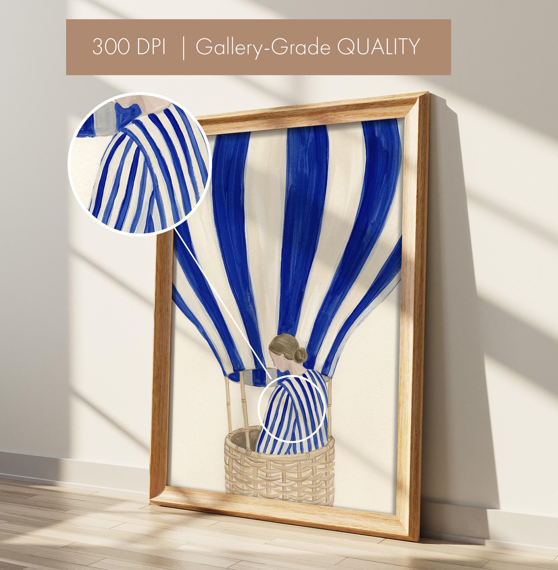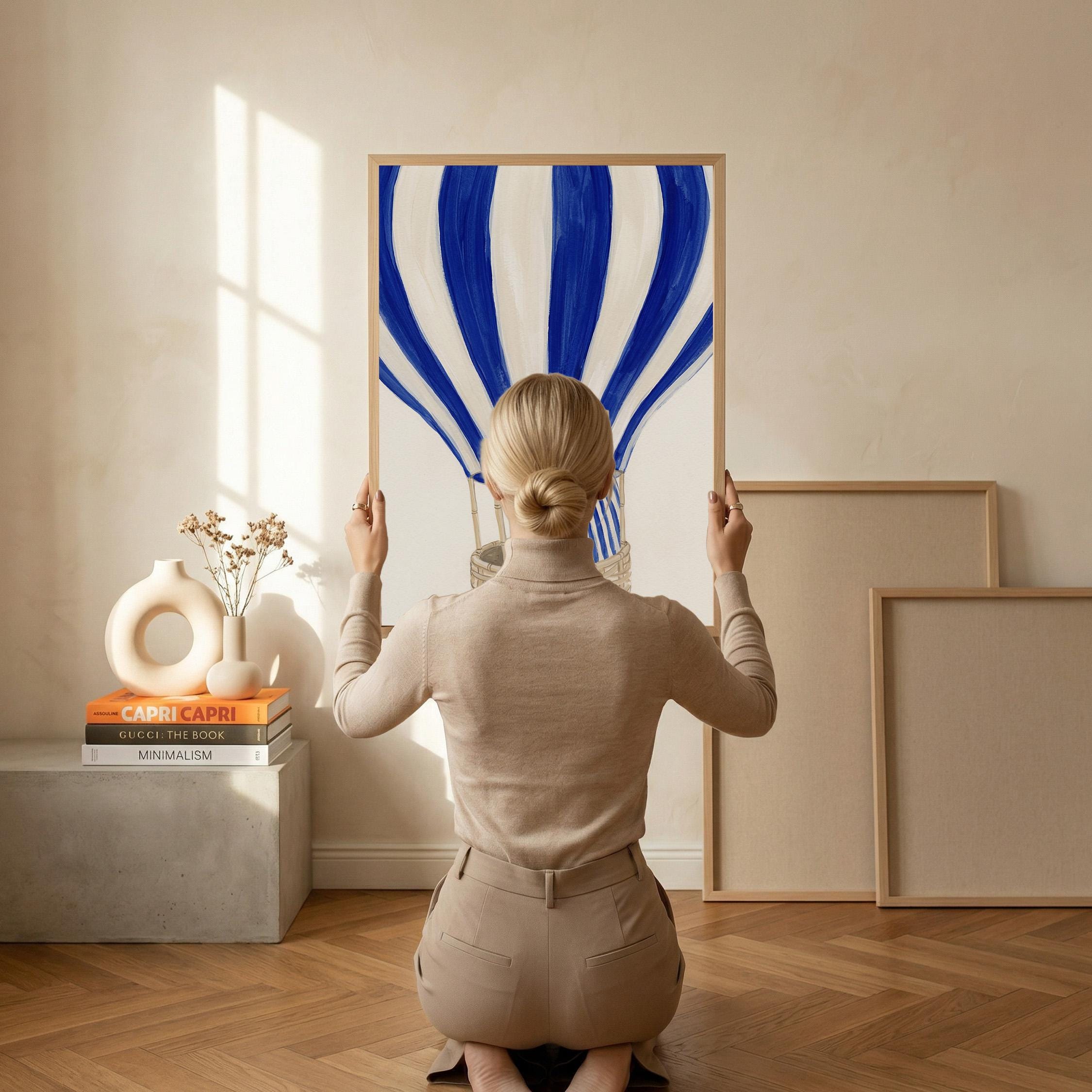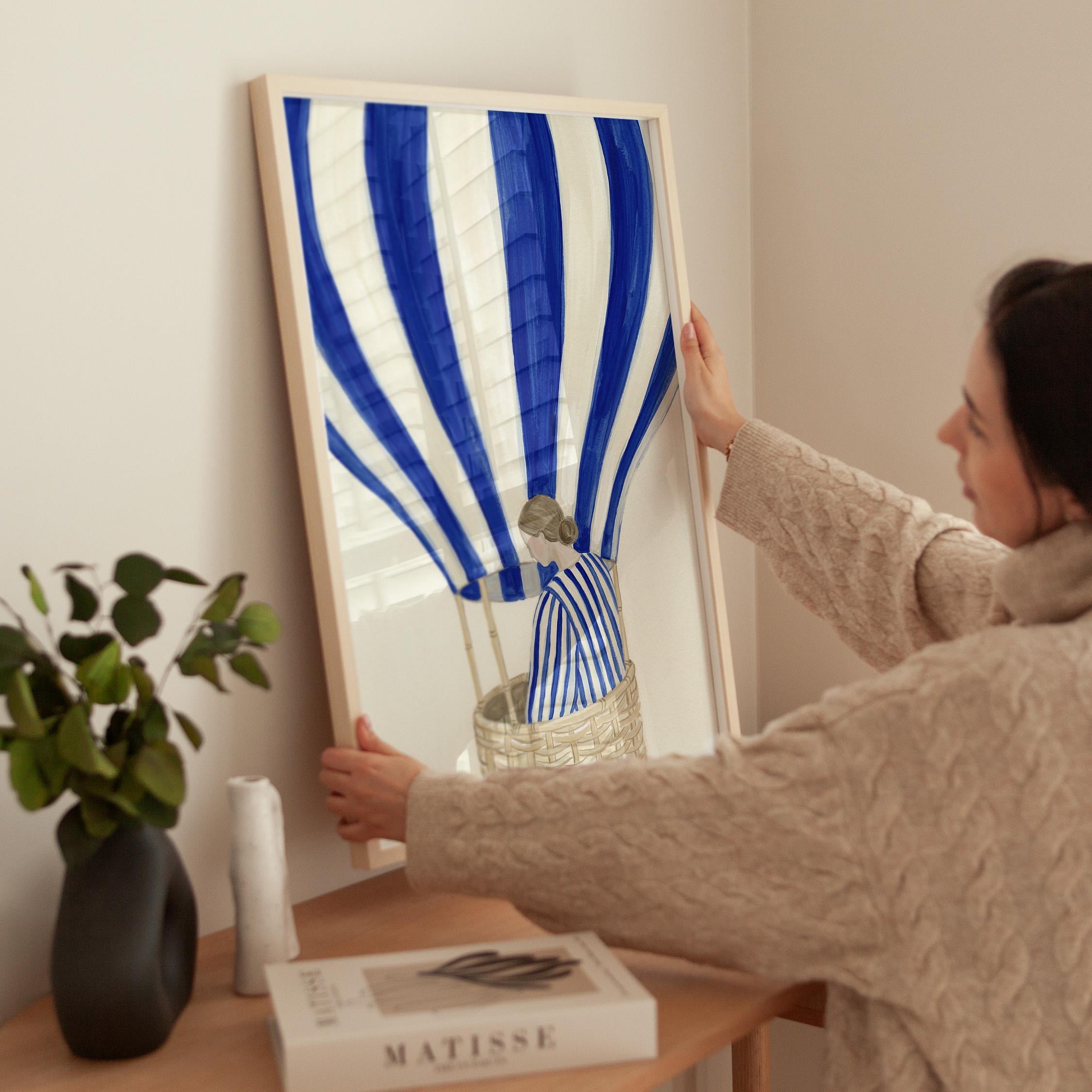 Hot air balloon wall art print with blue stripes and a calm illustration style. Great for a nursery, bedroom, or light modern space. It brings a soft, dreamy and peaceful atmosphere to the room.