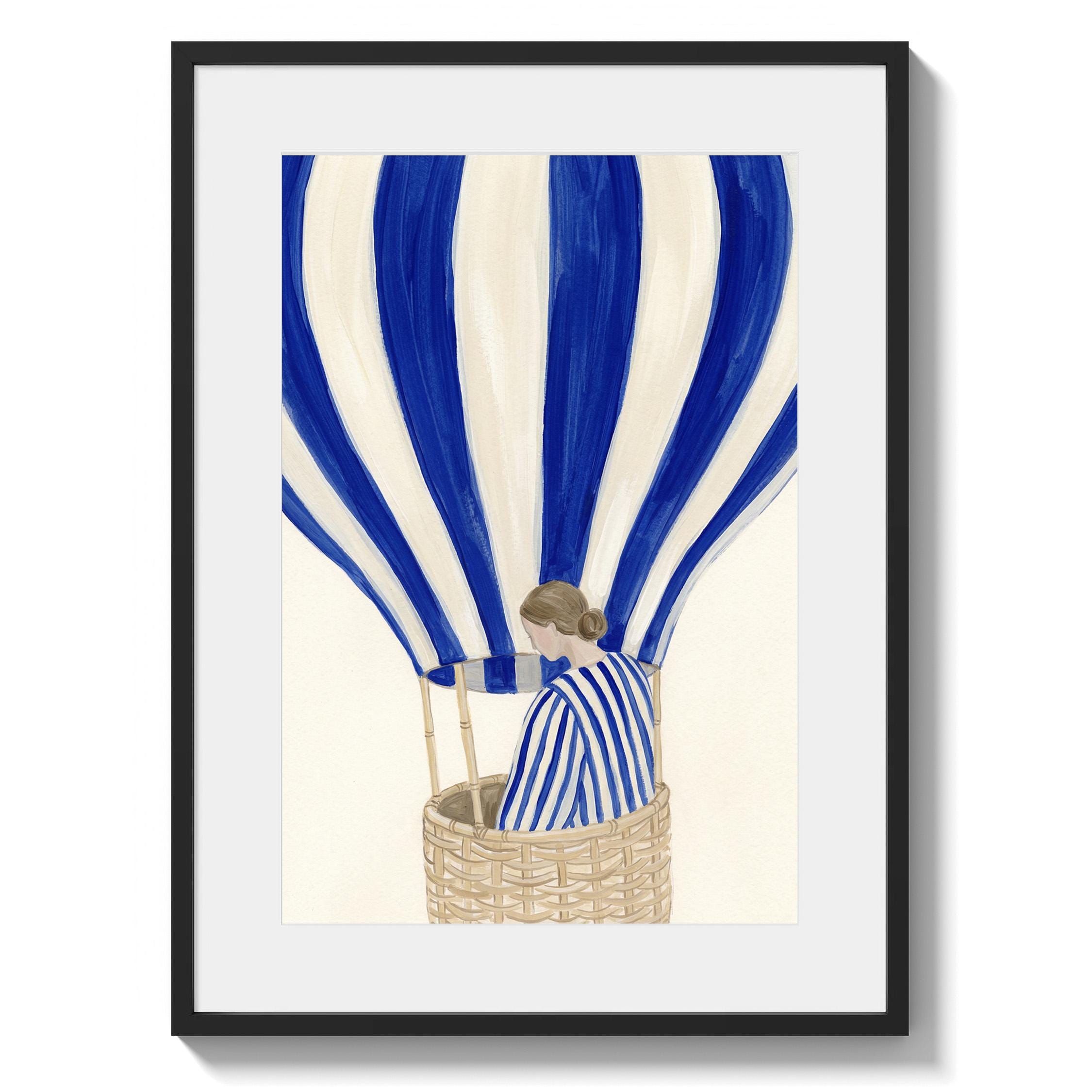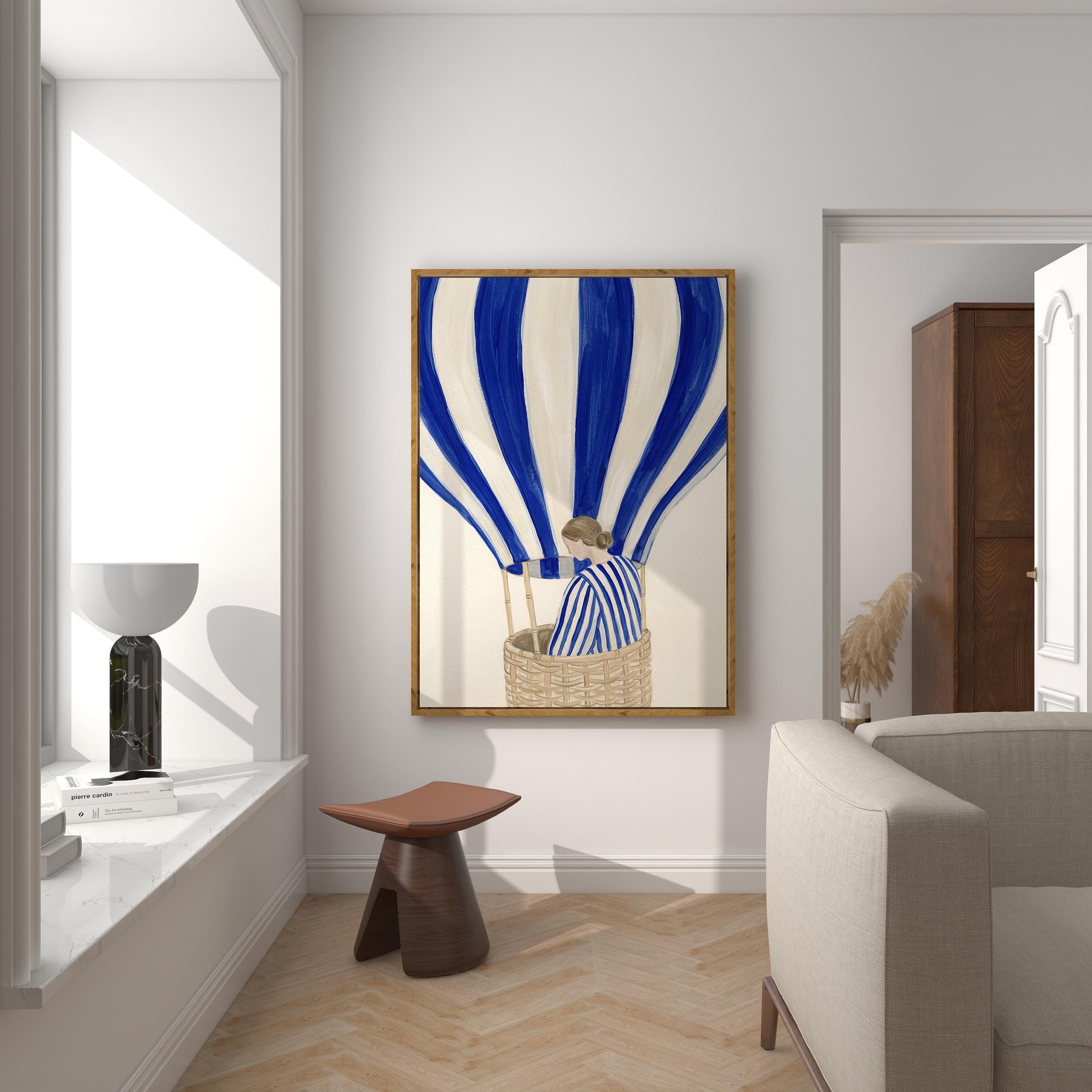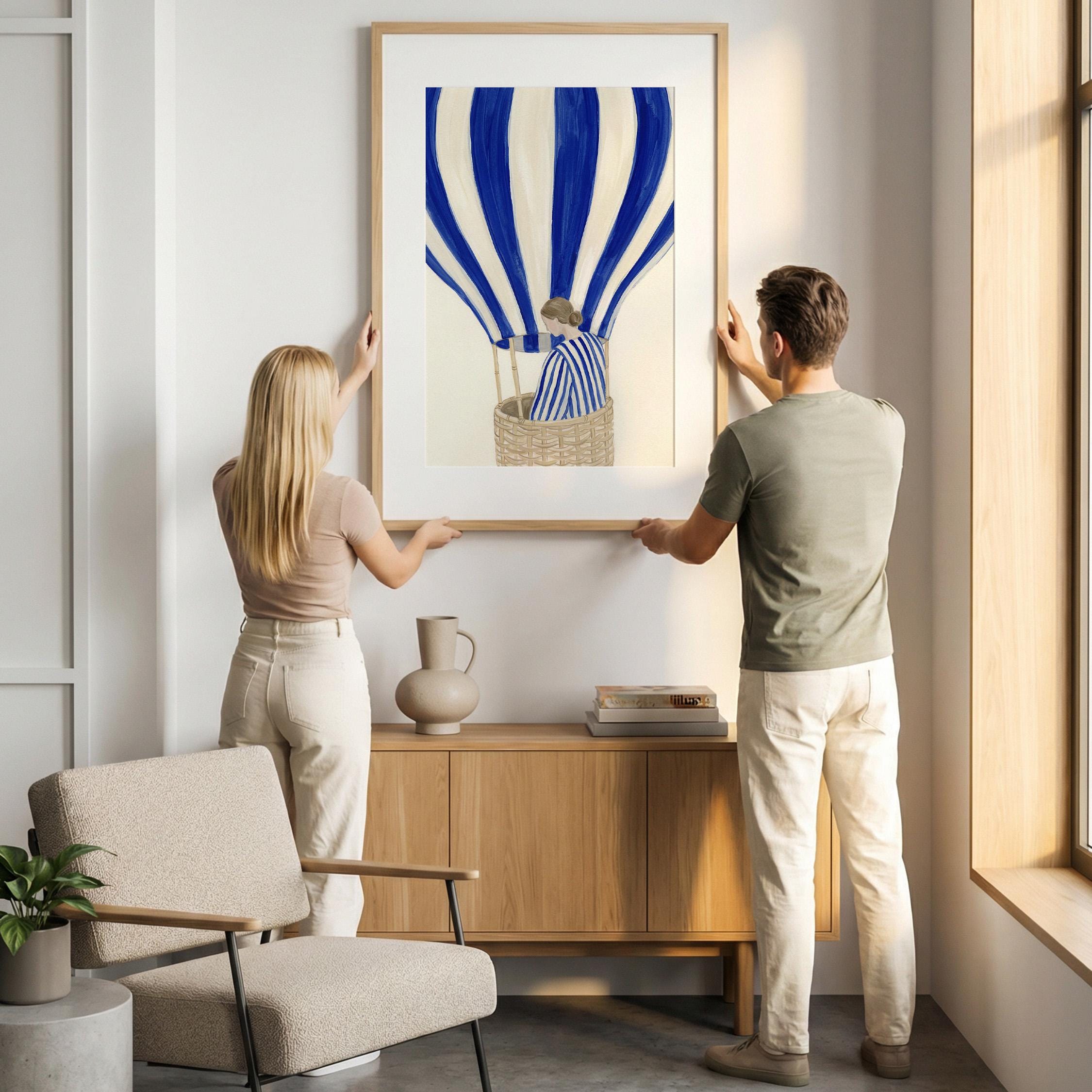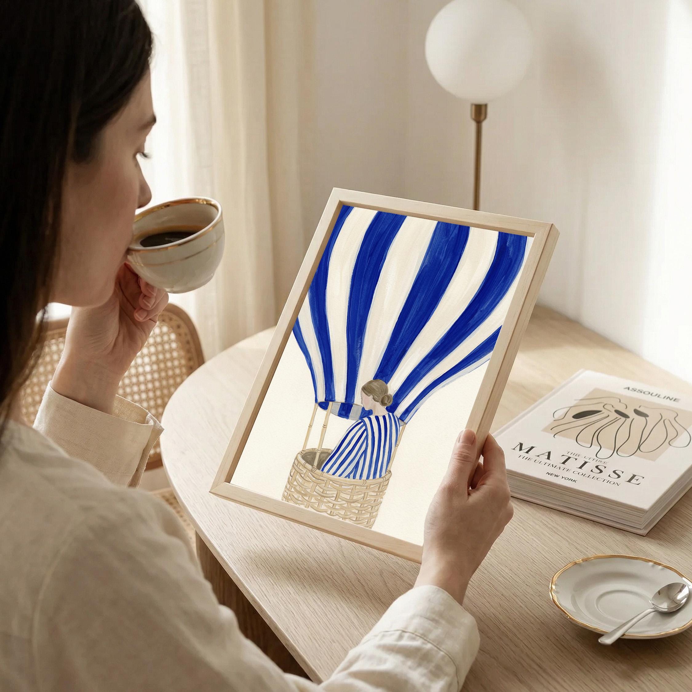 Hot air balloon wall art print with blue stripes and a calm illustration style. Great for a nursery, bedroom, or light modern space. It brings a soft, dreamy and peaceful atmosphere to the room.