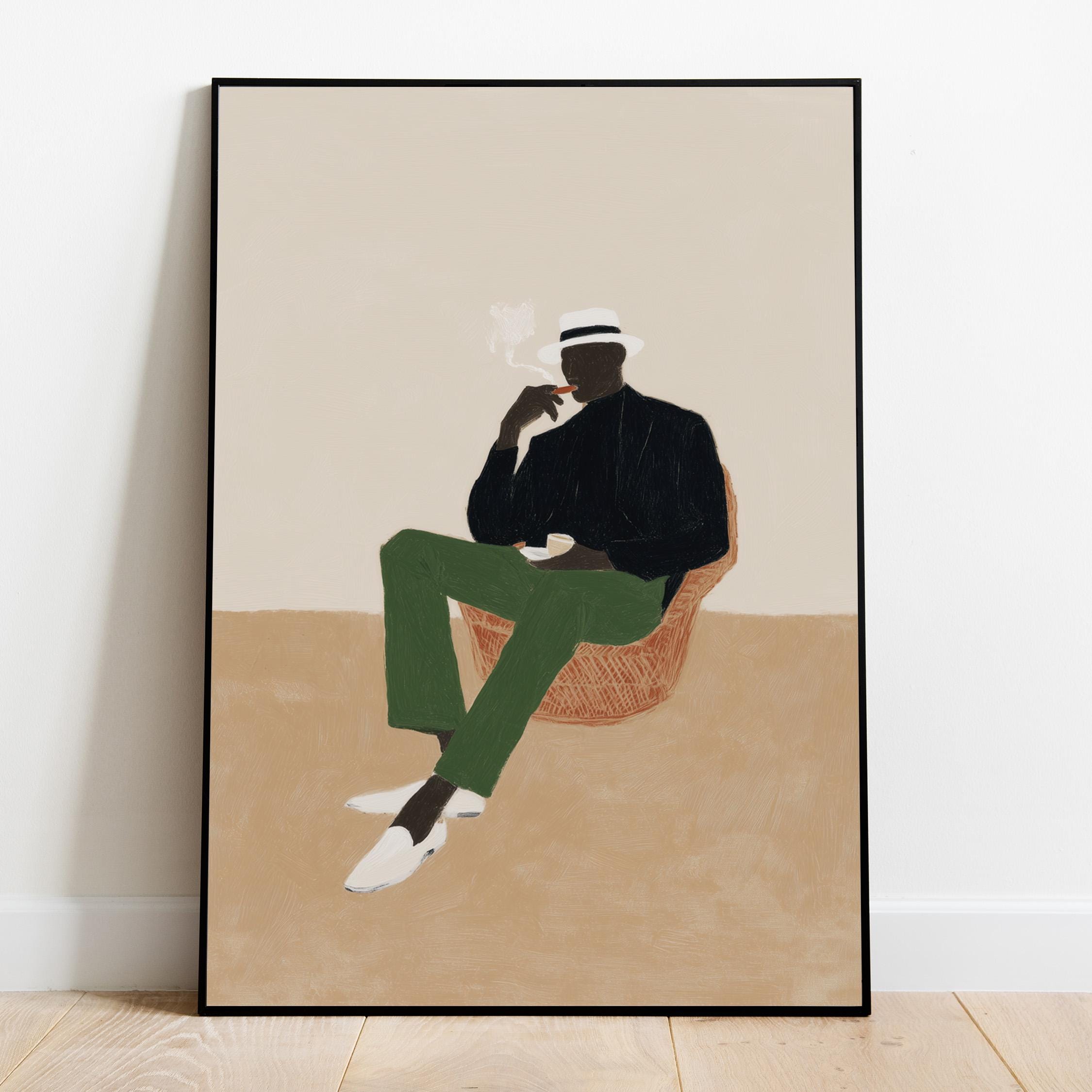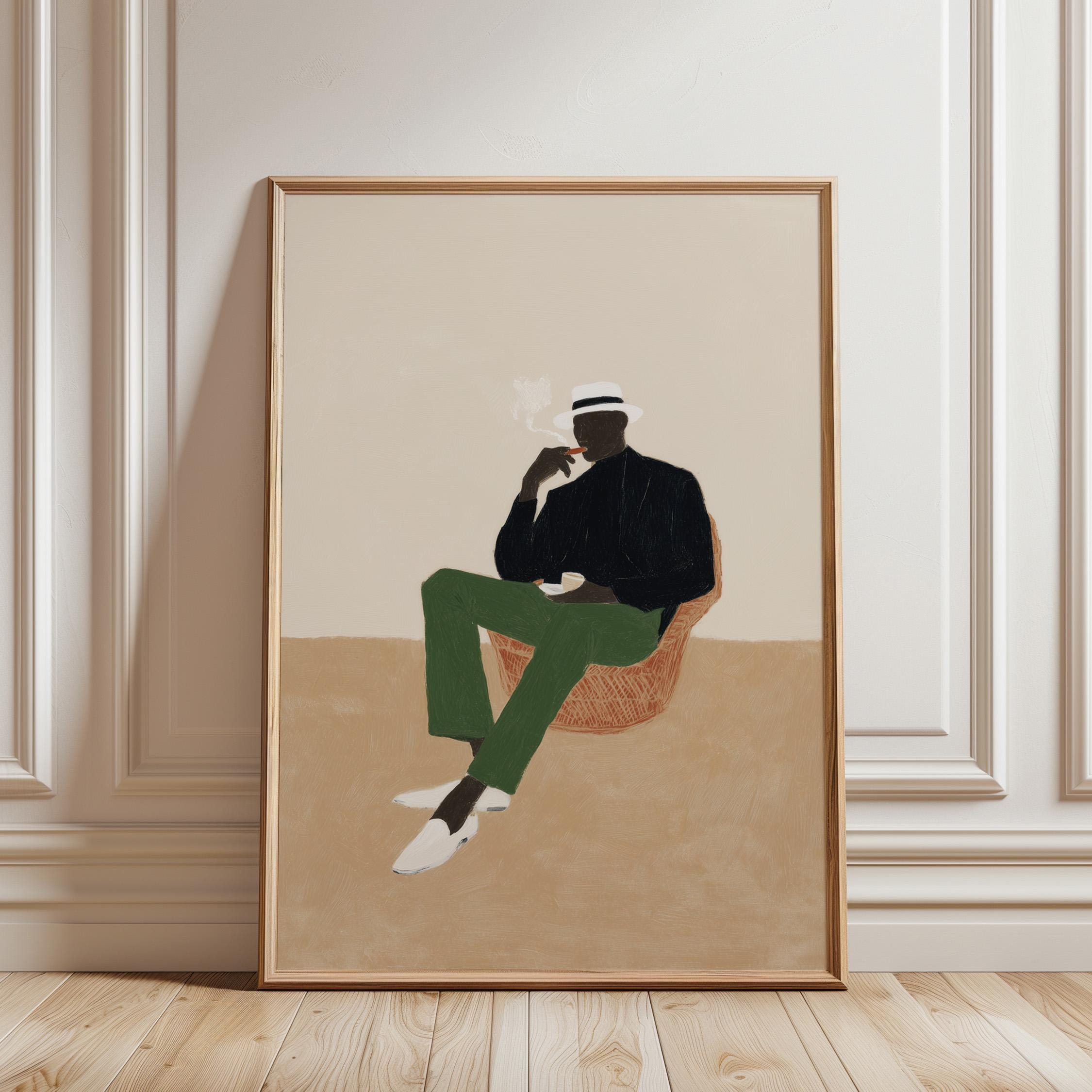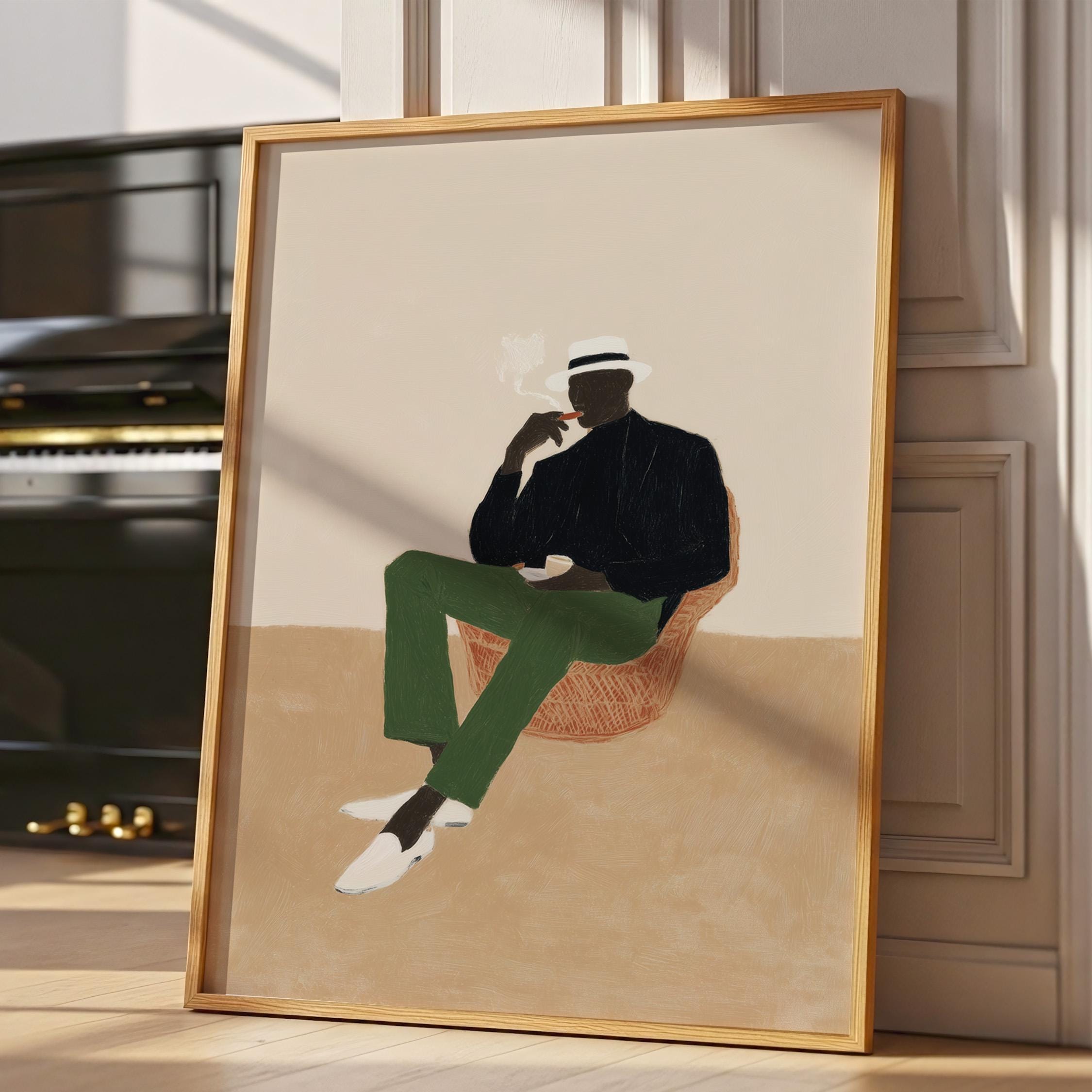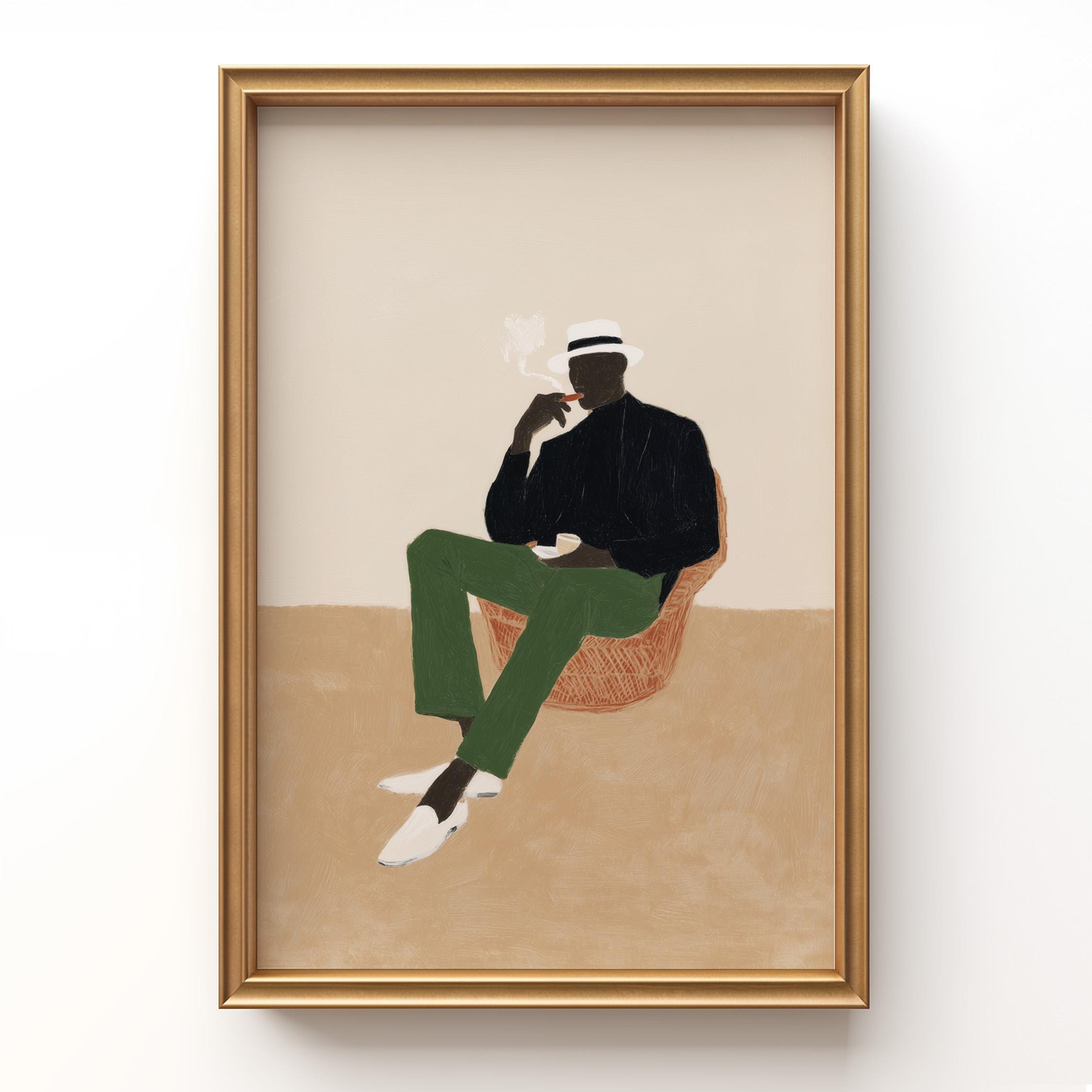 Black man smoking wall art print with neutral tones and a relaxed pose. Works well in a living room, office, or lounge space. It adds a calm, refined and confident feel to the room.