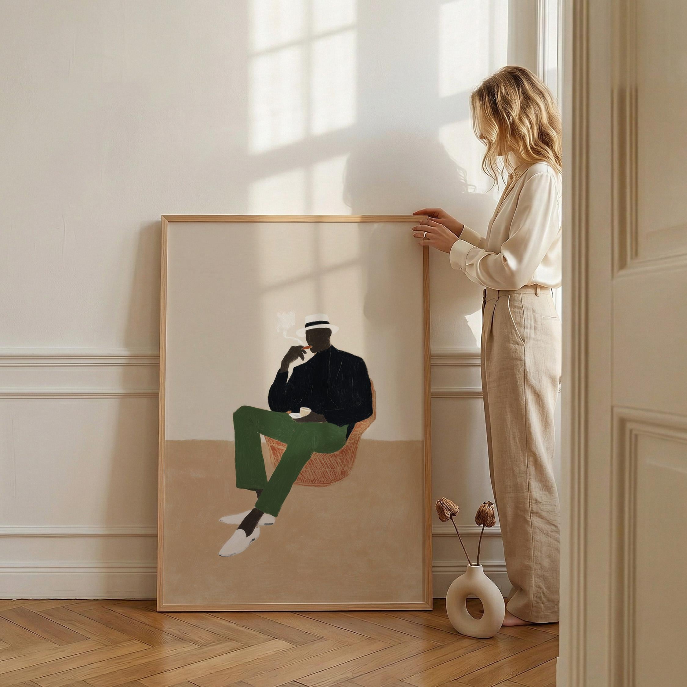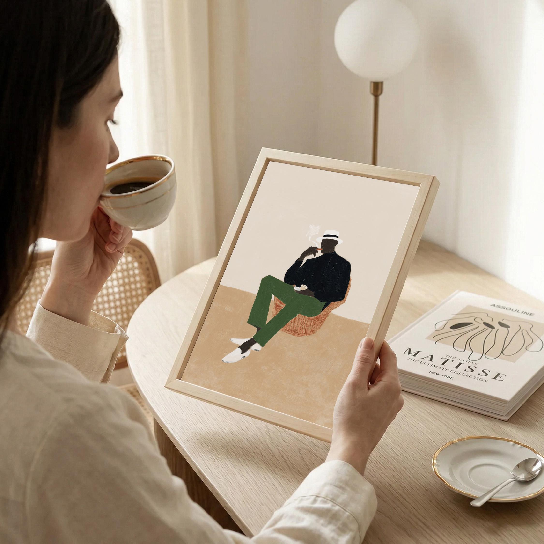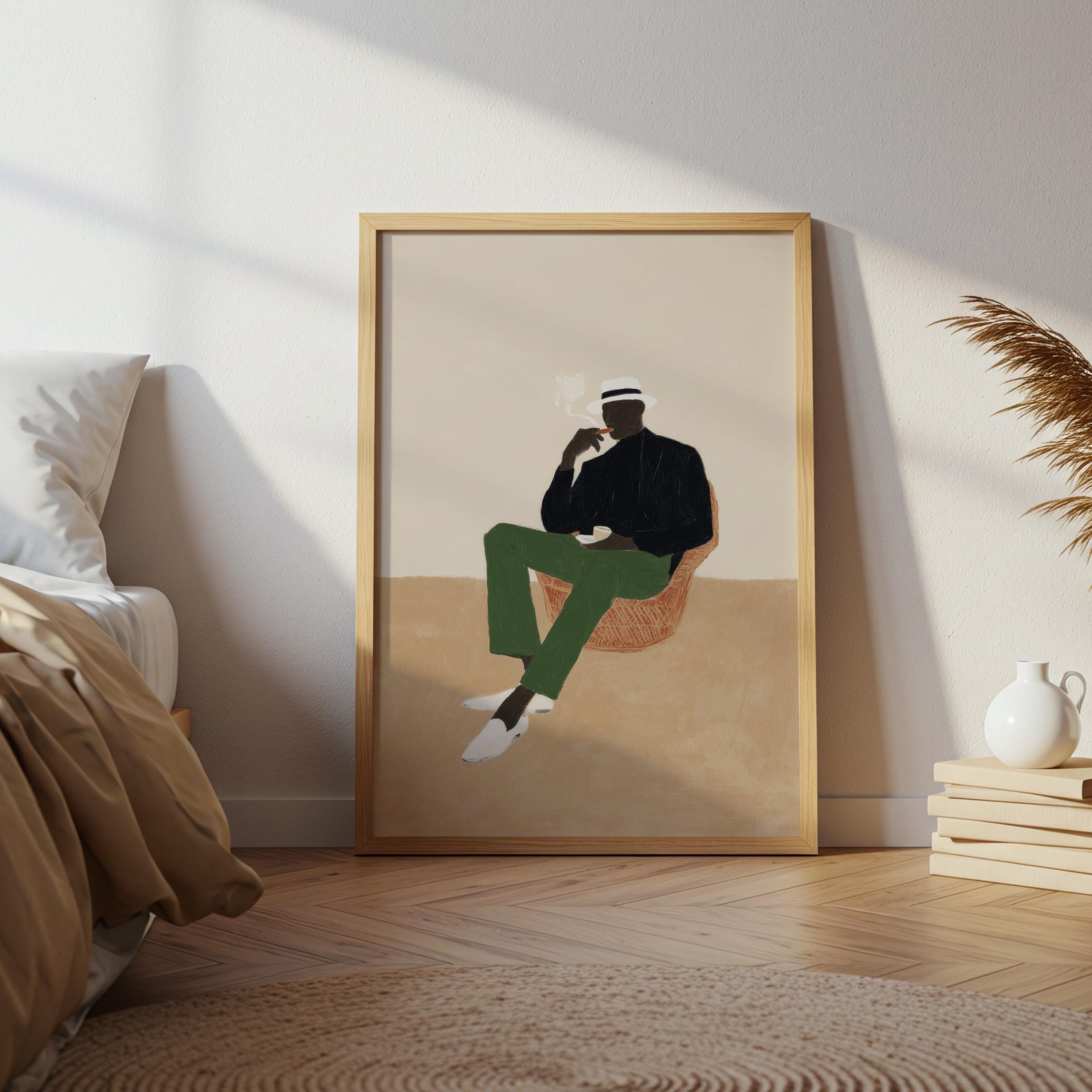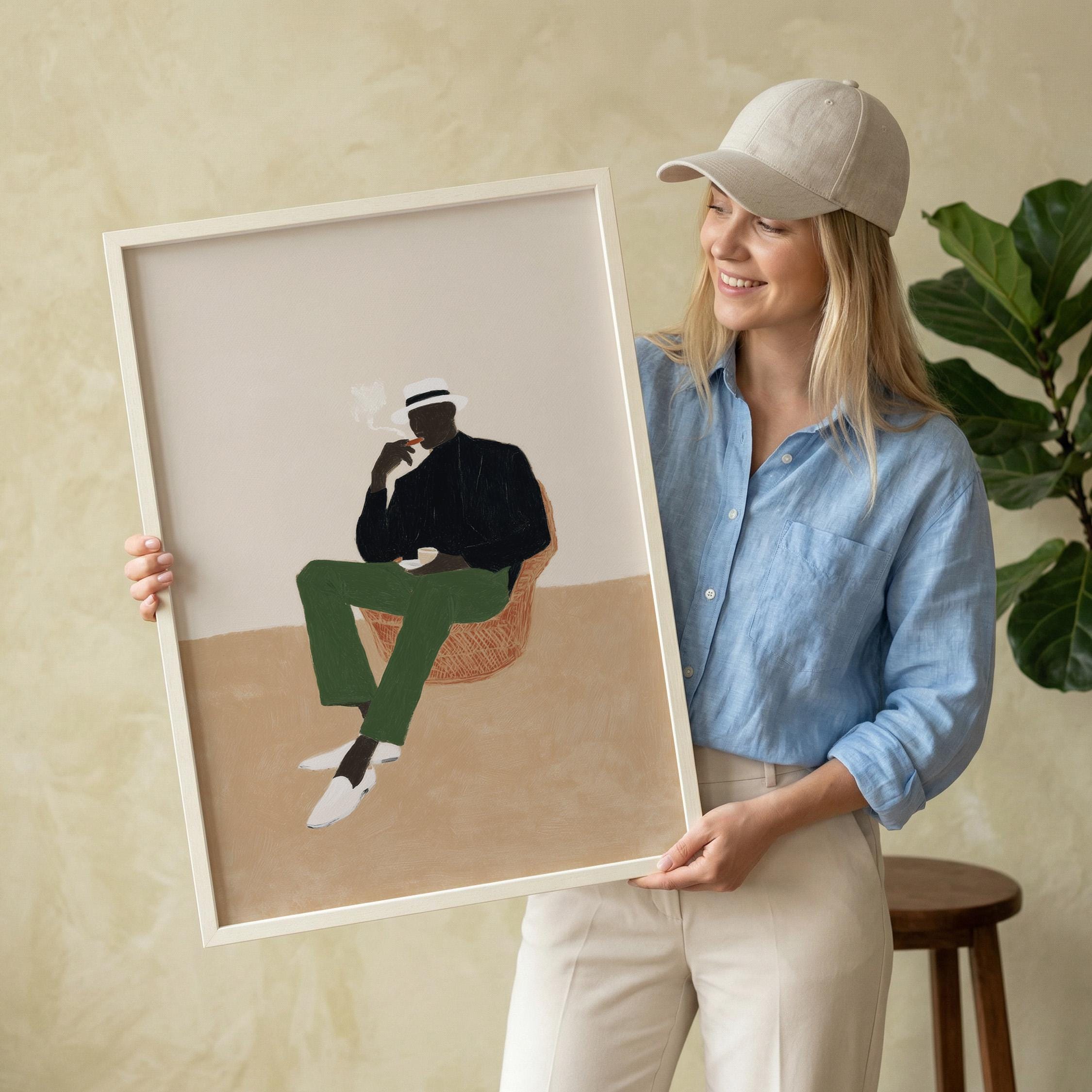 Black man smoking wall art print with neutral tones and a relaxed pose. Works well in a living room, office, or lounge space. It adds a calm, refined and confident feel to the room.