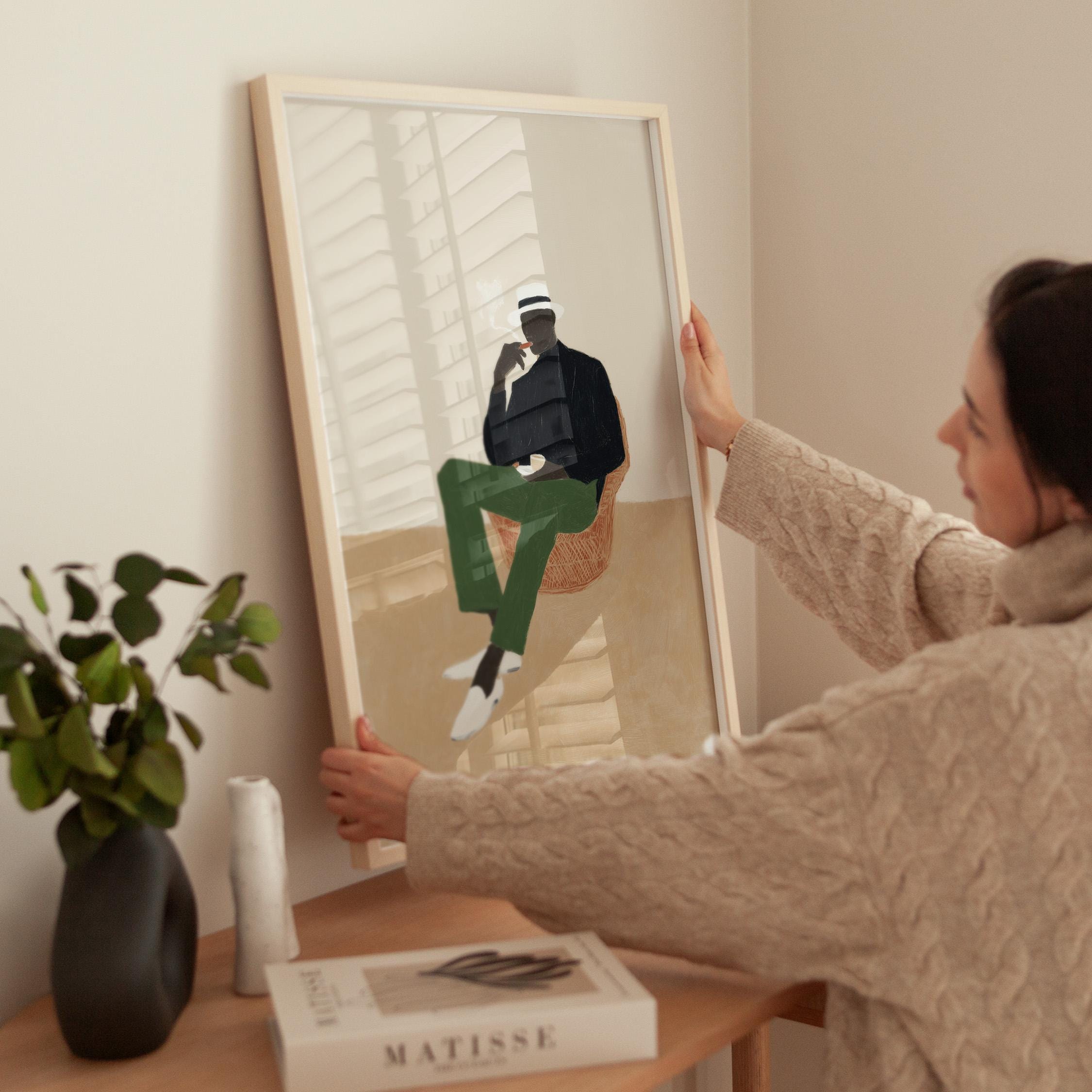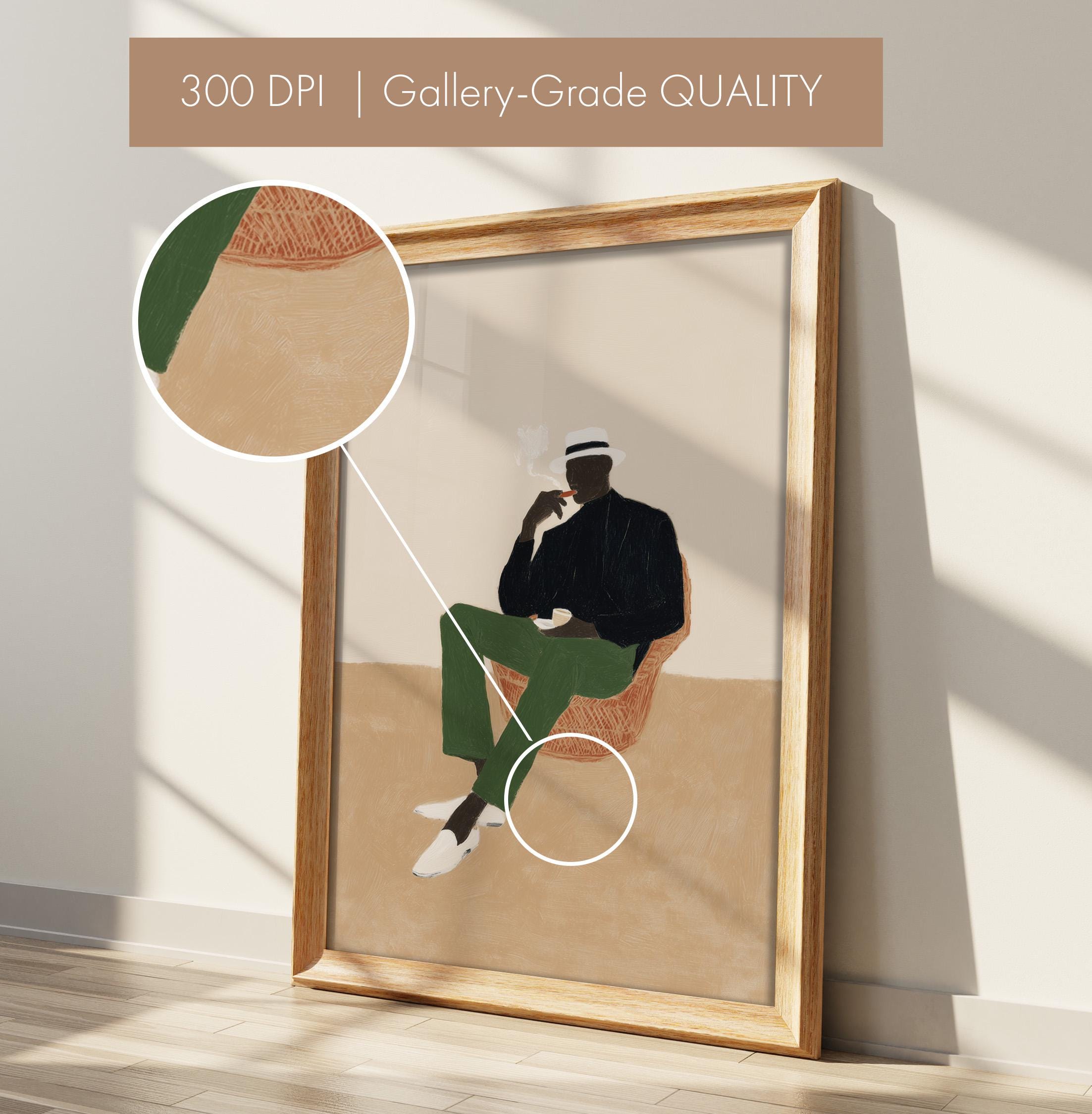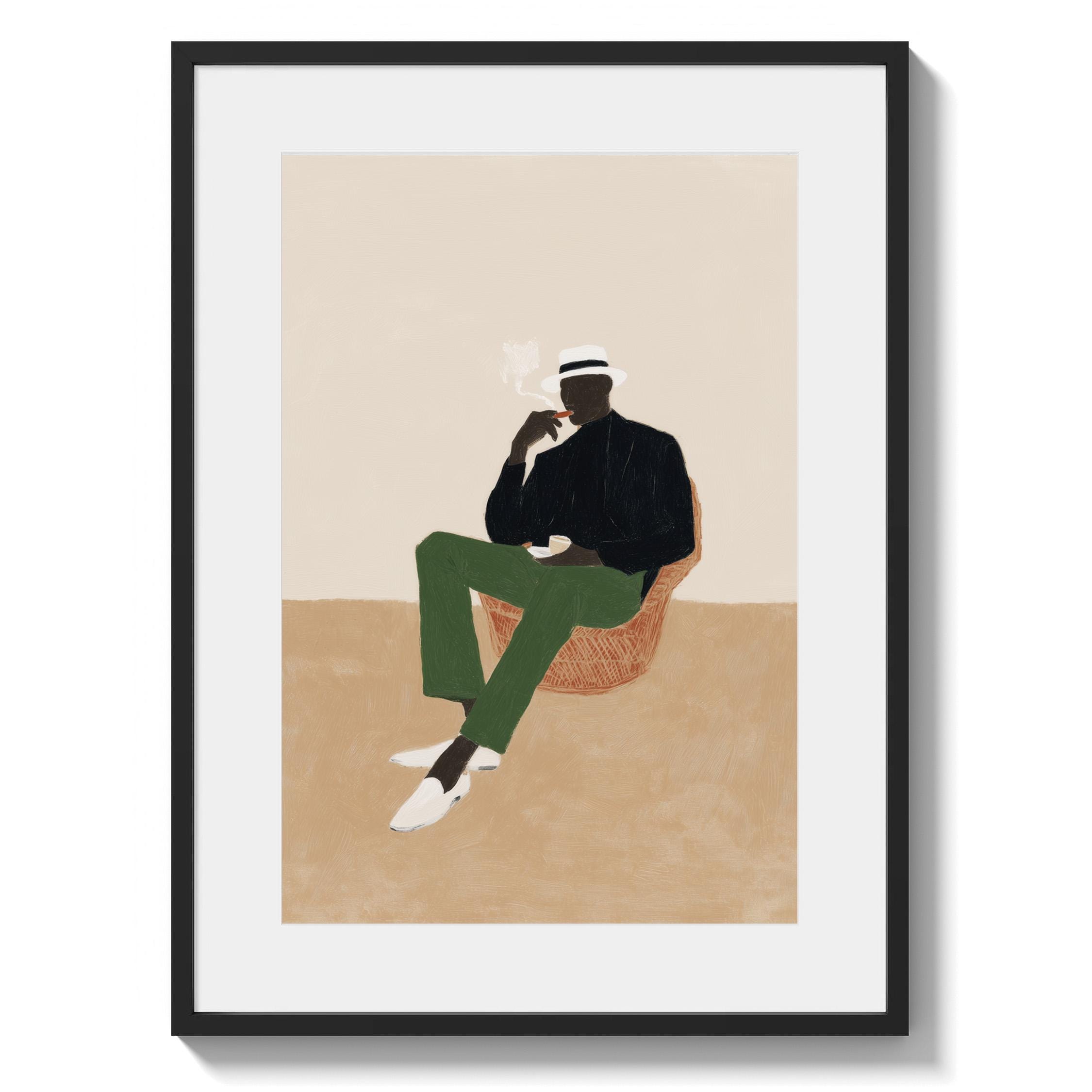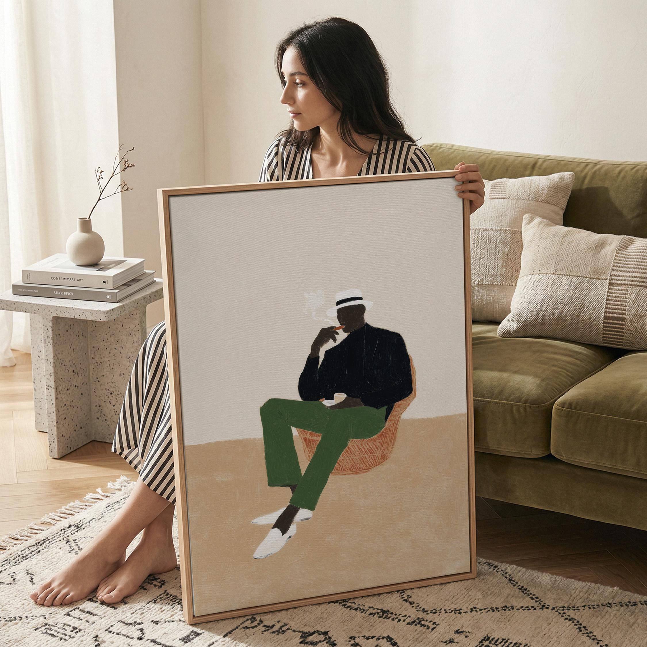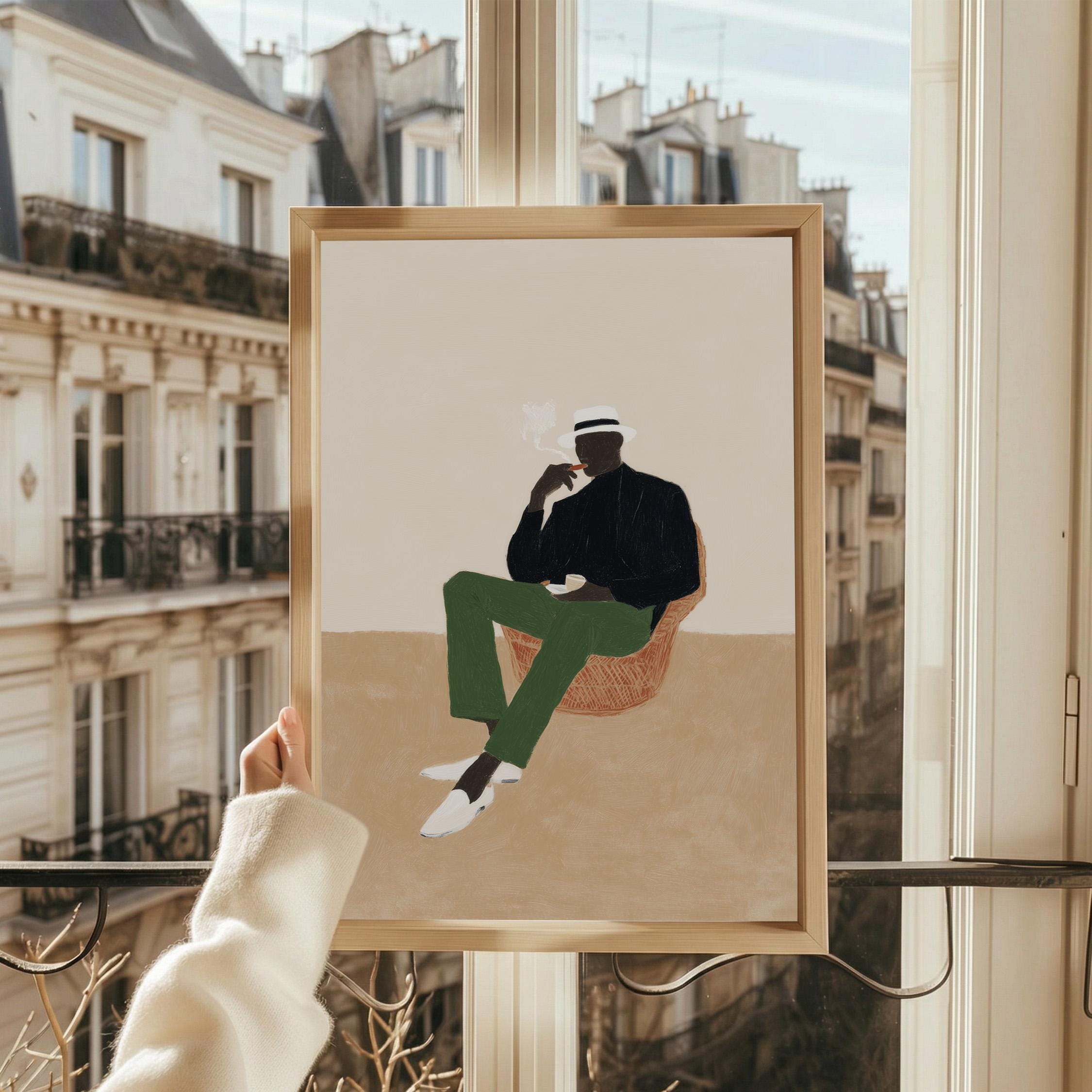 Black man smoking wall art print with neutral tones and a relaxed pose. Works well in a living room, office, or lounge space. It adds a calm, refined and confident feel to the room.