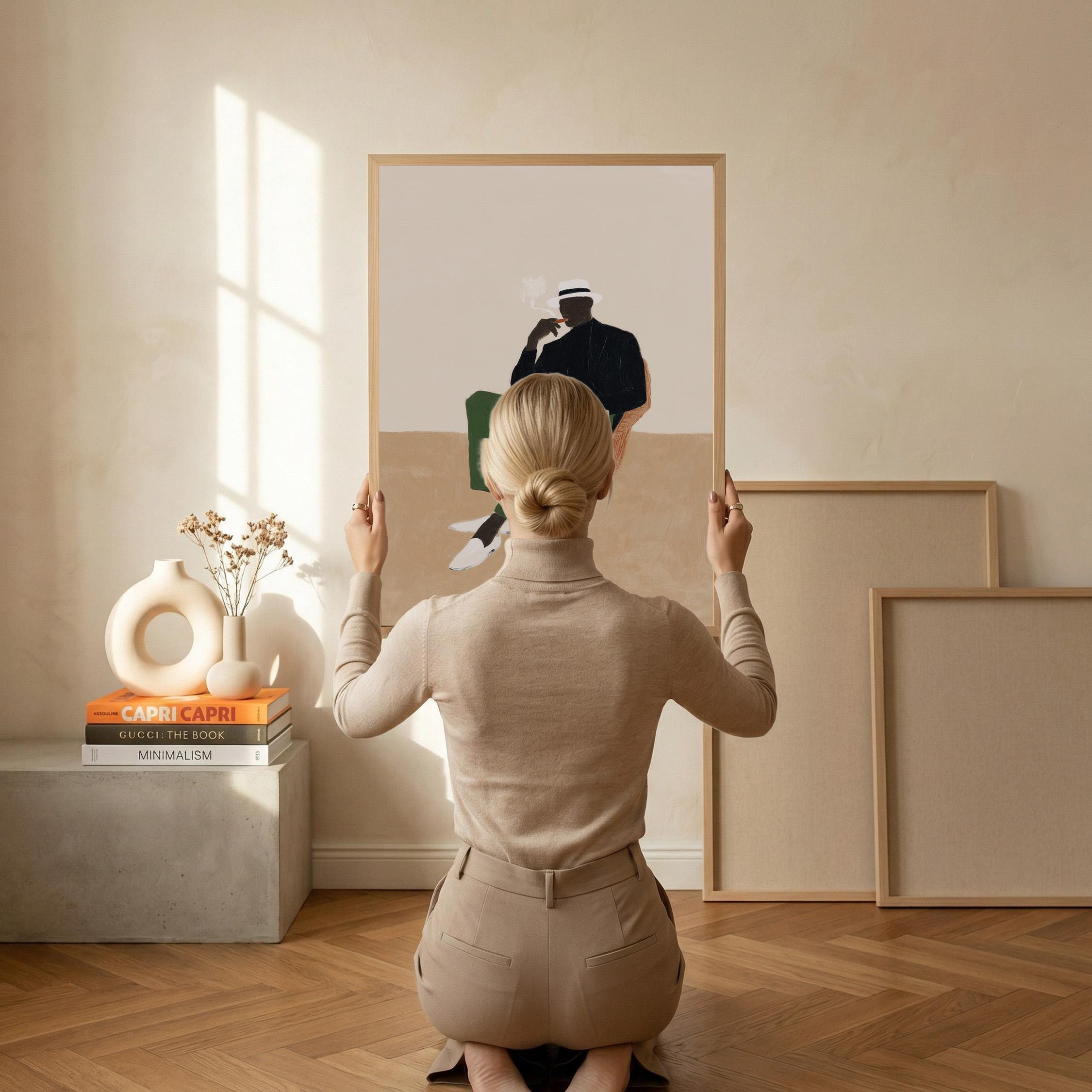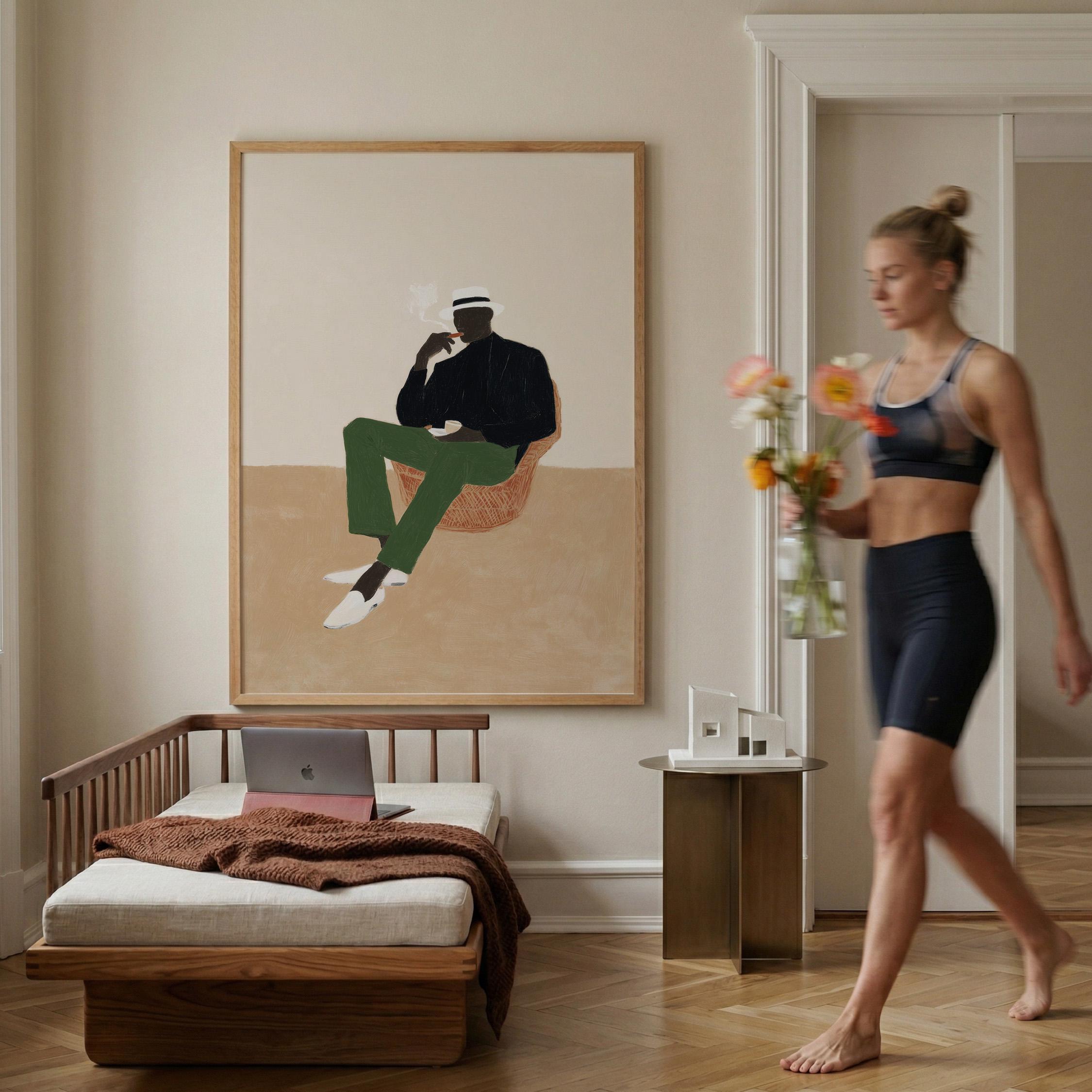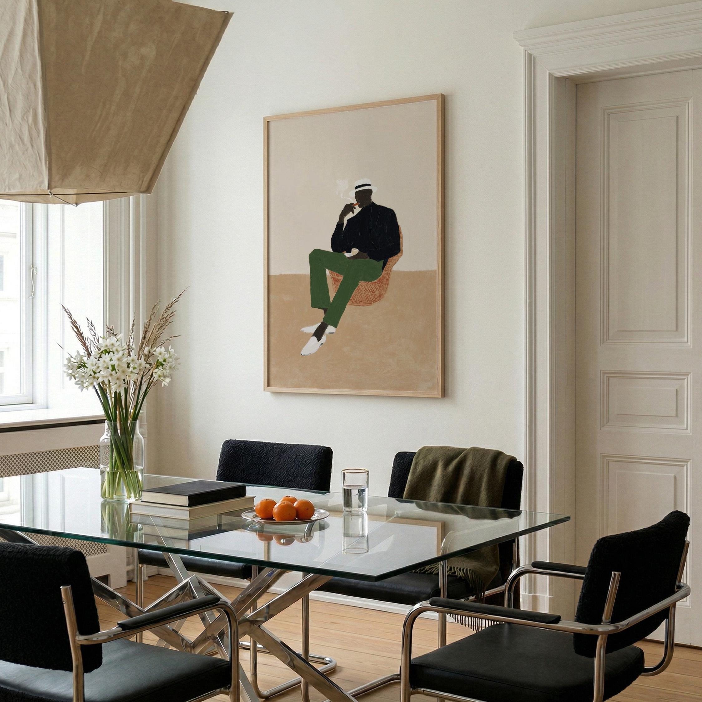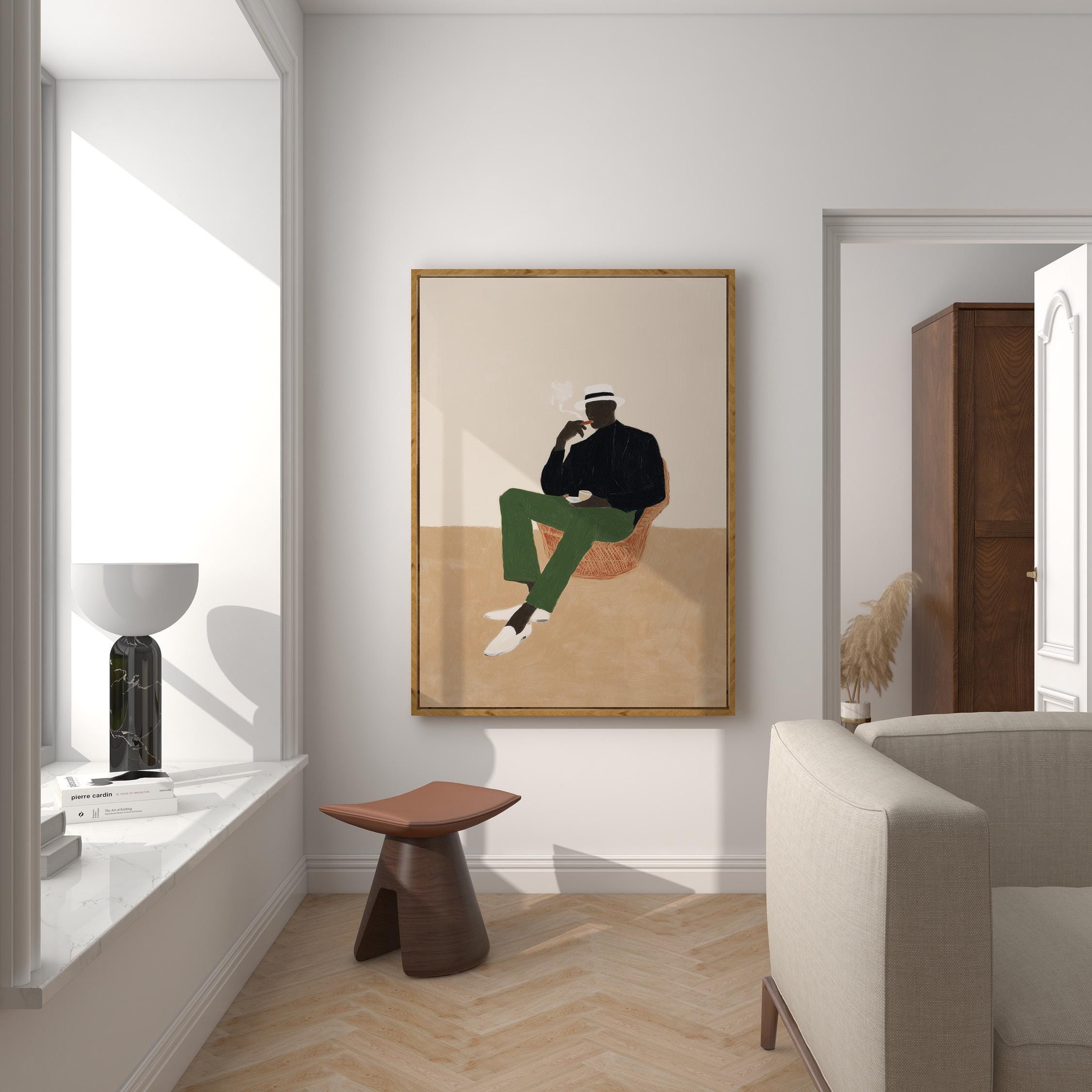 Black man smoking wall art print with neutral tones and a relaxed pose. Works well in a living room, office, or lounge space. It adds a calm, refined and confident feel to the room.