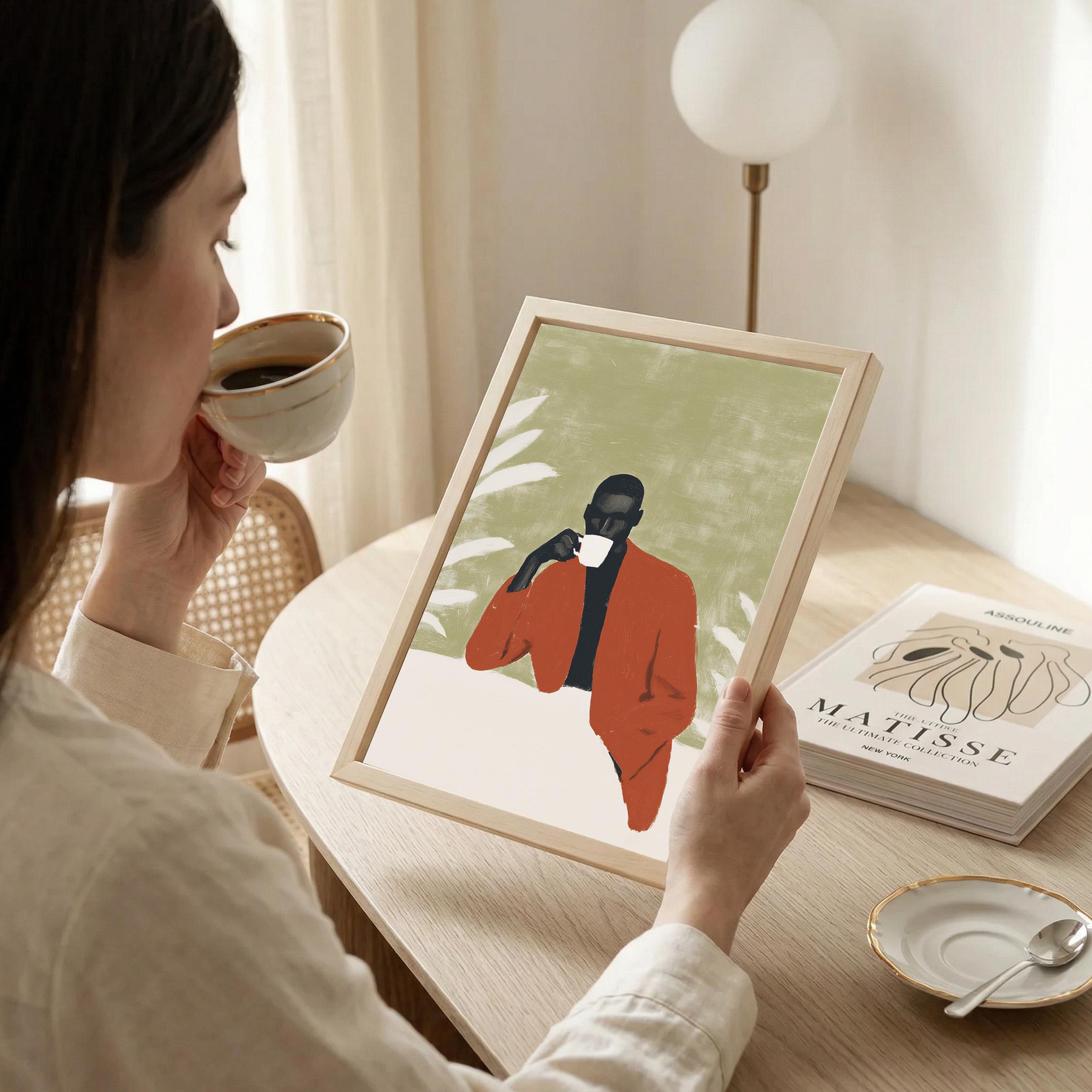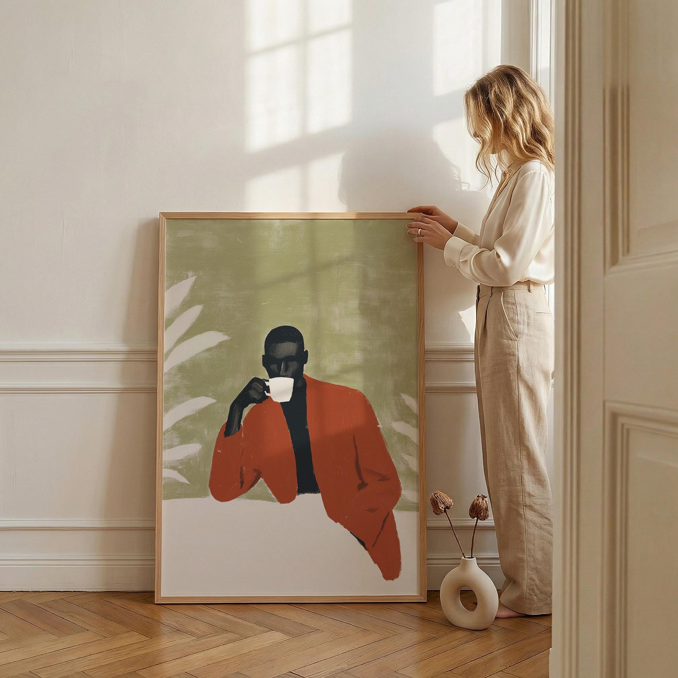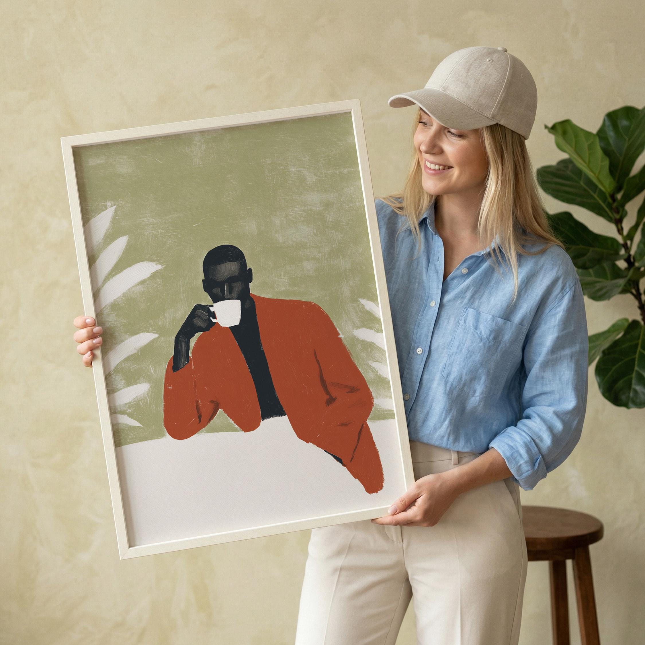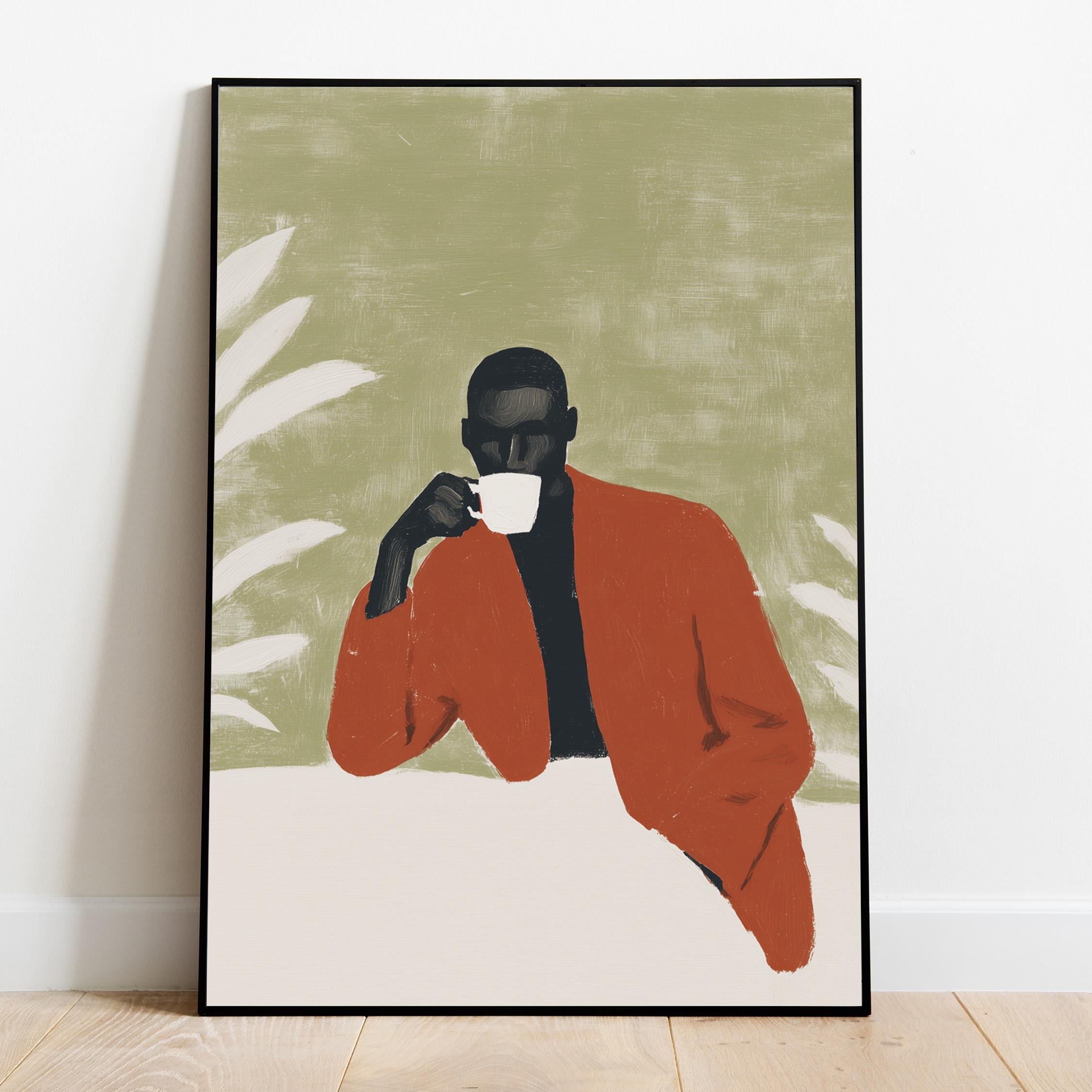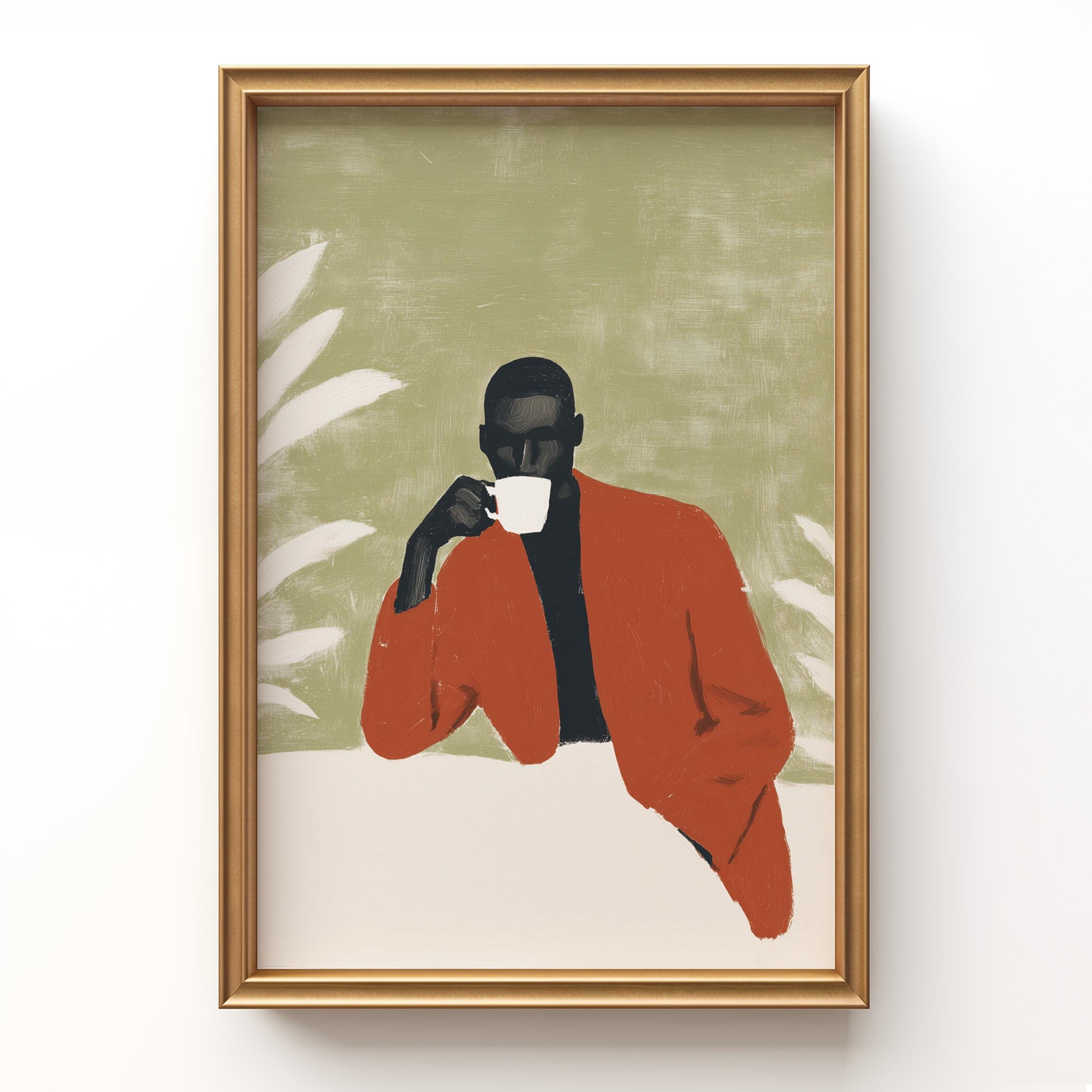 Black man coffee wall art print with bold tones on a sage green background. Fits well in a kitchen, dining room, or modern living space. It brings a warm, relaxed and stylish feel to the room.