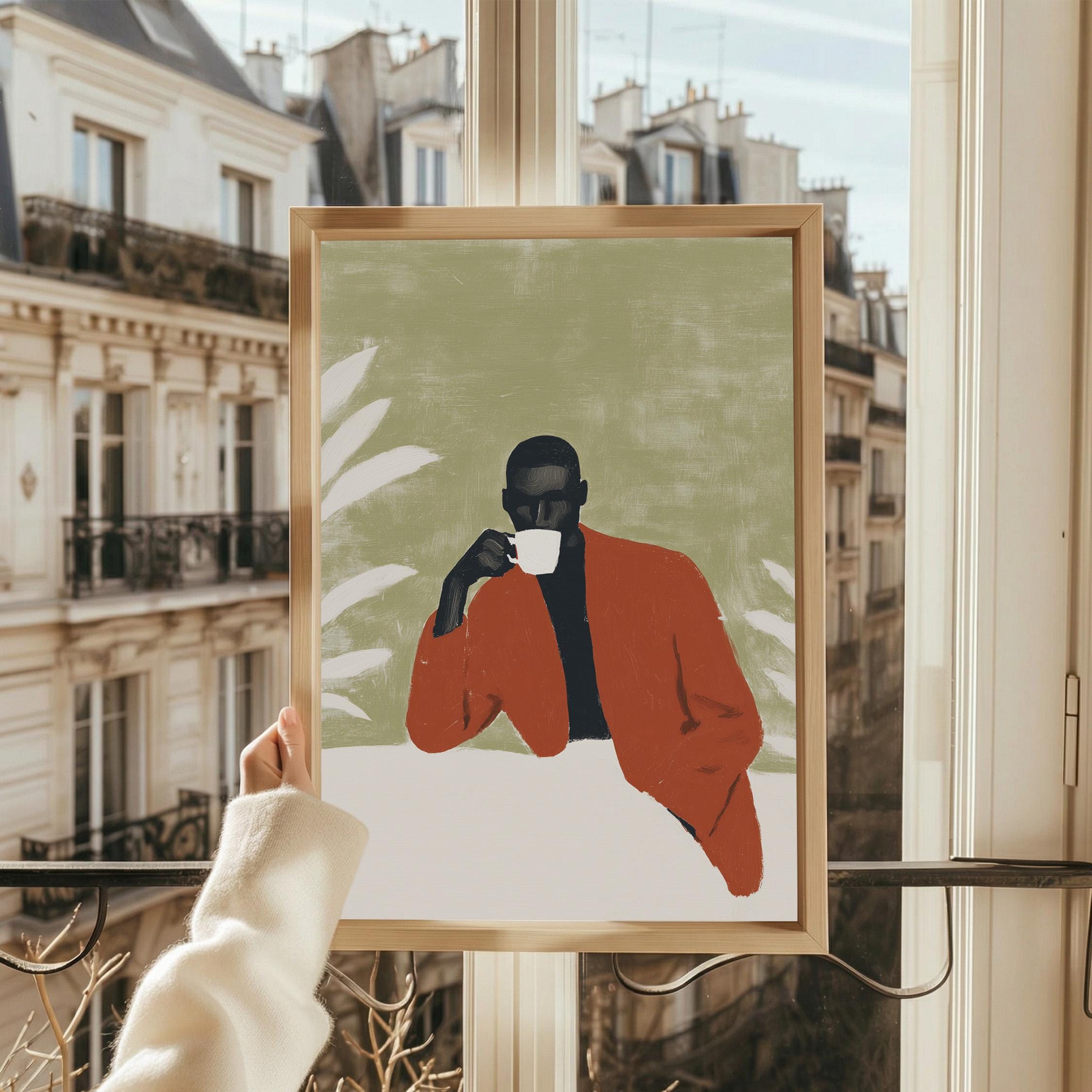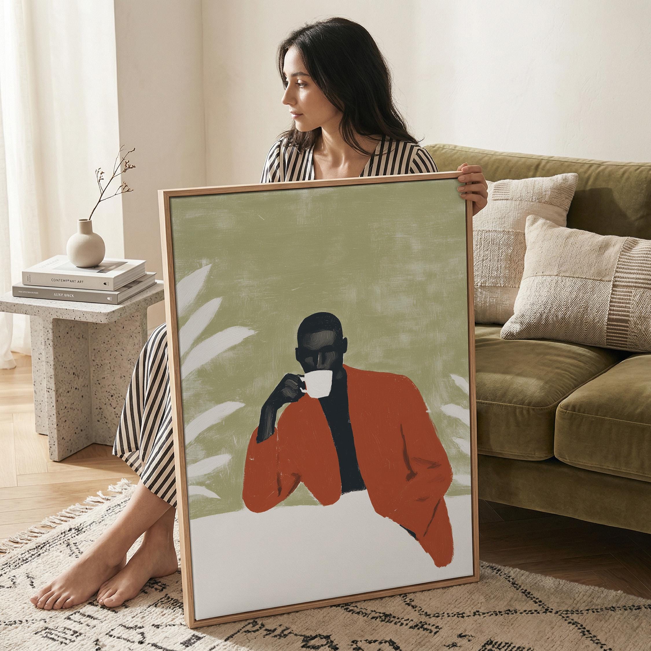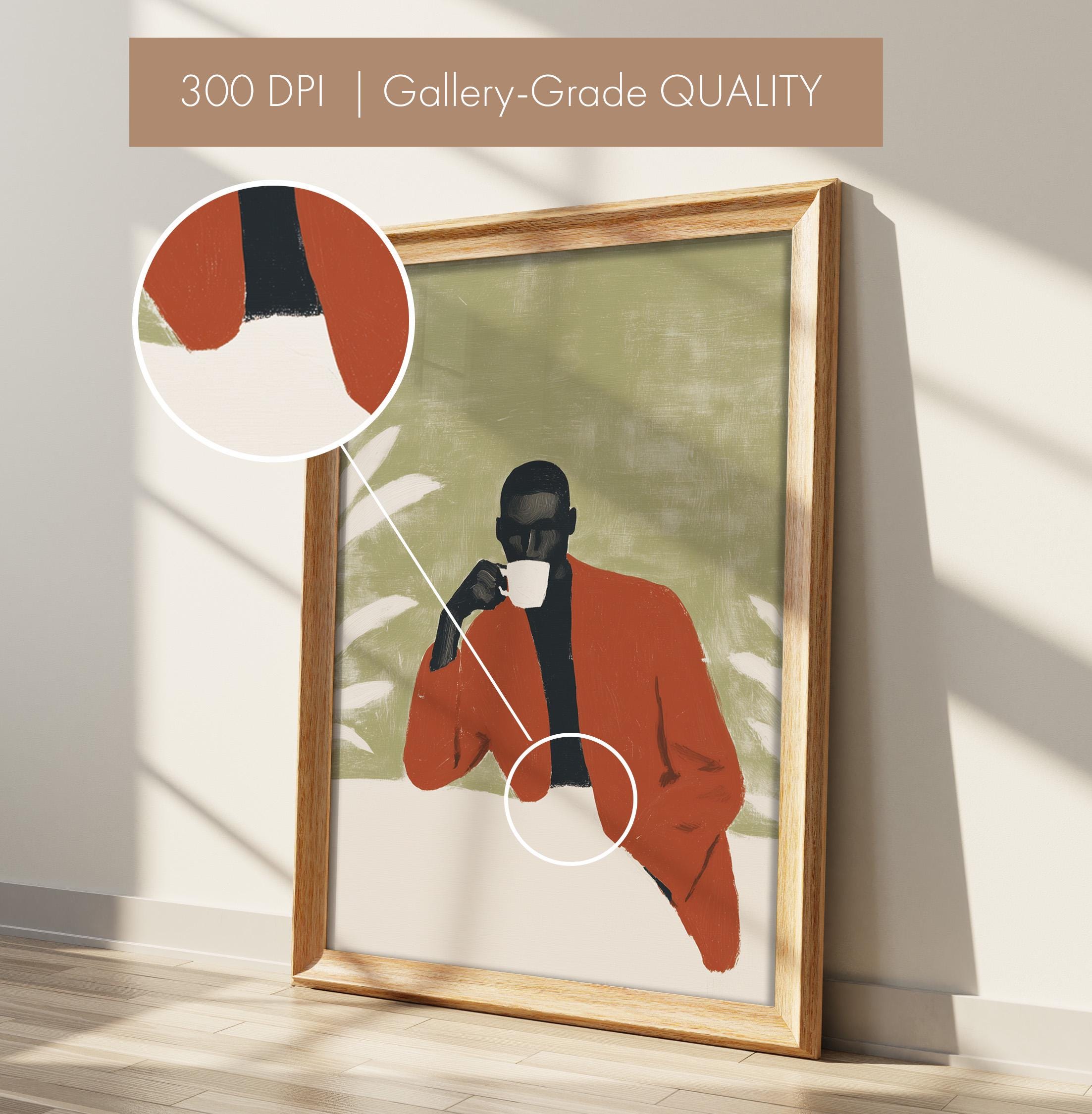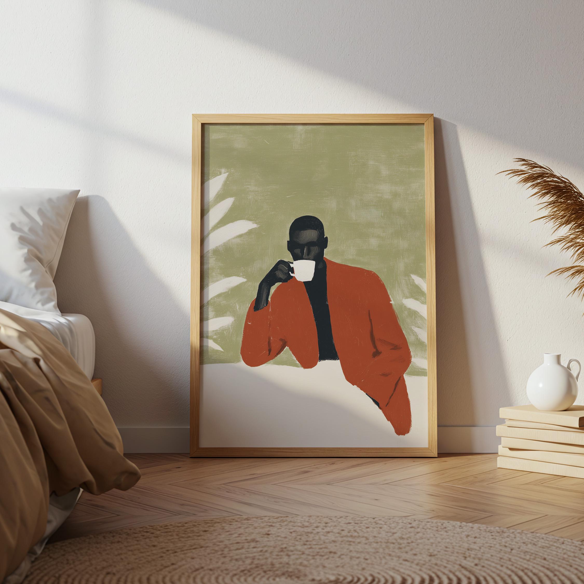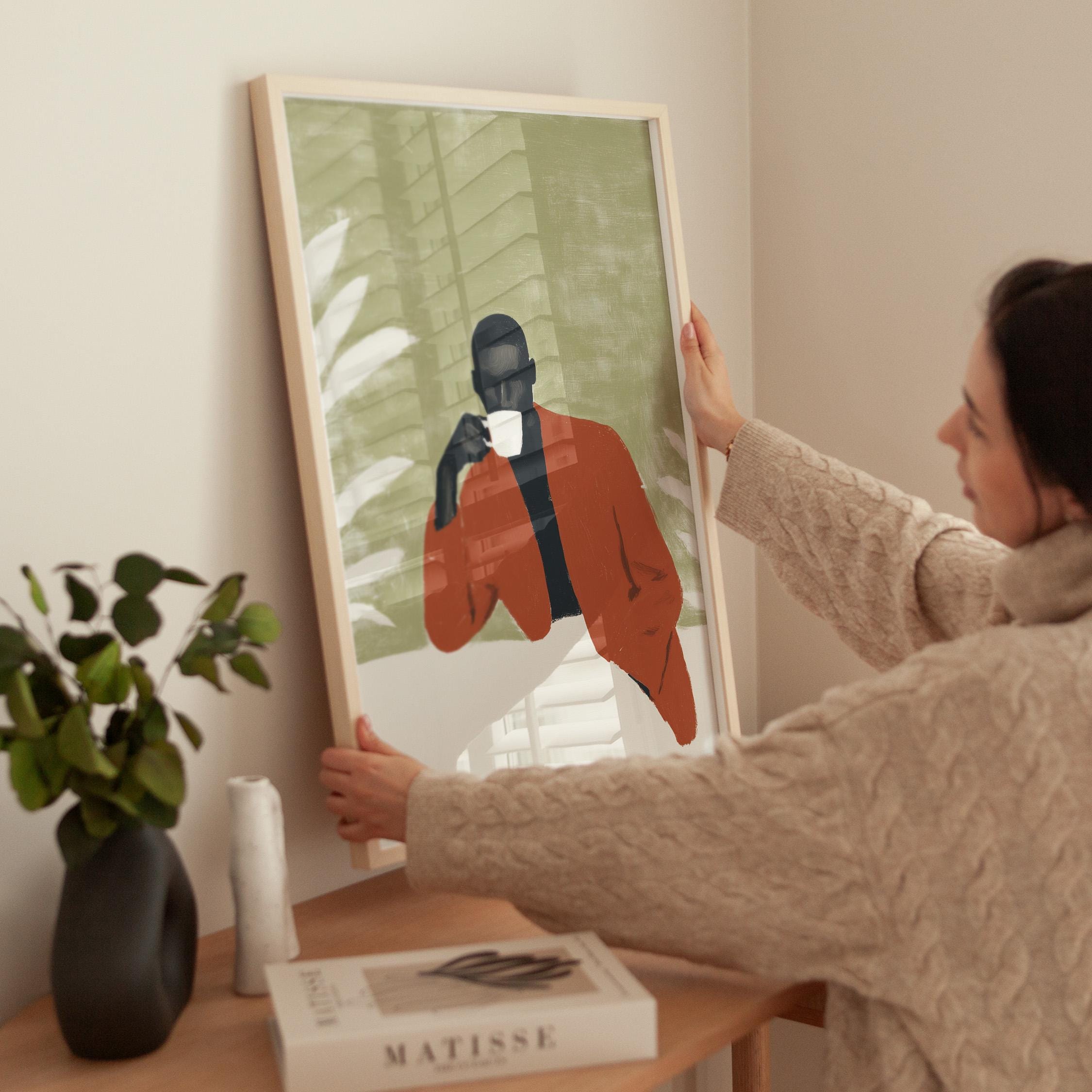 Black man coffee wall art print with bold tones on a sage green background. Fits well in a kitchen, dining room, or modern living space. It brings a warm, relaxed and stylish feel to the room.