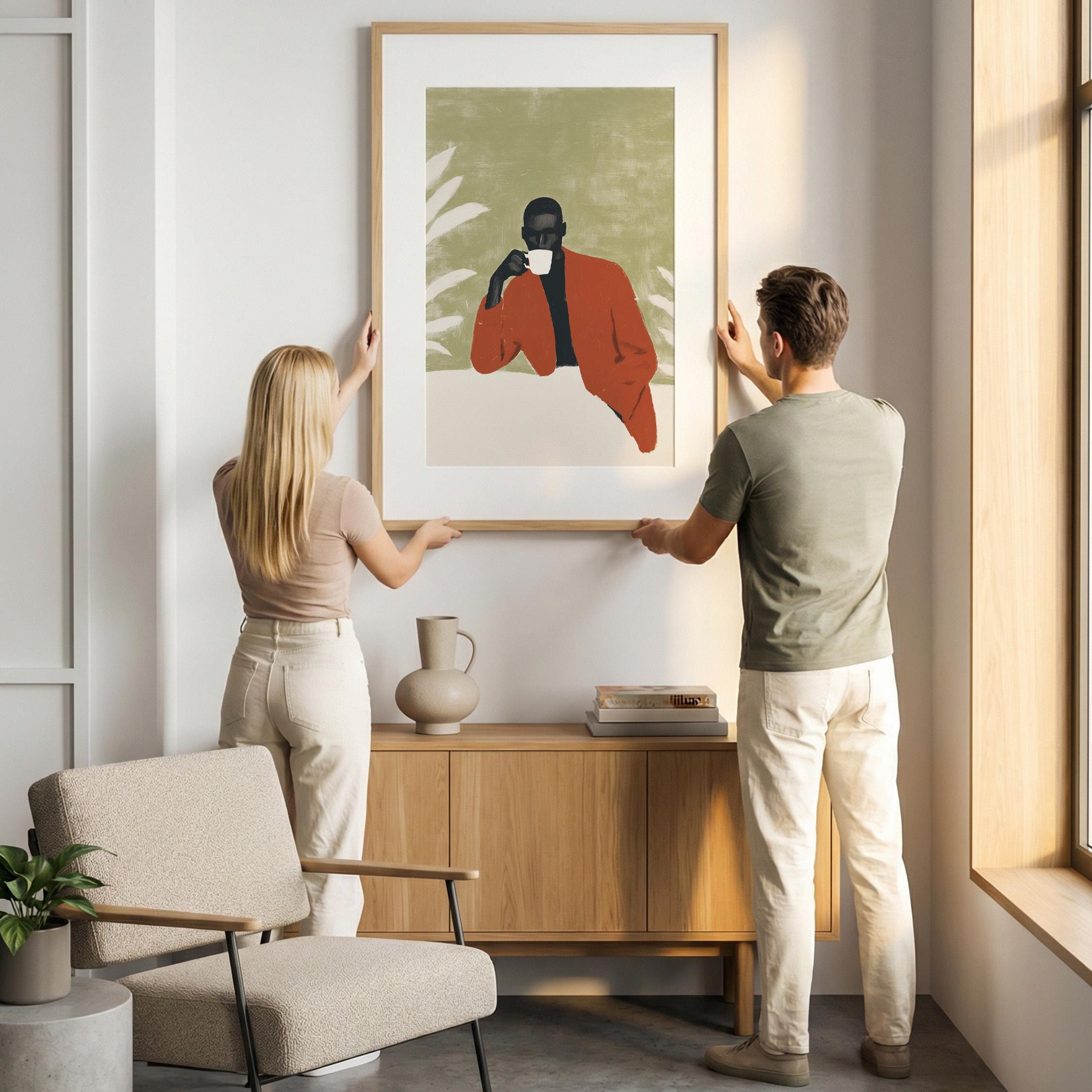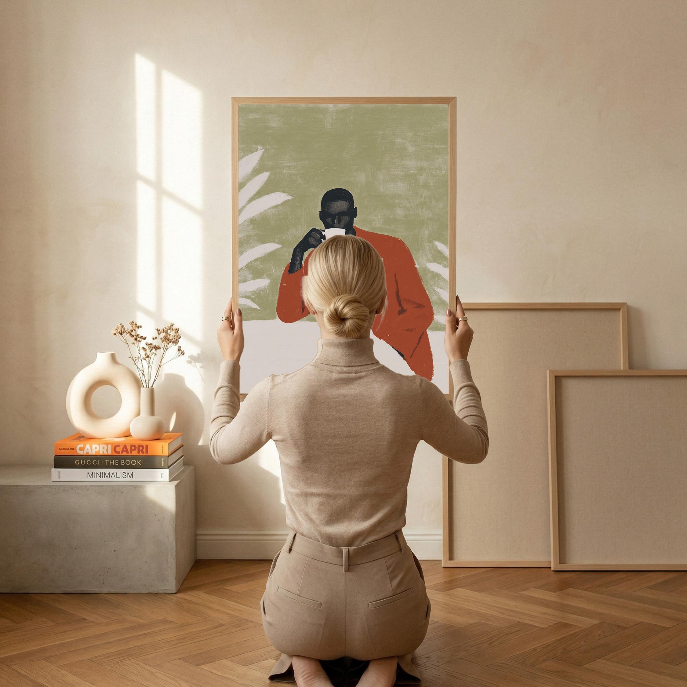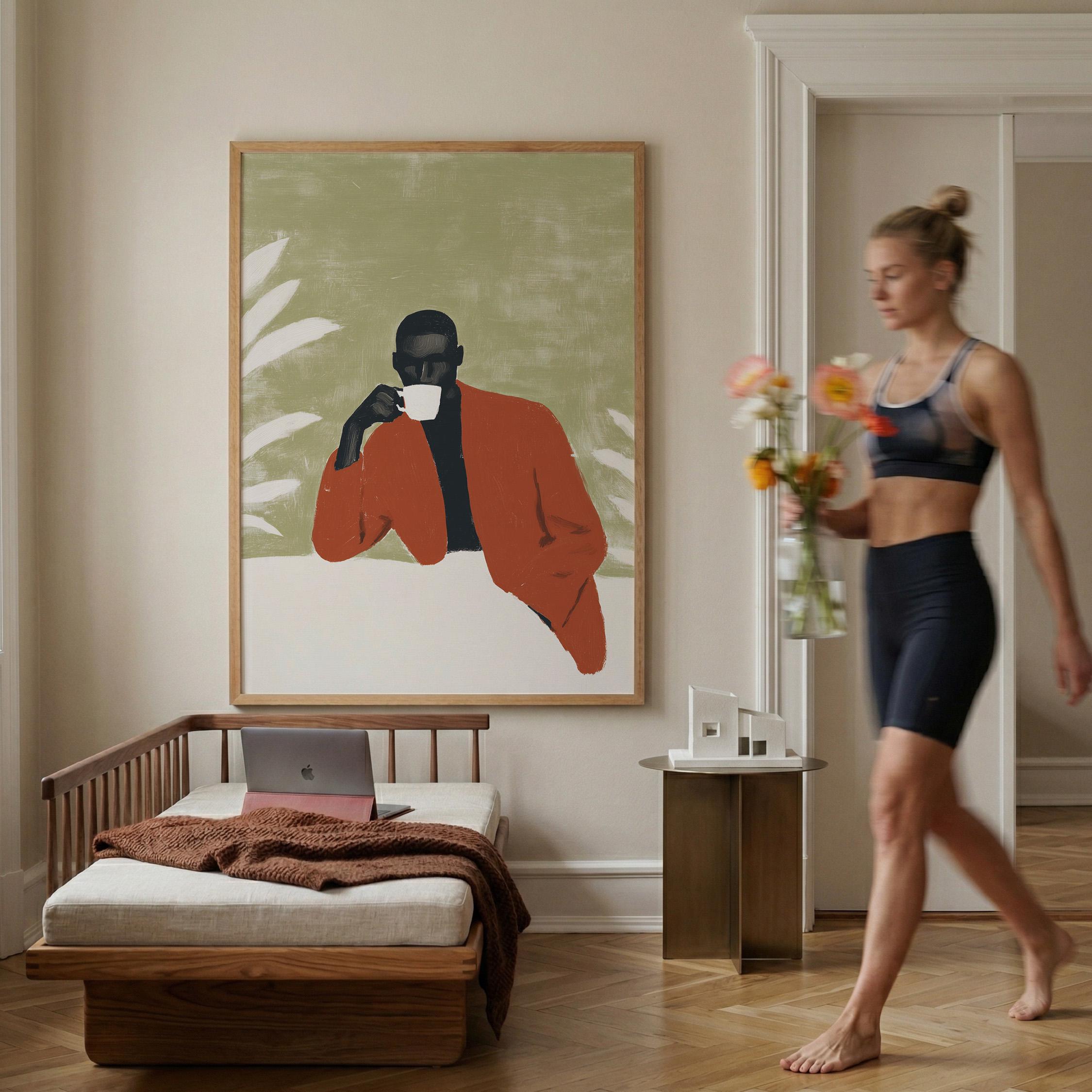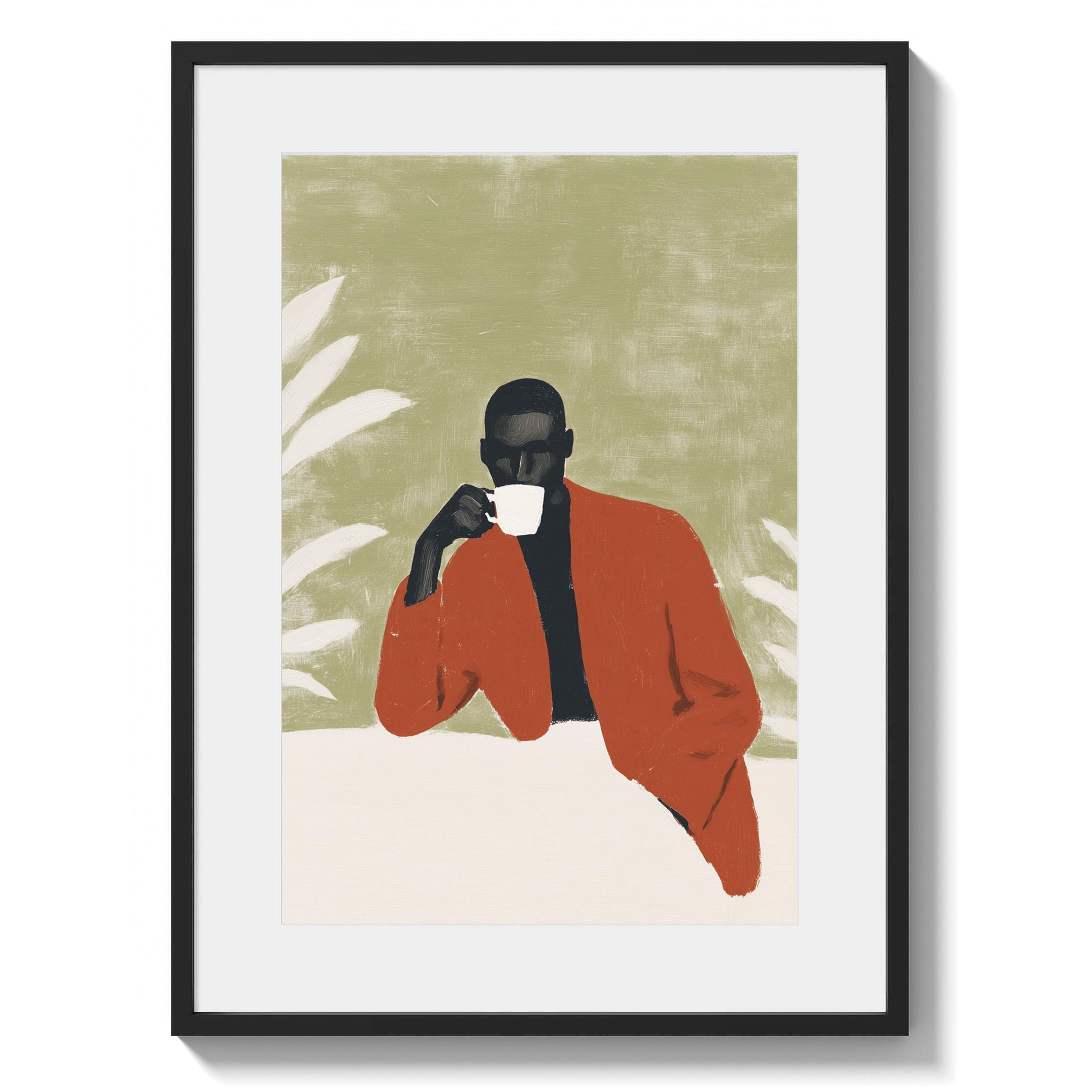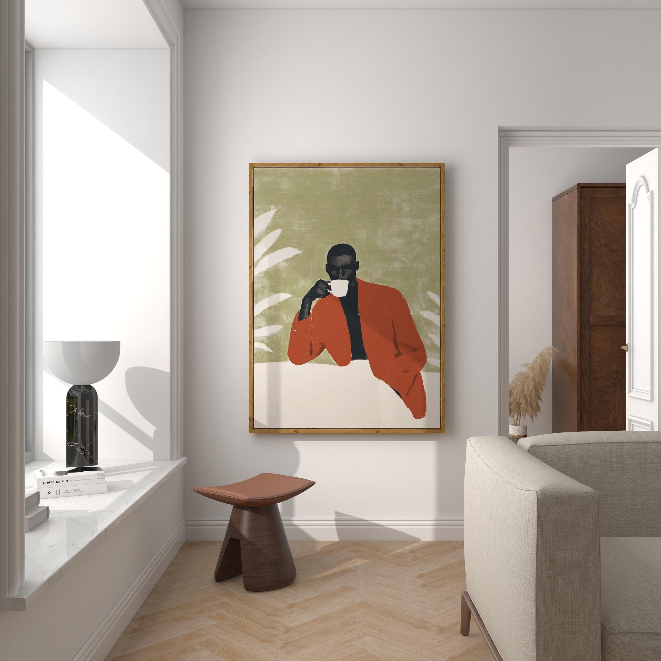 Black man coffee wall art print with bold tones on a sage green background. Fits well in a kitchen, dining room, or modern living space. It brings a warm, relaxed and stylish feel to the room.