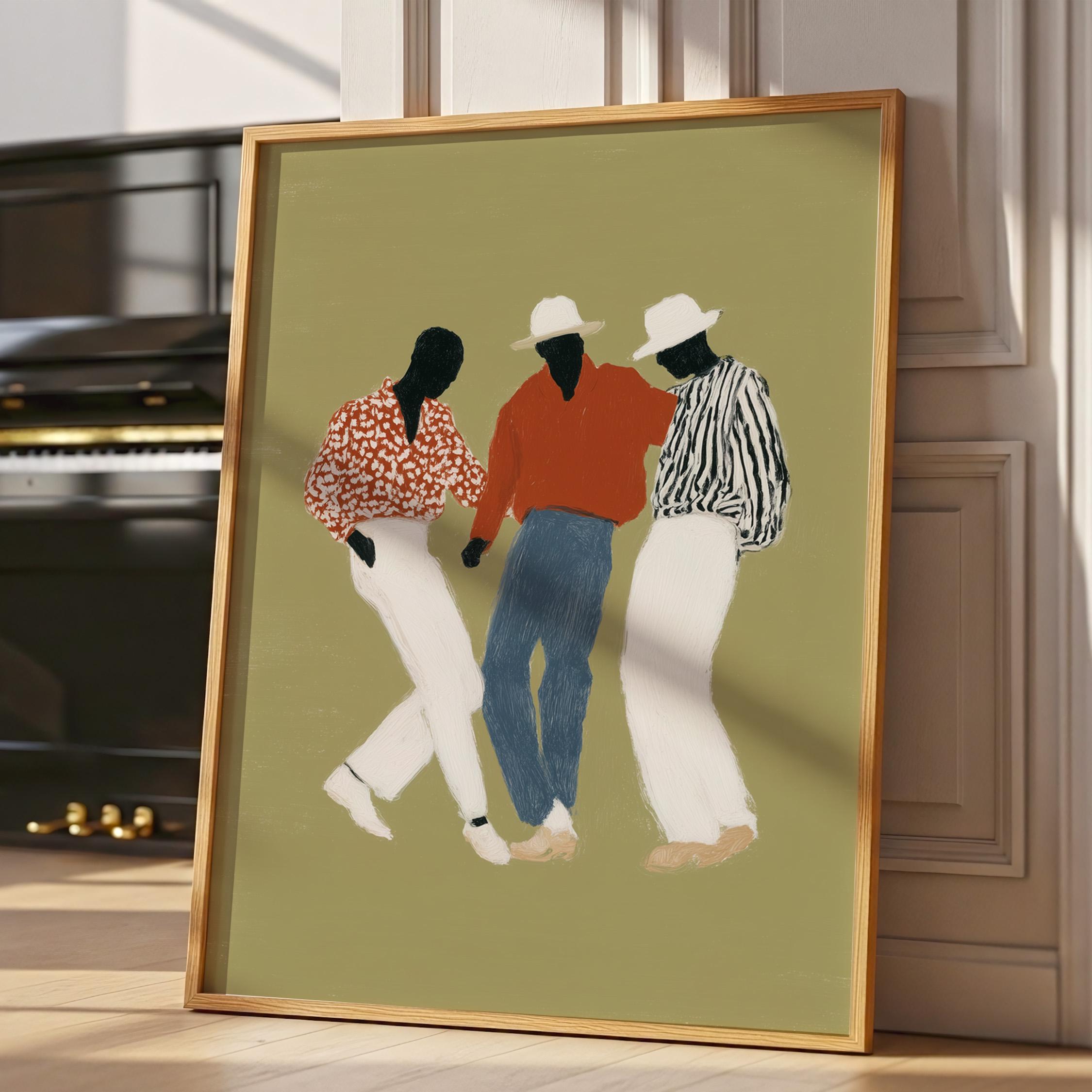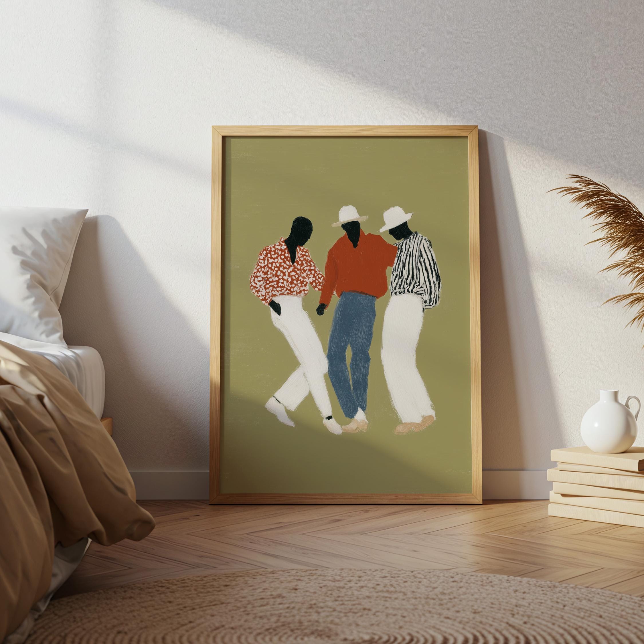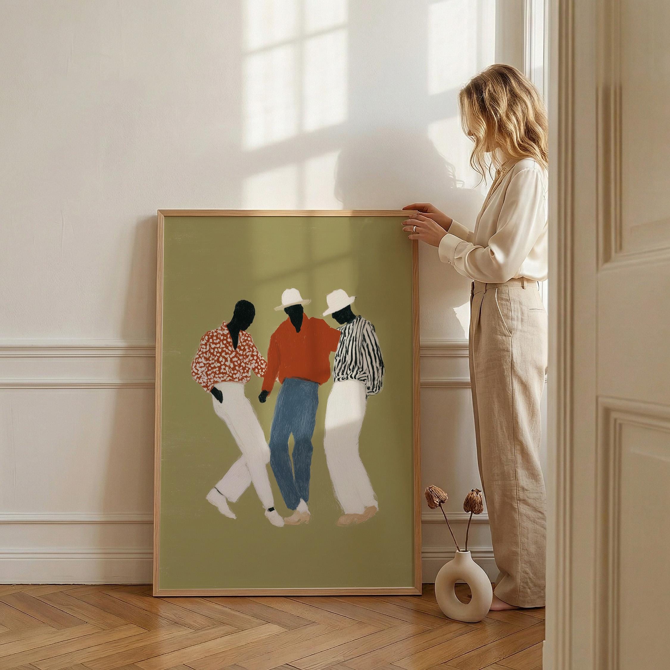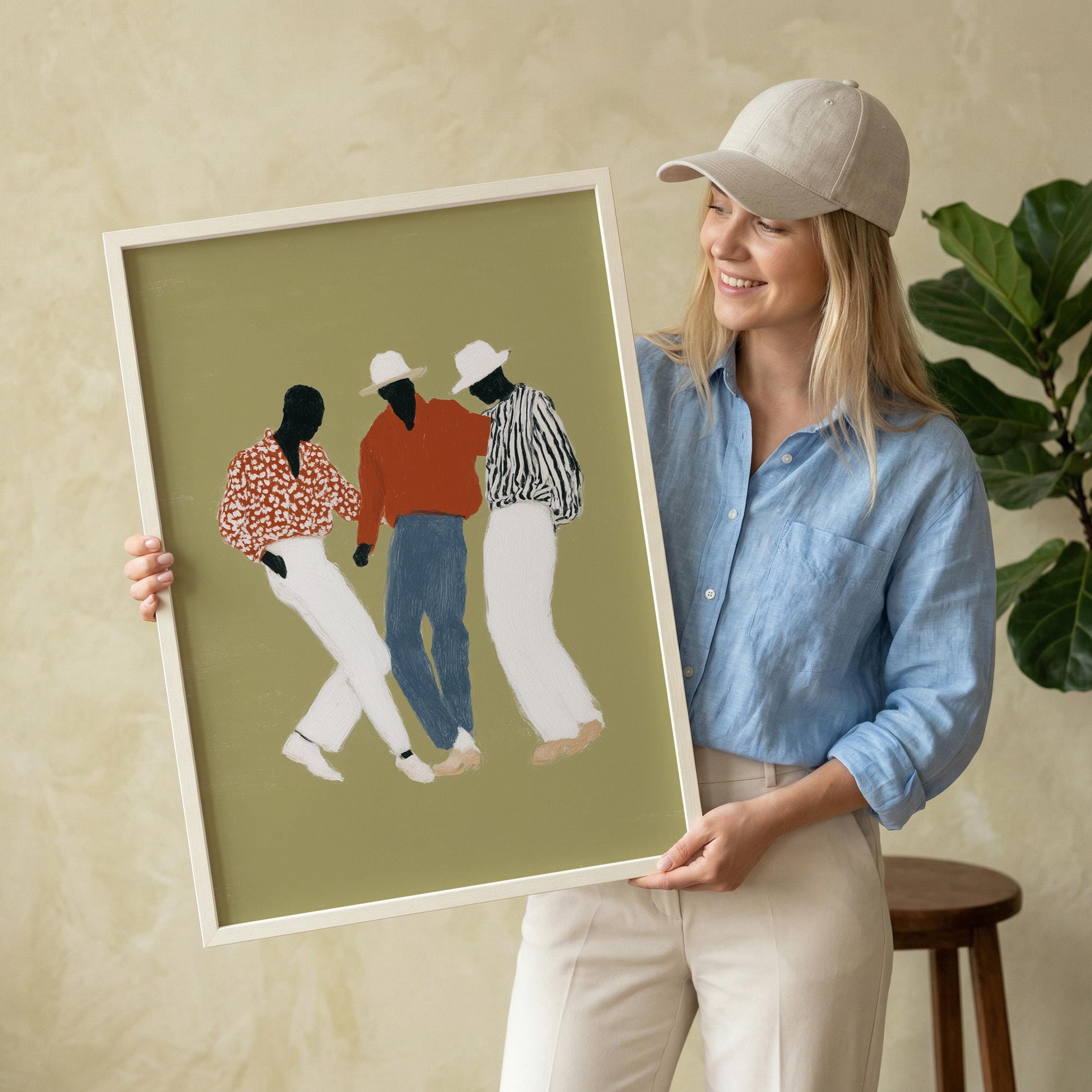 Black men dancing wall art print with bold outfits on a sage green background. Works well in a living room, hallway, or creative space. It adds movement, rhythm and a strong visual presence to the room.