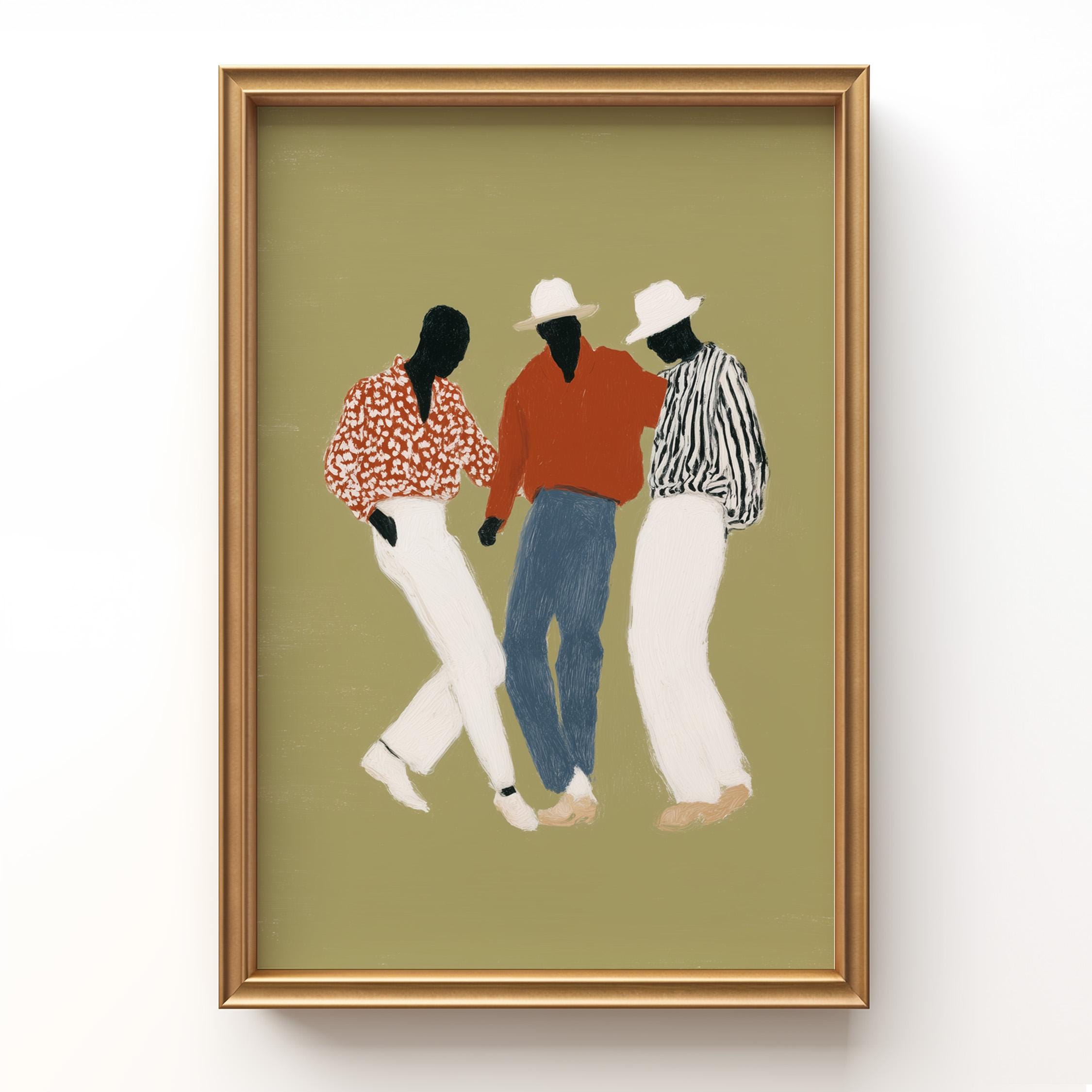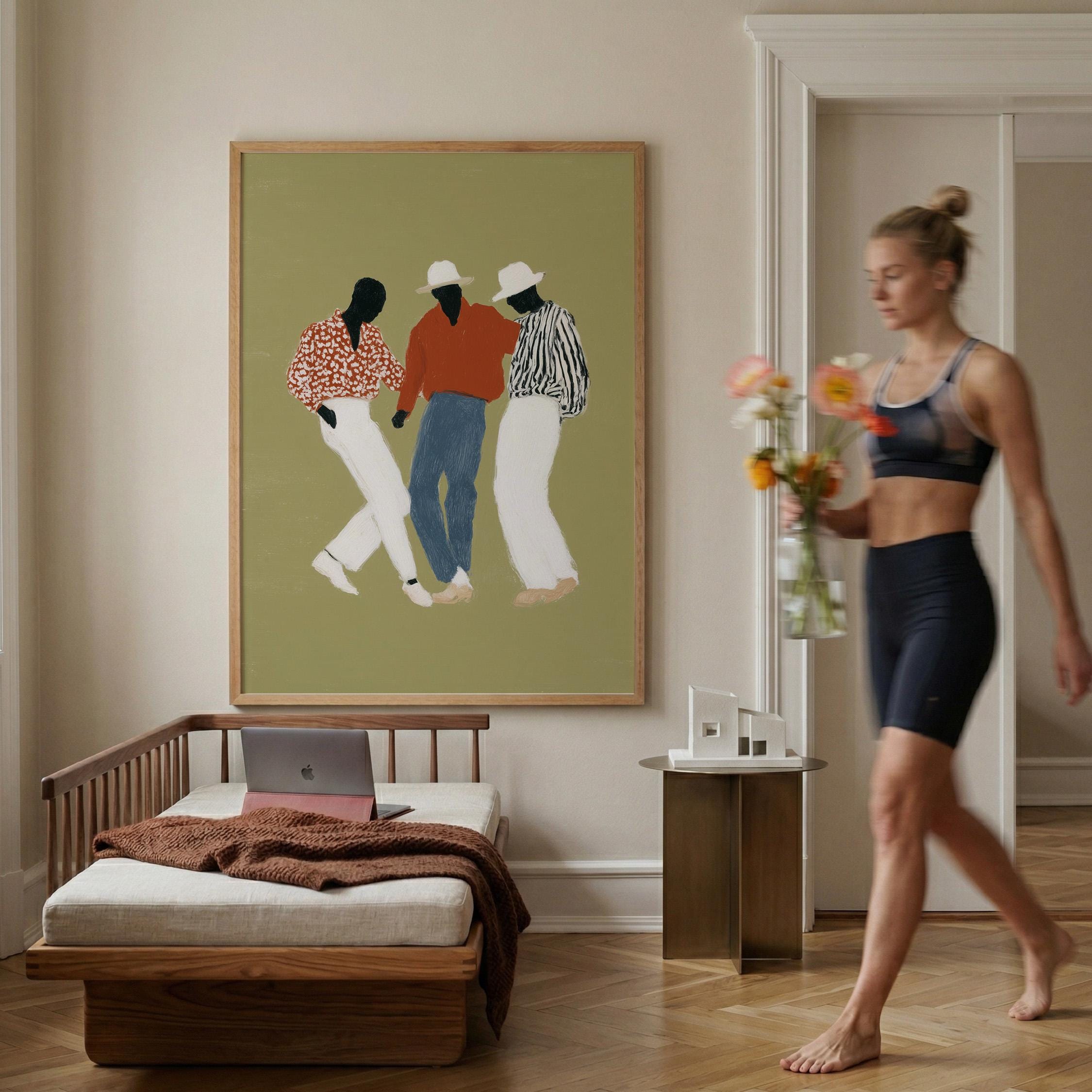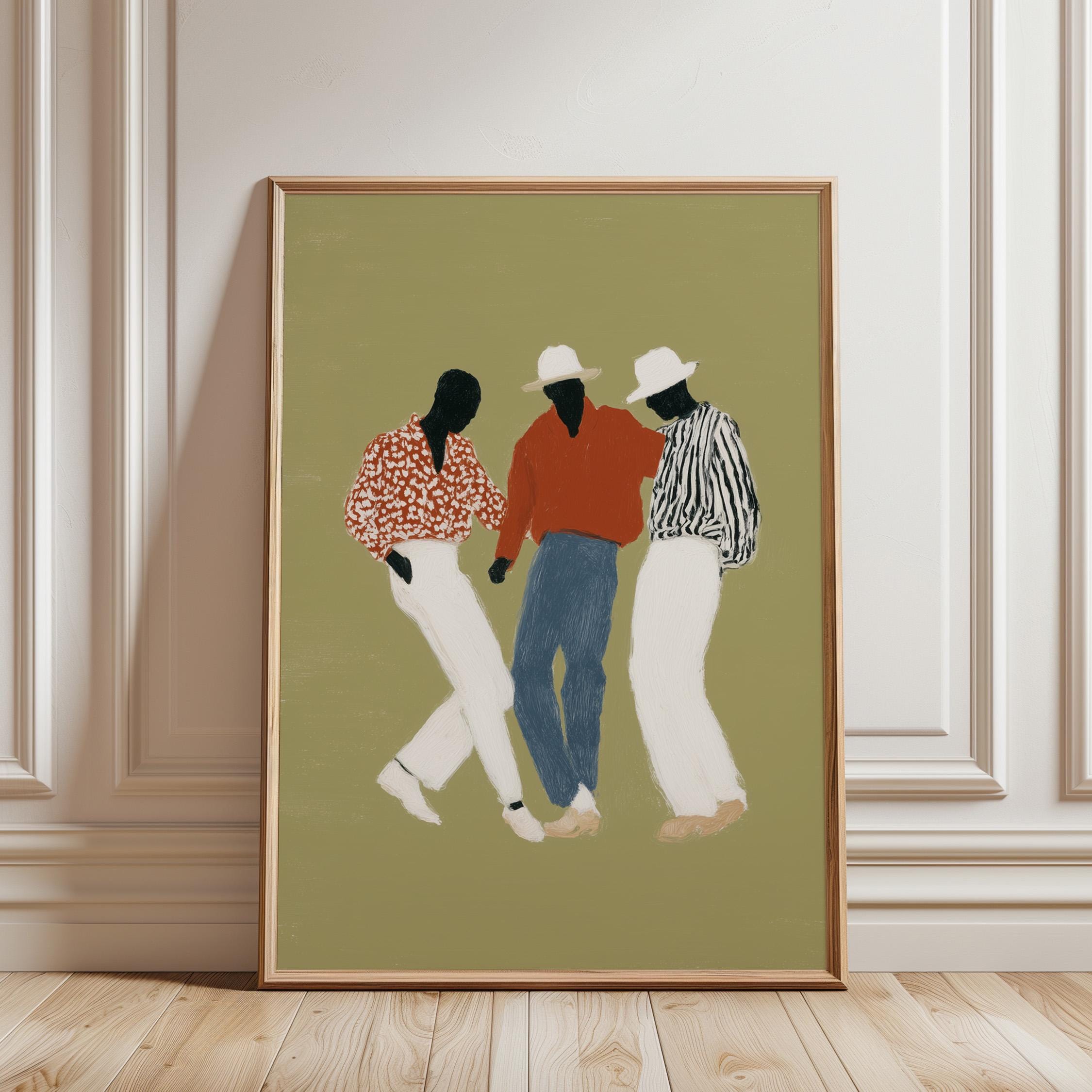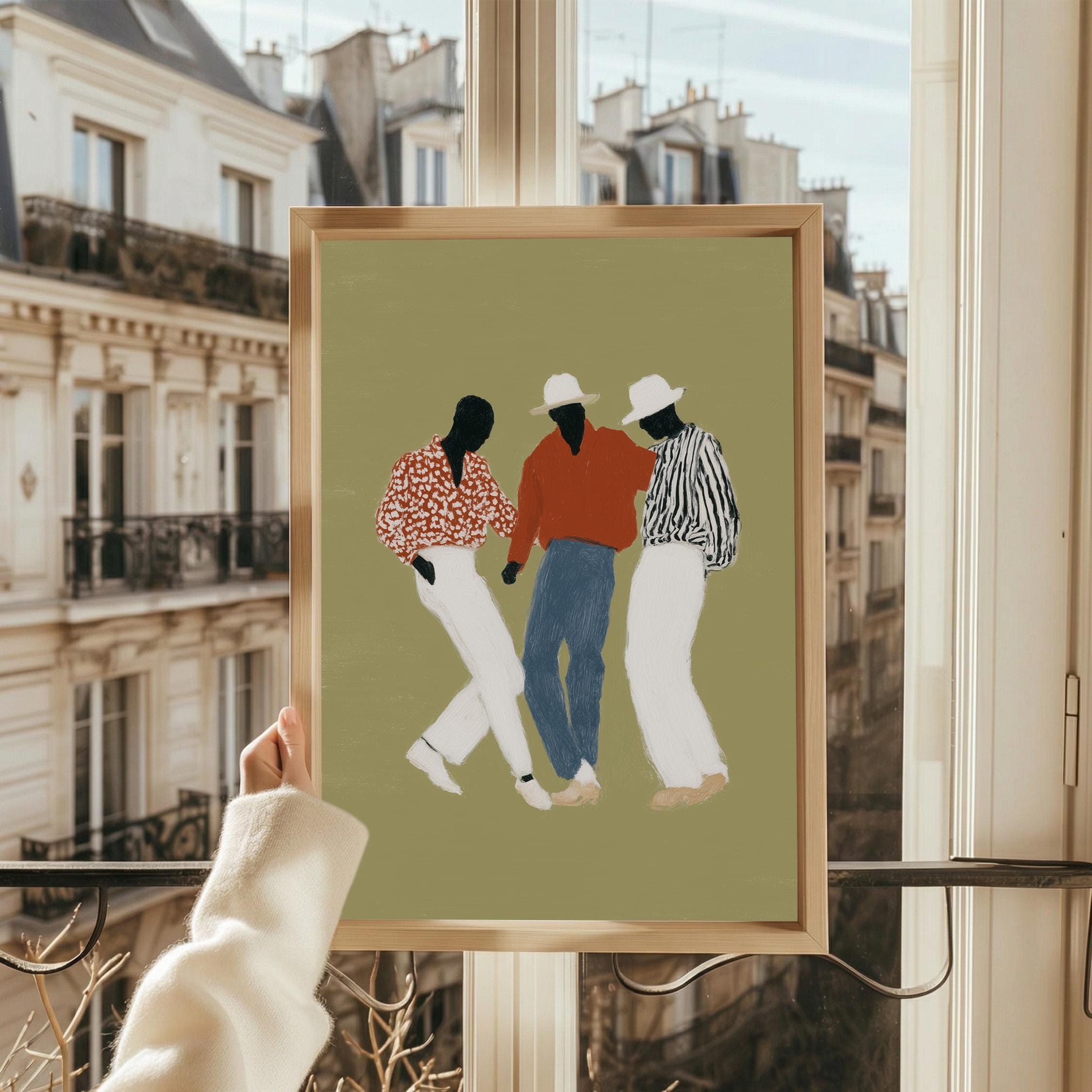 Black men dancing wall art print with bold outfits on a sage green background. Works well in a living room, hallway, or creative space. It adds movement, rhythm and a strong visual presence to the room.