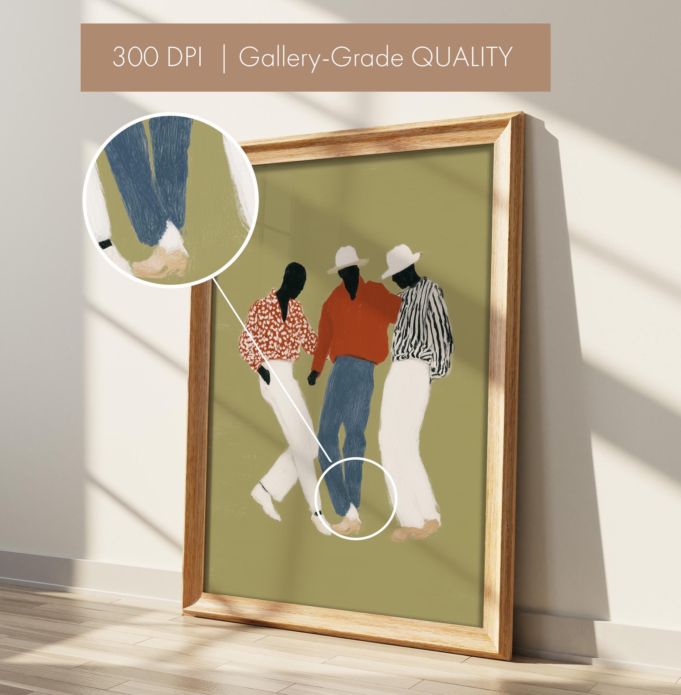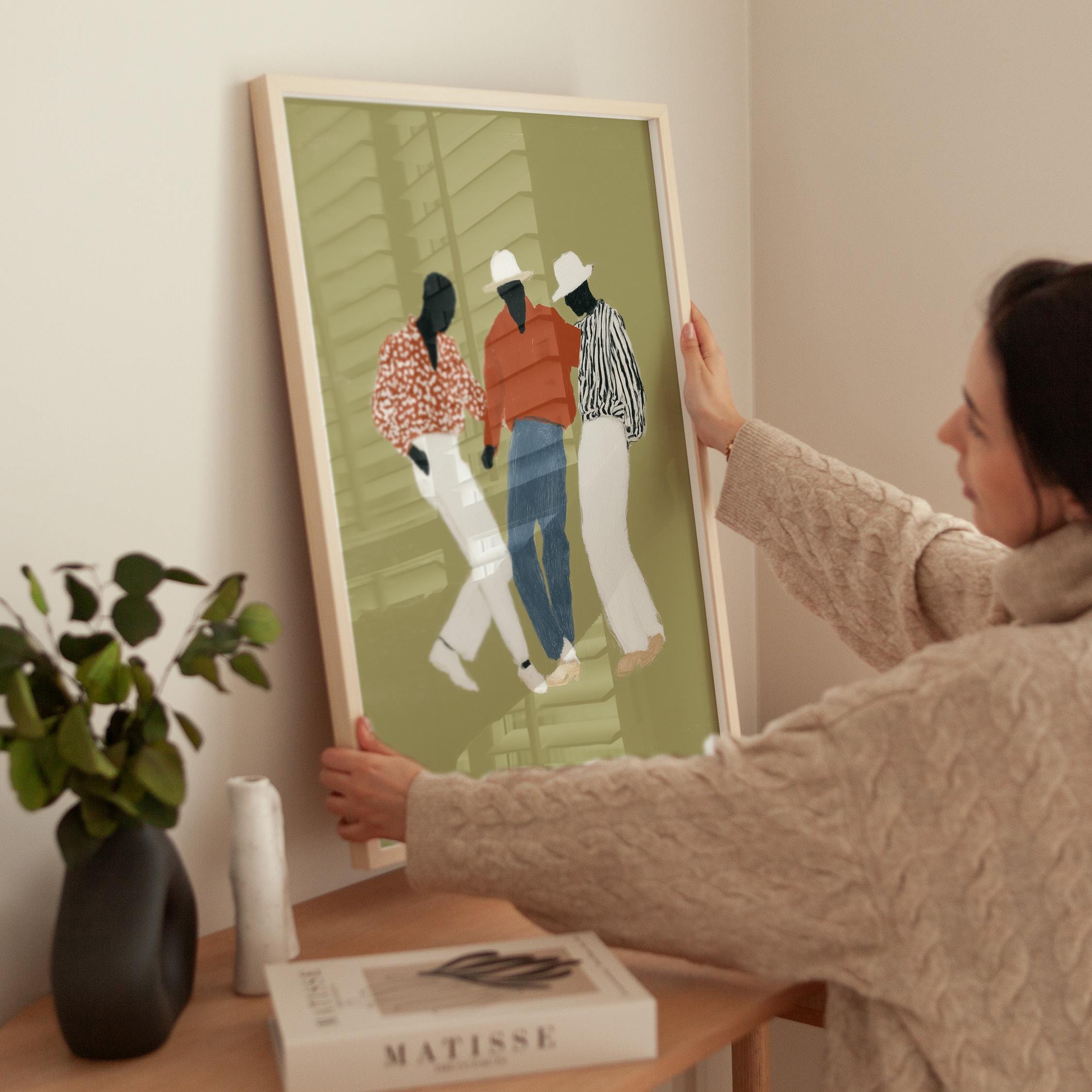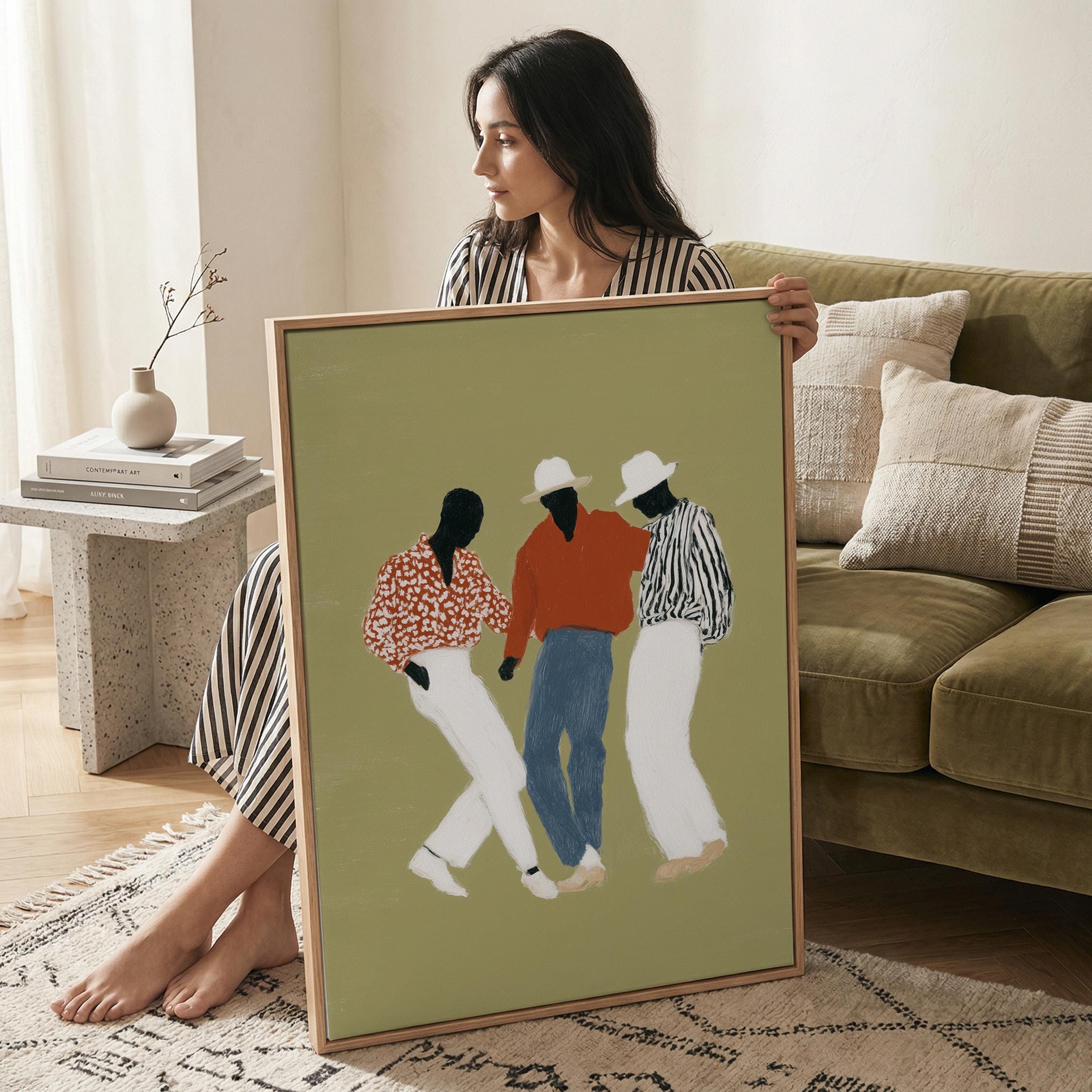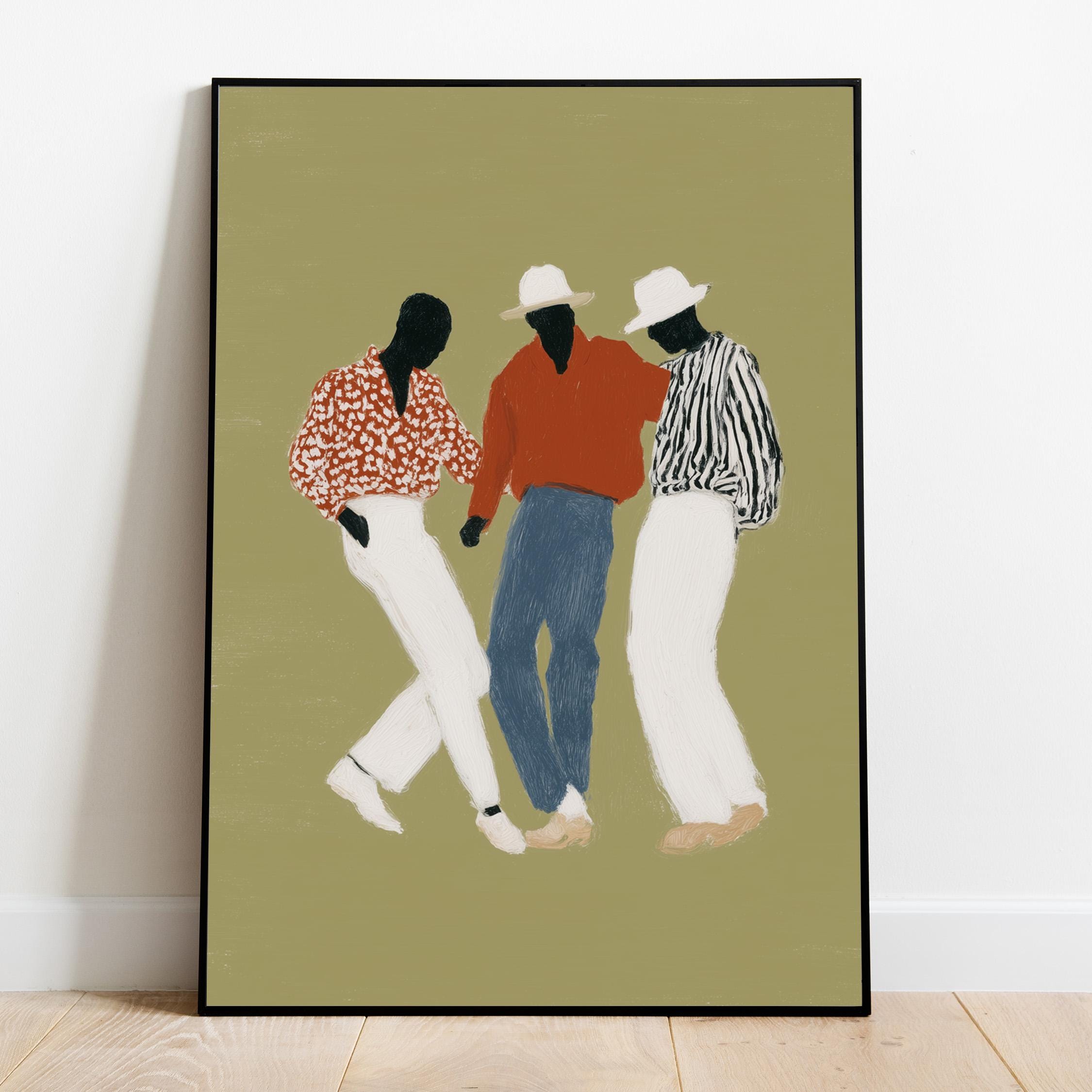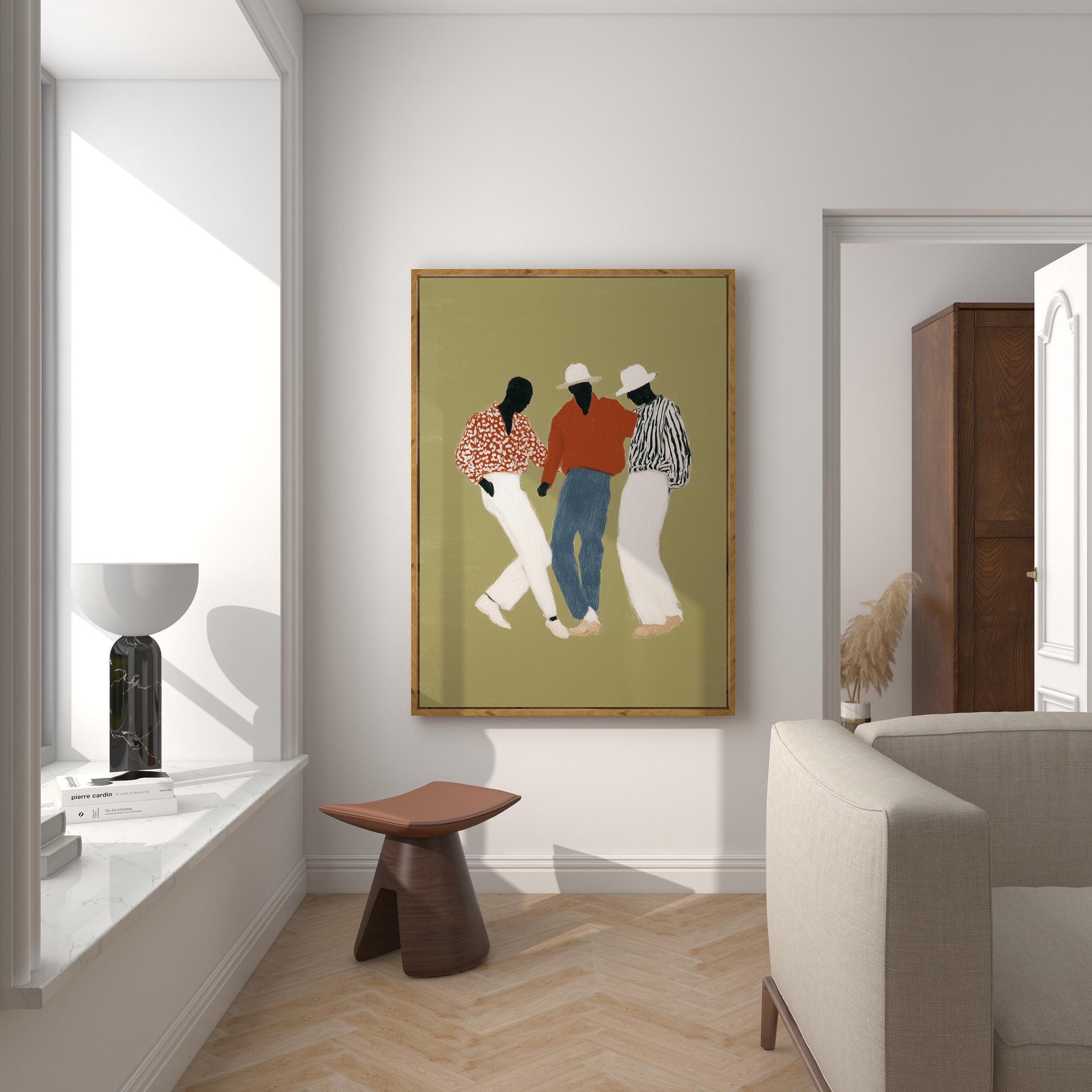 Black men dancing wall art print with bold outfits on a sage green background. Works well in a living room, hallway, or creative space. It adds movement, rhythm and a strong visual presence to the room.