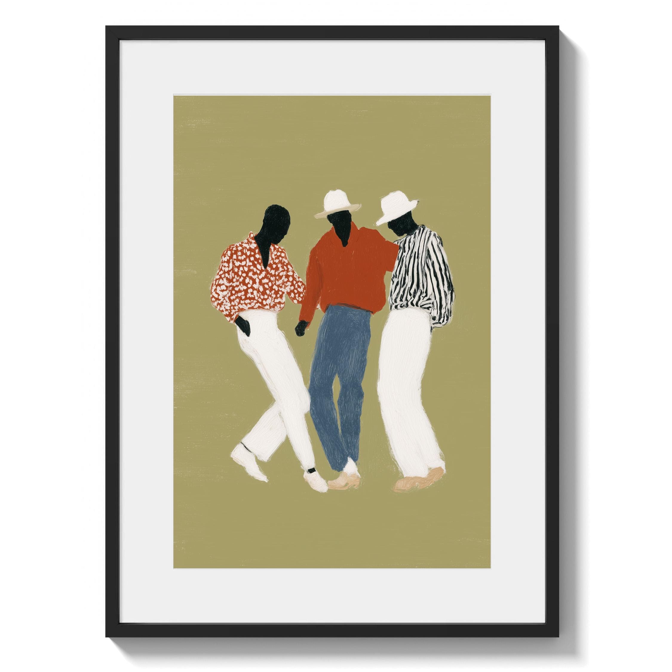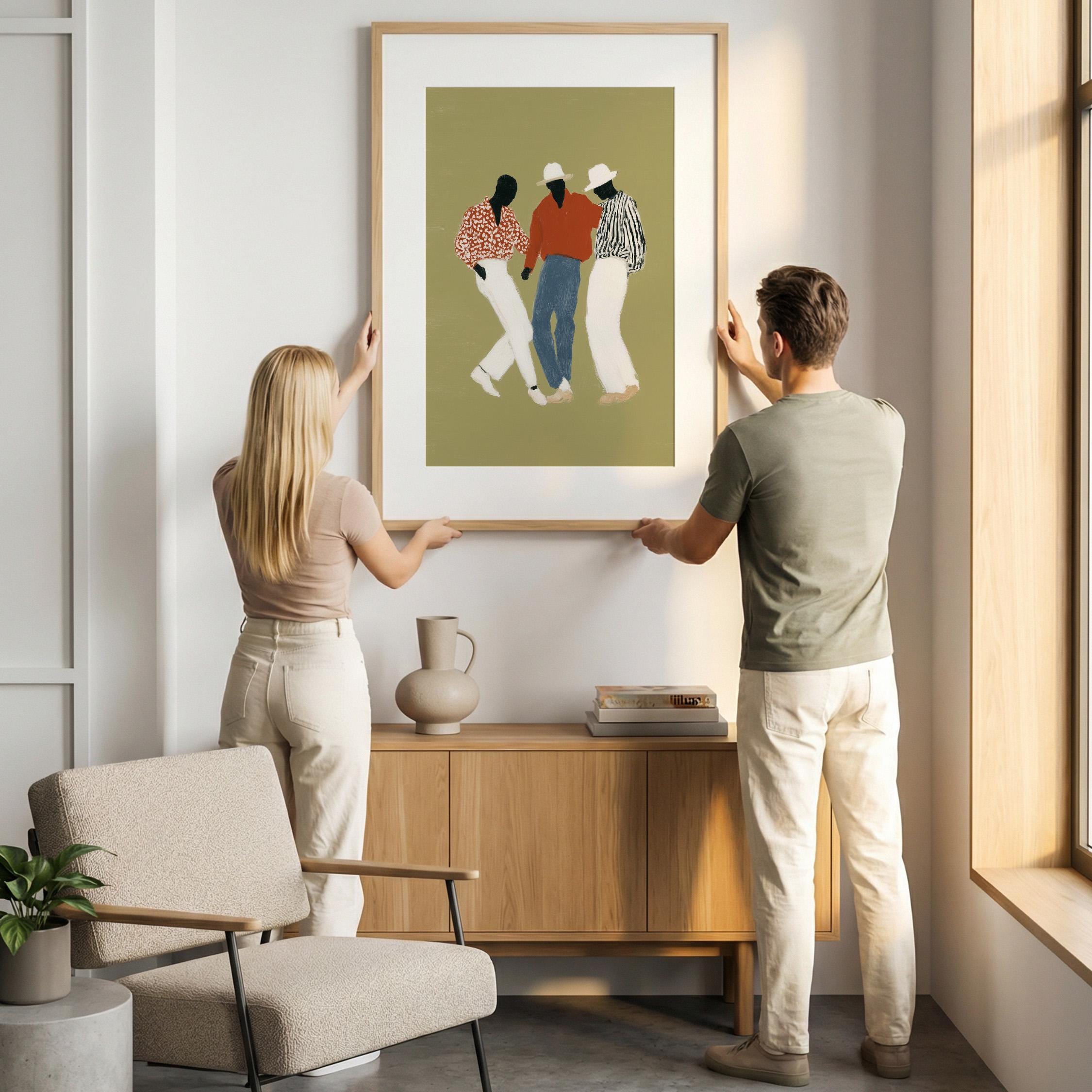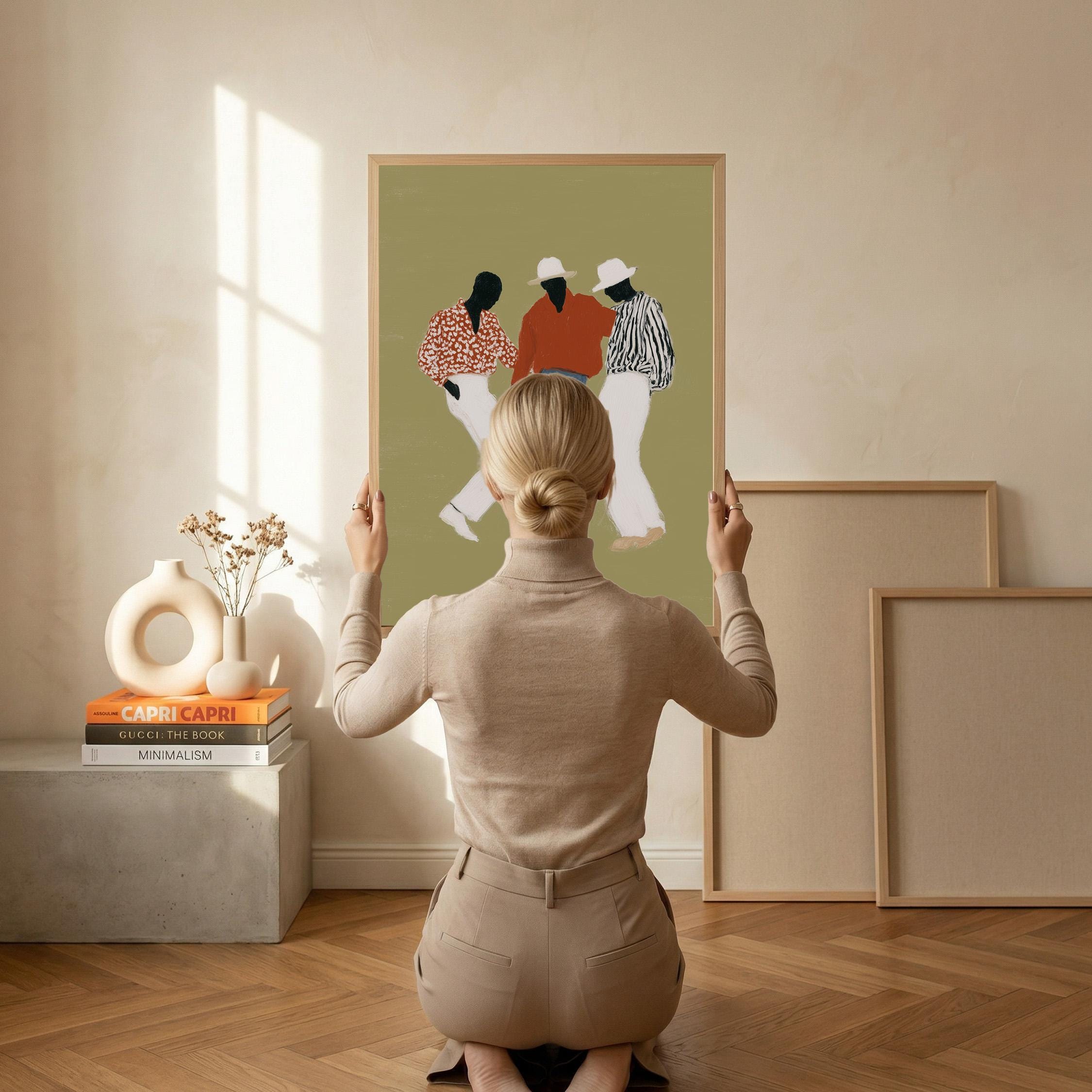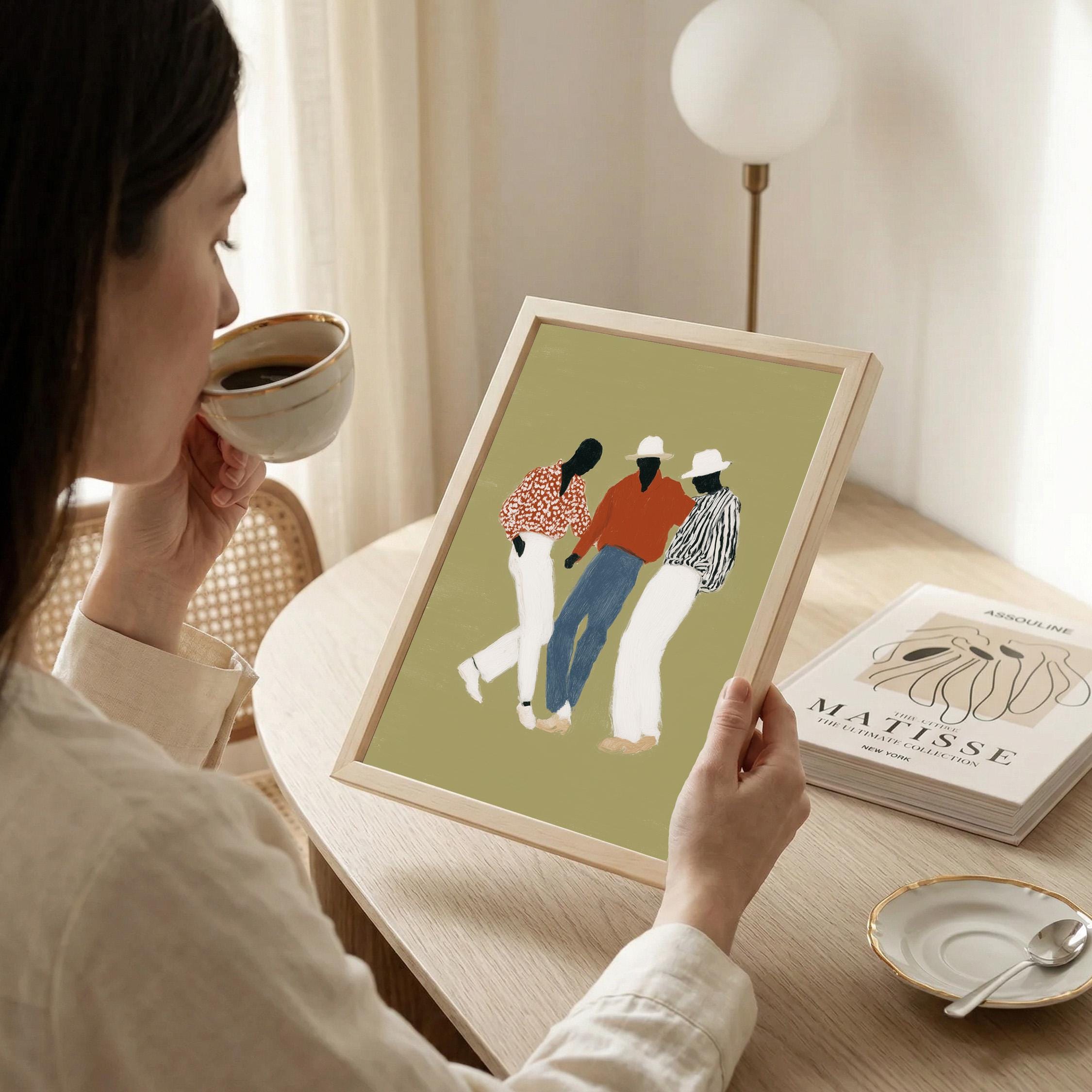 Black men dancing wall art print with bold outfits on a sage green background. Works well in a living room, hallway, or creative space. It adds movement, rhythm and a strong visual presence to the room.