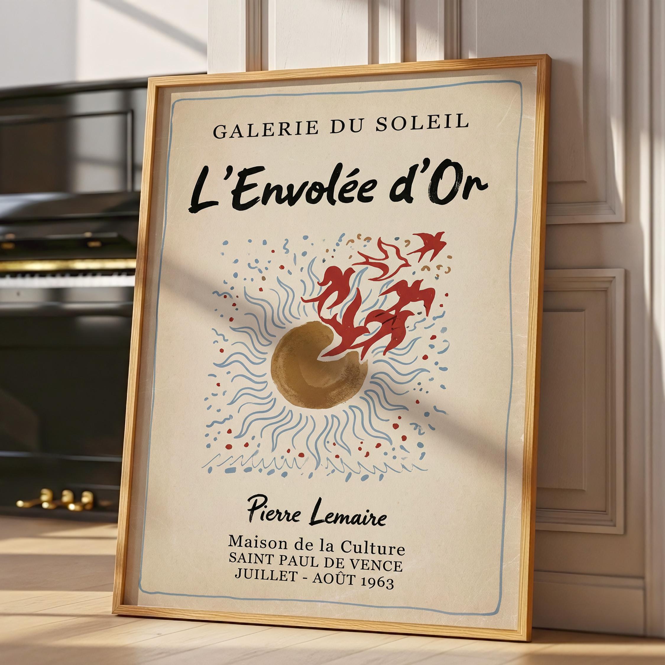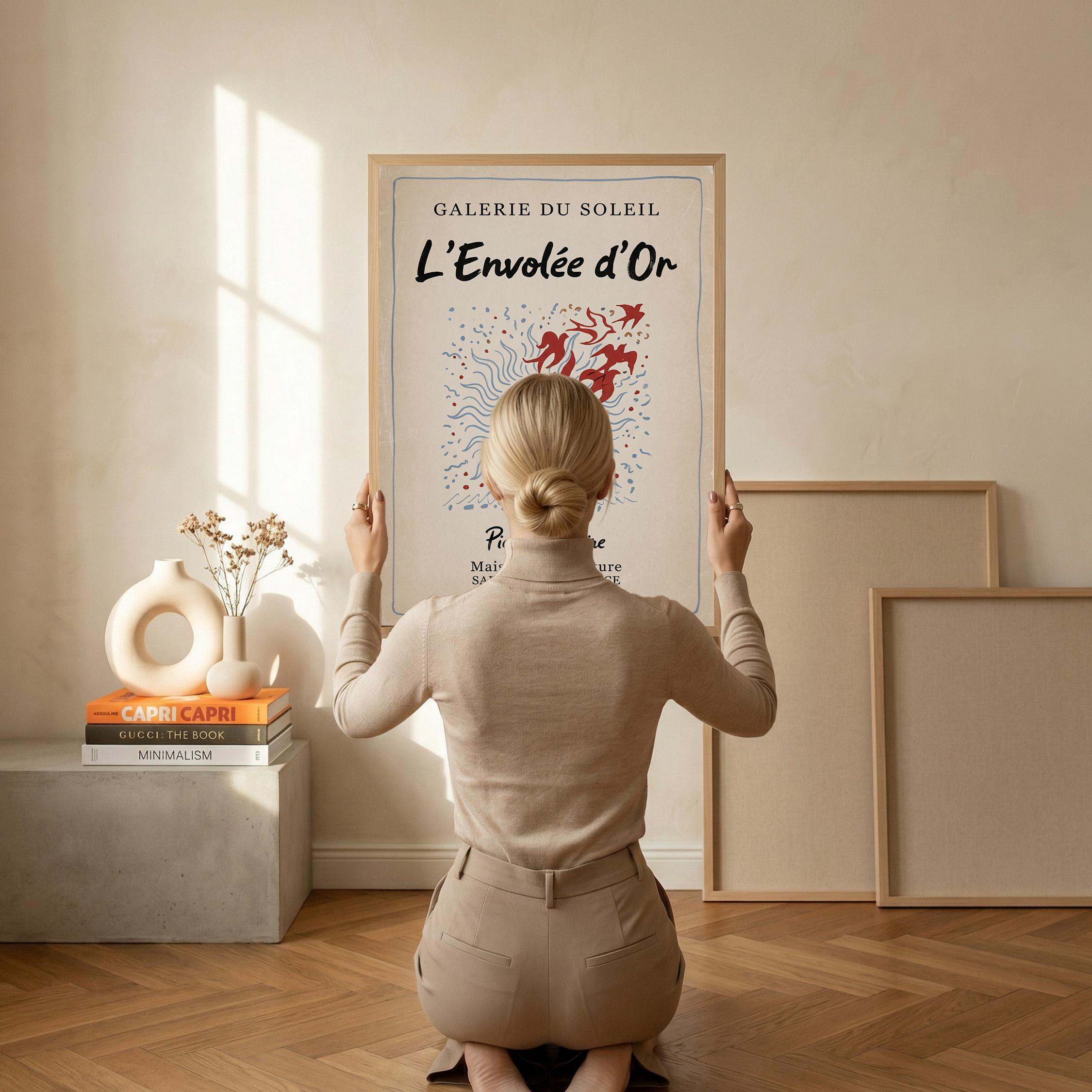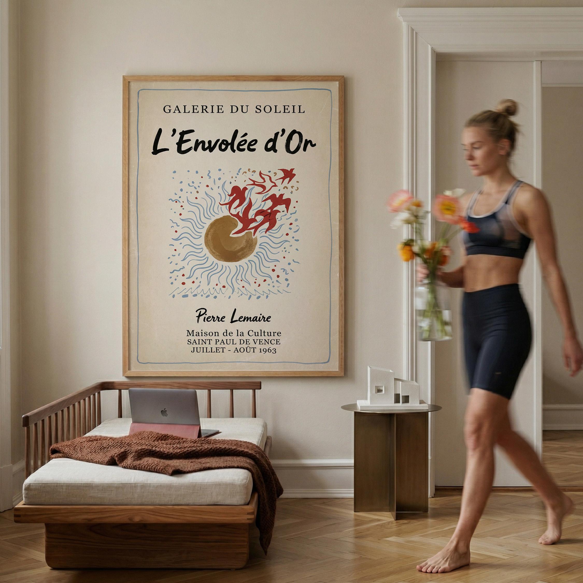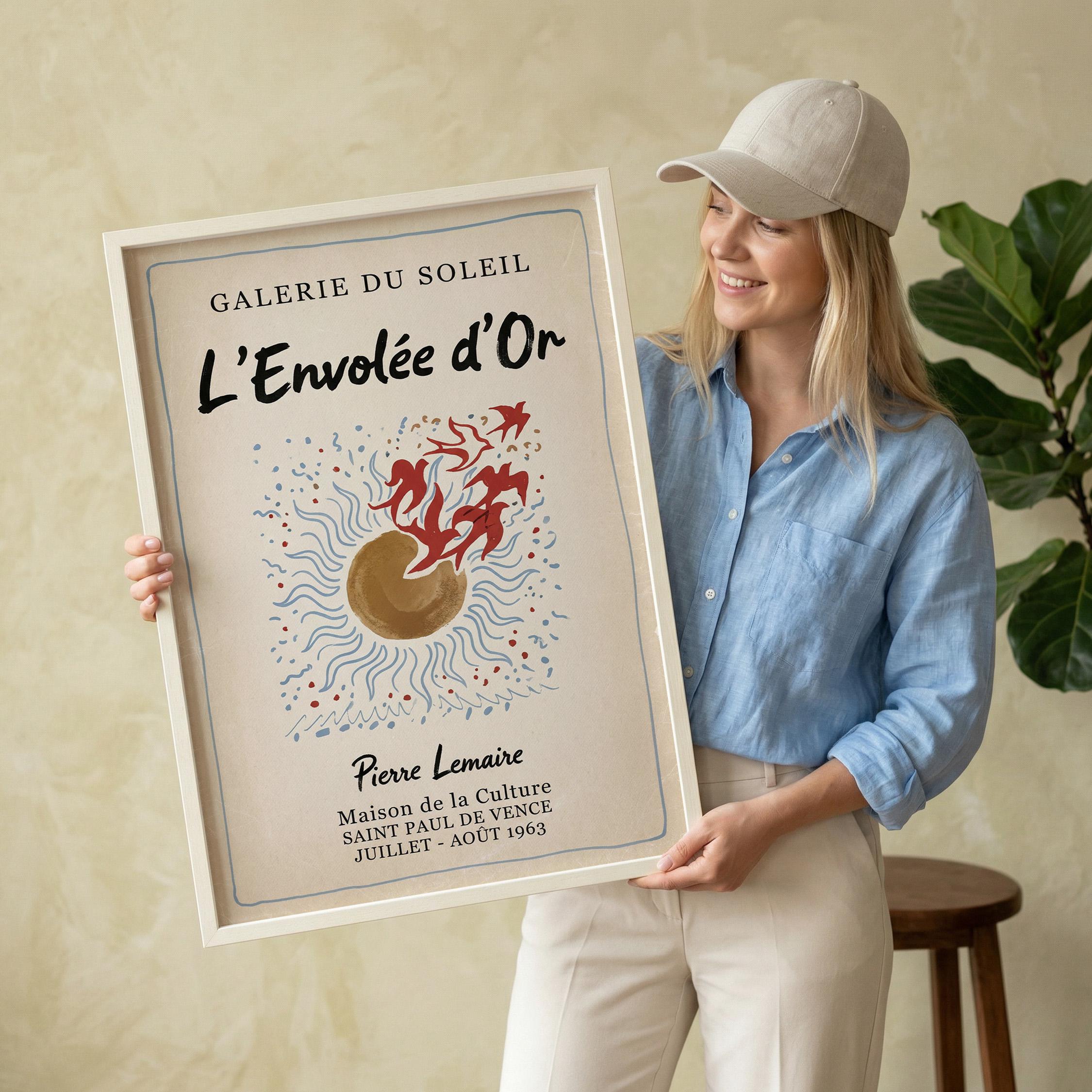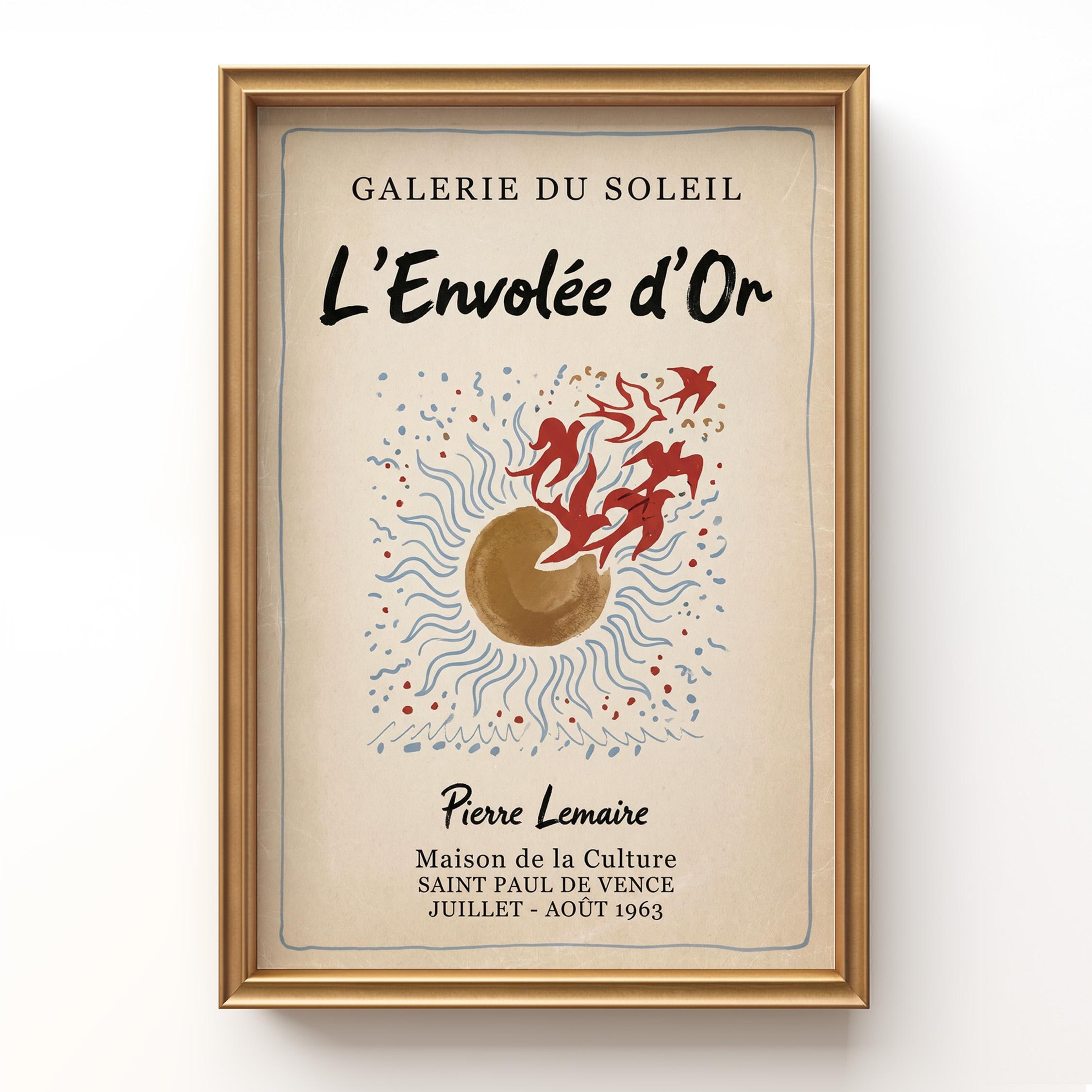L’Envolée d’Or exhibition print with a vintage French gallery poster feel. Works well in a living room, office, or creative corner. It brings an elegant and nostalgic feel to the space.