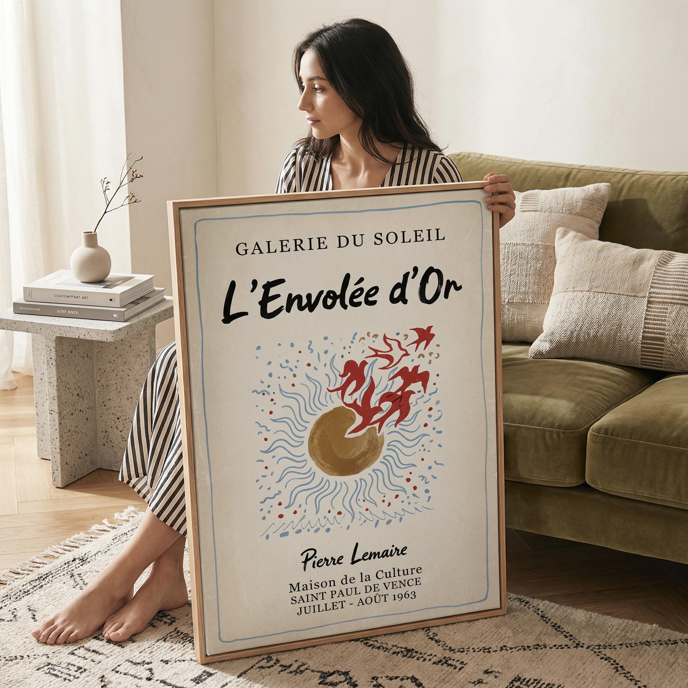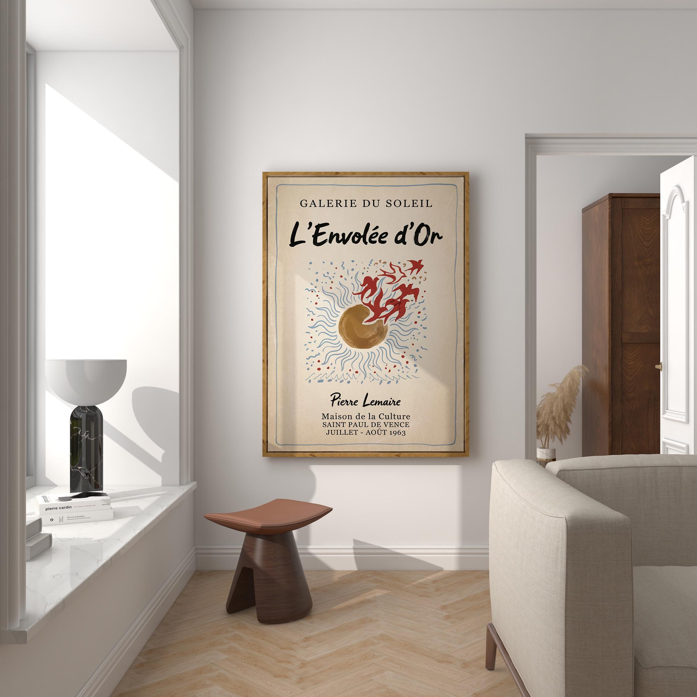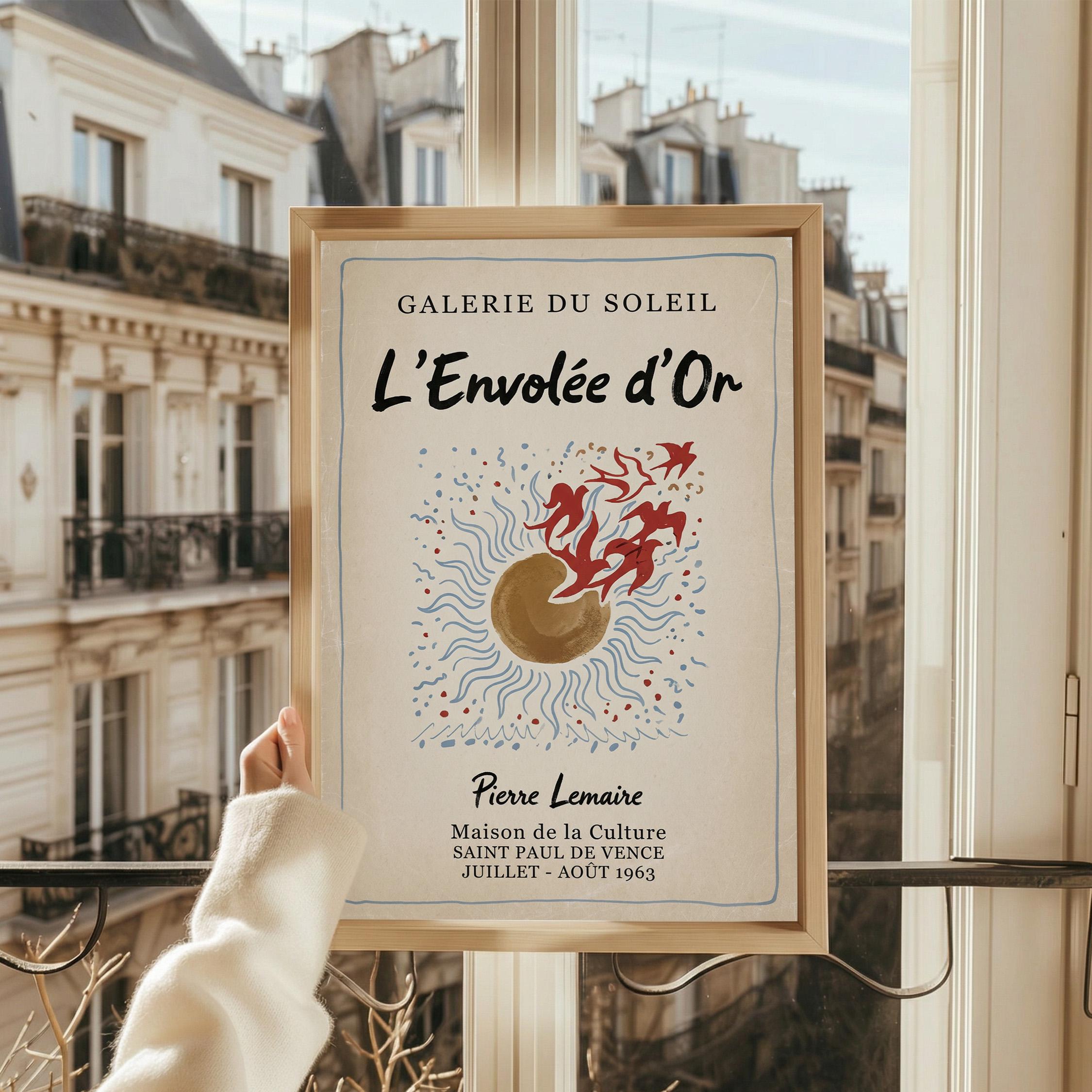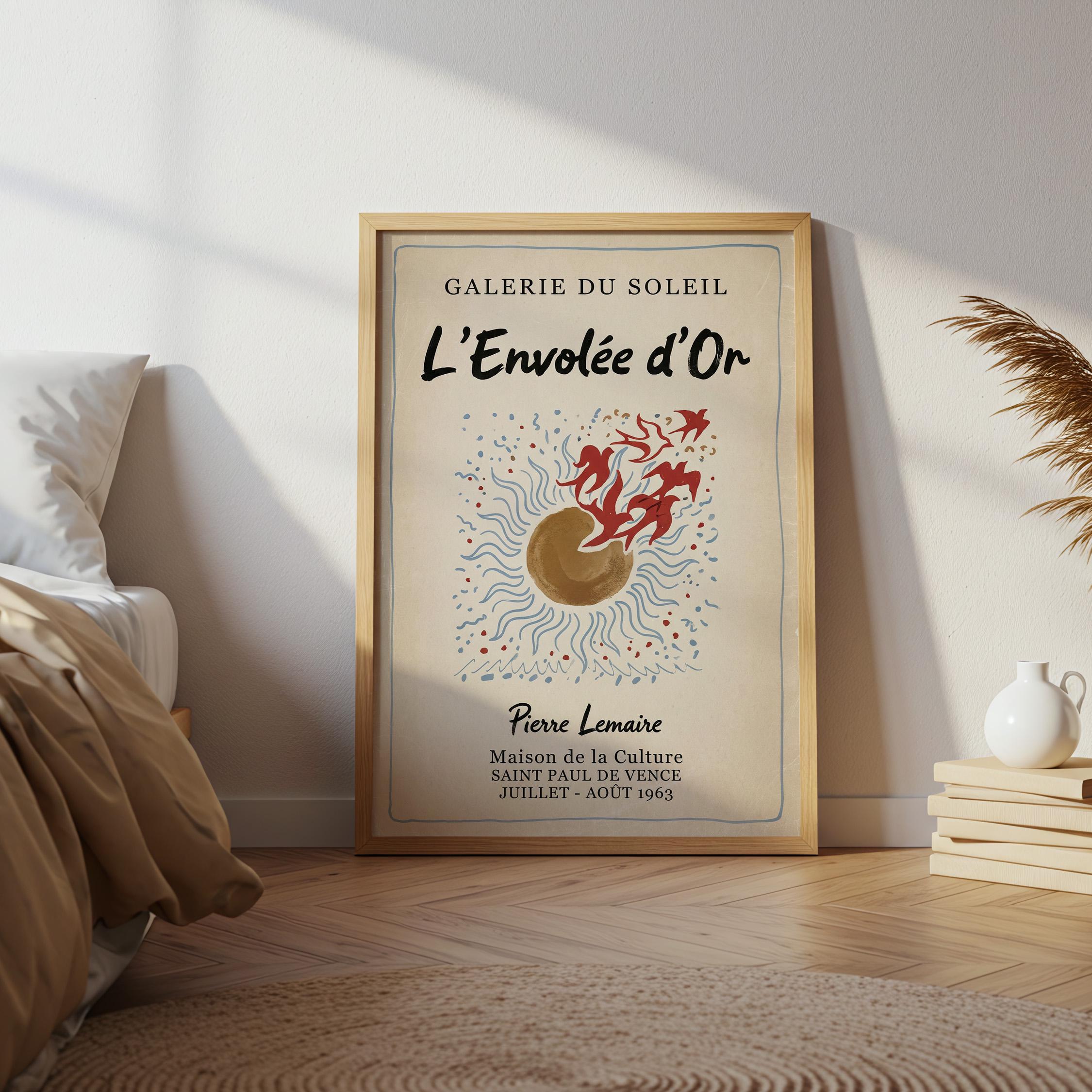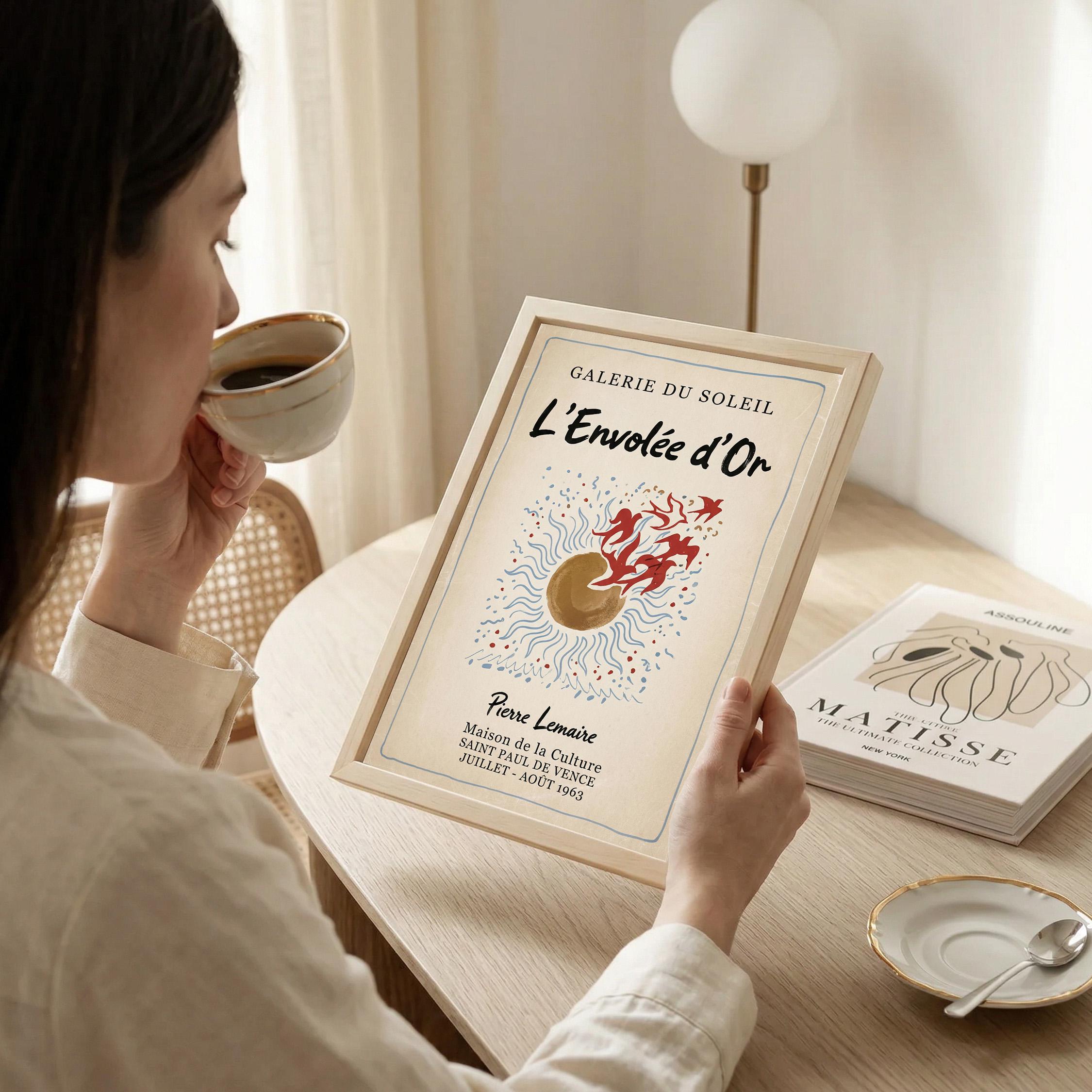 L’Envolée d’Or exhibition print with a vintage French gallery poster feel. Works well in a living room, office, or creative corner. It brings an elegant and nostalgic feel to the space.