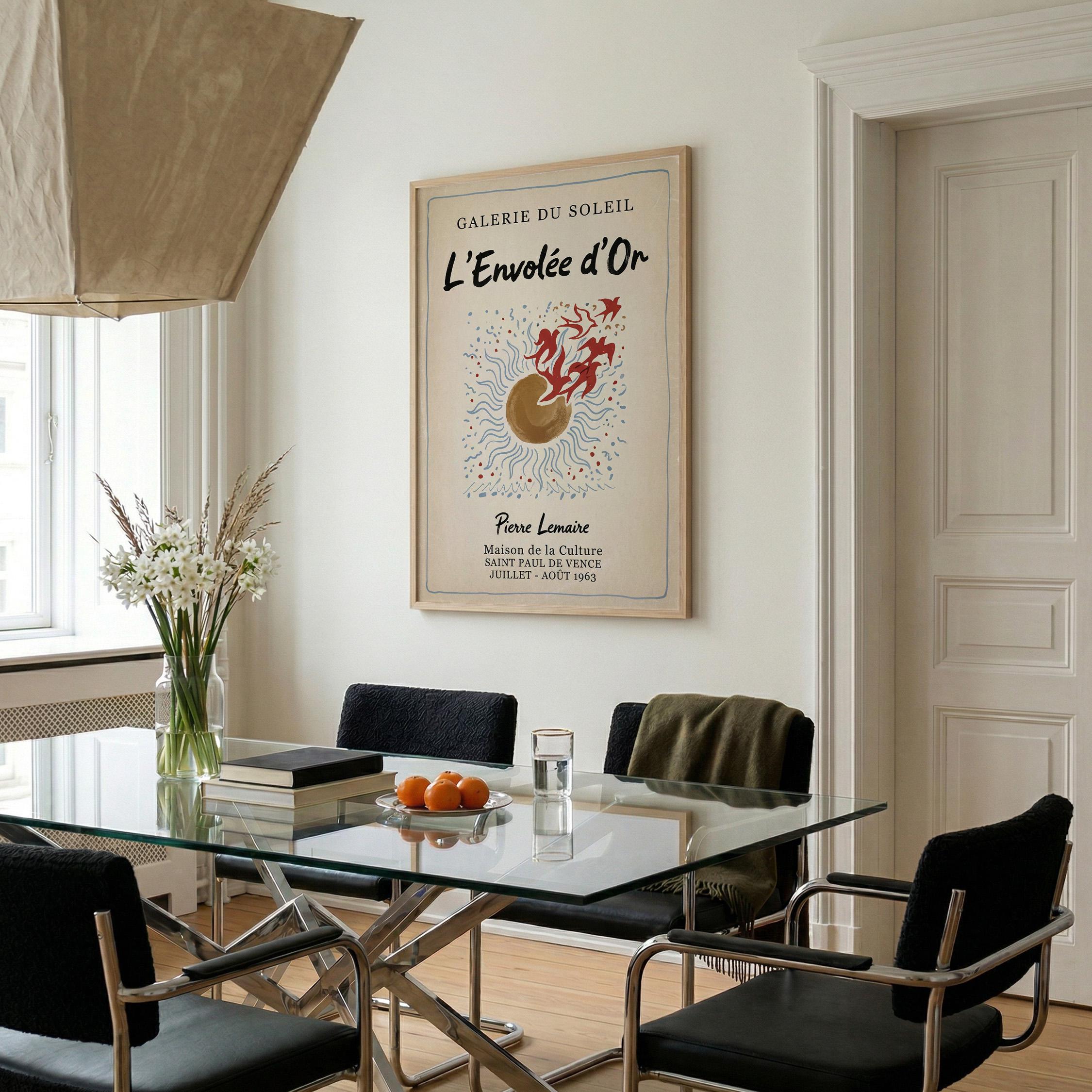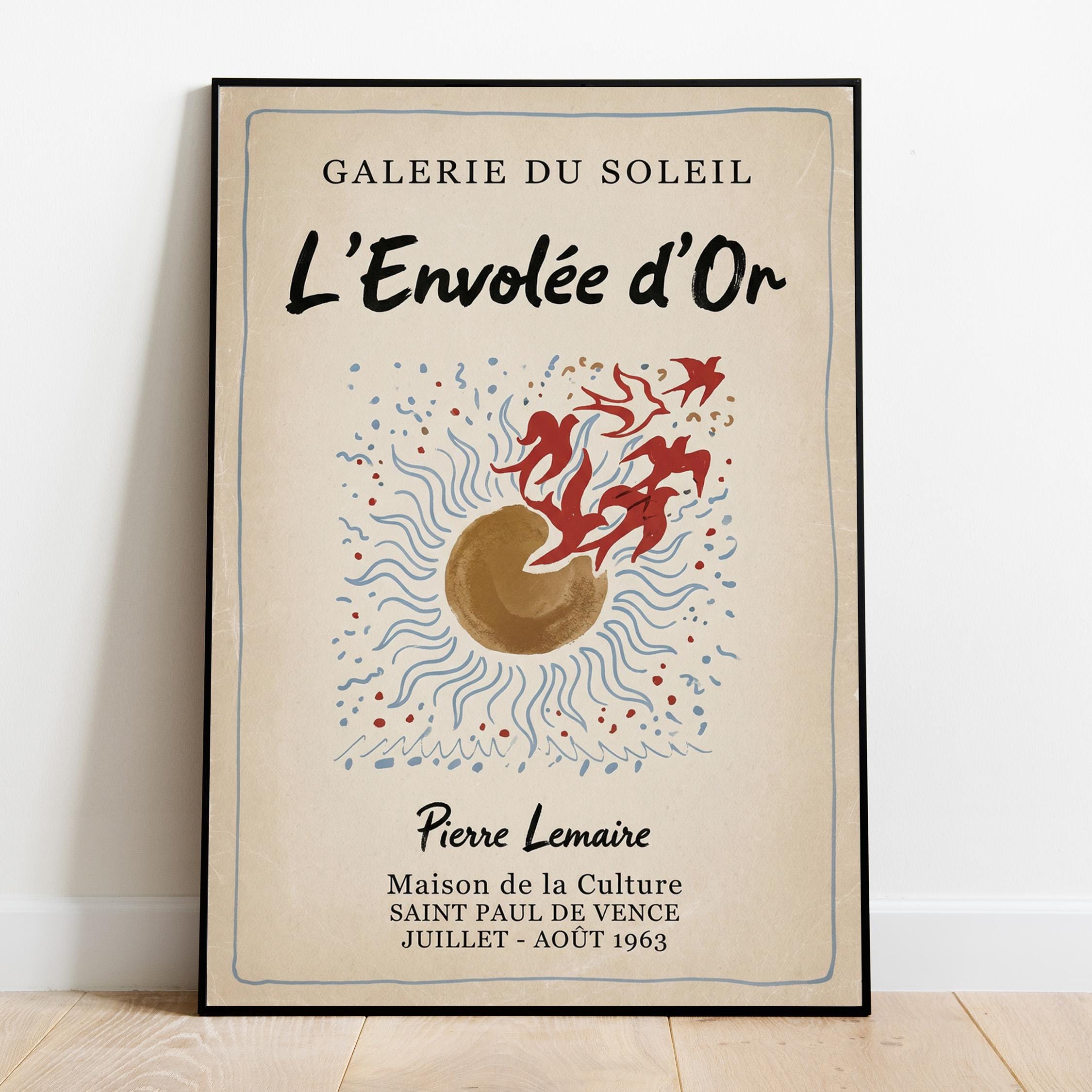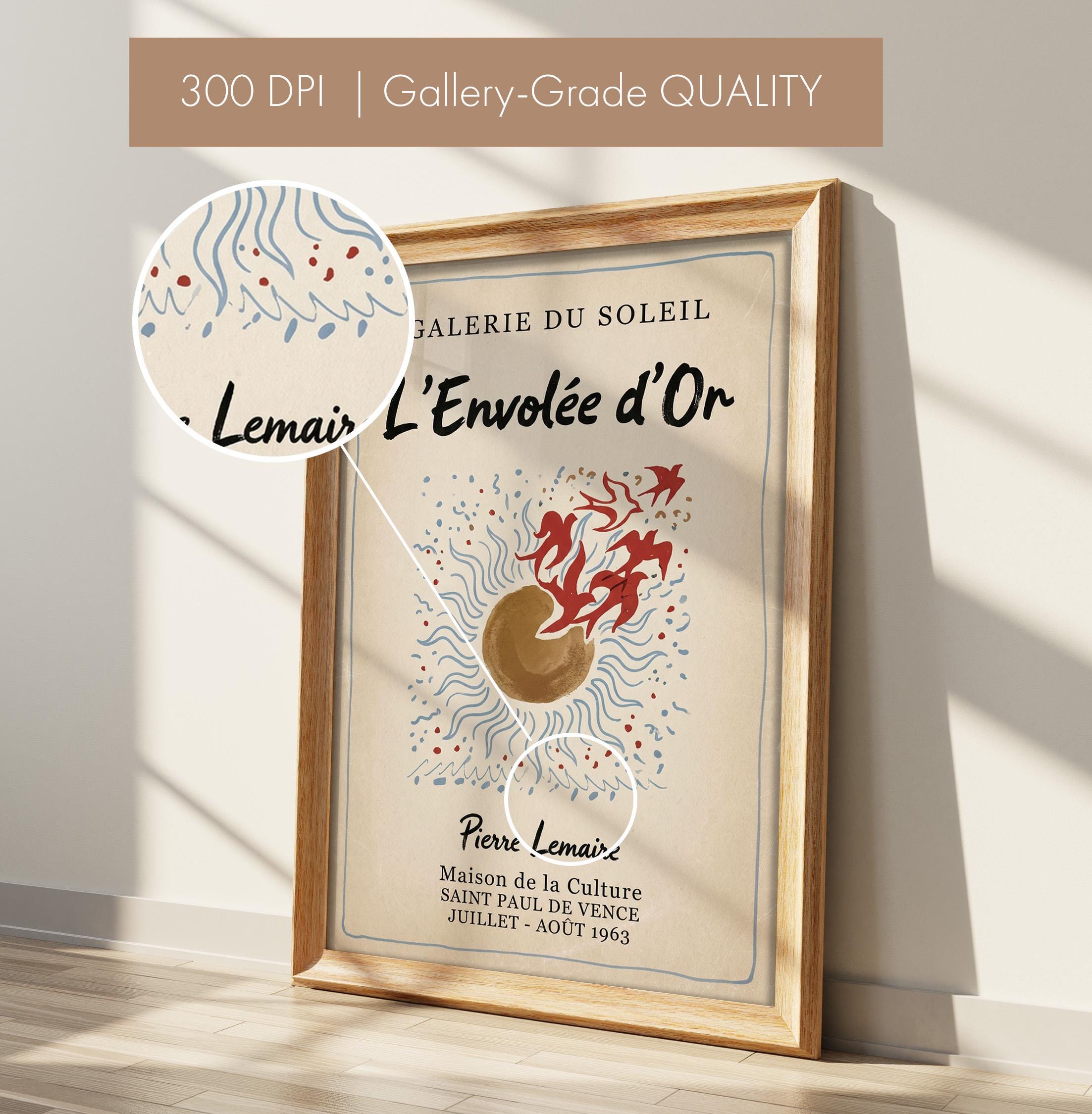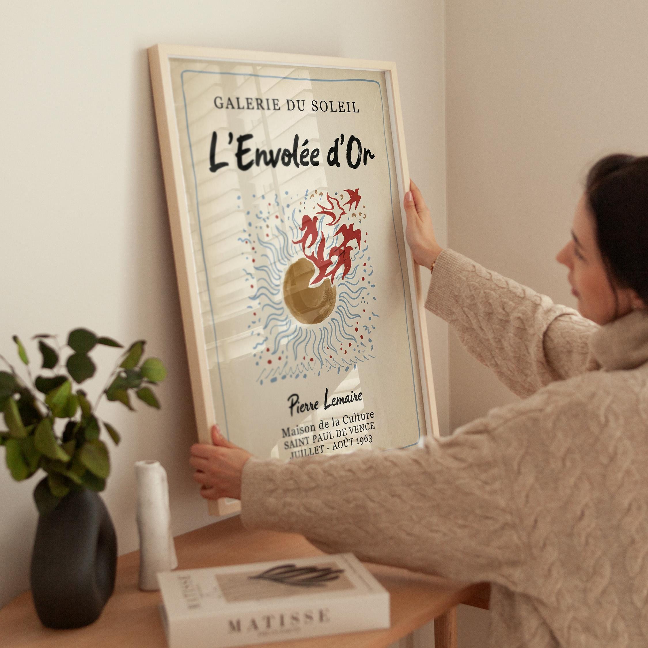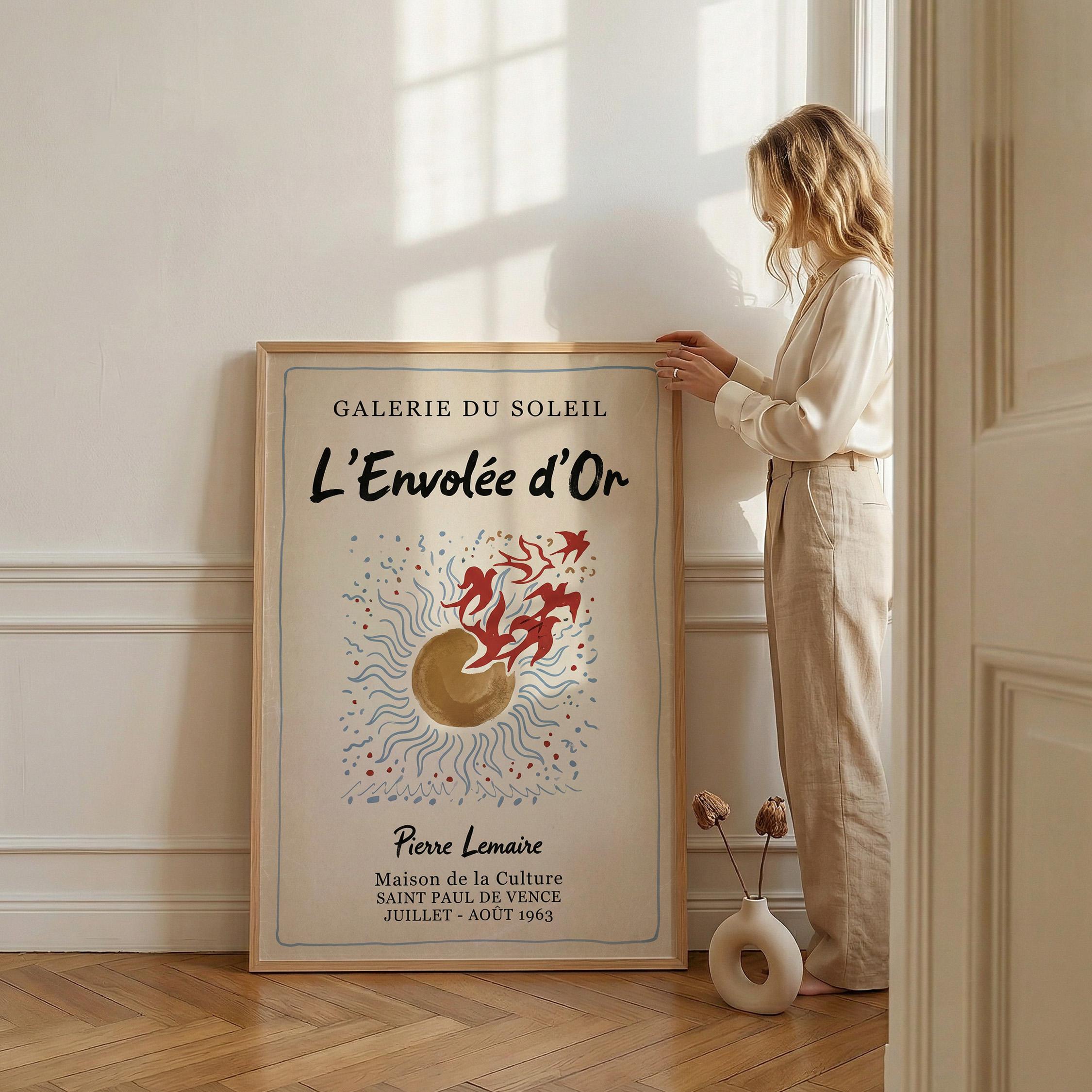 L’Envolée d’Or exhibition print with a vintage French gallery poster feel. Works well in a living room, office, or creative corner. It brings an elegant and nostalgic feel to the space.