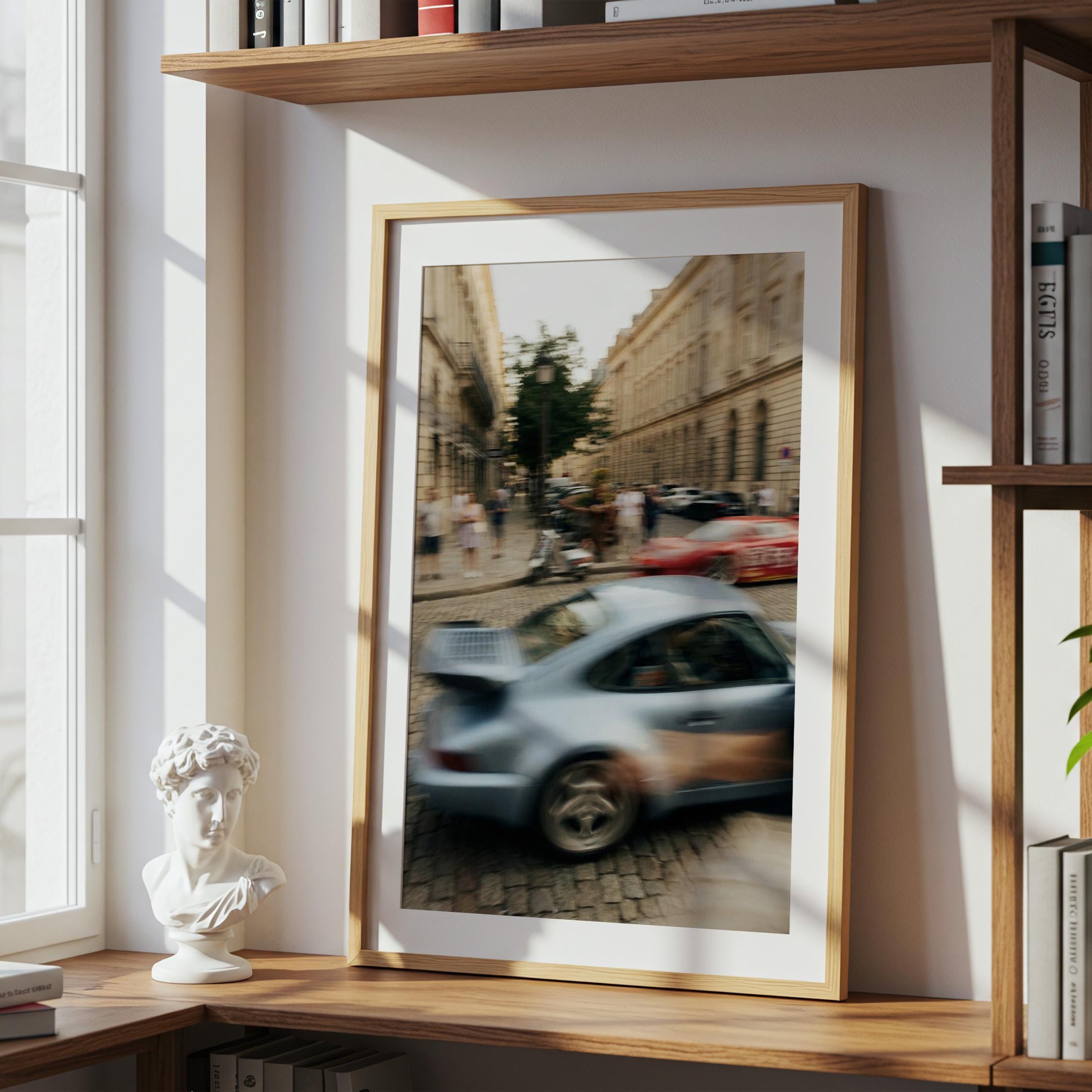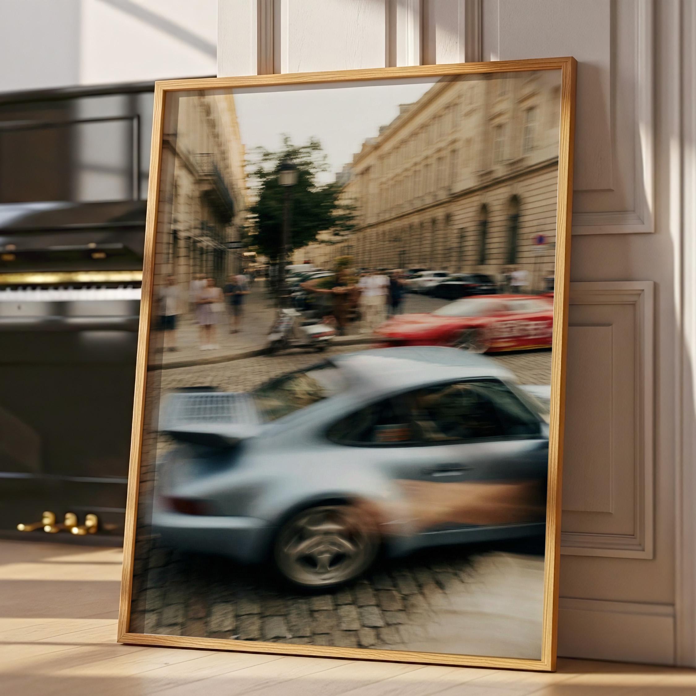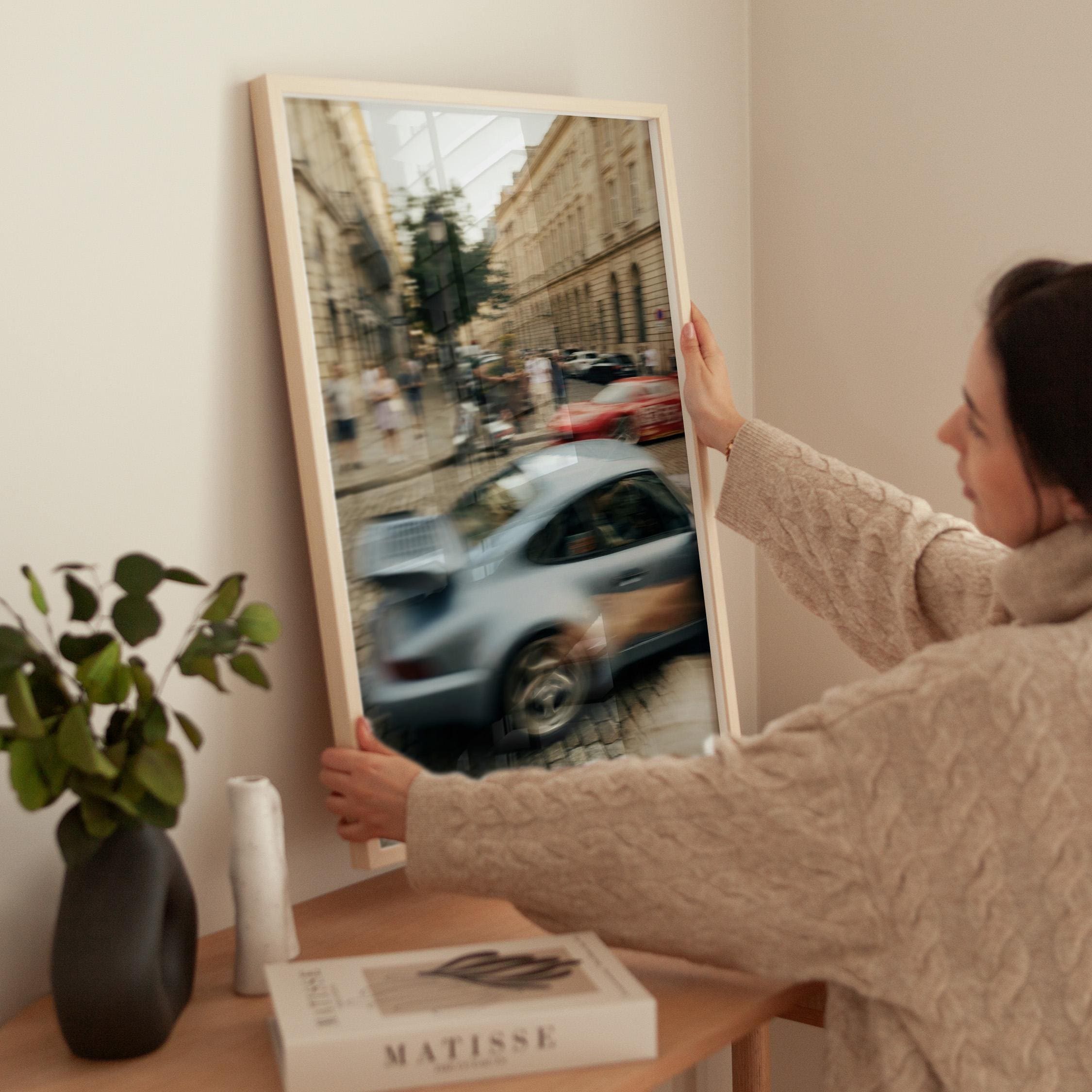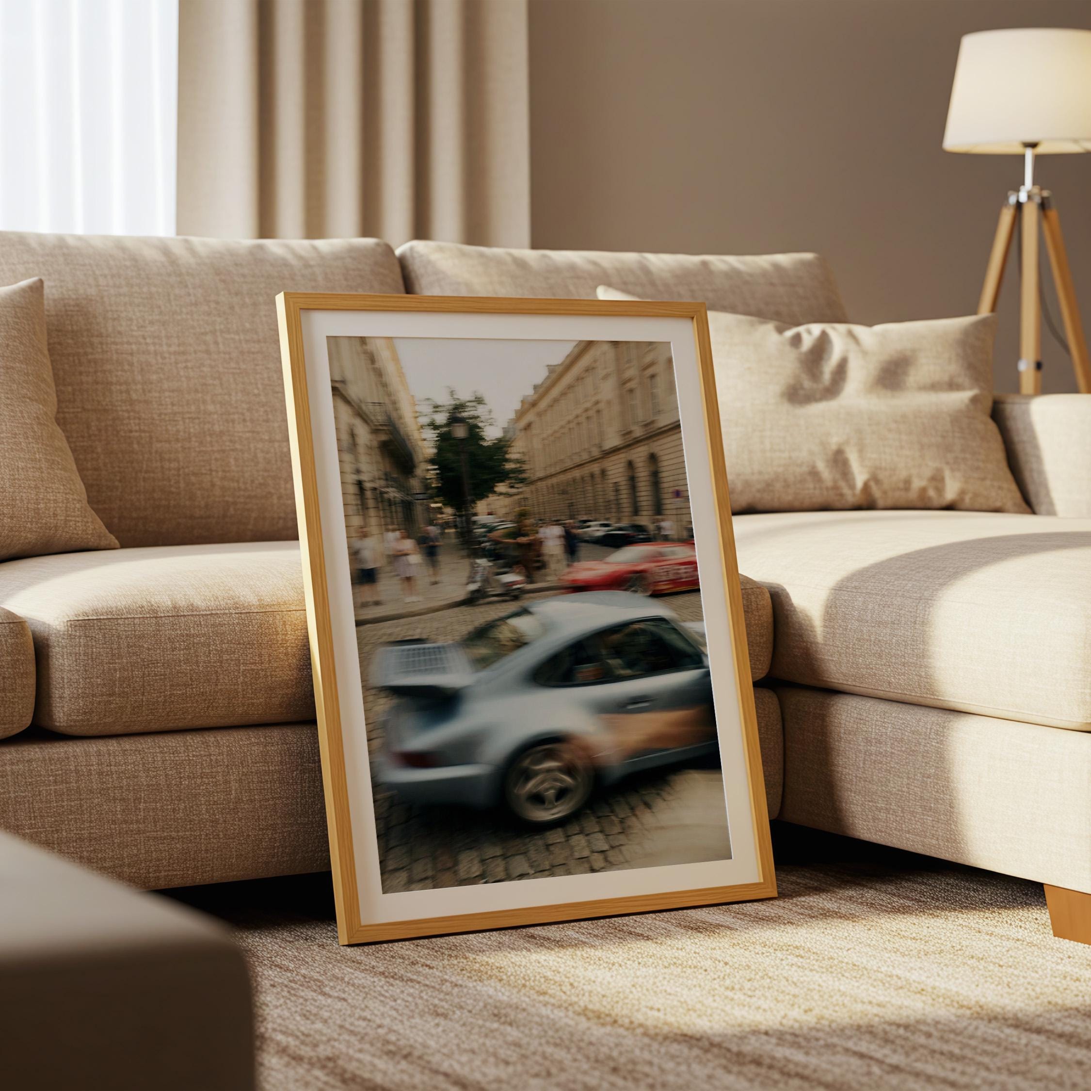 Porsche 911 Turbo wall art print with strong motion blur on a European street. Great fit for an office, garage, or modern interior with a clean aesthetic. It brings speed, movement and a subtle vintage feel to the space.