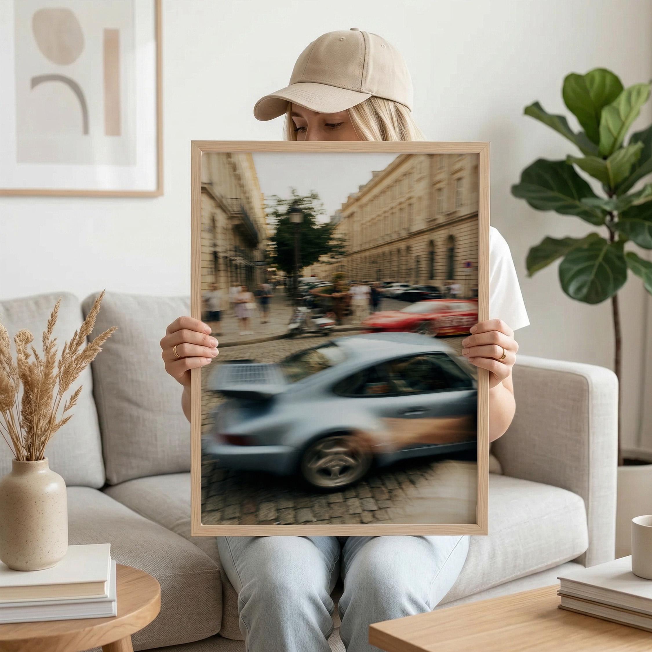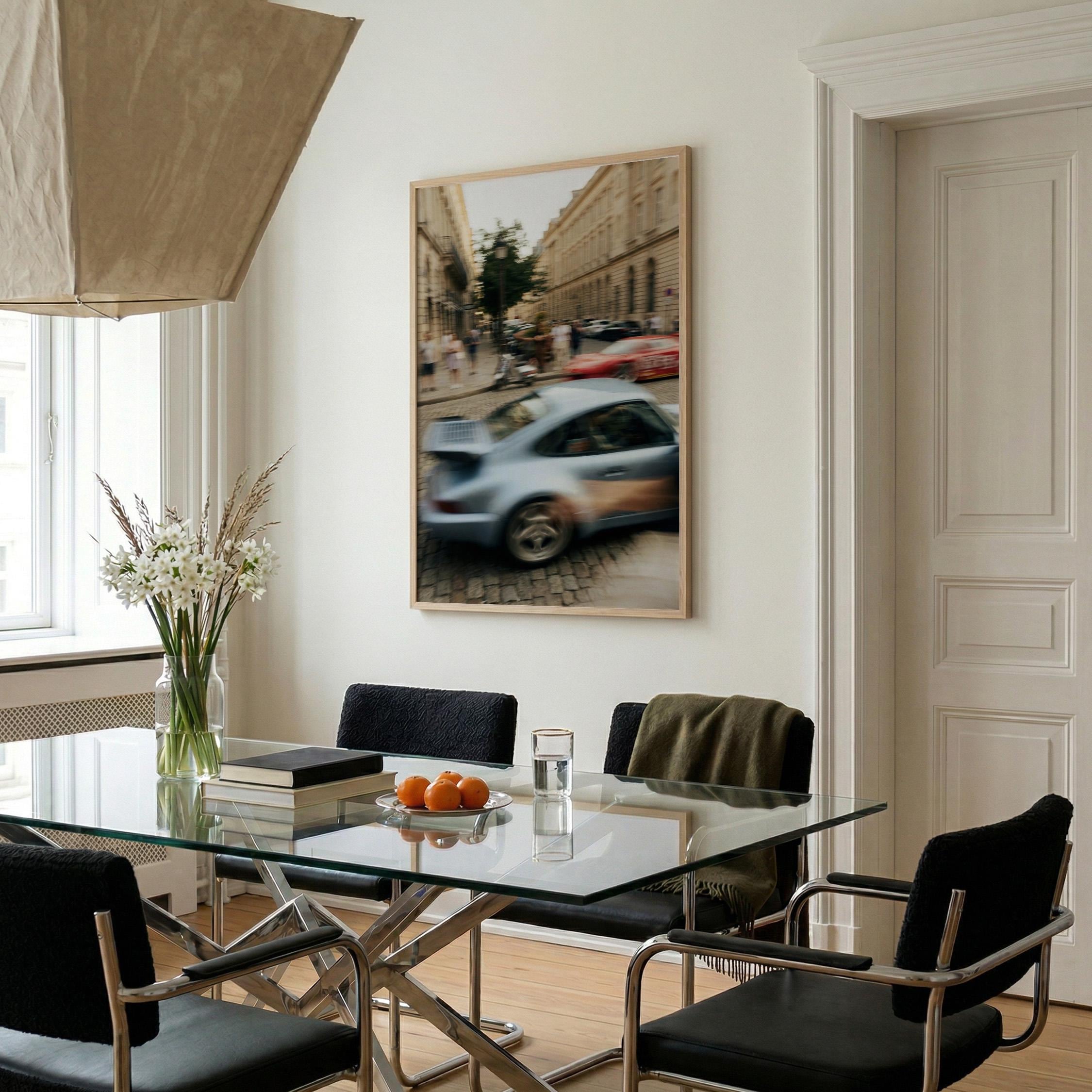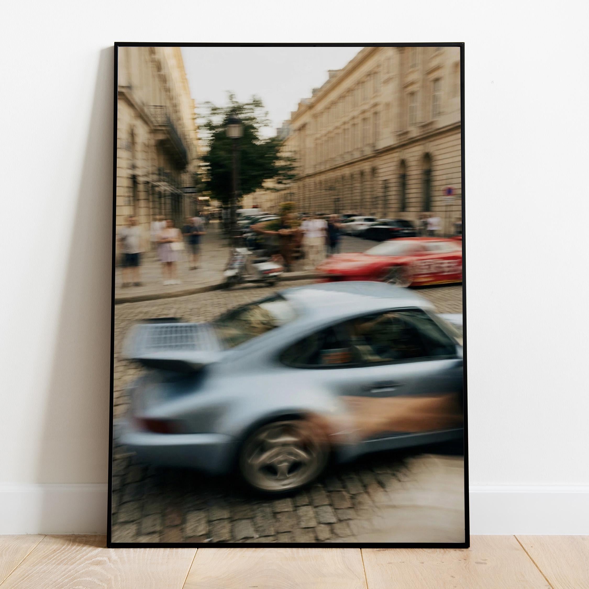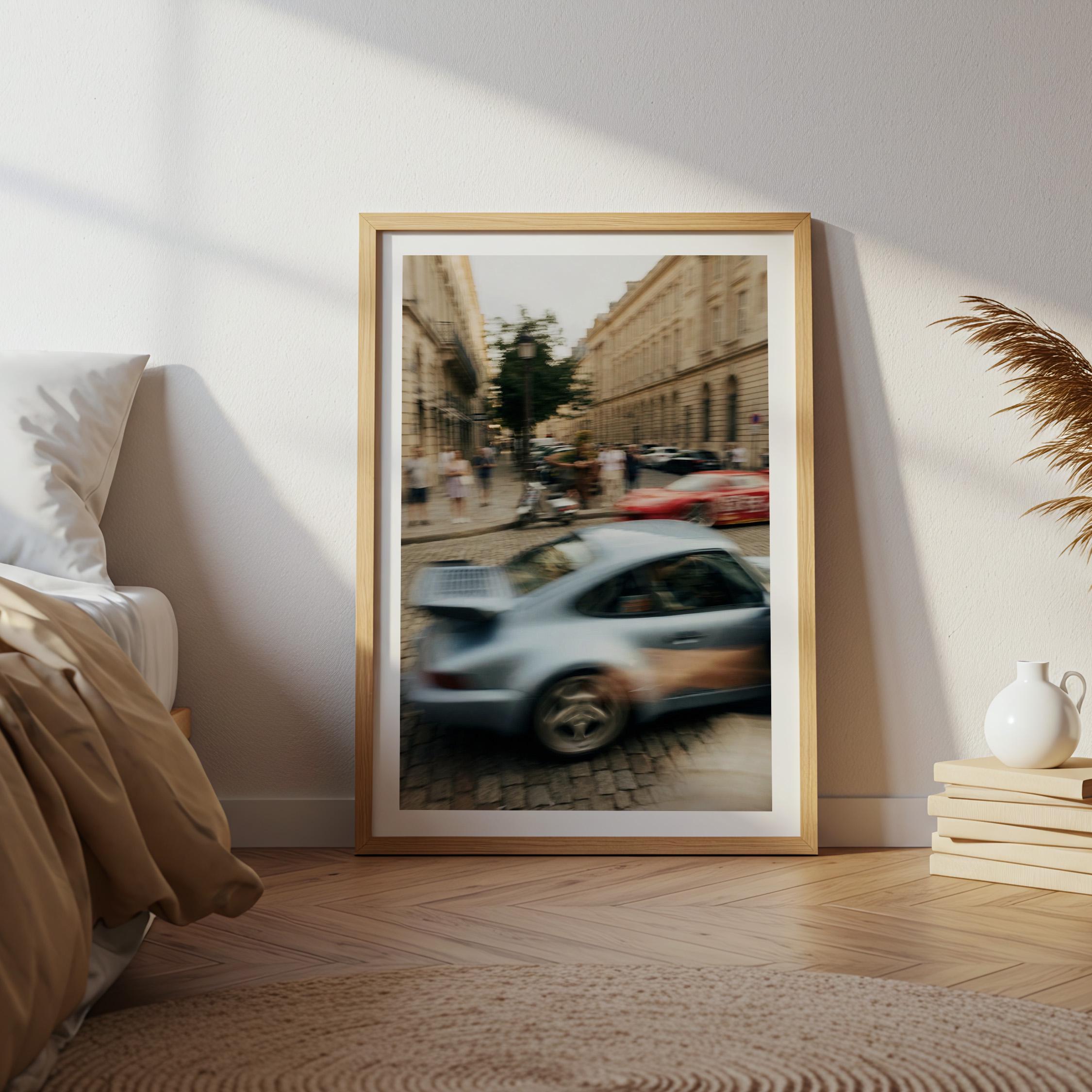 Porsche 911 Turbo wall art print with strong motion blur on a European street. Great fit for an office, garage, or modern interior with a clean aesthetic. It brings speed, movement and a subtle vintage feel to the space.