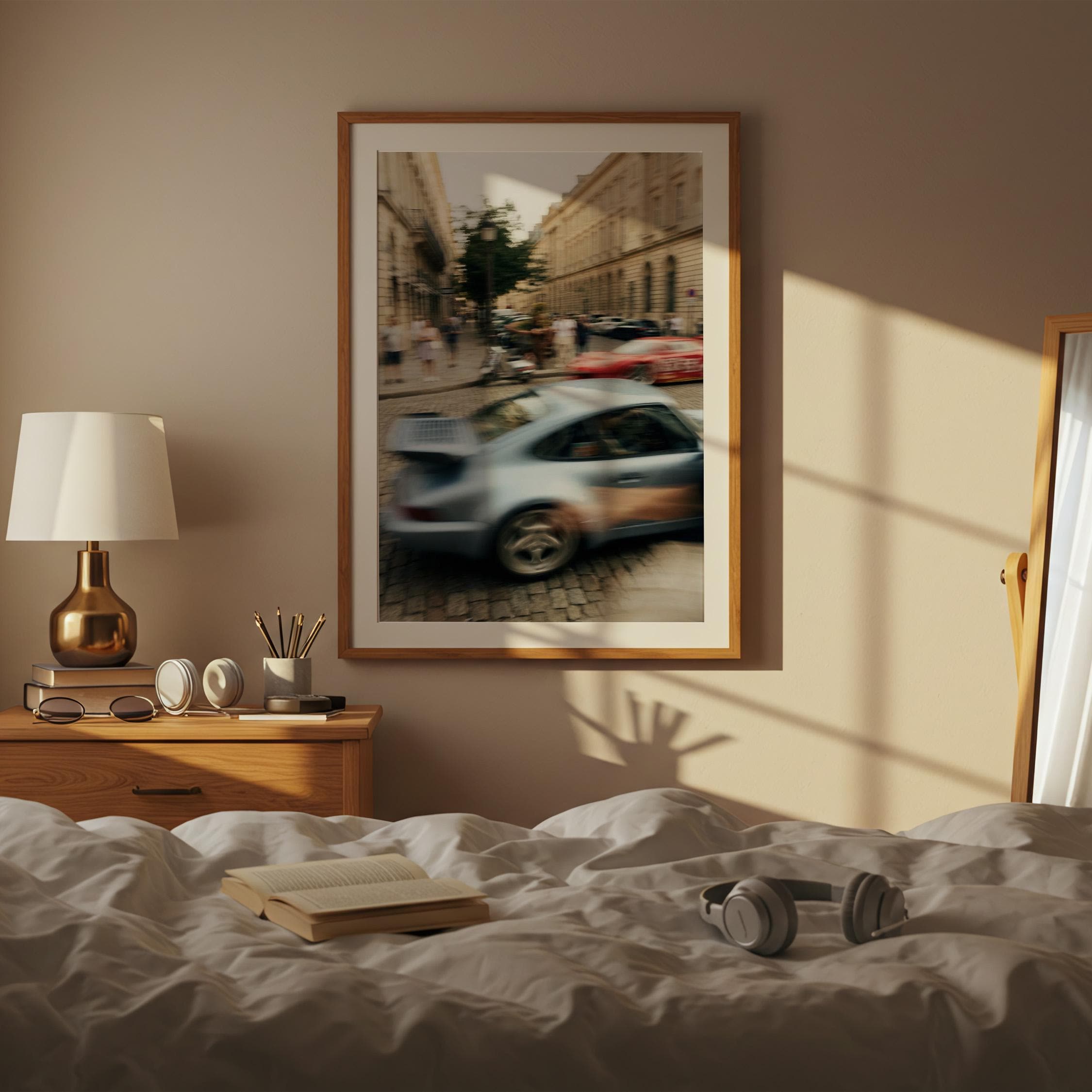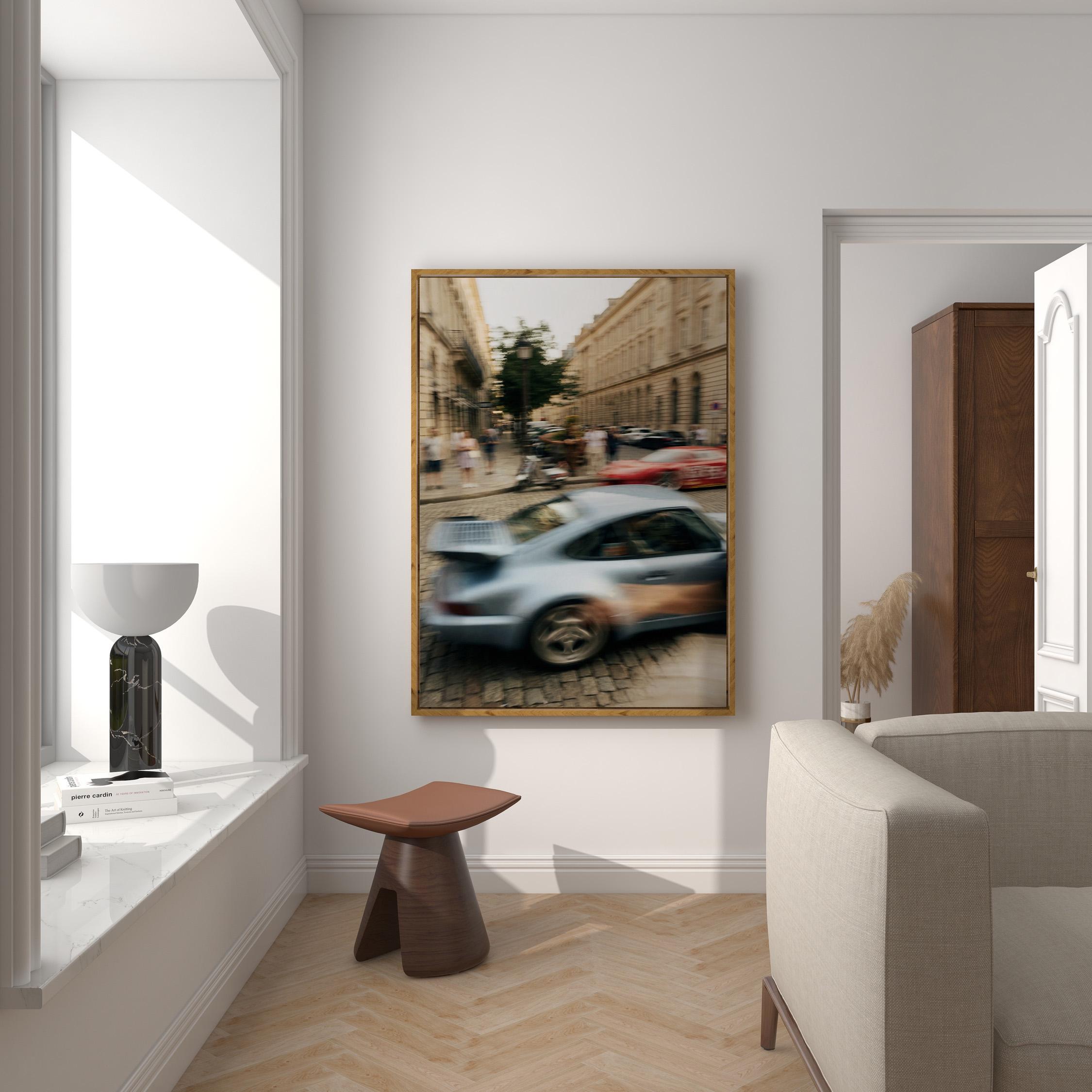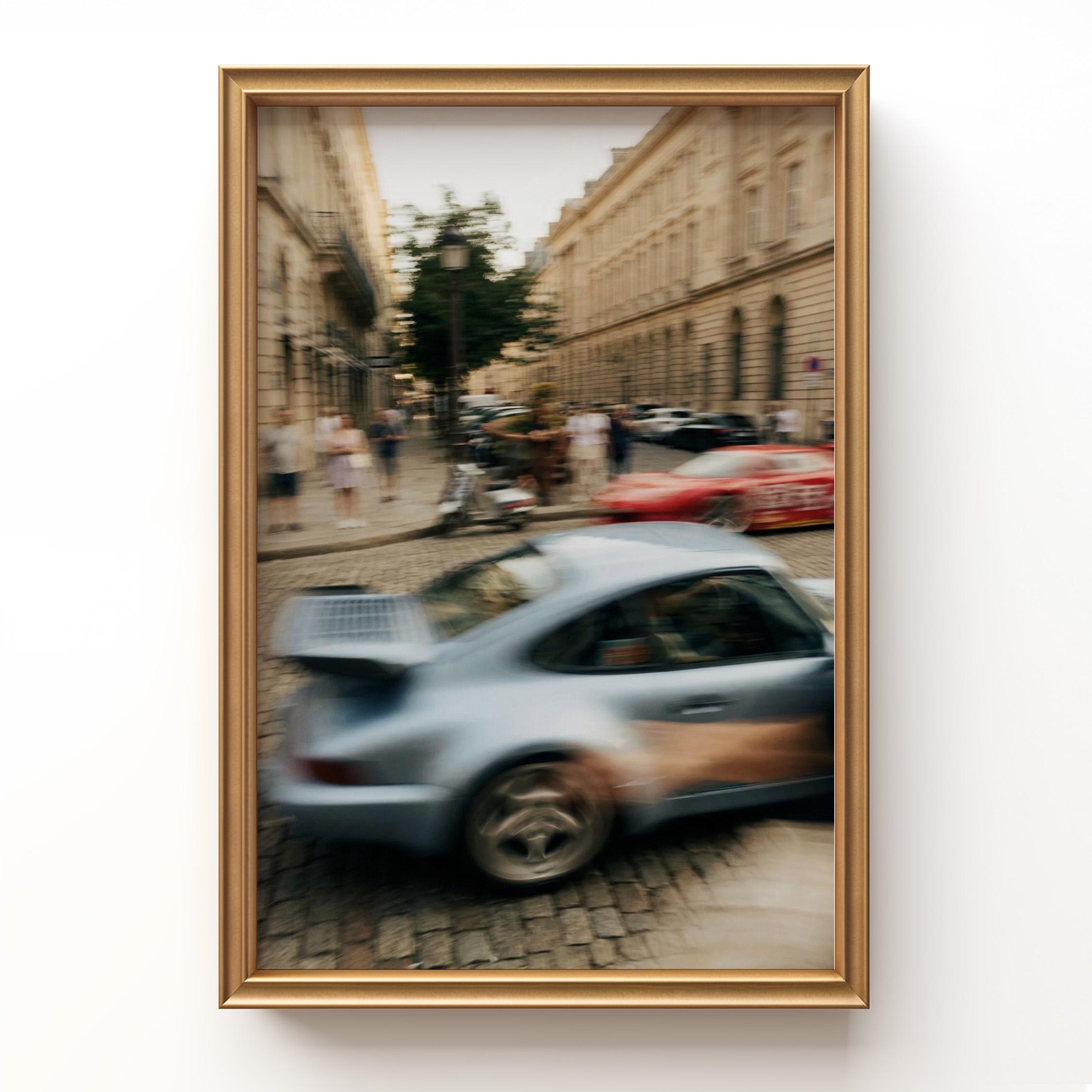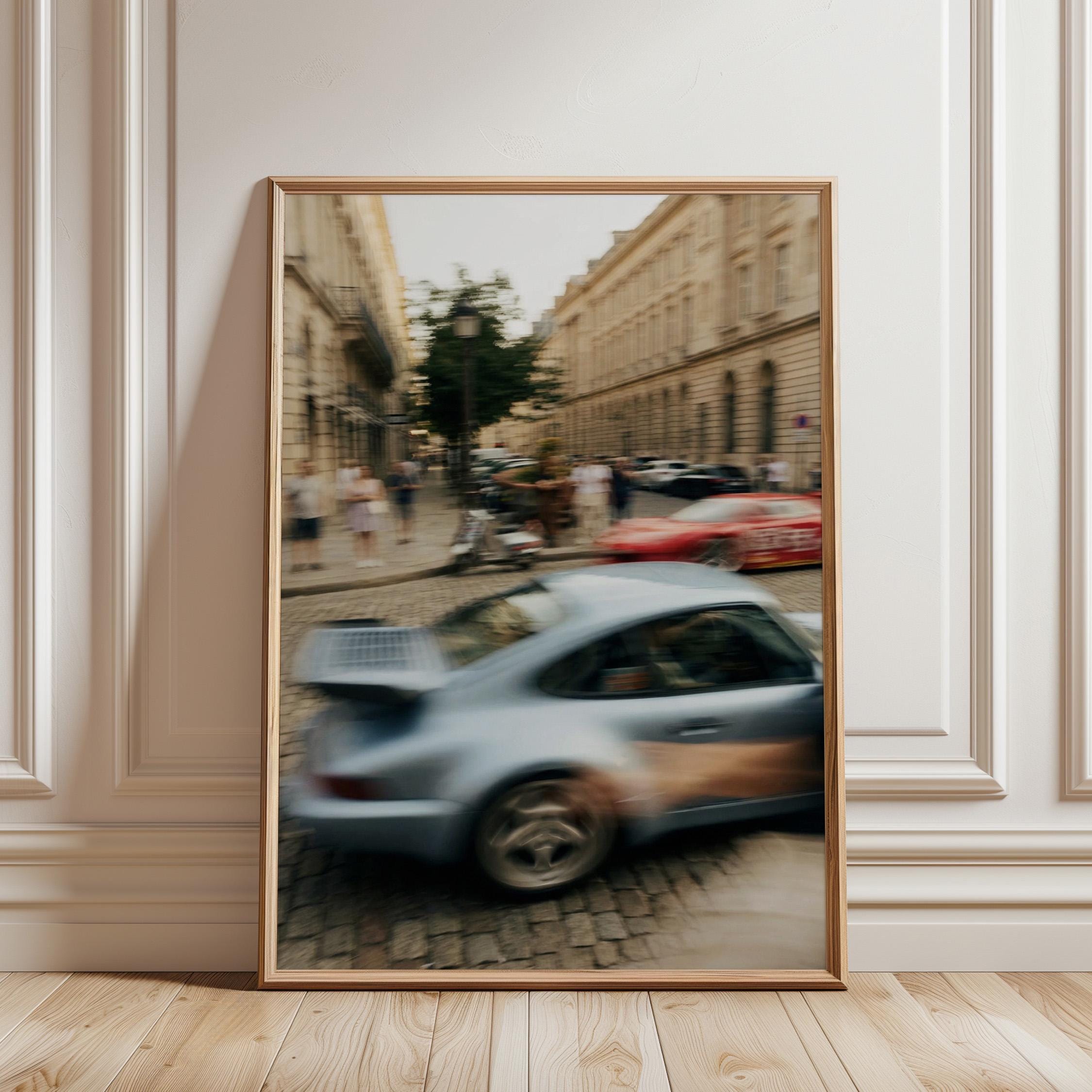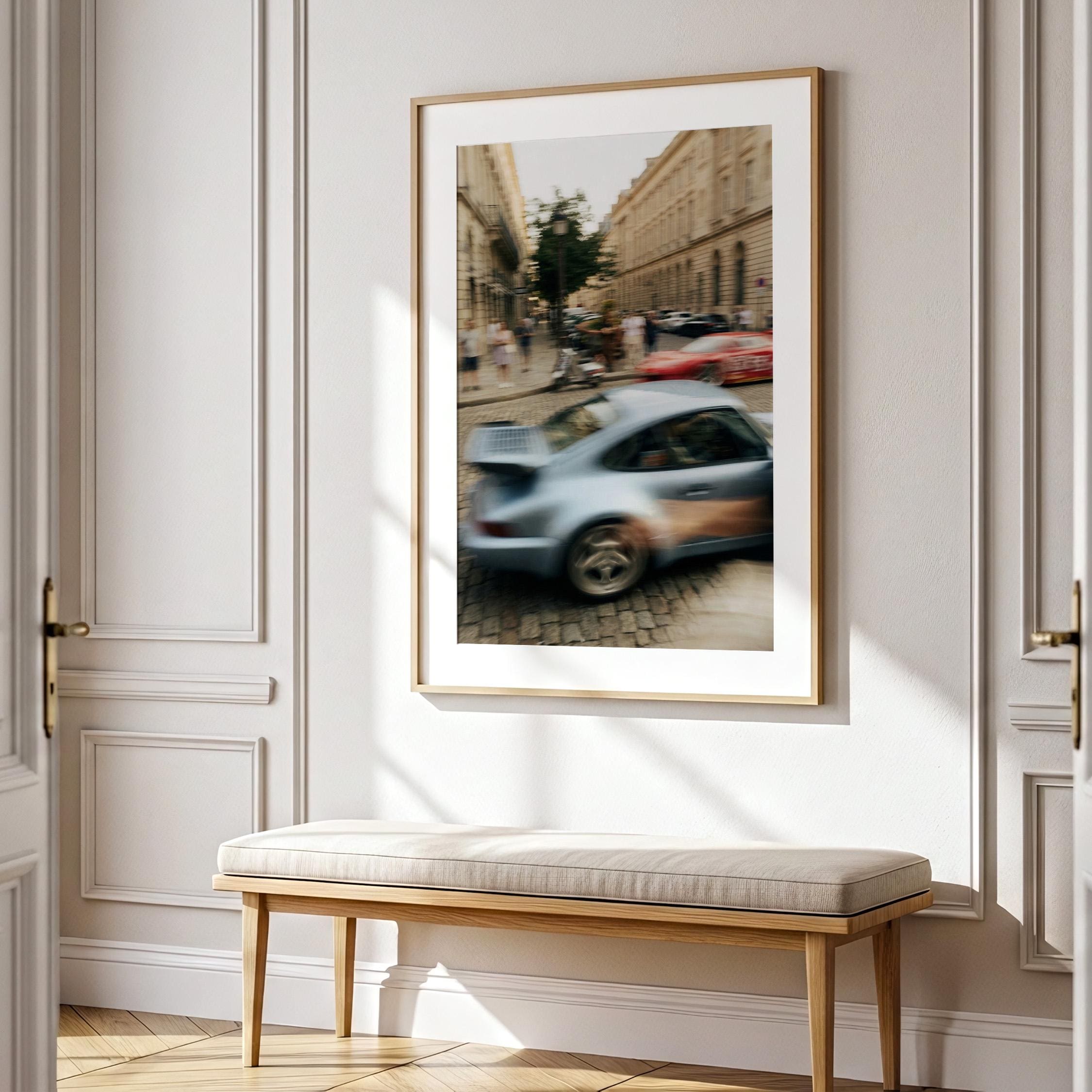 Porsche 911 Turbo wall art print with strong motion blur on a European street. Great fit for an office, garage, or modern interior with a clean aesthetic. It brings speed, movement and a subtle vintage feel to the space.