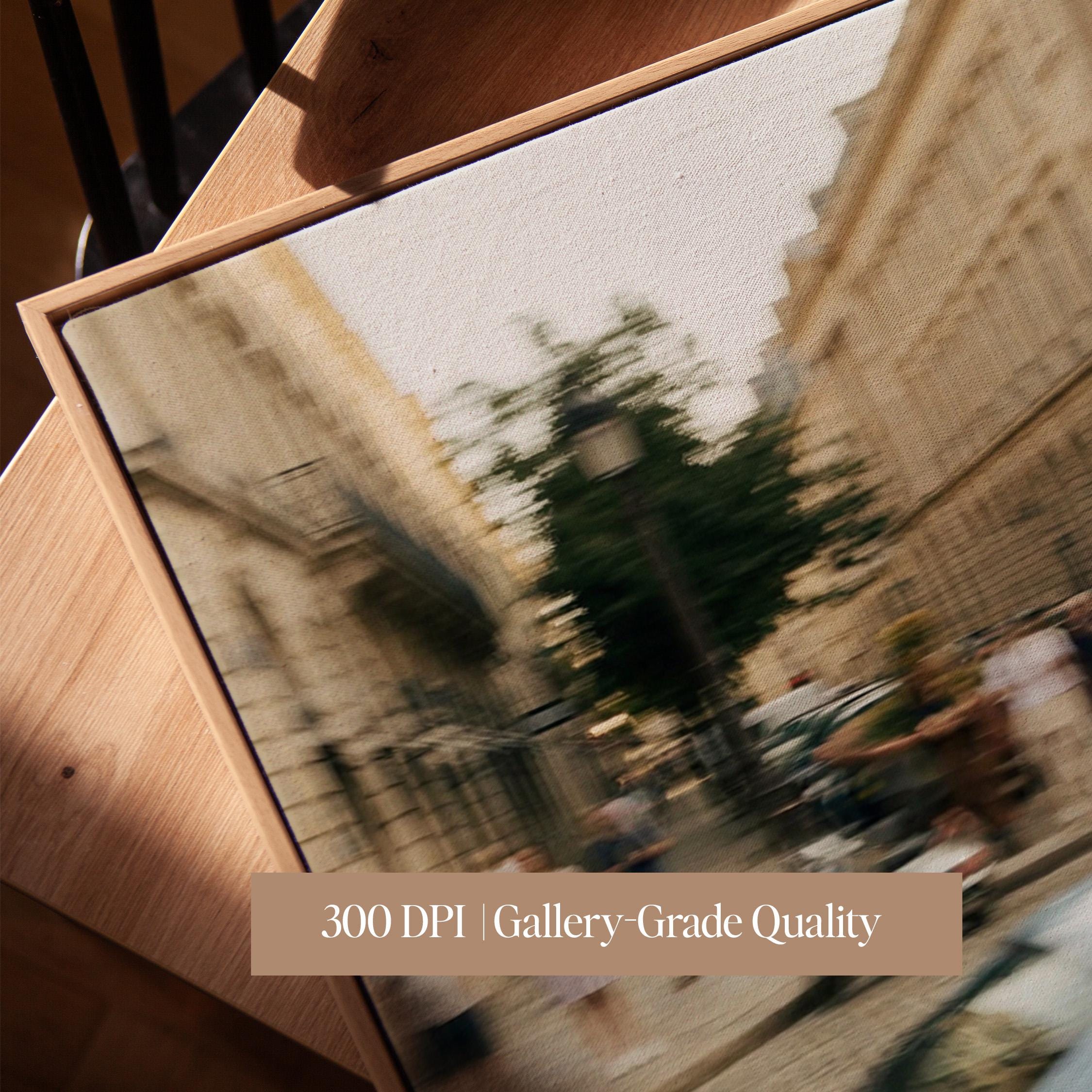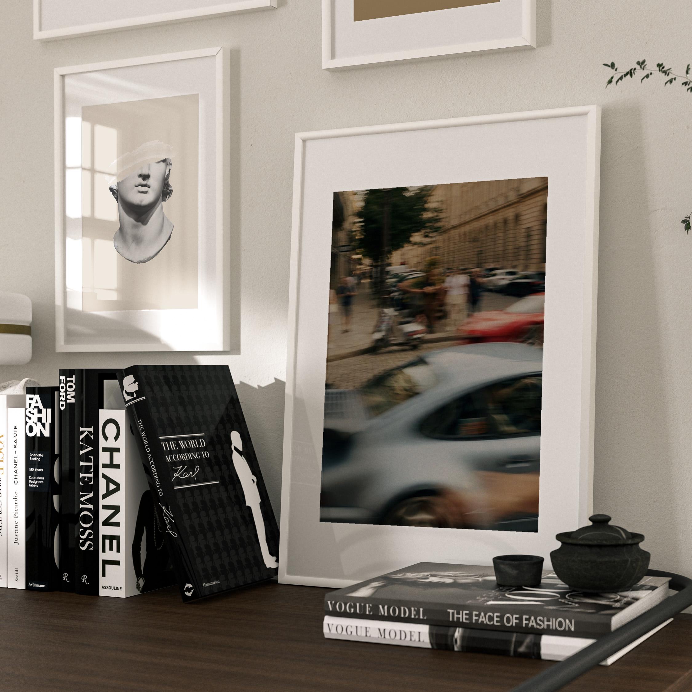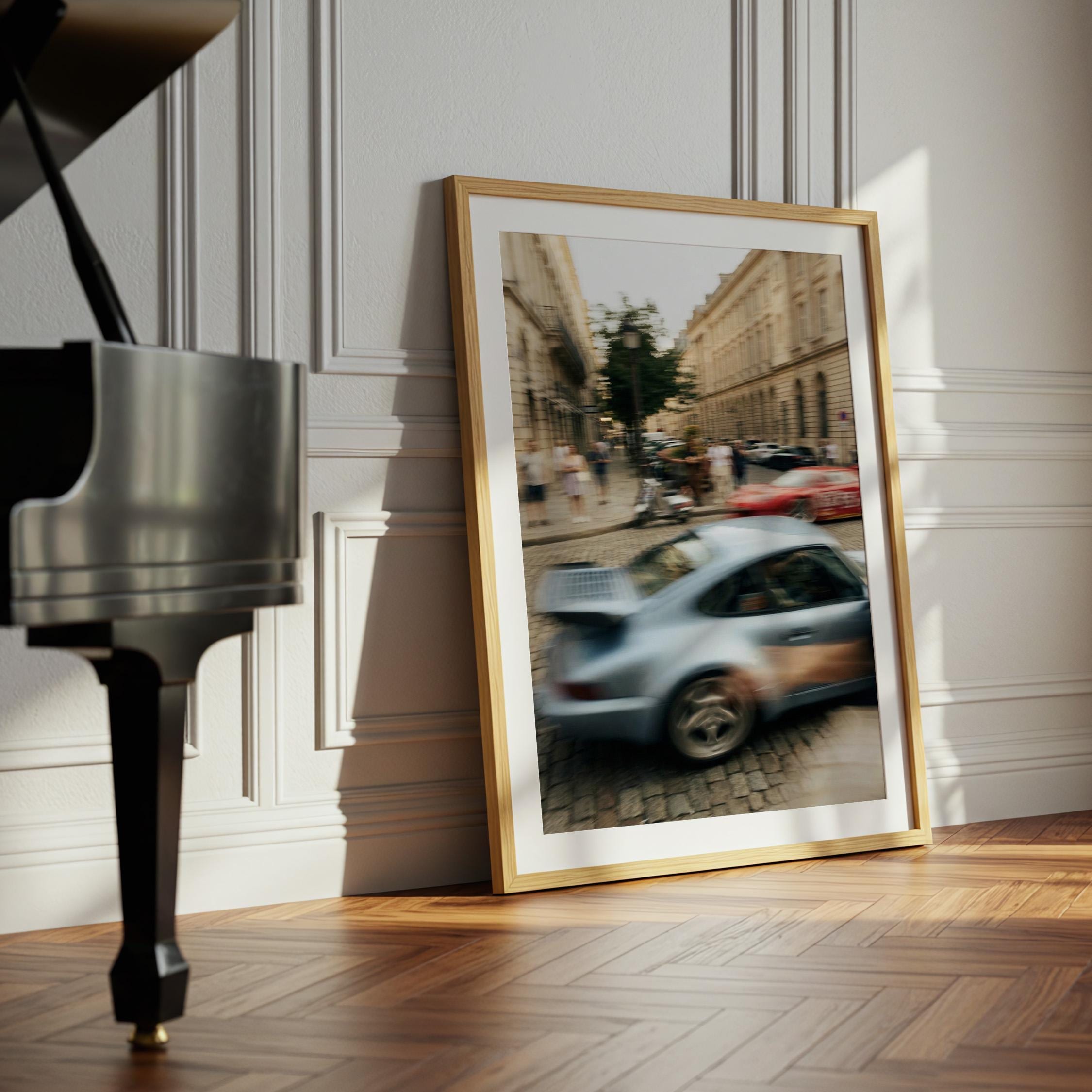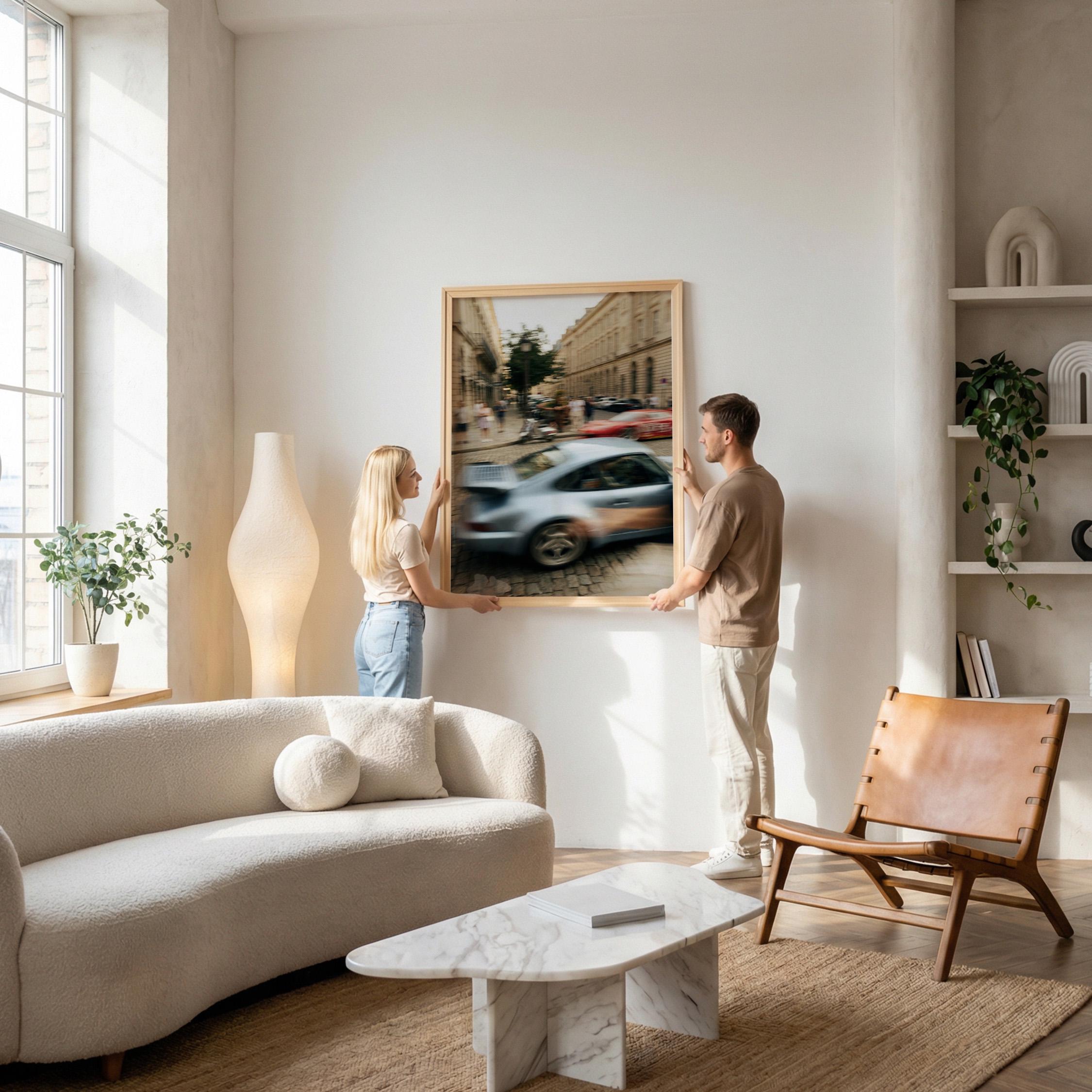 Porsche 911 Turbo wall art print with strong motion blur on a European street. Great fit for an office, garage, or modern interior with a clean aesthetic. It brings speed, movement and a subtle vintage feel to the space.