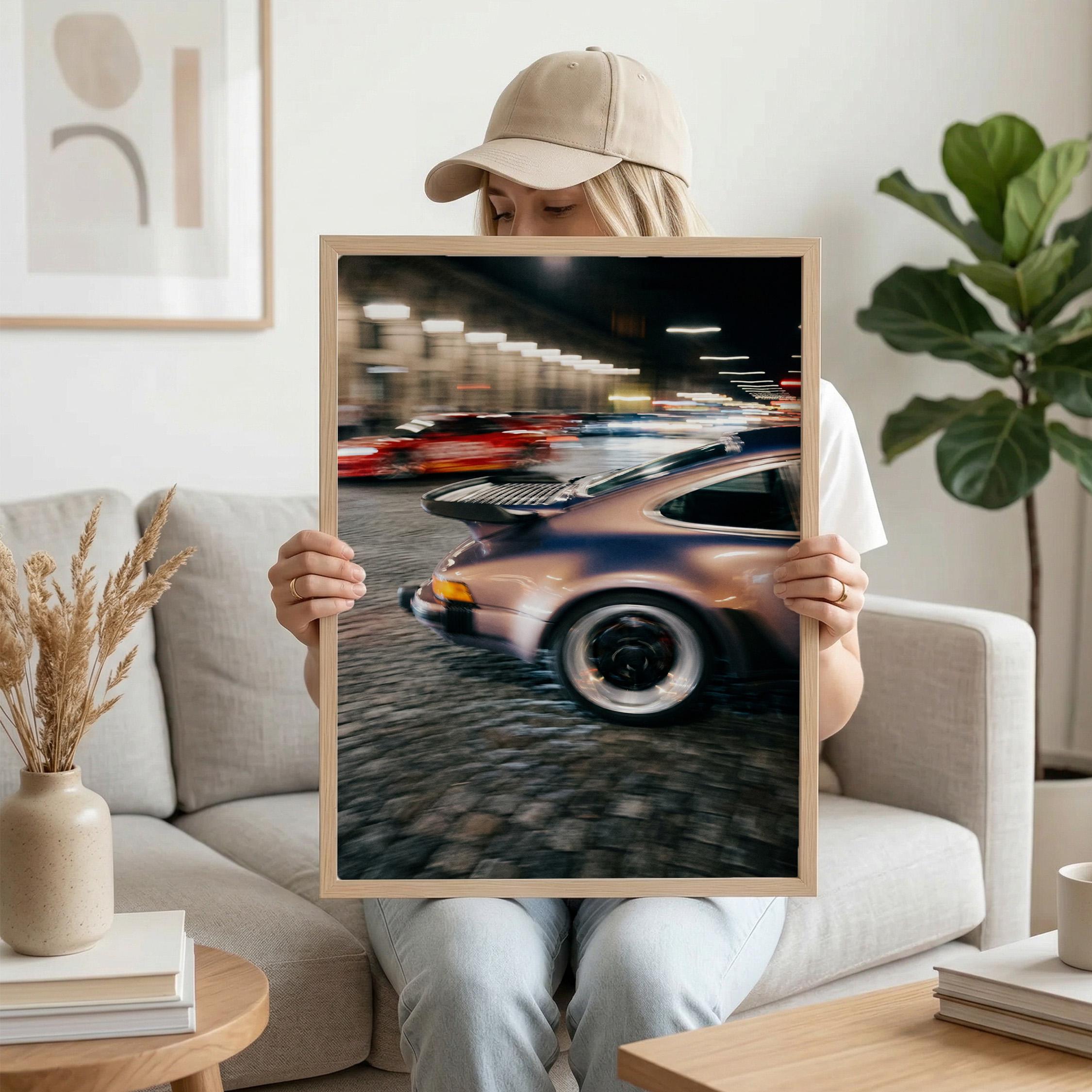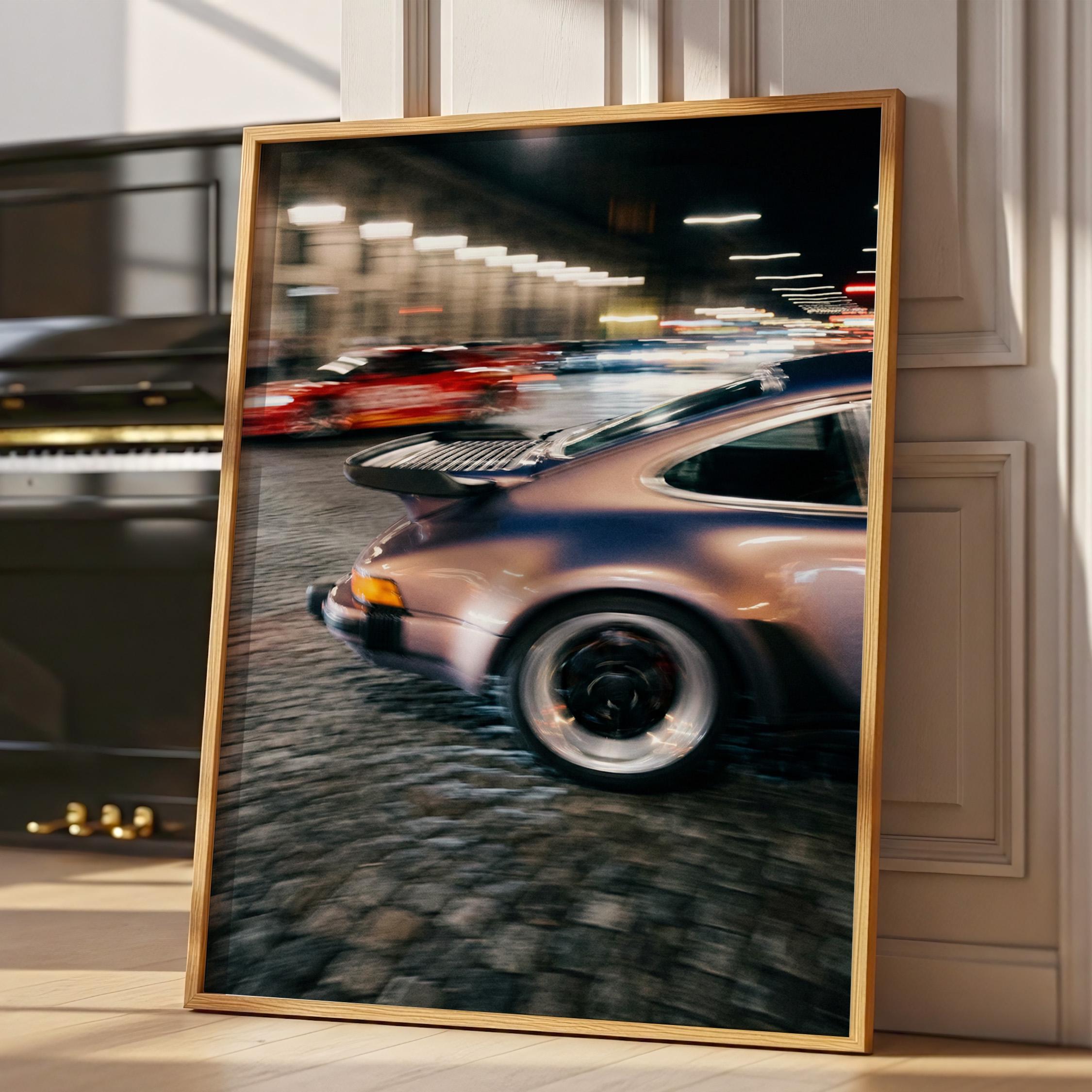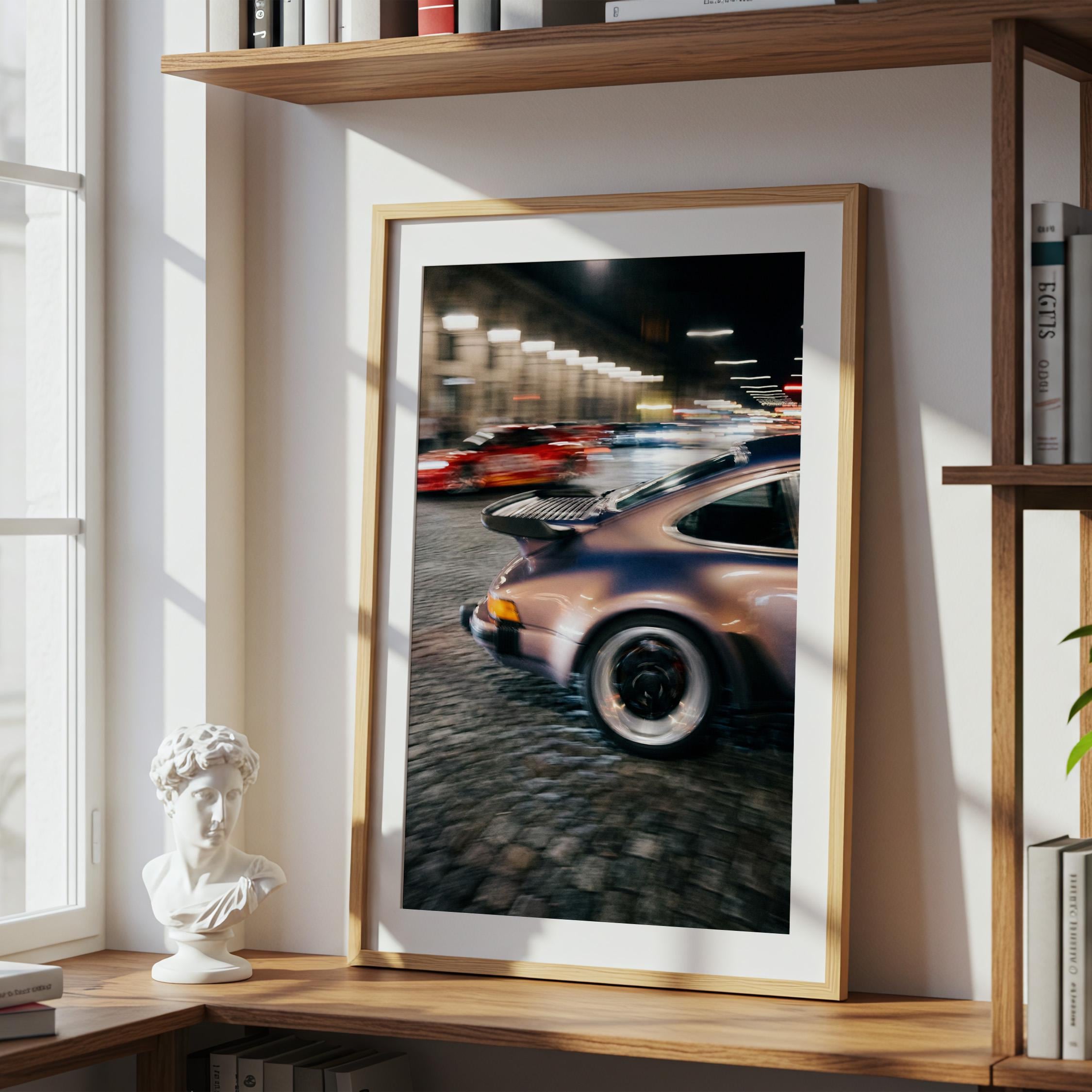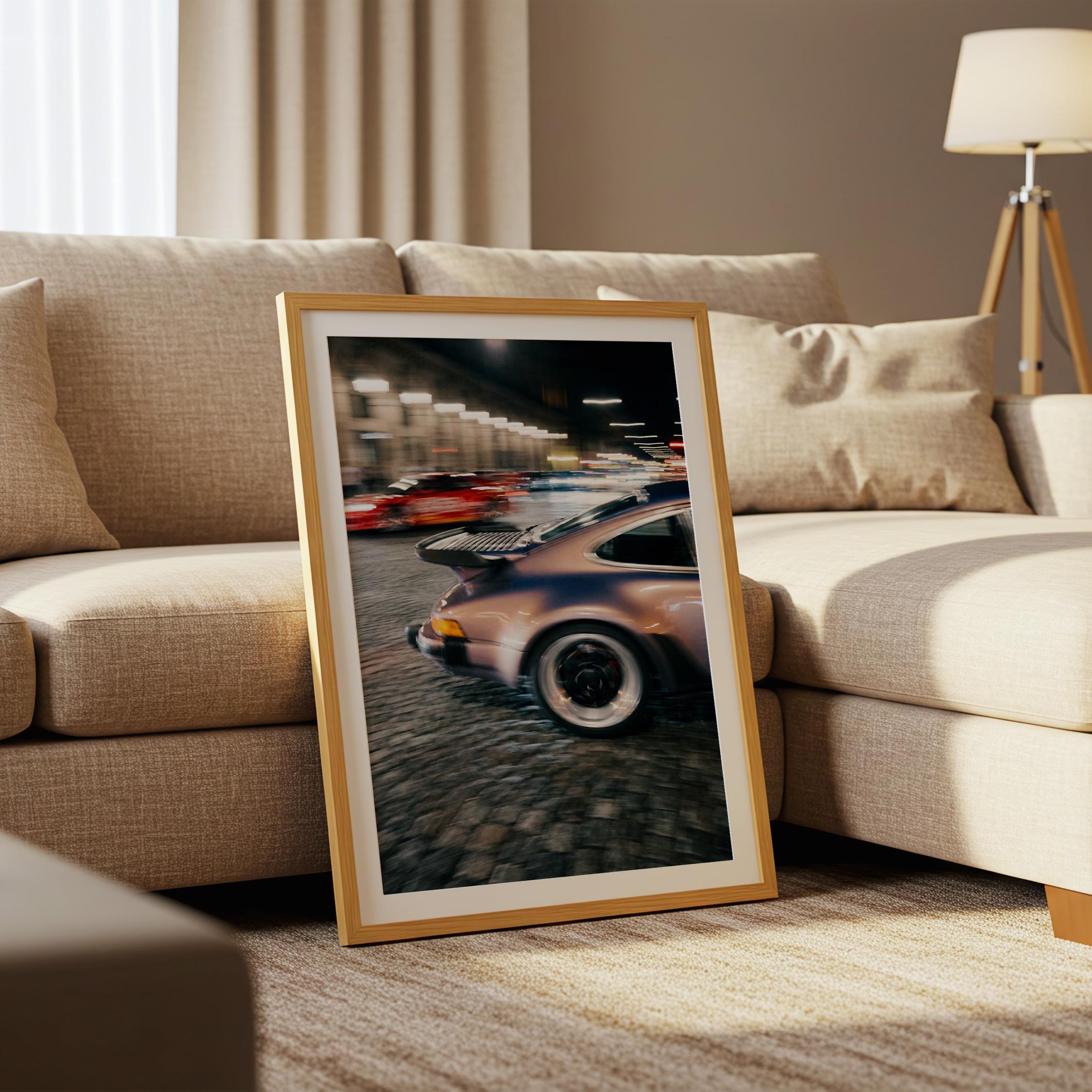 Porsche 911 Turbo wall art print captured at night with strong motion blur and city lights. Fits well in an office, garage, or modern interior with a darker aesthetic. It brings speed, contrast and a refined vintage feel to the space.