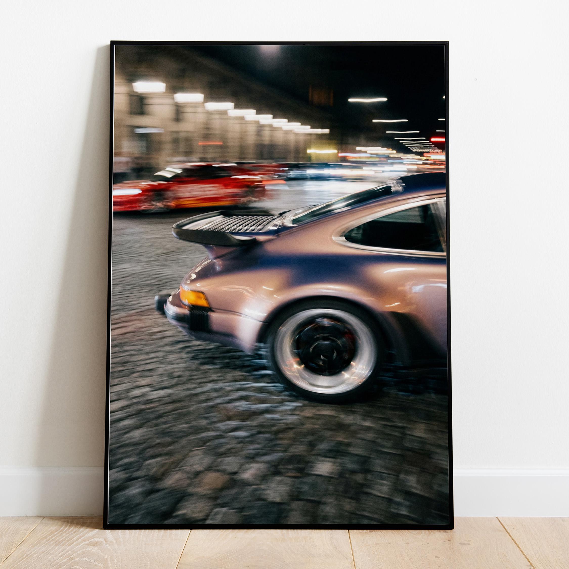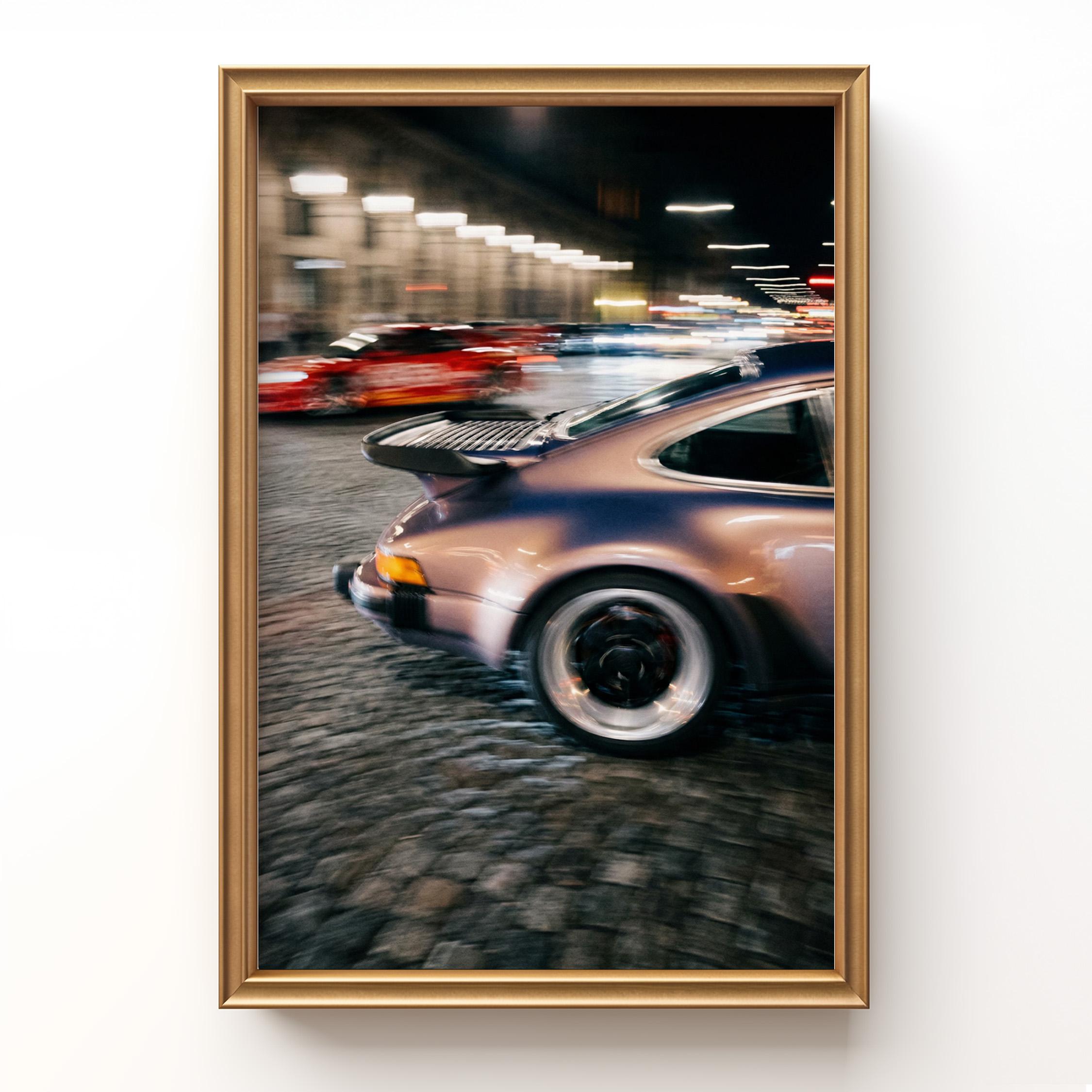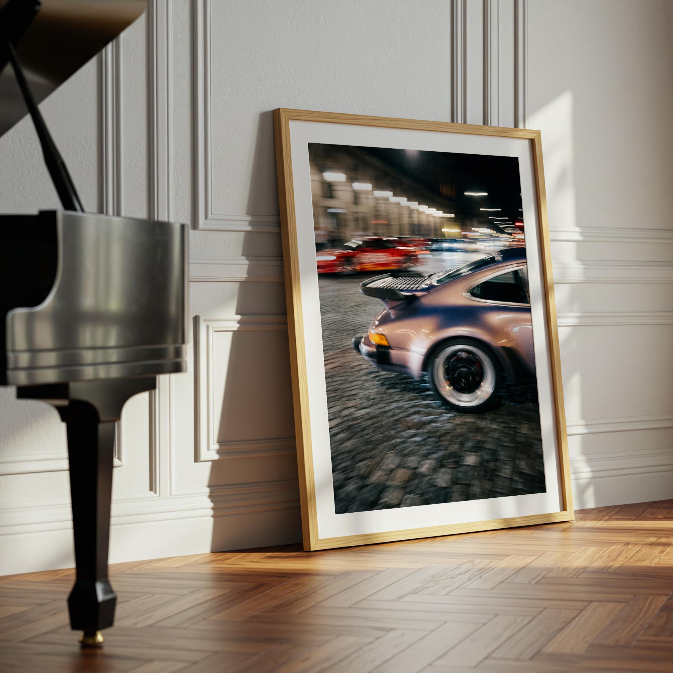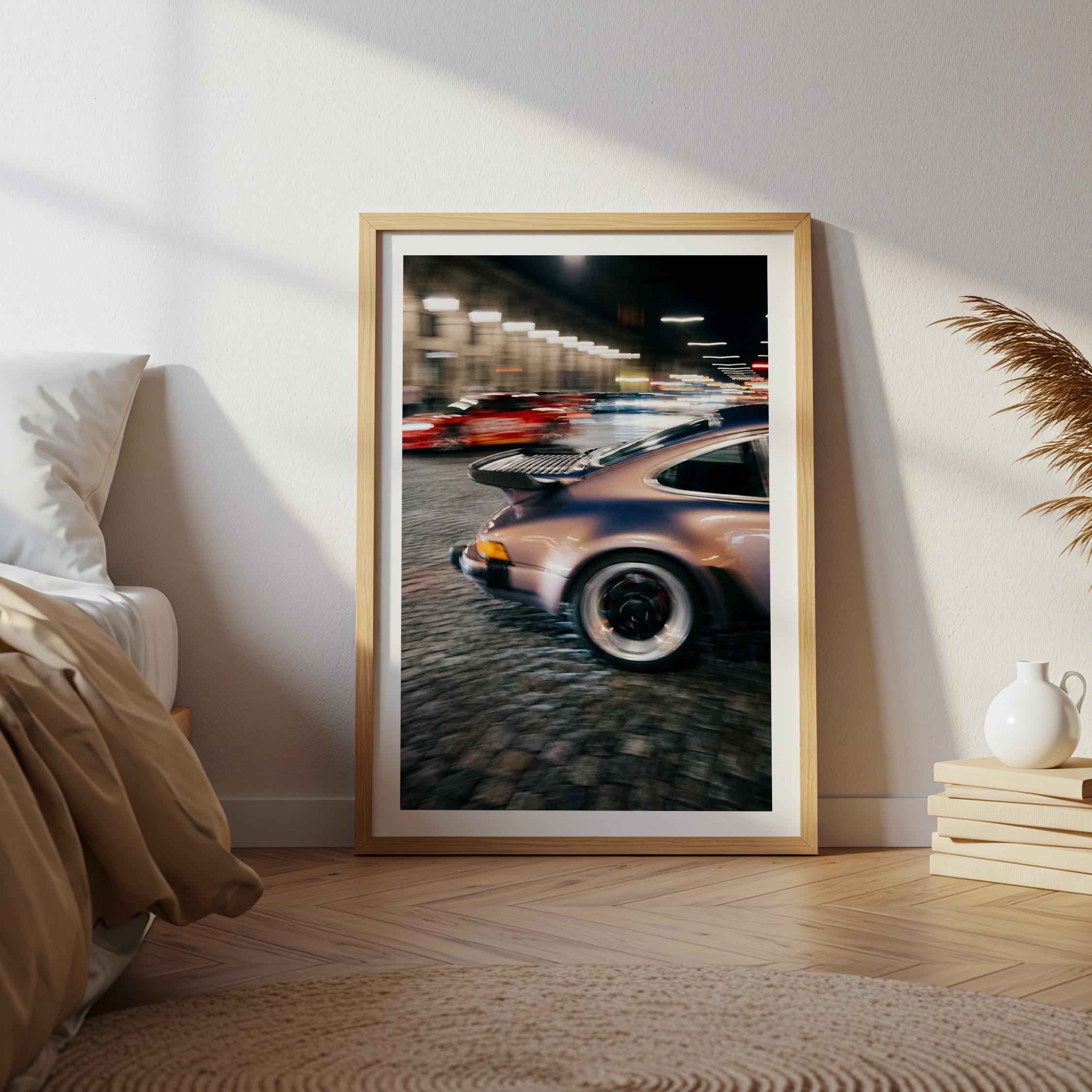 Porsche 911 Turbo wall art print captured at night with strong motion blur and city lights. Fits well in an office, garage, or modern interior with a darker aesthetic. It brings speed, contrast and a refined vintage feel to the space.