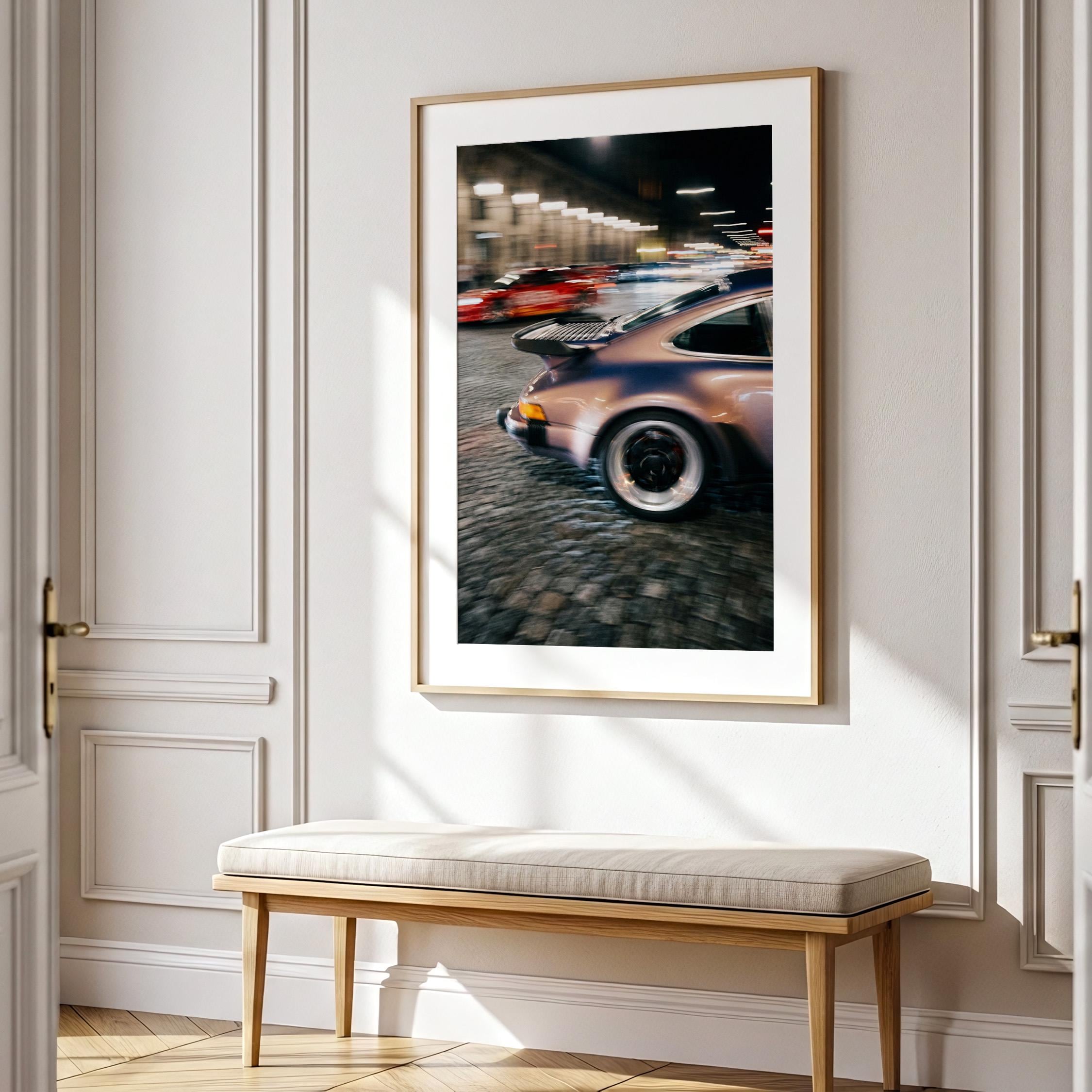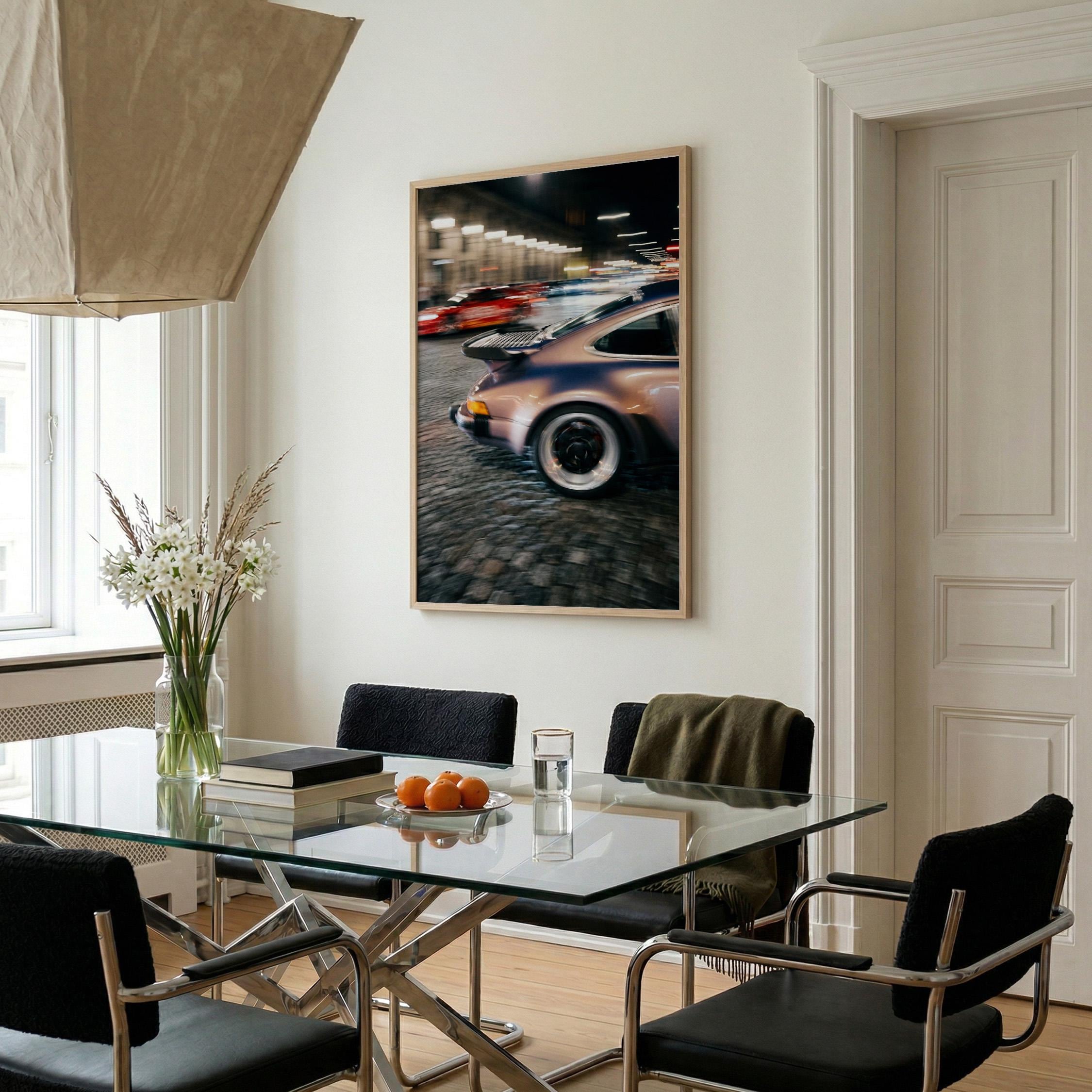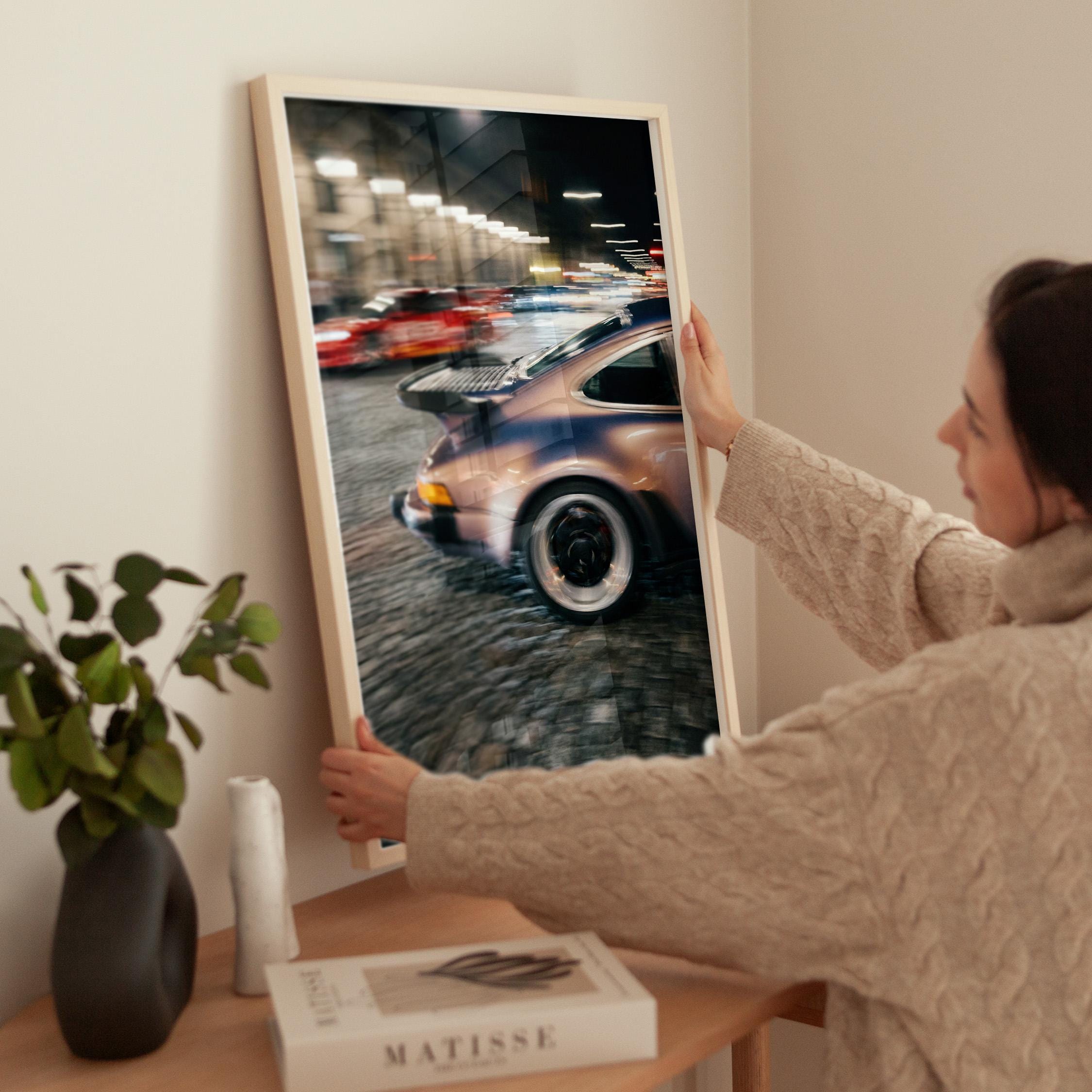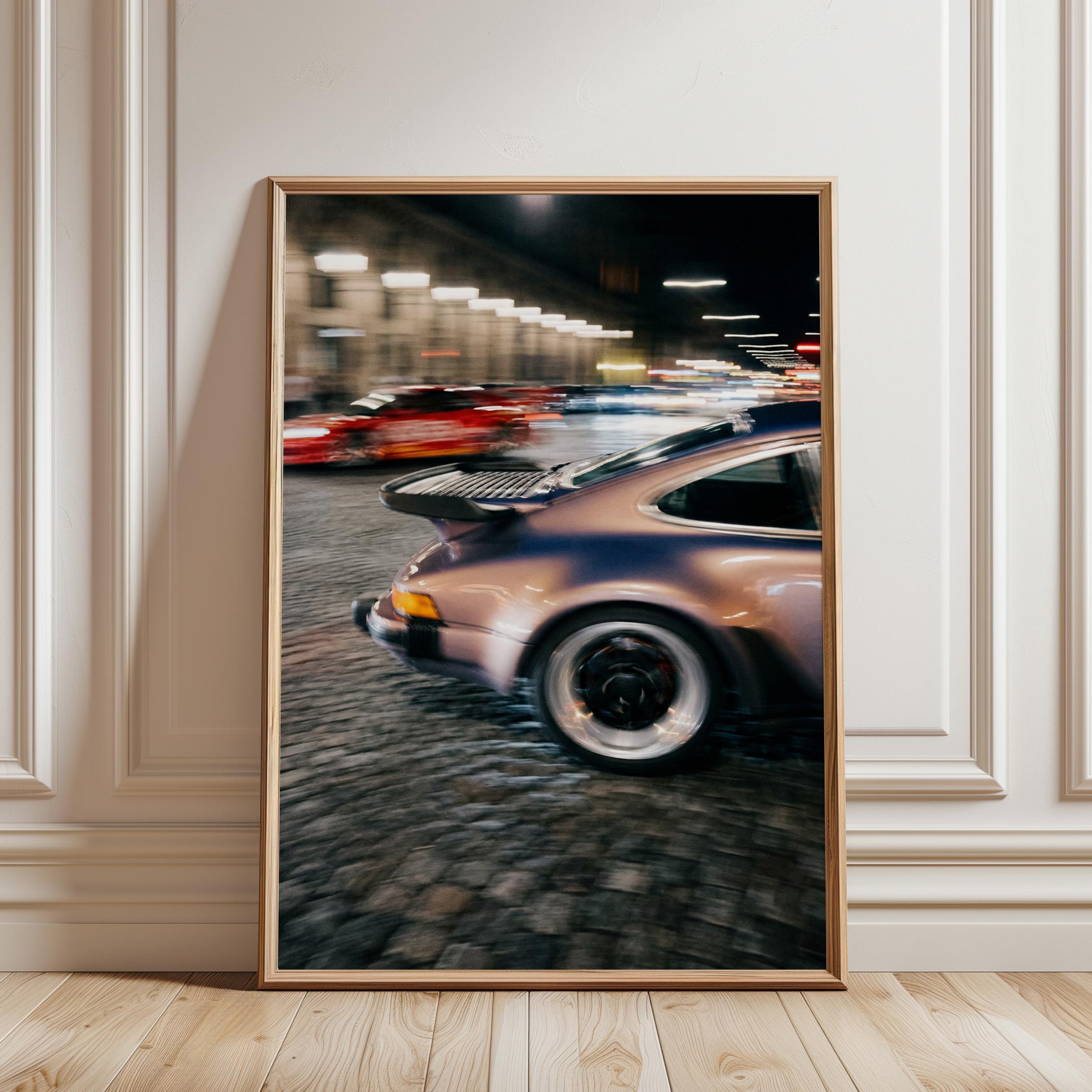 Porsche 911 Turbo wall art print captured at night with strong motion blur and city lights. Fits well in an office, garage, or modern interior with a darker aesthetic. It brings speed, contrast and a refined vintage feel to the space.