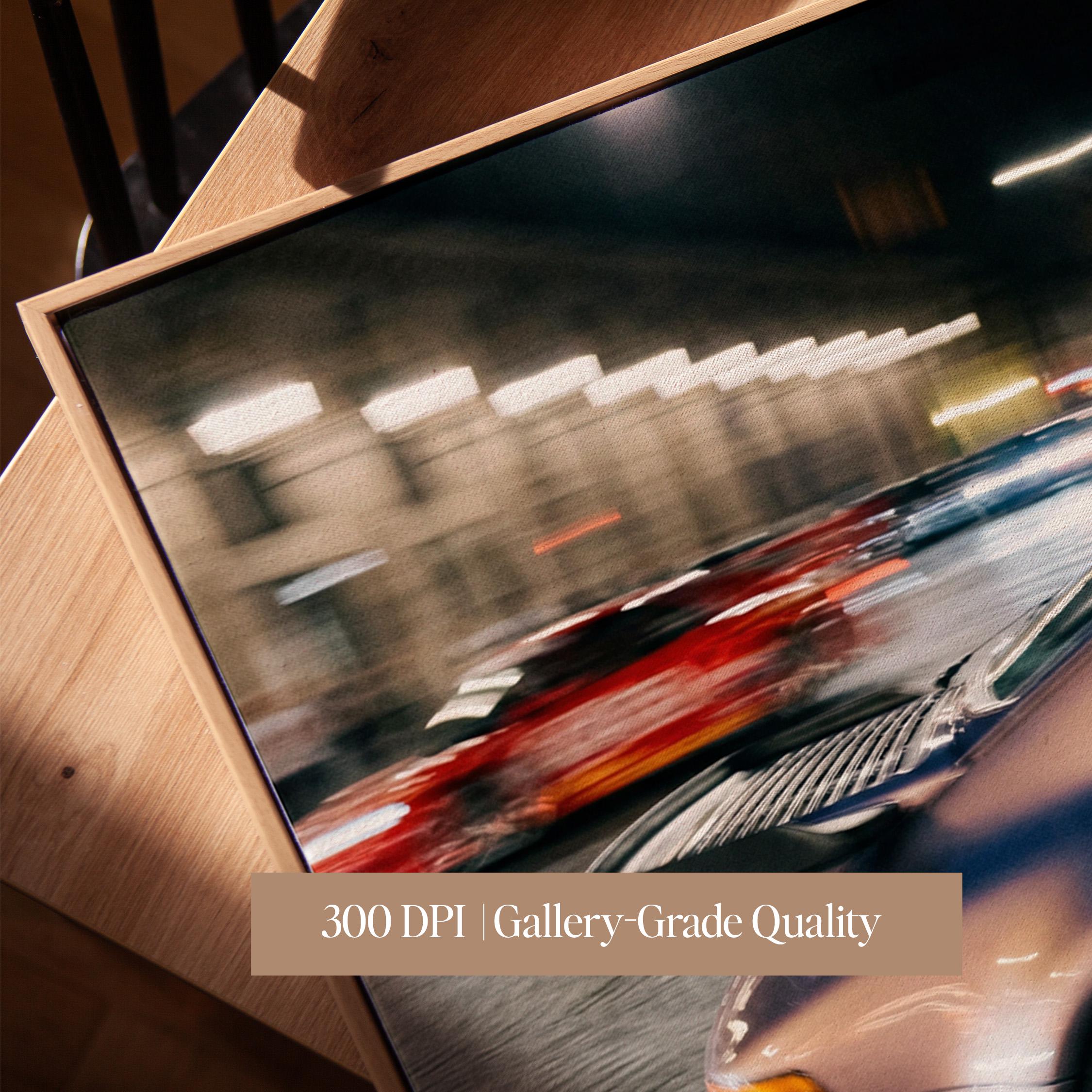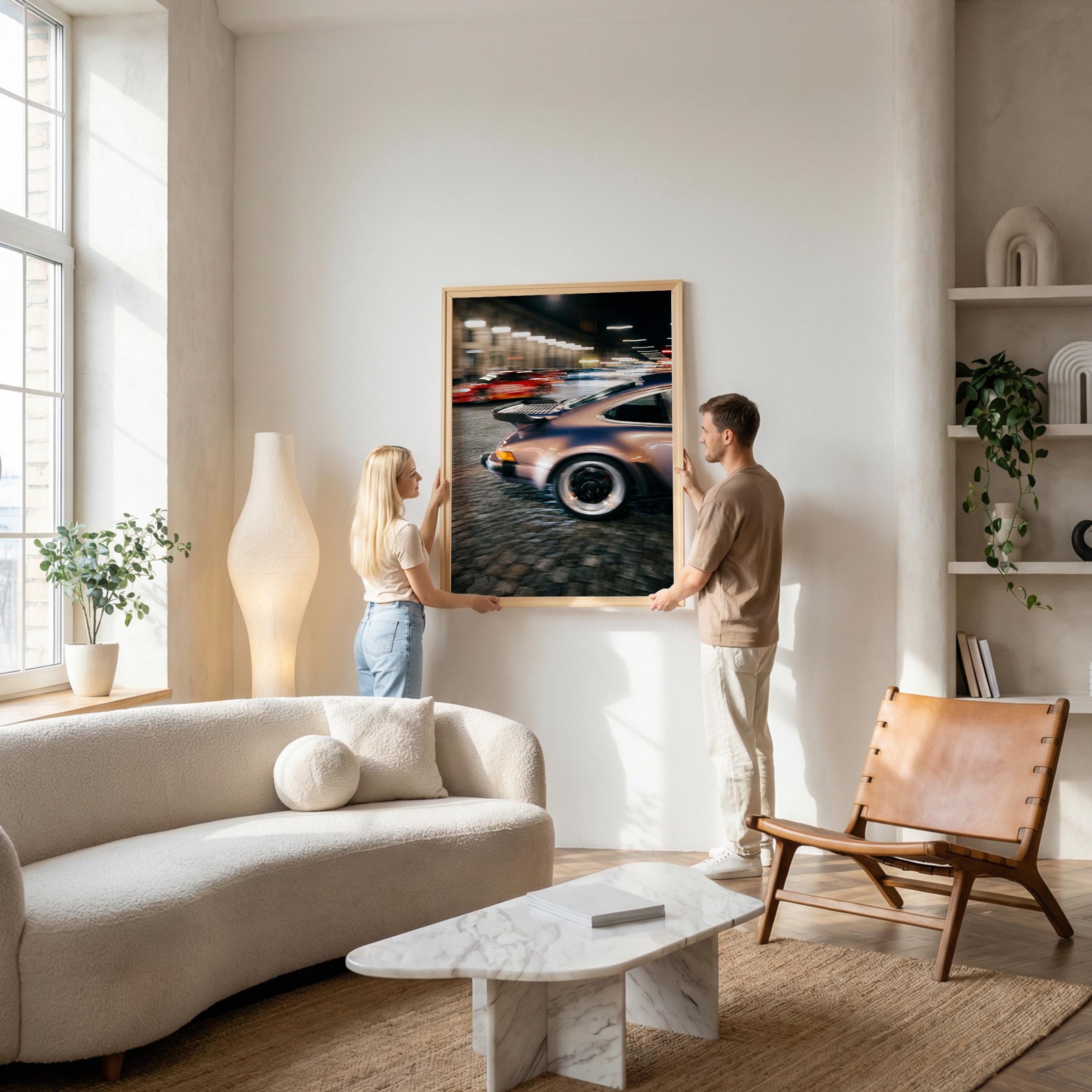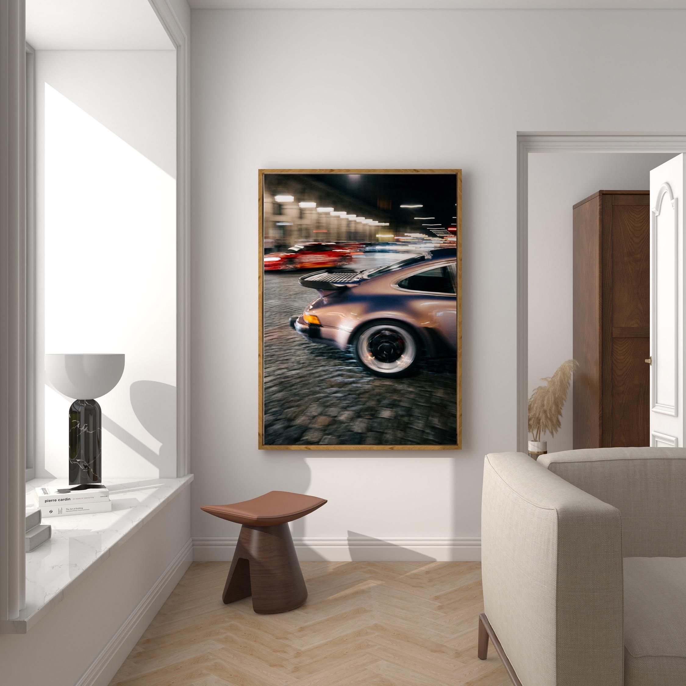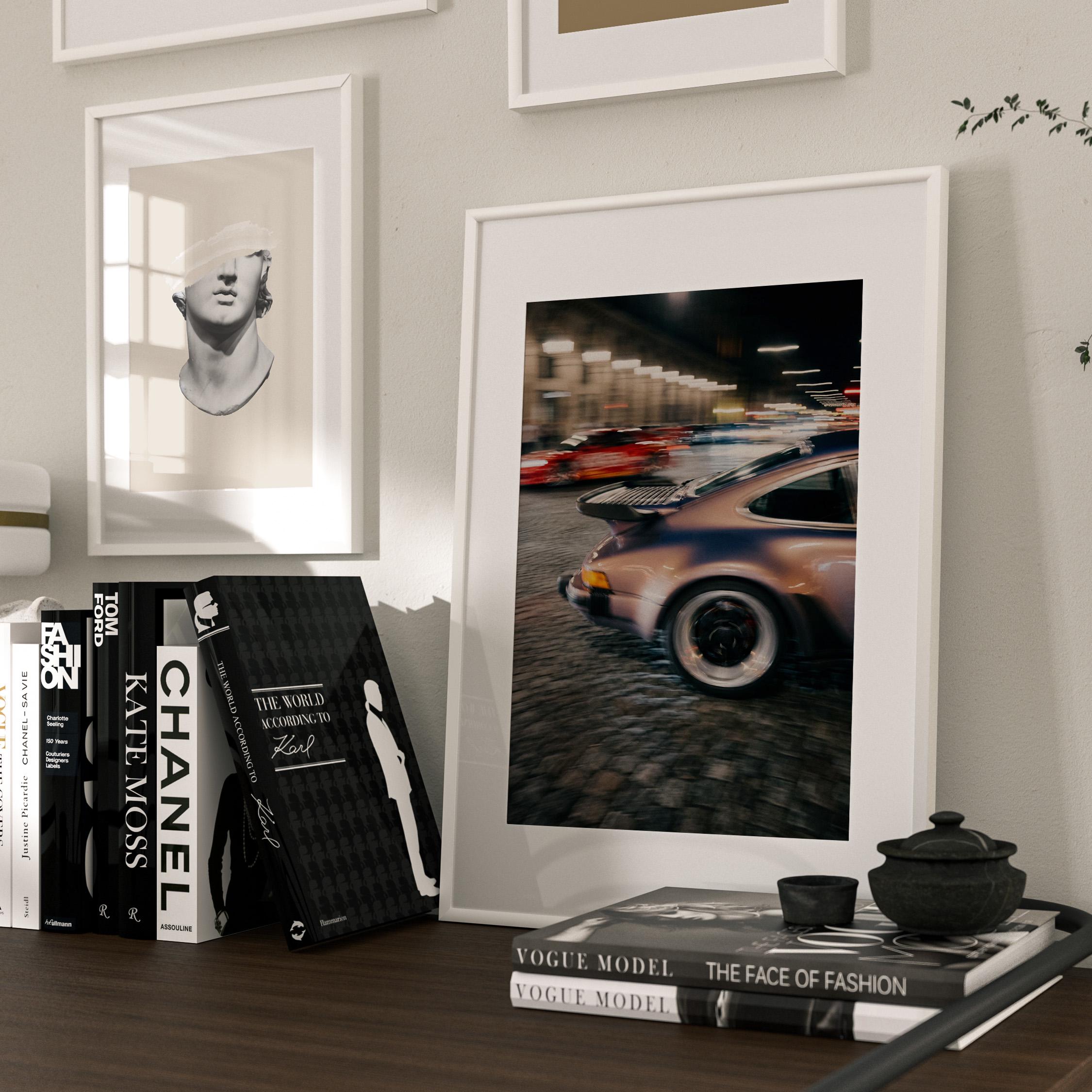 Porsche 911 Turbo wall art print captured at night with strong motion blur and city lights. Fits well in an office, garage, or modern interior with a darker aesthetic. It brings speed, contrast and a refined vintage feel to the space.