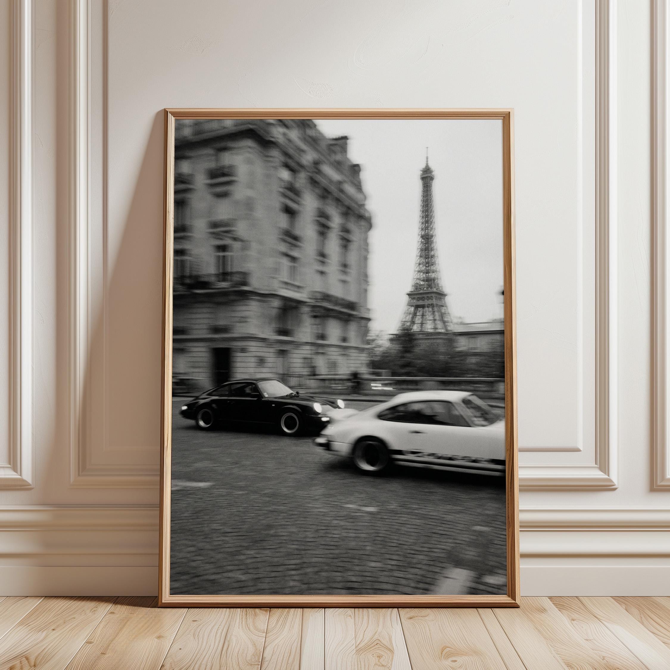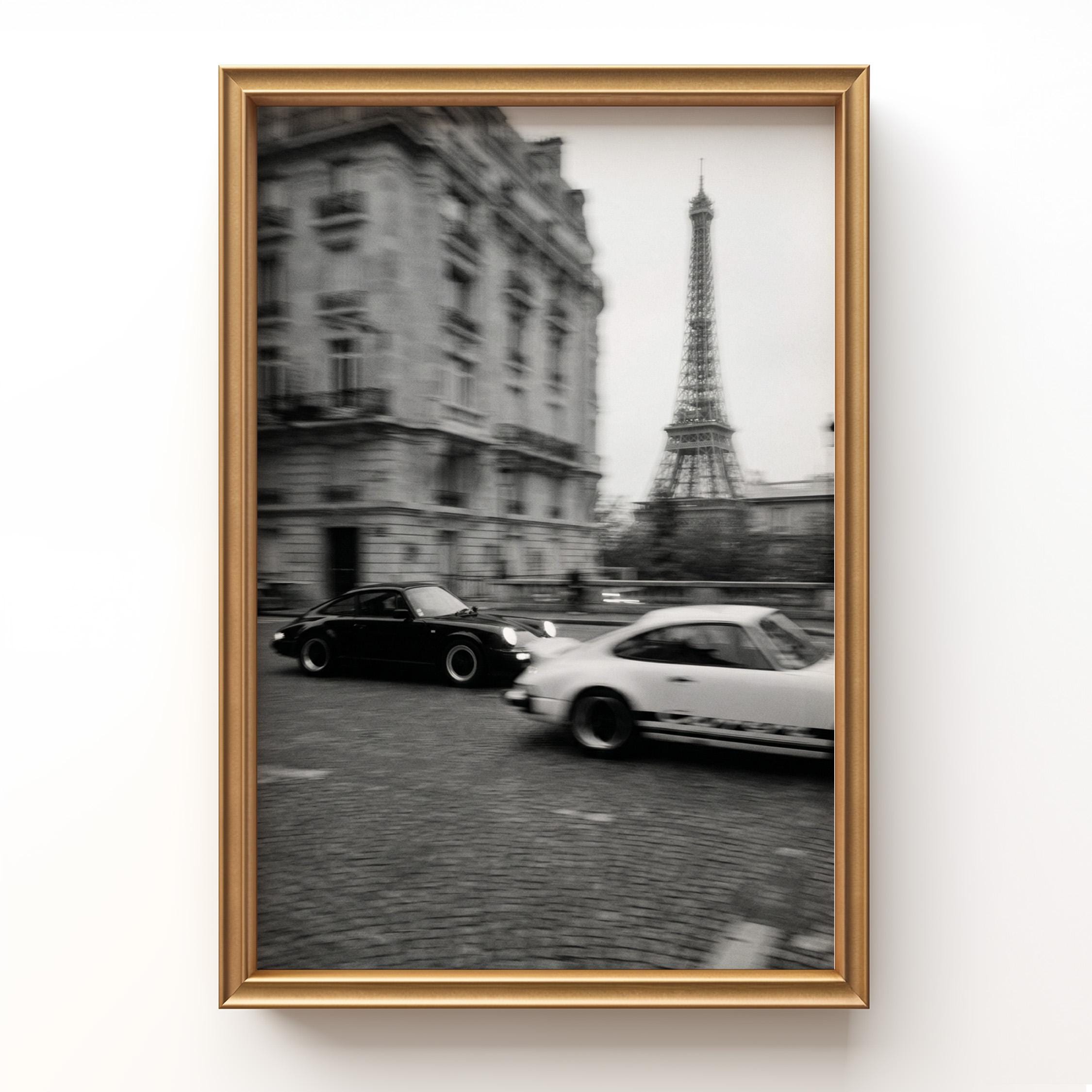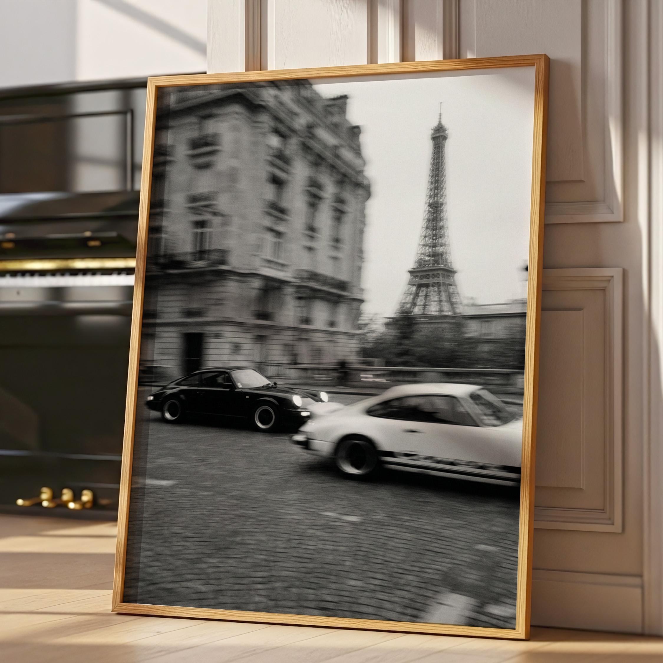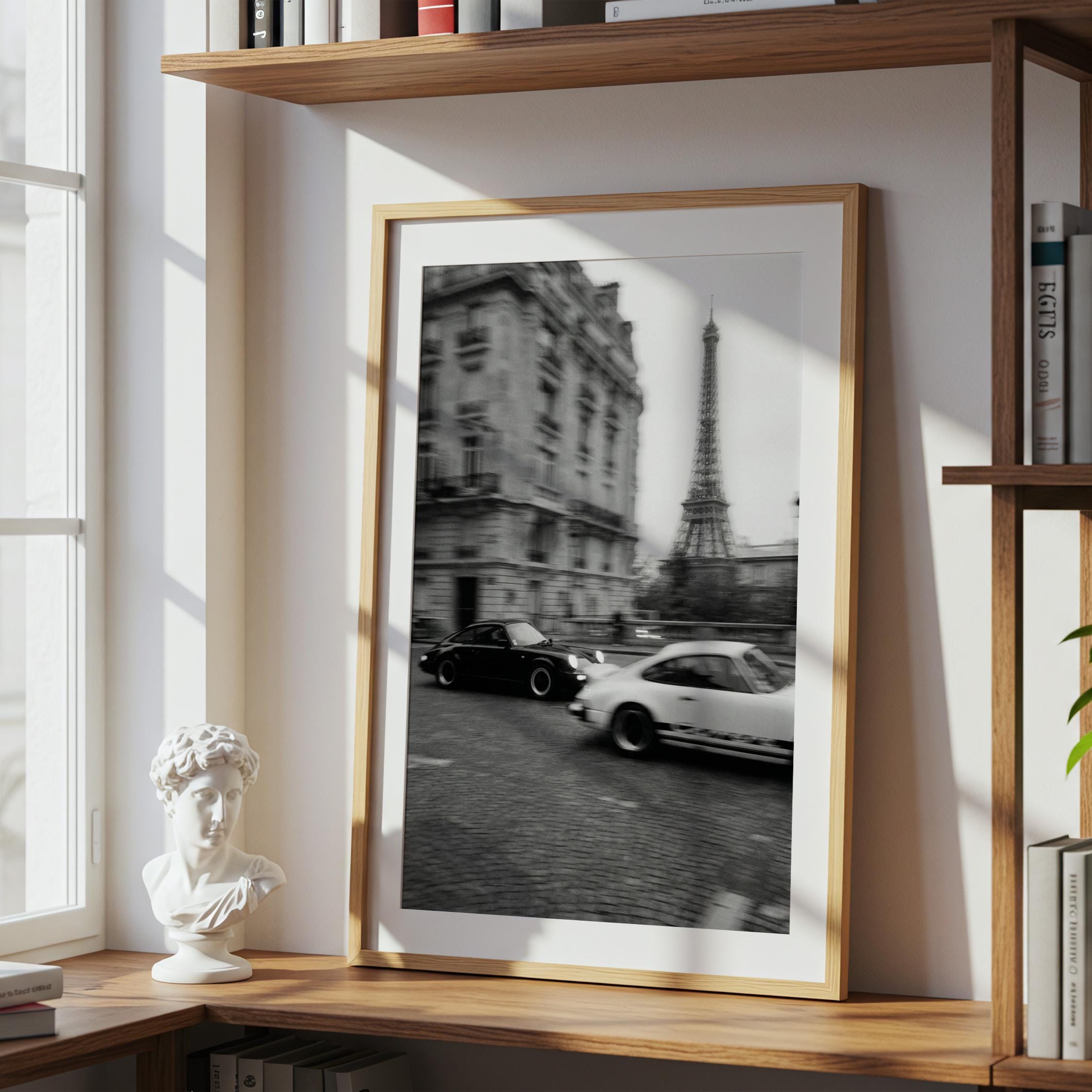 Porsche 911 wall art print captured in Paris with the Eiffel Tower in the background. Perfect for an office, garage, studio, or for anyone who loves classic cars, French style, and black and white photography. Digital download wall art to print and frame in your space.