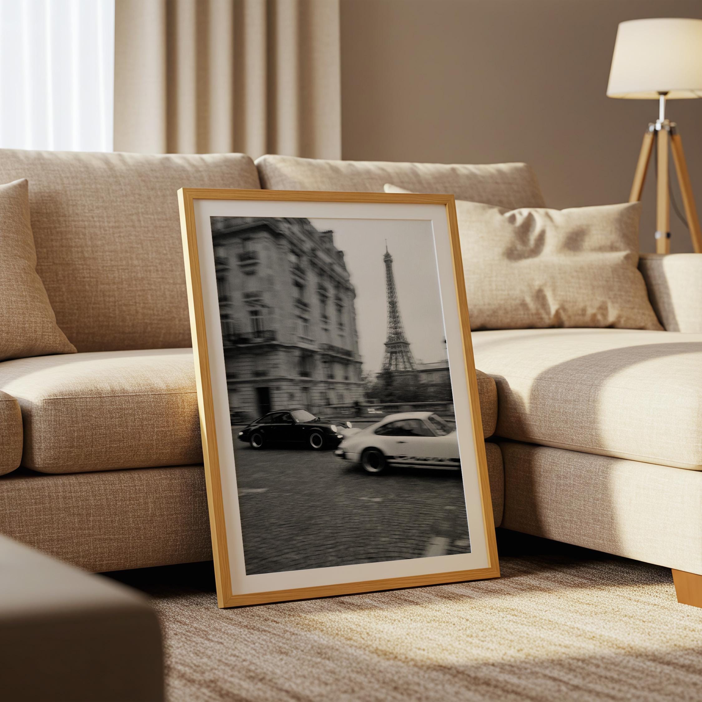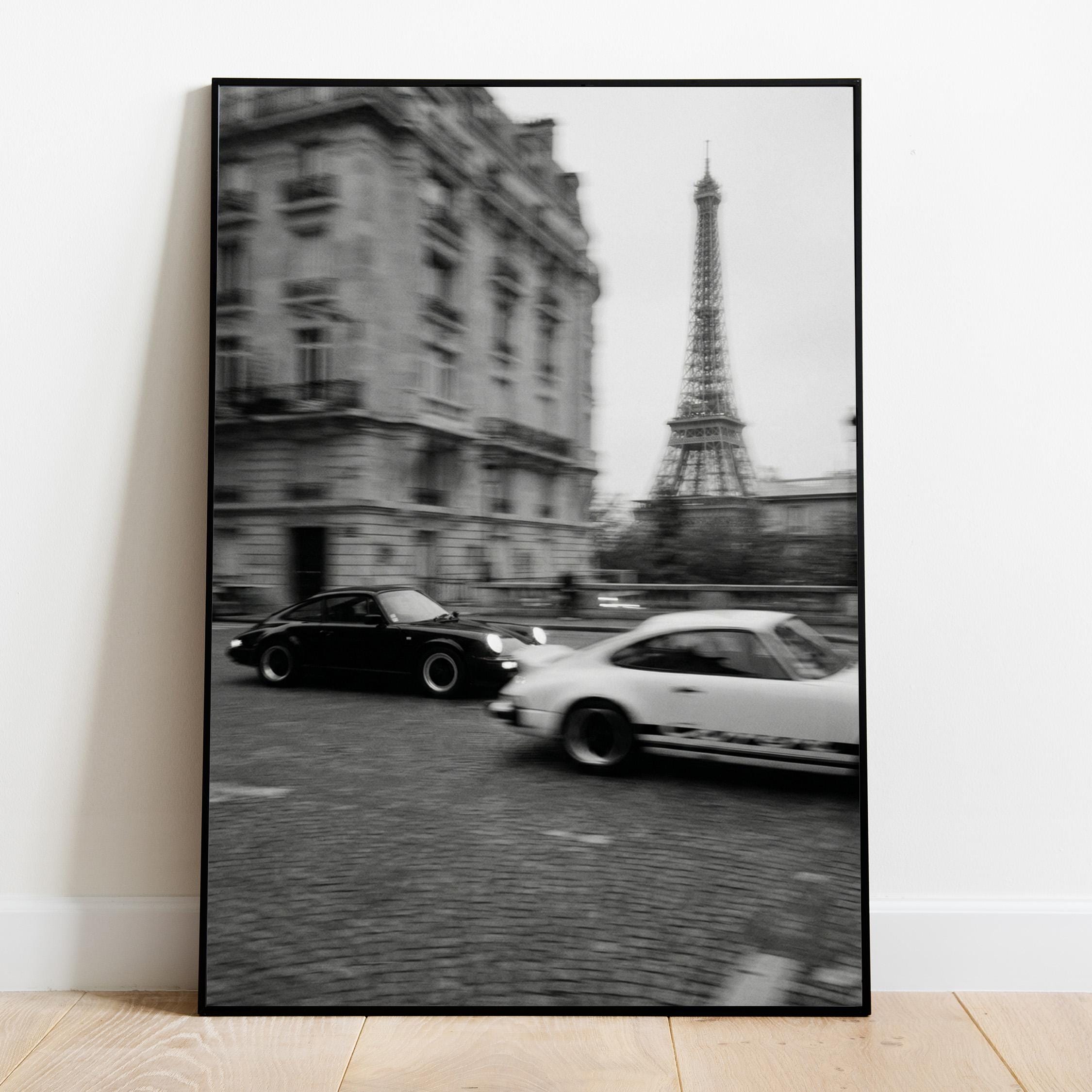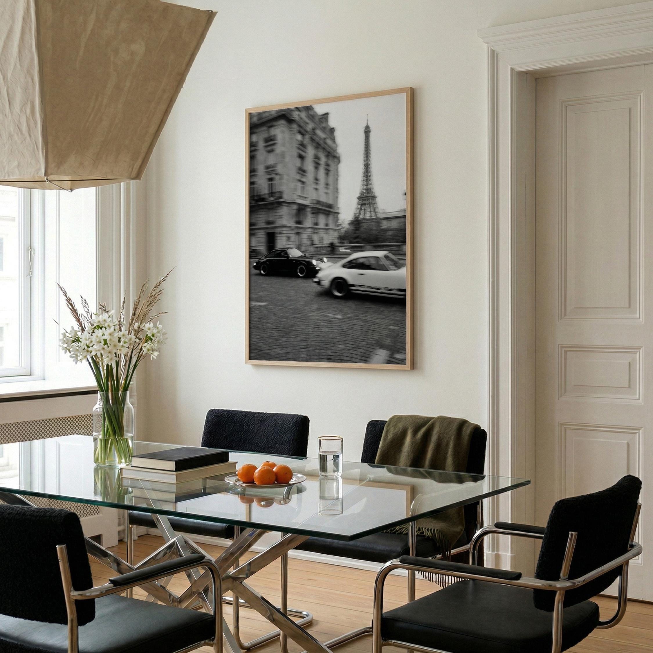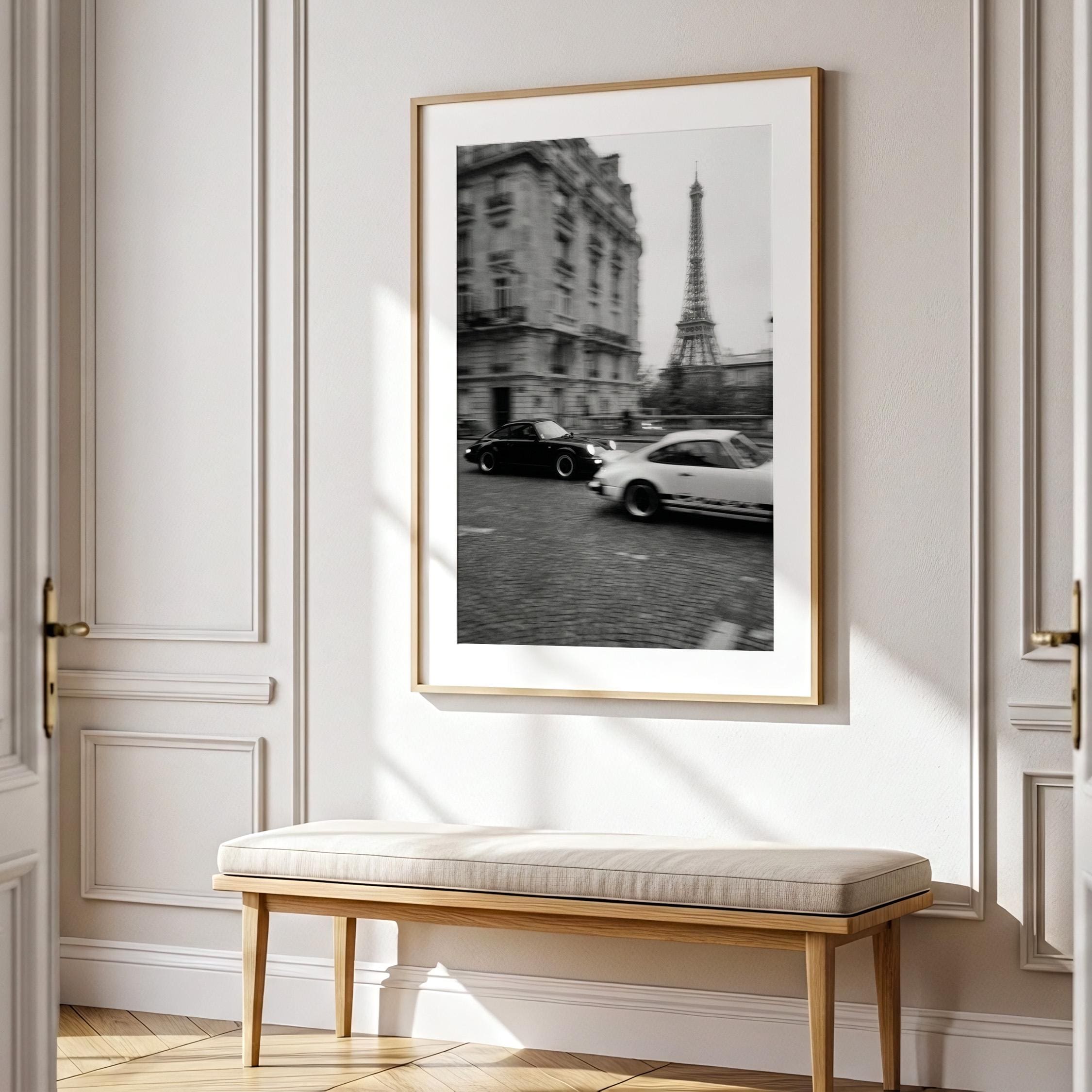 Porsche 911 wall art print captured in Paris with the Eiffel Tower in the background. Perfect for an office, garage, studio, or for anyone who loves classic cars, French style, and black and white photography. Digital download wall art to print and frame in your space.